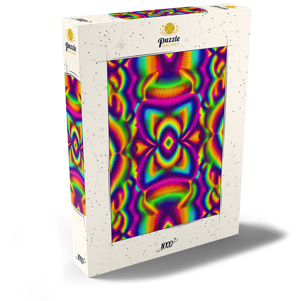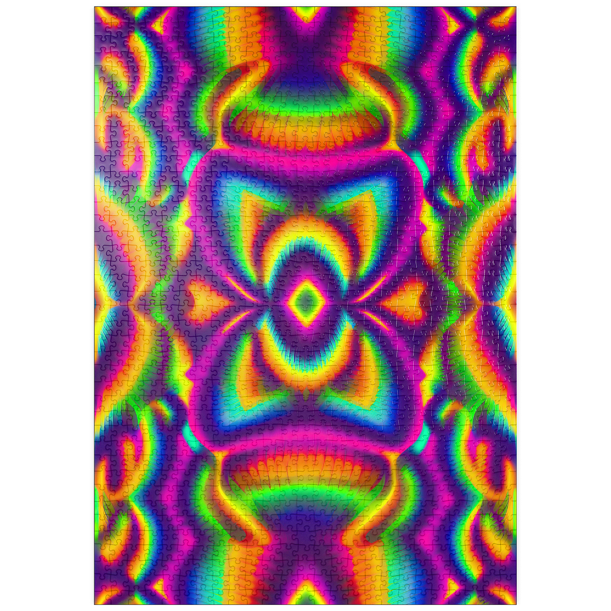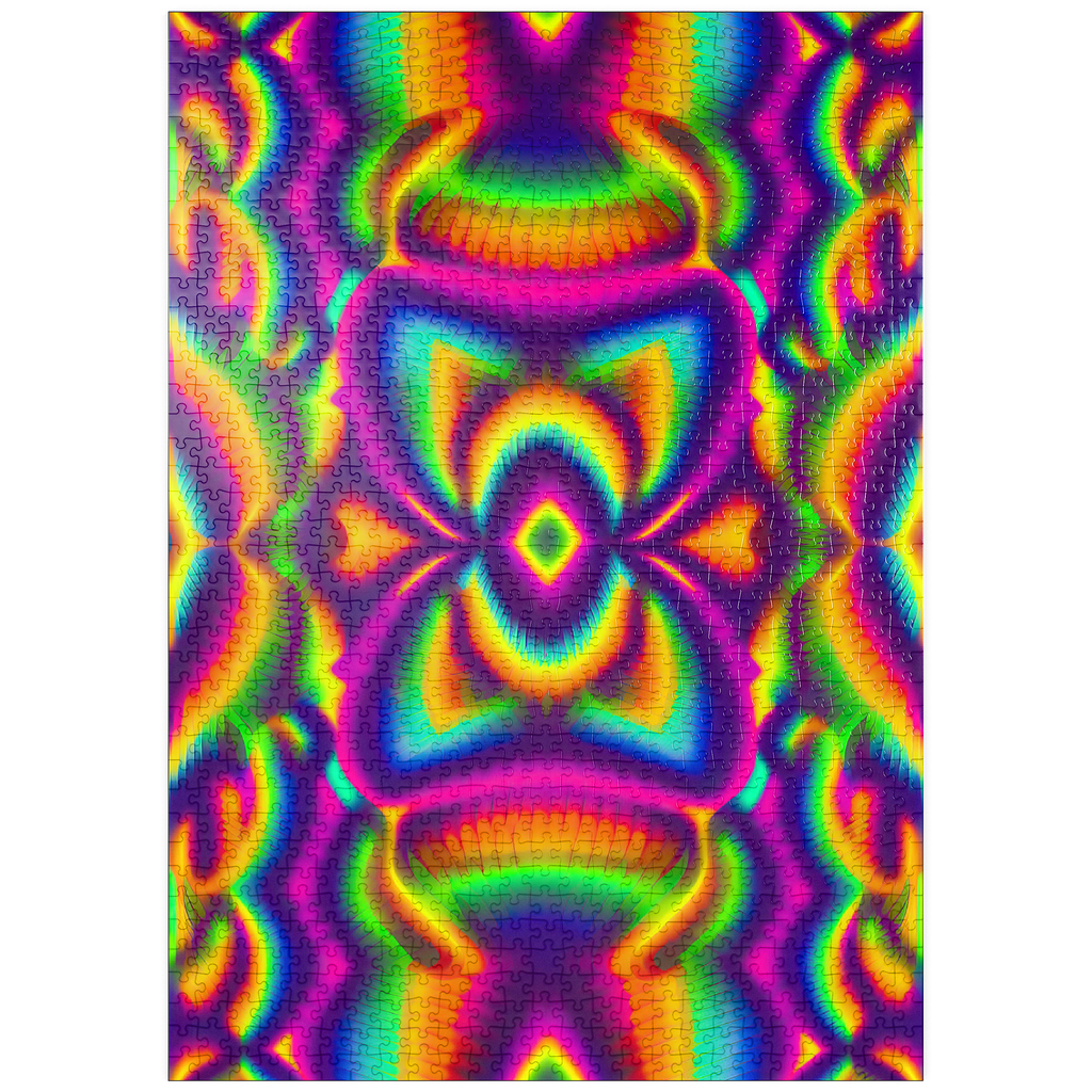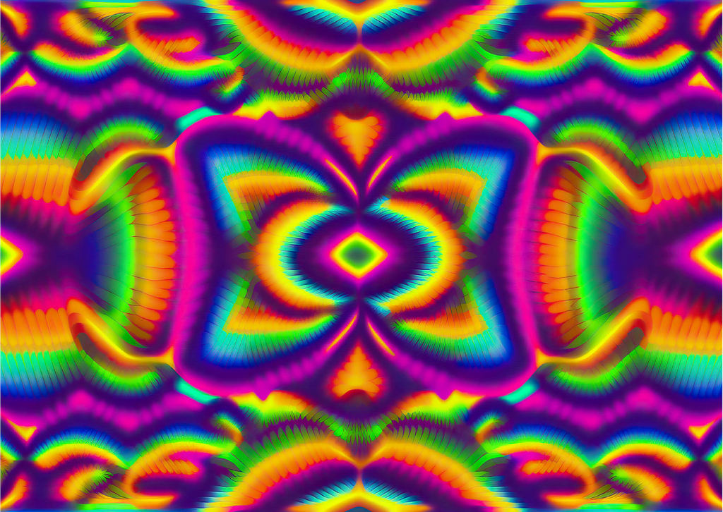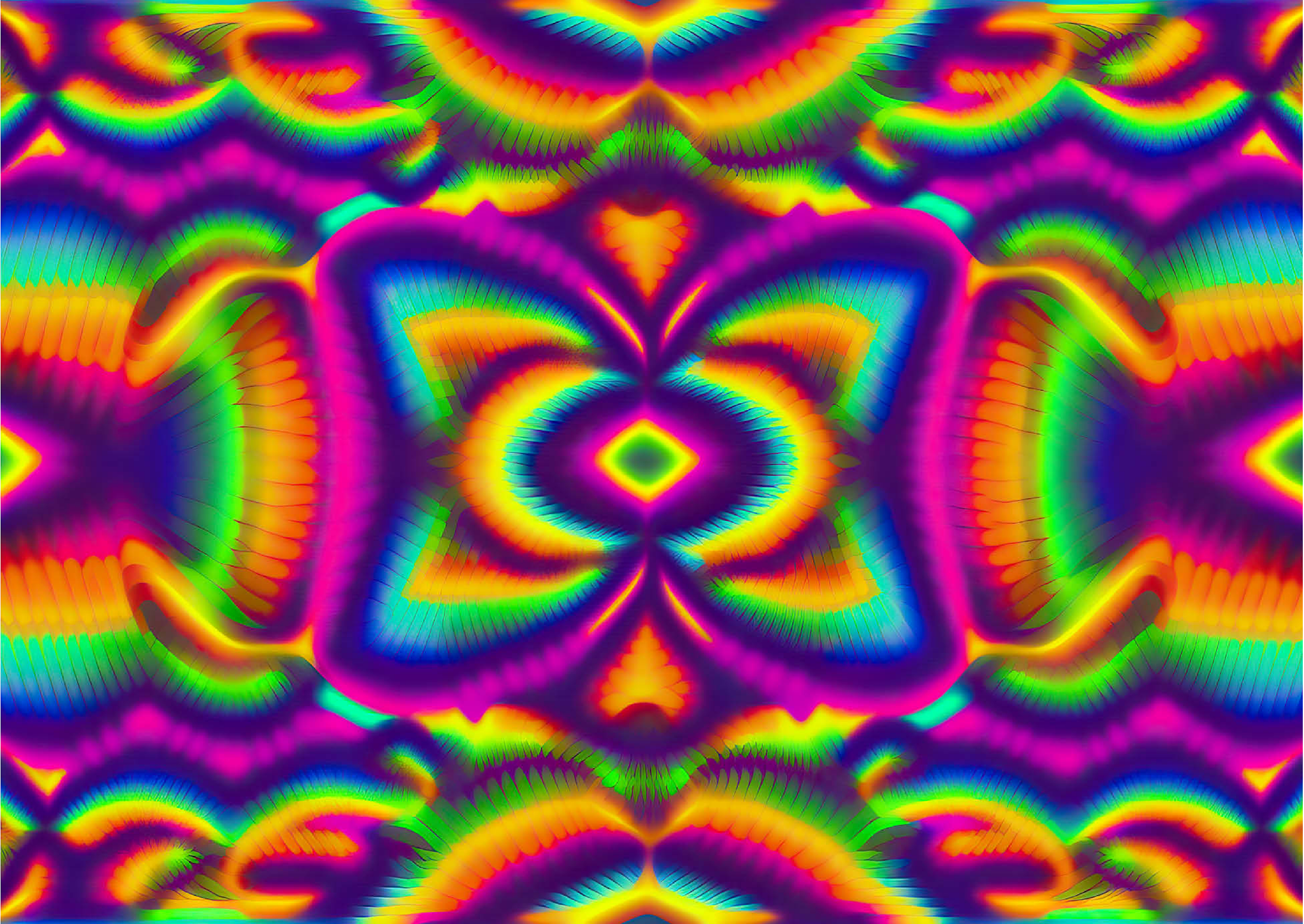 Tauchen Sie mit diesem lebhaften psychedelischen Muster in eine hypnotisierende Welt der Farben ein. Mit einer Explosion von Neontönen präsentiert dieses digitale Kunstwerk ein symmetrisches, kaleidoskopisches Design mit leuchtenden Farbverläufen in elektrischem Blau, feurigem Orange, lebhaftem Pink und leuchtendem Grün. Die verschlungenen Formen und fließenden Muster vermitteln ein Gefühl der Bewegung und erzeugen einen fesselnden visuellen Effekt, der an trippige, fraktal inspirierte Kunst erinnert.