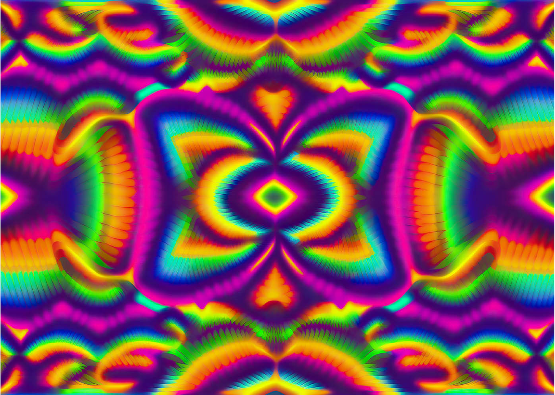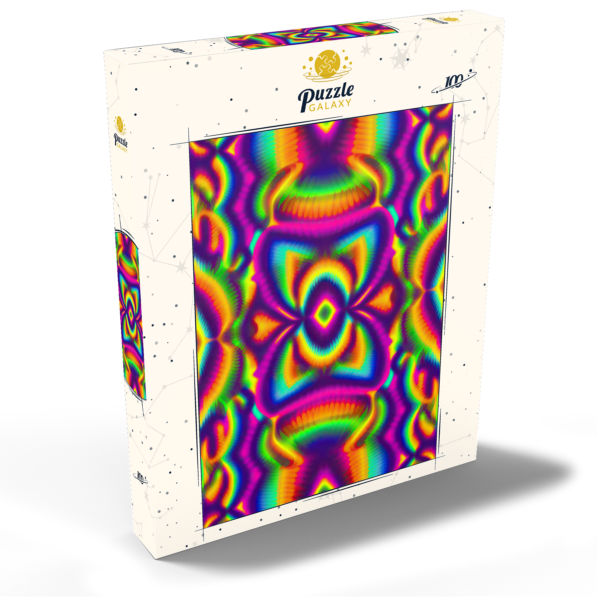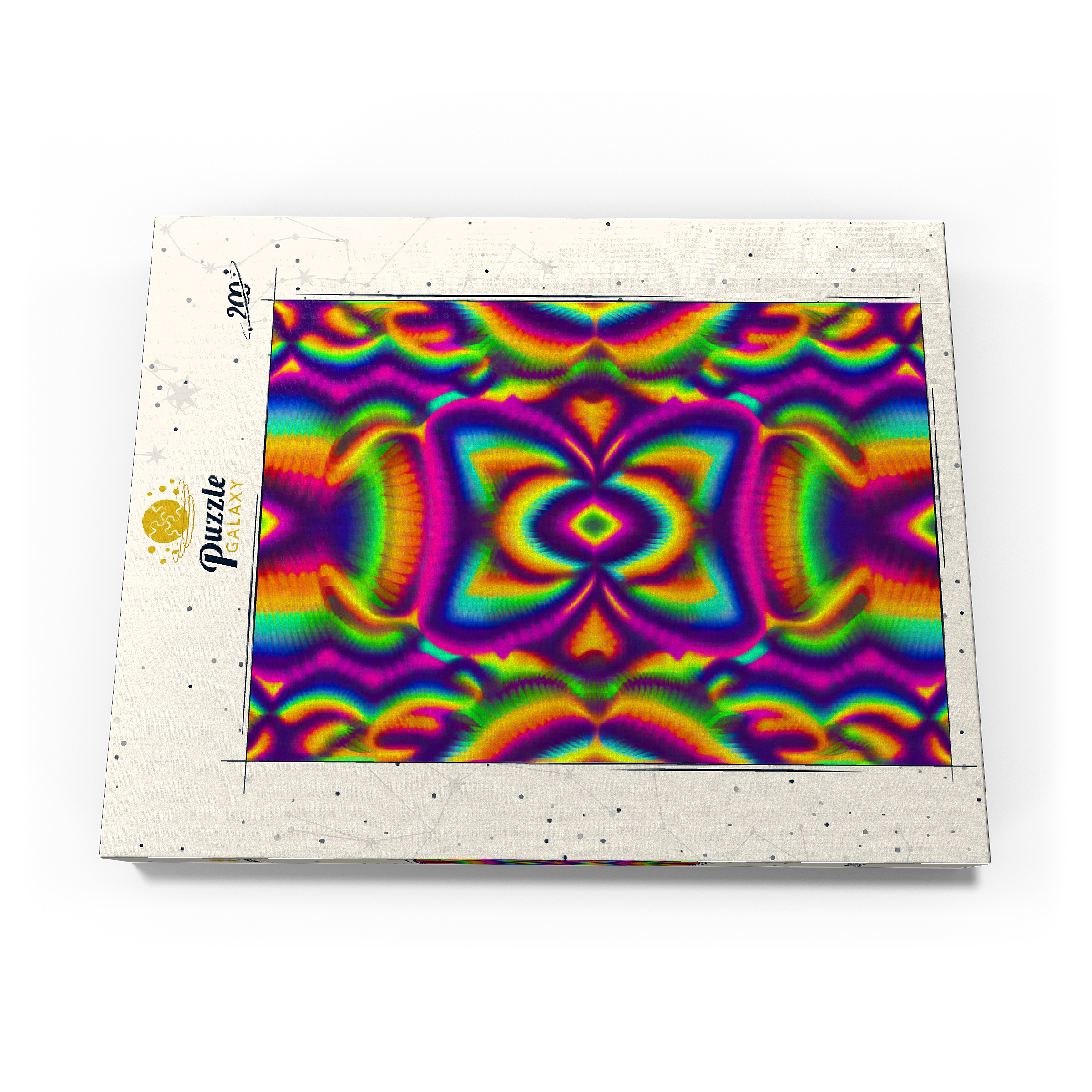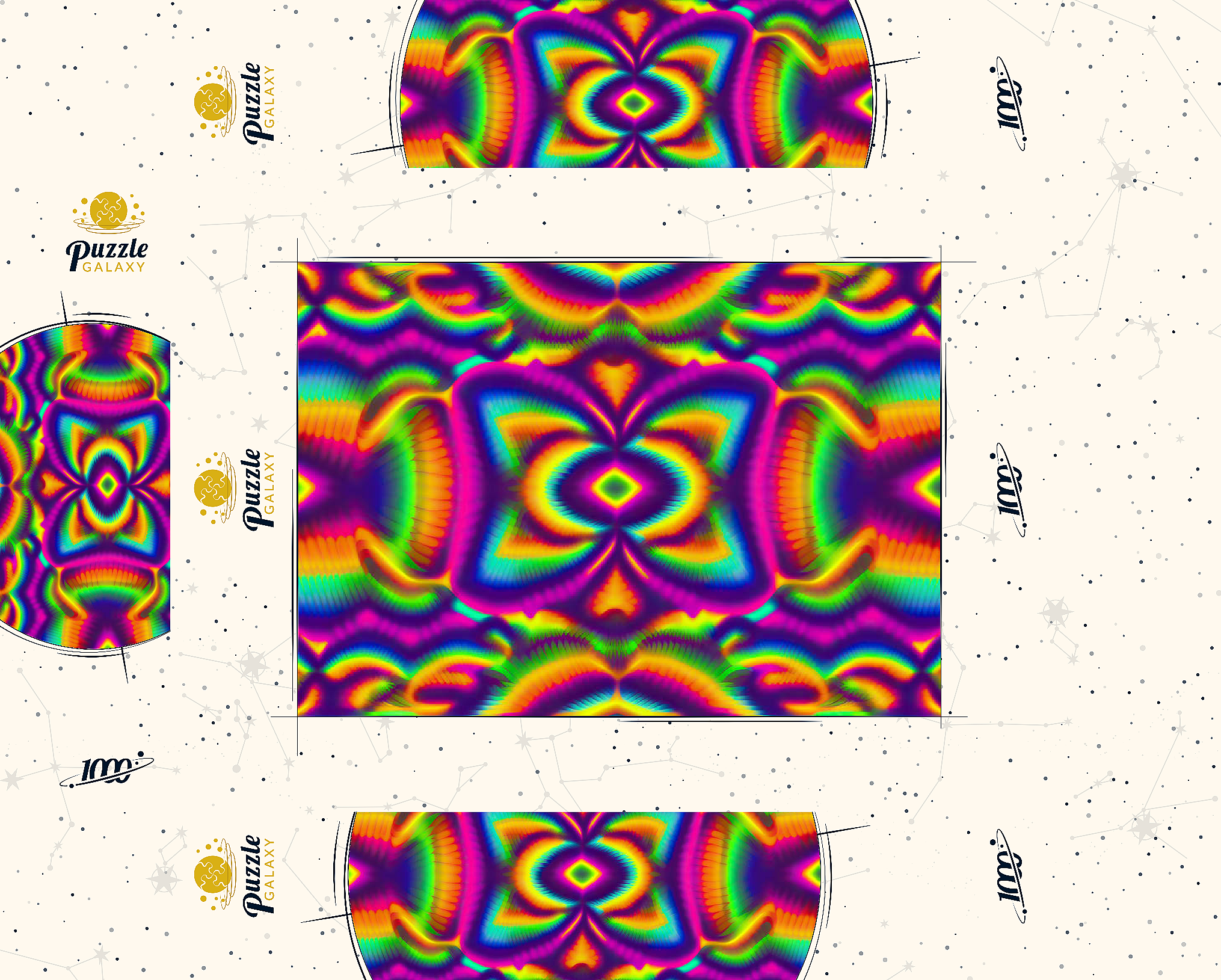 Tauchen Sie mit diesem lebhaften psychedelischen Muster in eine hypnotisierende Welt der Farben ein. Mit einer Explosion von Neontönen präsentiert dieses digitale Kunstwerk ein symmetrisches, kaleidoskopisches Design mit leuchtenden Farbverläufen in elektrischem Blau, feurigem Orange, lebhaftem Pink und leuchtendem Grün. Die verschlungenen Formen und fließenden Muster vermitteln ein Gefühl der Bewegung und erzeugen einen fesselnden visuellen Effekt, der an trippige, fraktal inspirierte Kunst erinnert.