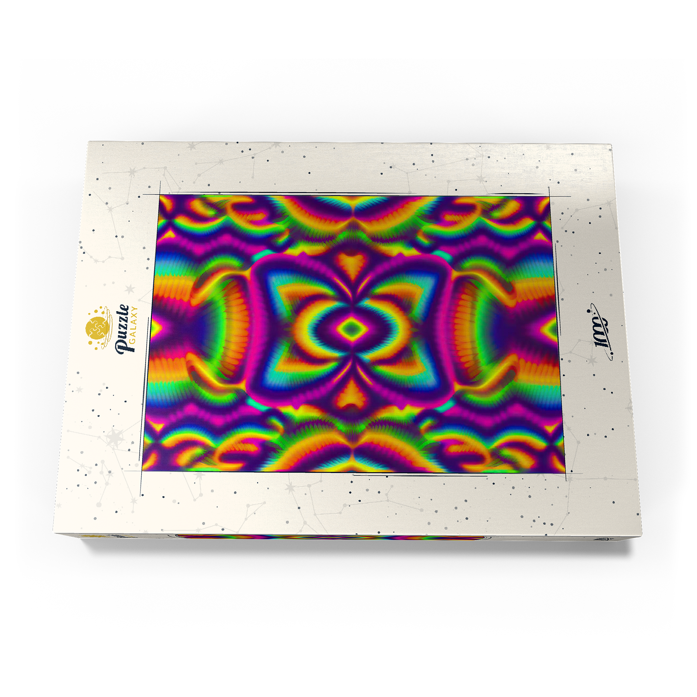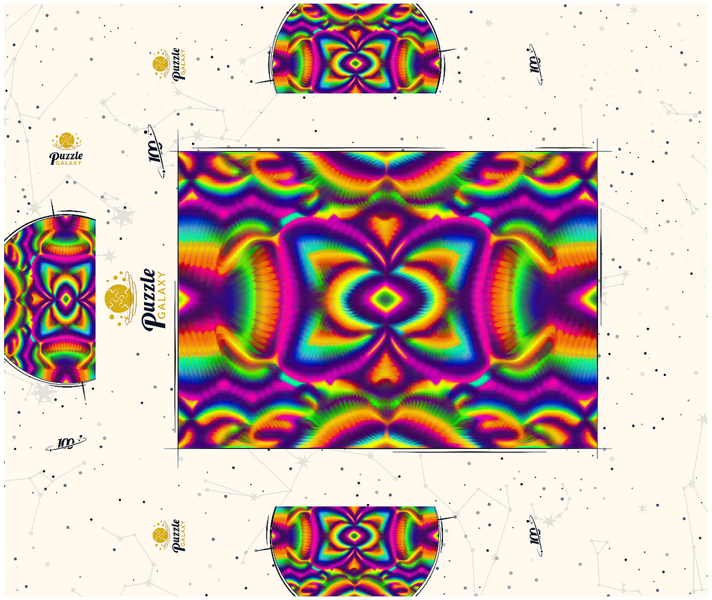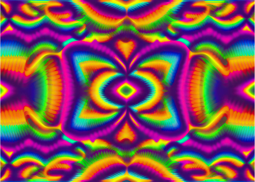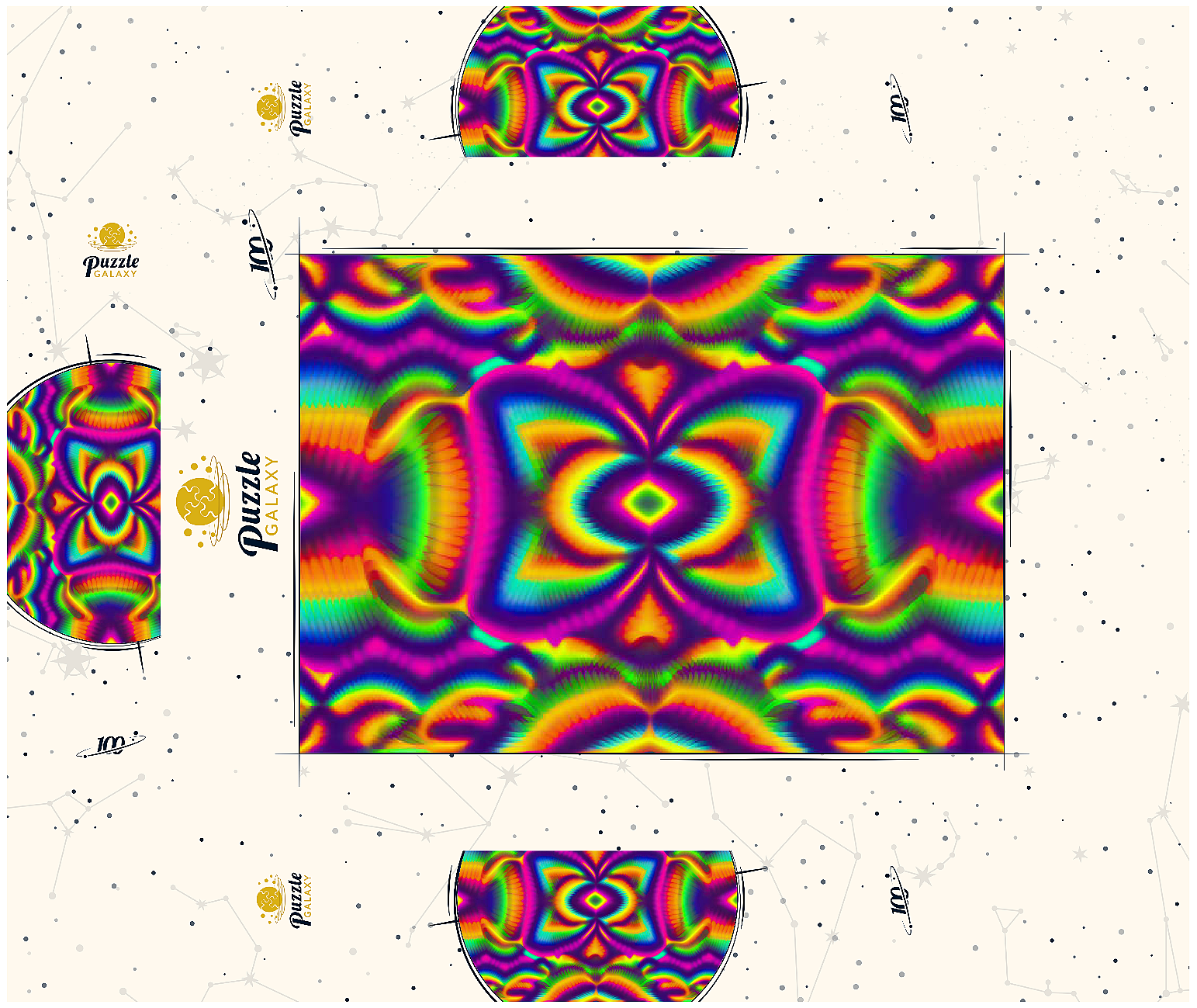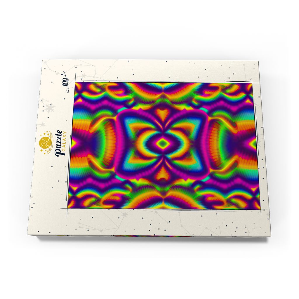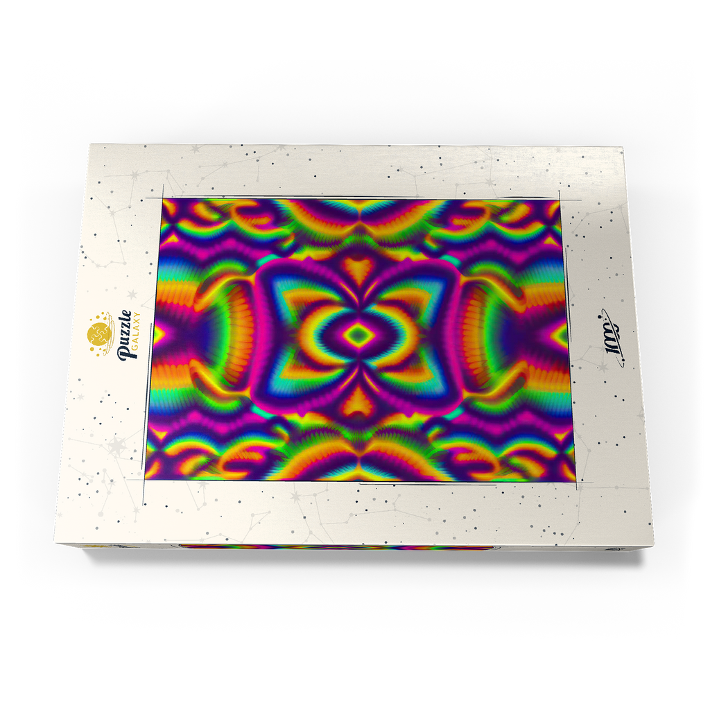 Tauchen Sie mit diesem lebhaften psychedelischen Muster in eine hypnotisierende Welt der Farben ein. Mit einer Explosion von Neontönen präsentiert dieses digitale Kunstwerk ein symmetrisches, kaleidoskopisches Design mit leuchtenden Farbverläufen in elektrischem Blau, feurigem Orange, lebhaftem Pink und leuchtendem Grün. Die verschlungenen Formen und fließenden Muster vermitteln ein Gefühl der Bewegung und erzeugen einen fesselnden visuellen Effekt, der an trippige, fraktal inspirierte Kunst erinnert.