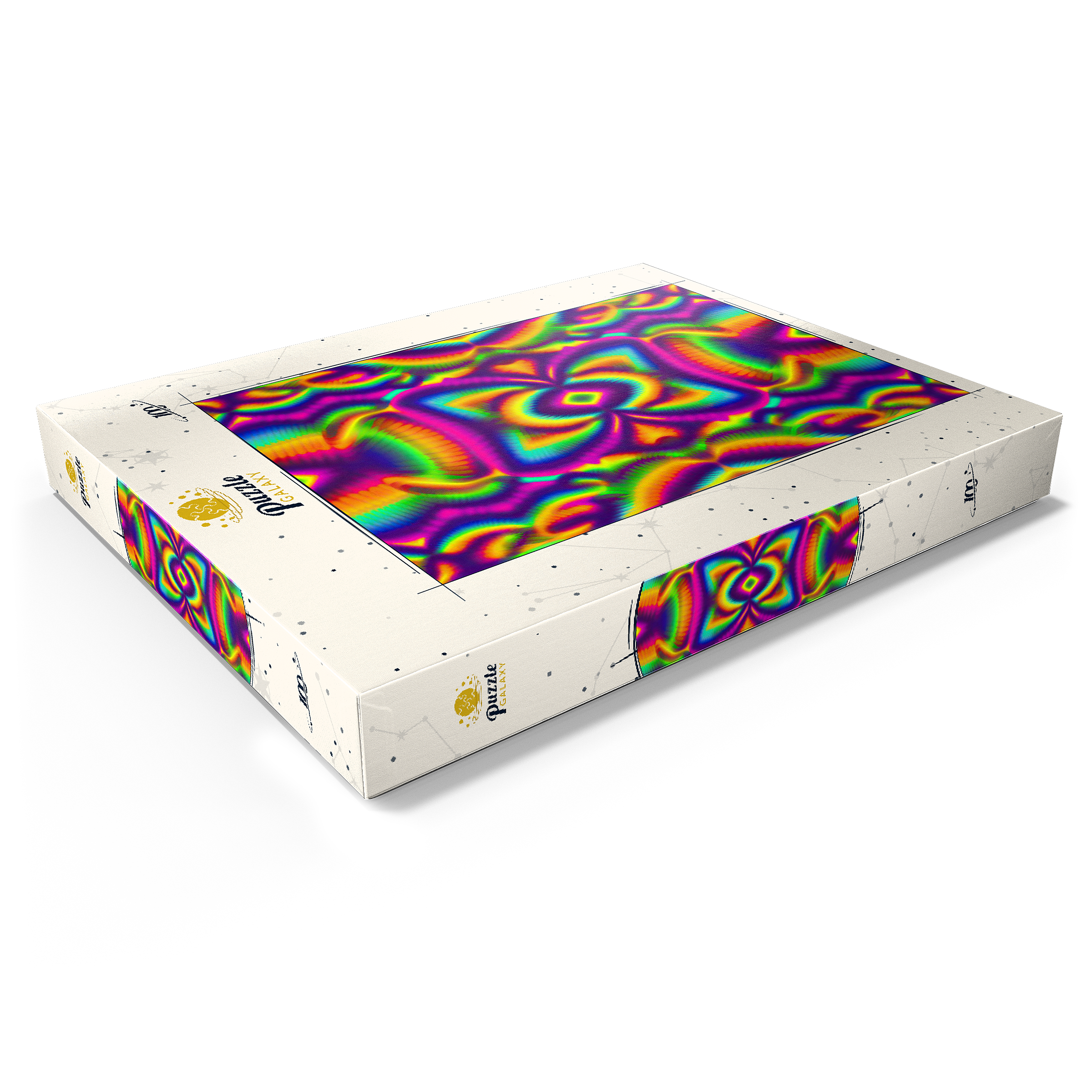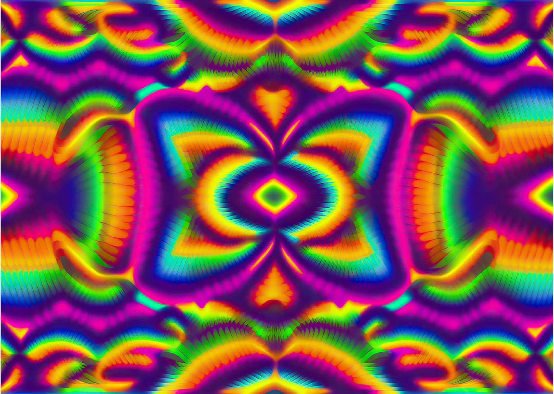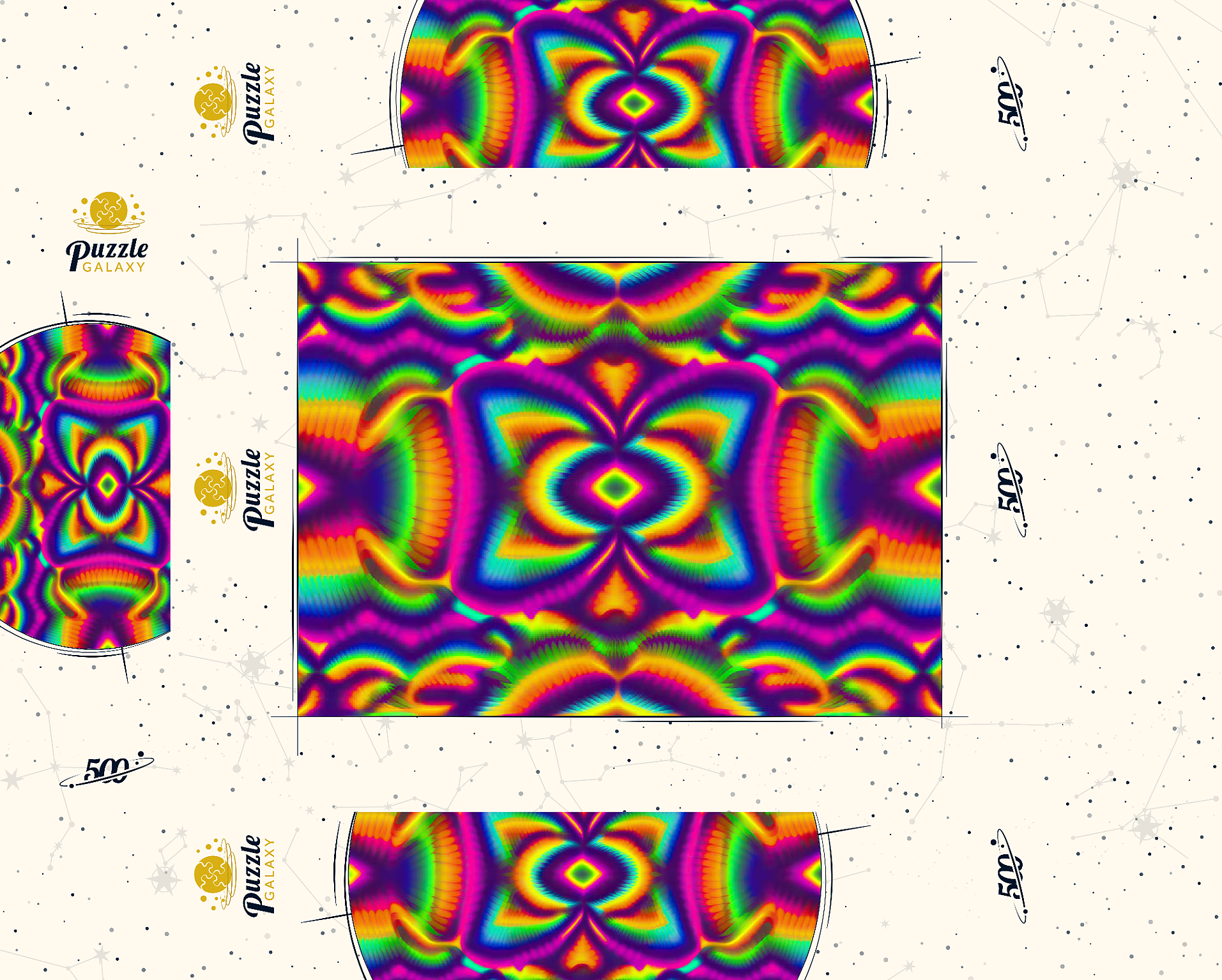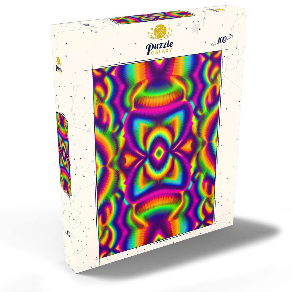 Tauchen Sie mit diesem lebhaften psychedelischen Muster in eine hypnotisierende Welt der Farben ein. Mit einer Explosion von Neontönen präsentiert dieses digitale Kunstwerk ein symmetrisches, kaleidoskopisches Design mit leuchtenden Farbverläufen in elektrischem Blau, feurigem Orange, lebhaftem Pink und leuchtendem Grün. Die verschlungenen Formen und fließenden Muster vermitteln ein Gefühl der Bewegung und erzeugen einen fesselnden visuellen Effekt, der an trippige, fraktal inspirierte Kunst erinnert.