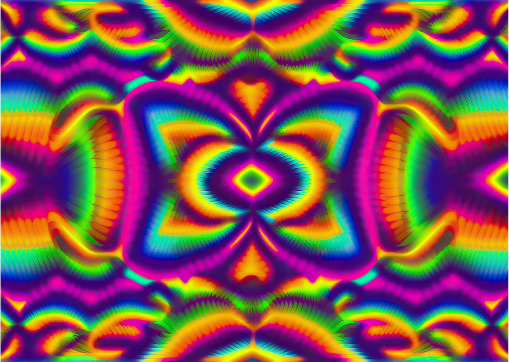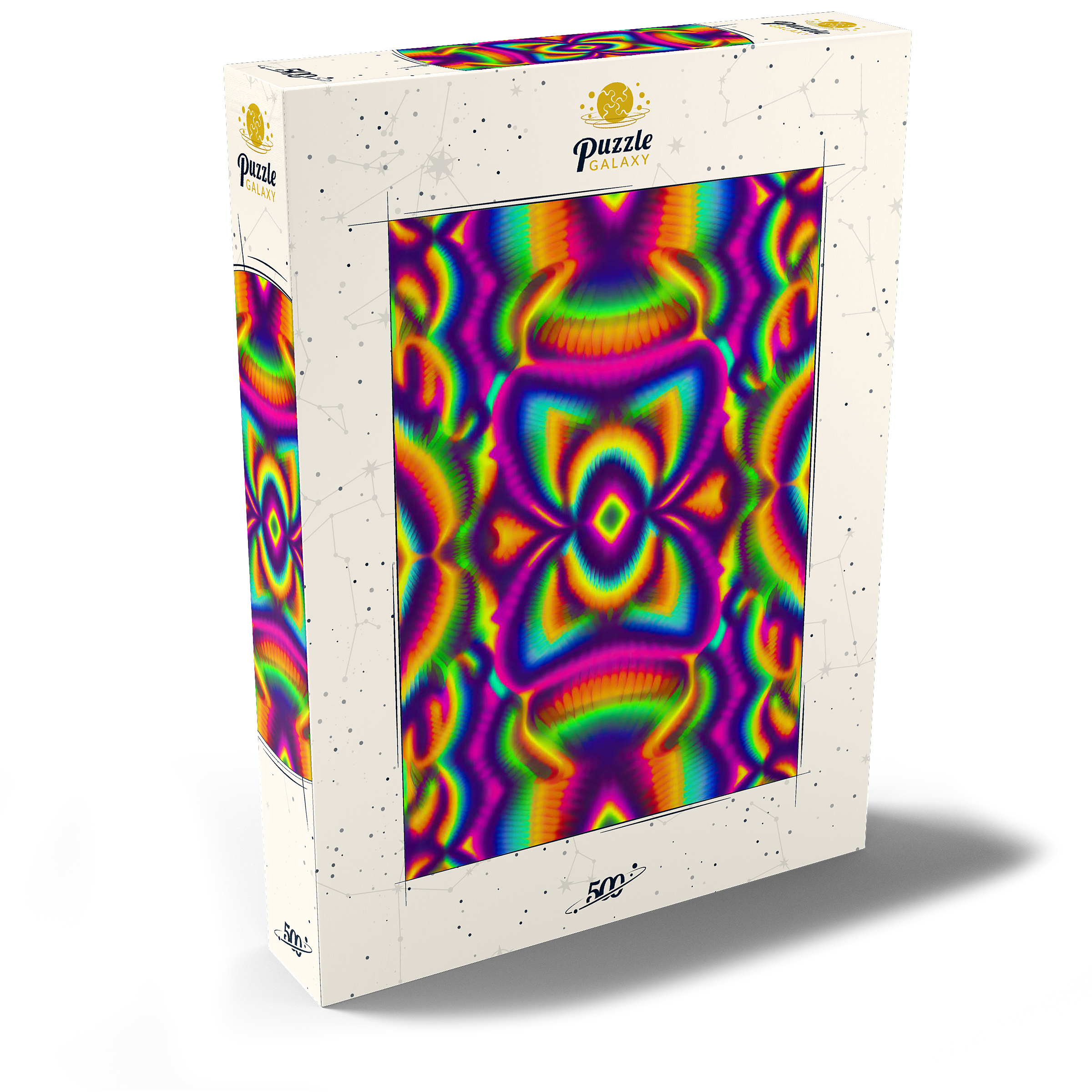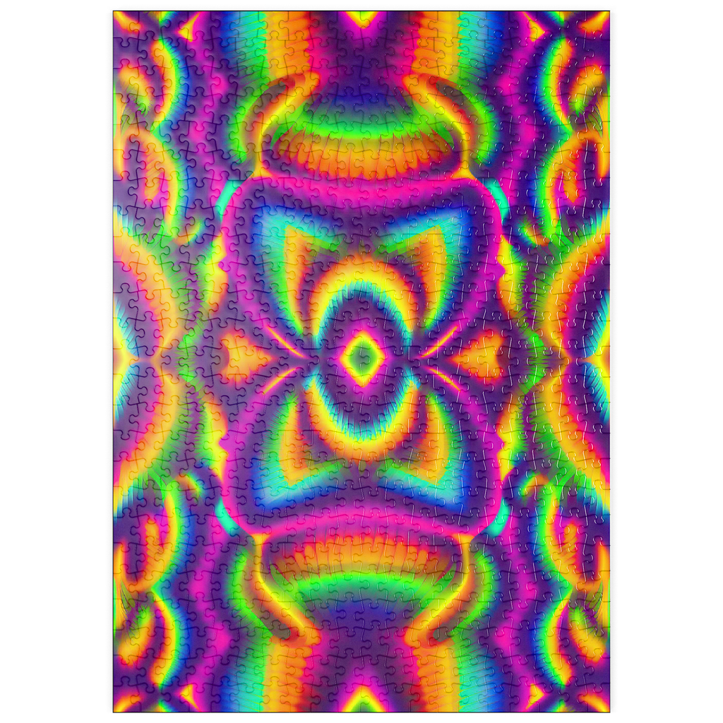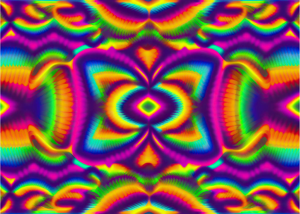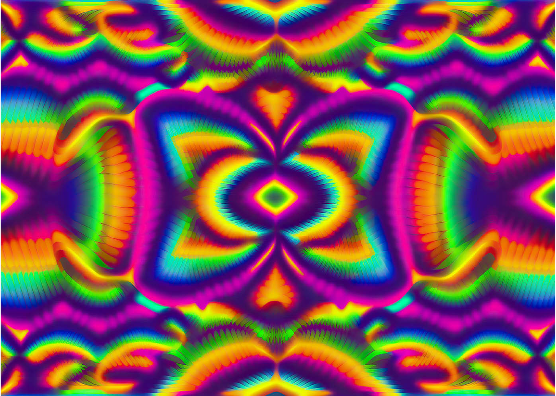 Tauchen Sie mit diesem lebhaften psychedelischen Muster in eine hypnotisierende Welt der Farben ein. Mit einer Explosion von Neontönen präsentiert dieses digitale Kunstwerk ein symmetrisches, kaleidoskopisches Design mit leuchtenden Farbverläufen in elektrischem Blau, feurigem Orange, lebhaftem Pink und leuchtendem Grün. Die verschlungenen Formen und fließenden Muster vermitteln ein Gefühl der Bewegung und erzeugen einen fesselnden visuellen Effekt, der an trippige, fraktal inspirierte Kunst erinnert.