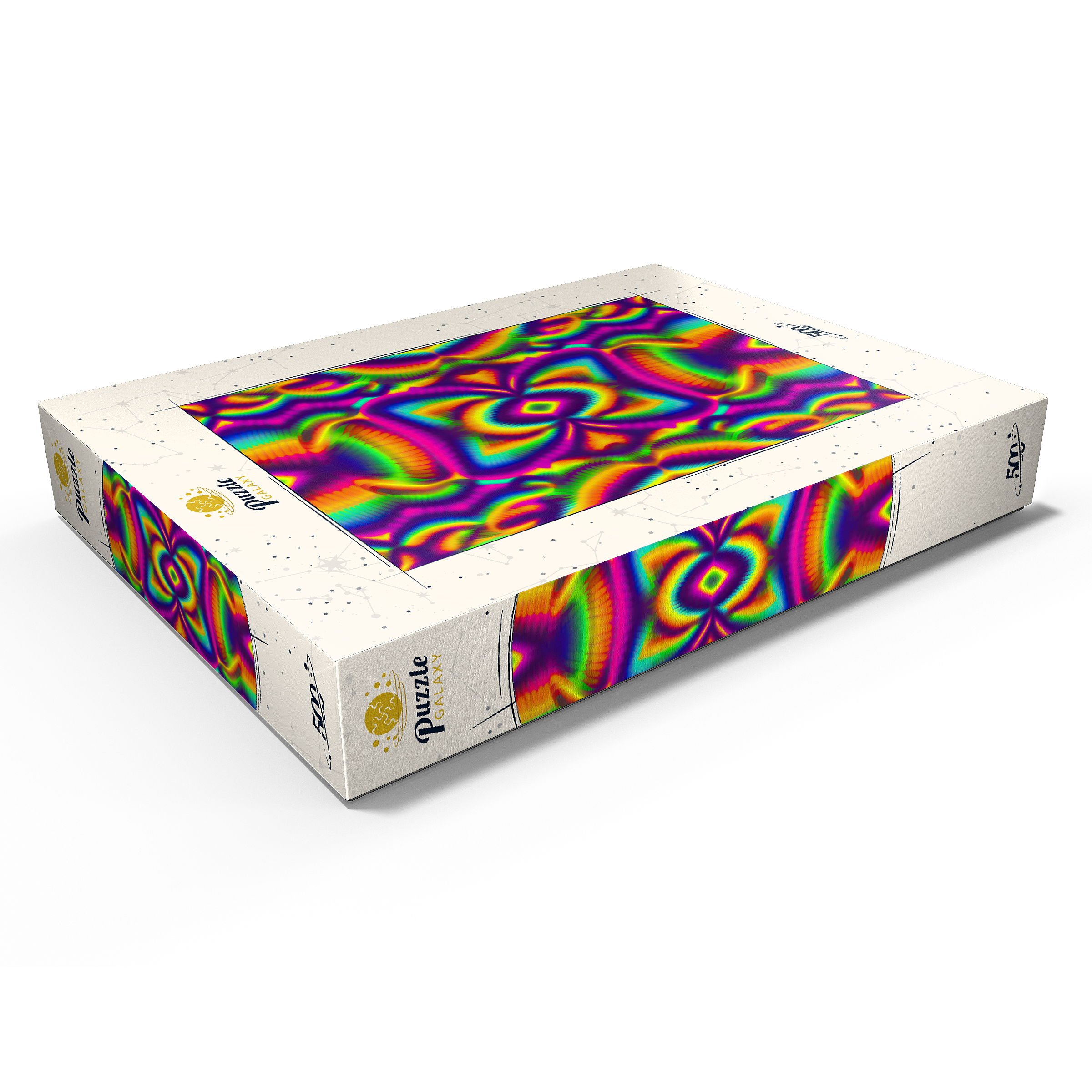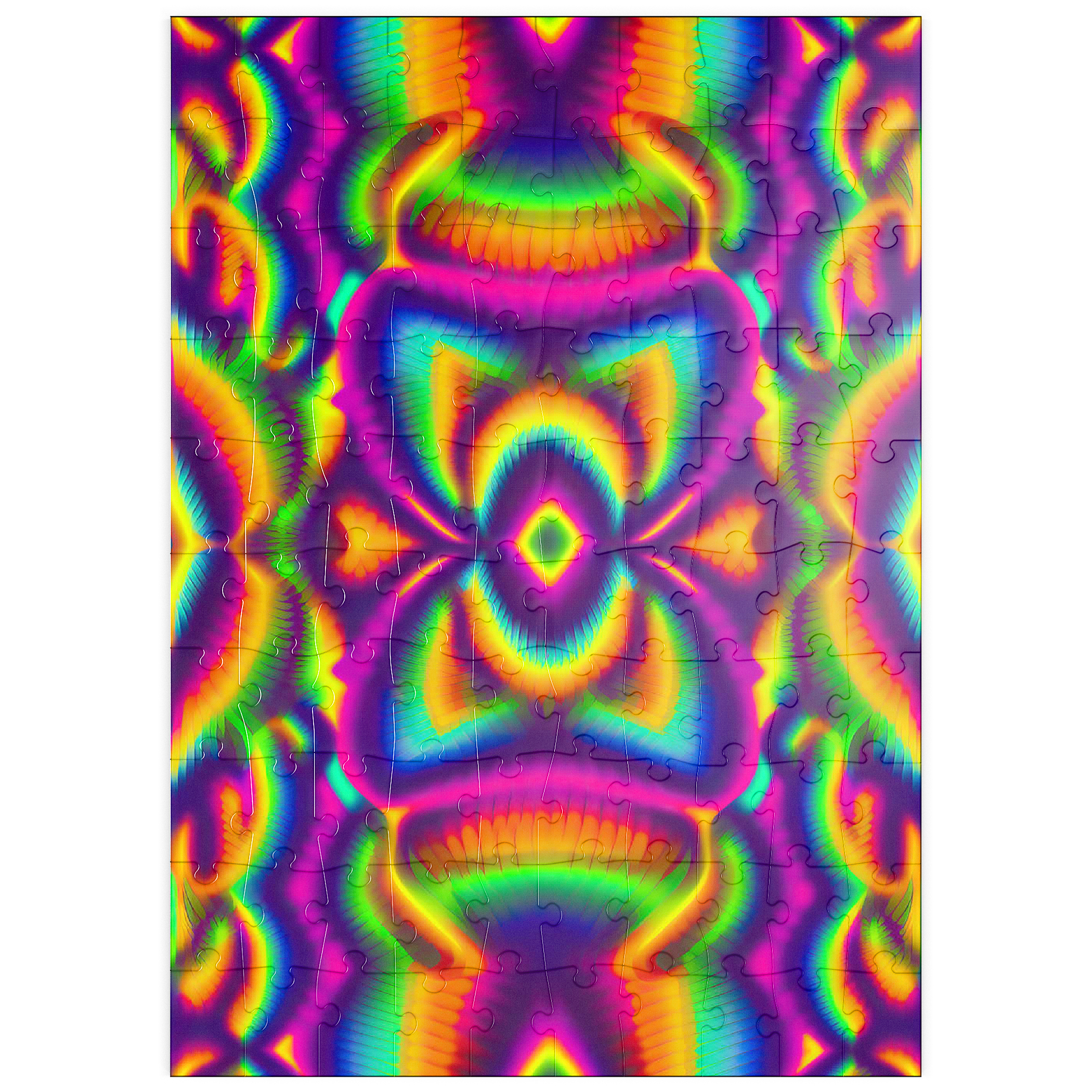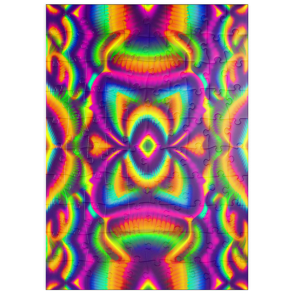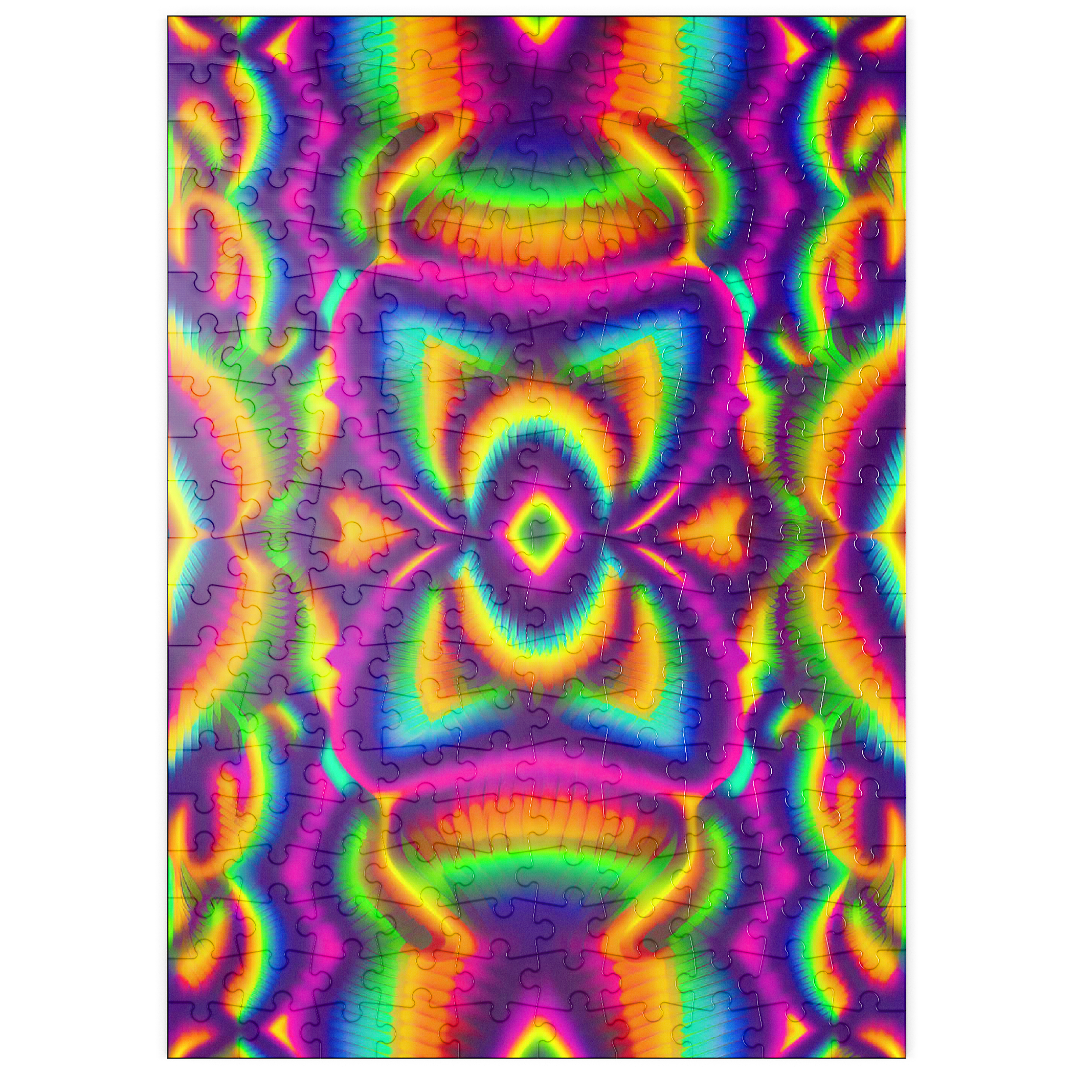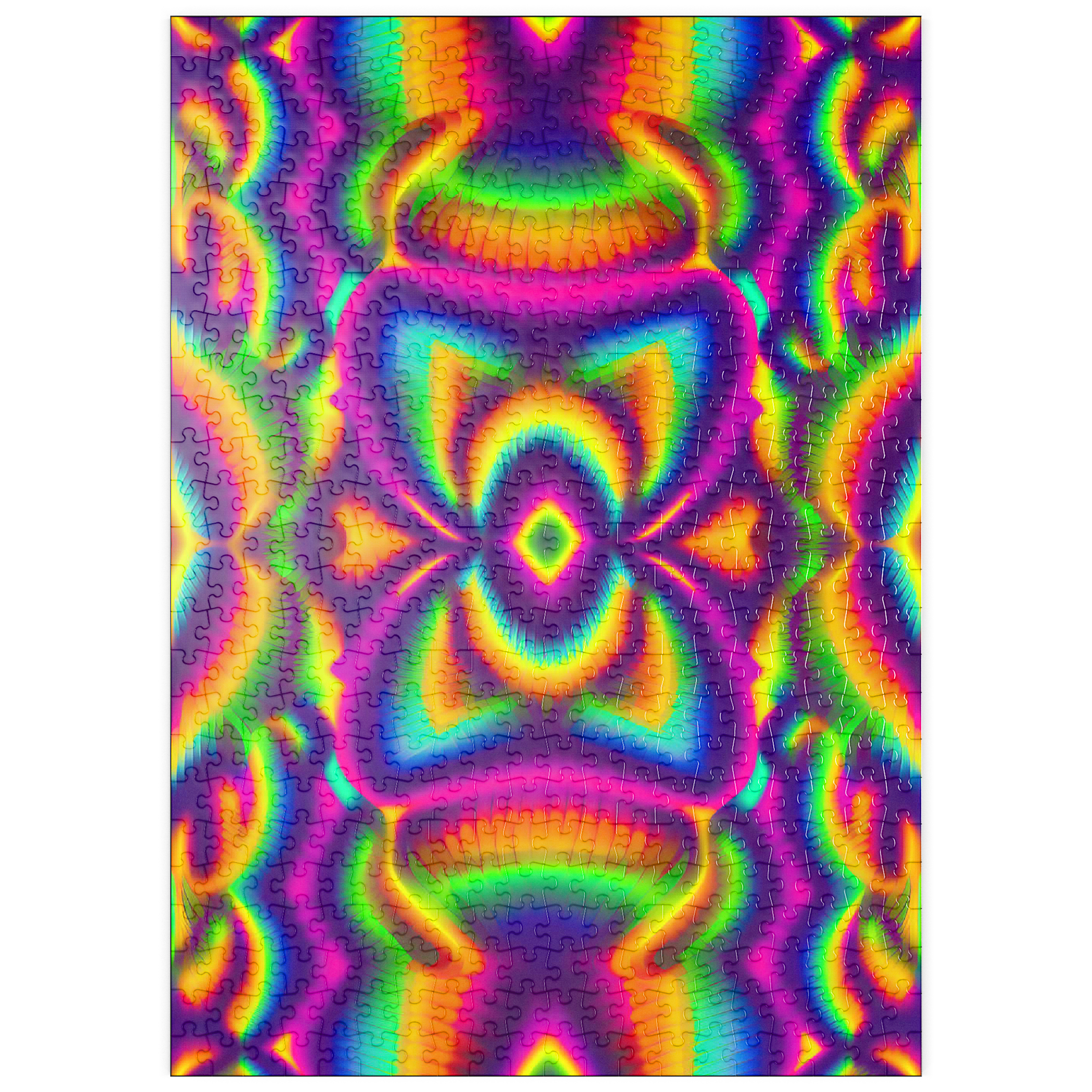 Tauchen Sie mit diesem lebhaften psychedelischen Muster in eine hypnotisierende Welt der Farben ein. Mit einer Explosion von Neontönen präsentiert dieses digitale Kunstwerk ein symmetrisches, kaleidoskopisches Design mit leuchtenden Farbverläufen in elektrischem Blau, feurigem Orange, lebhaftem Pink und leuchtendem Grün. Die verschlungenen Formen und fließenden Muster vermitteln ein Gefühl der Bewegung und erzeugen einen fesselnden visuellen Effekt, der an trippige, fraktal inspirierte Kunst erinnert.