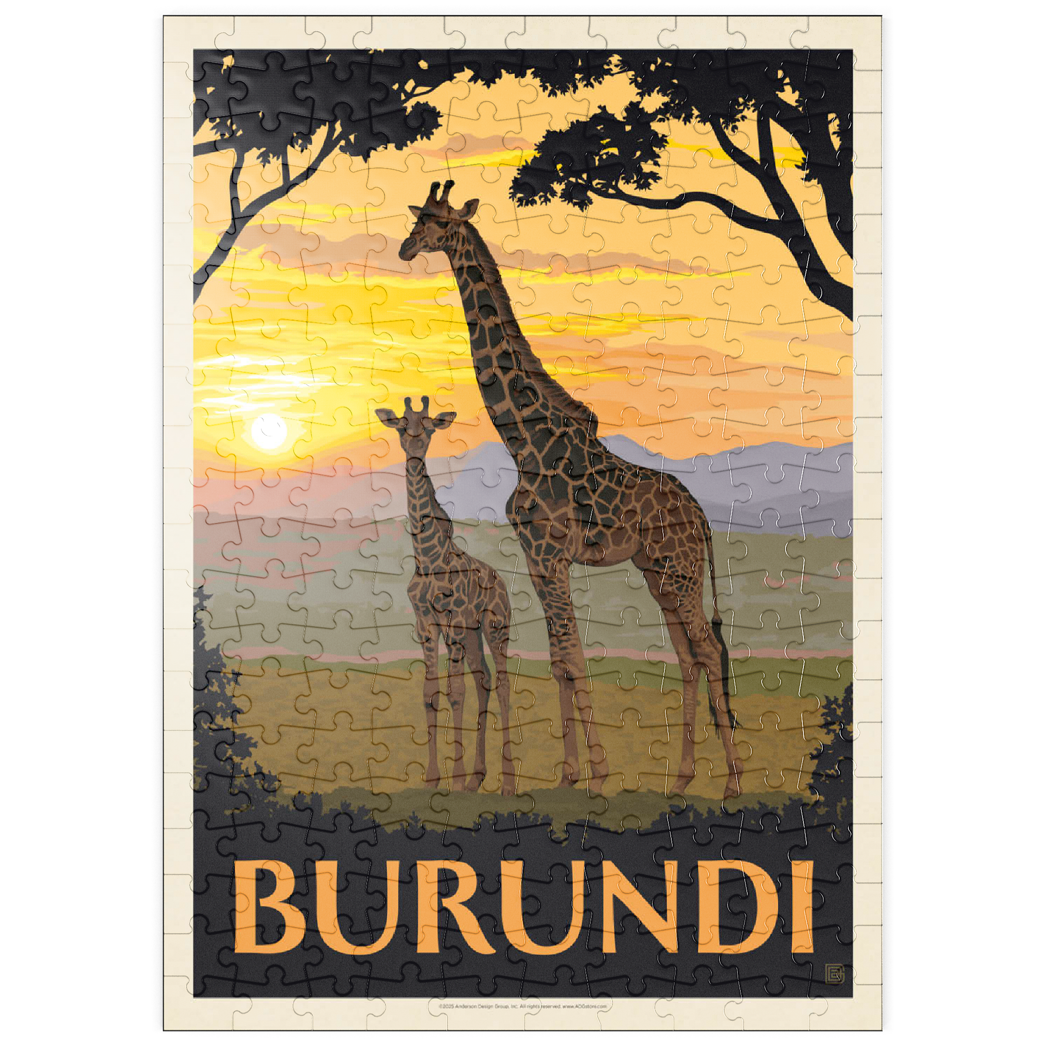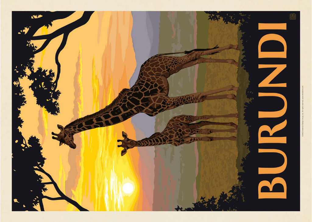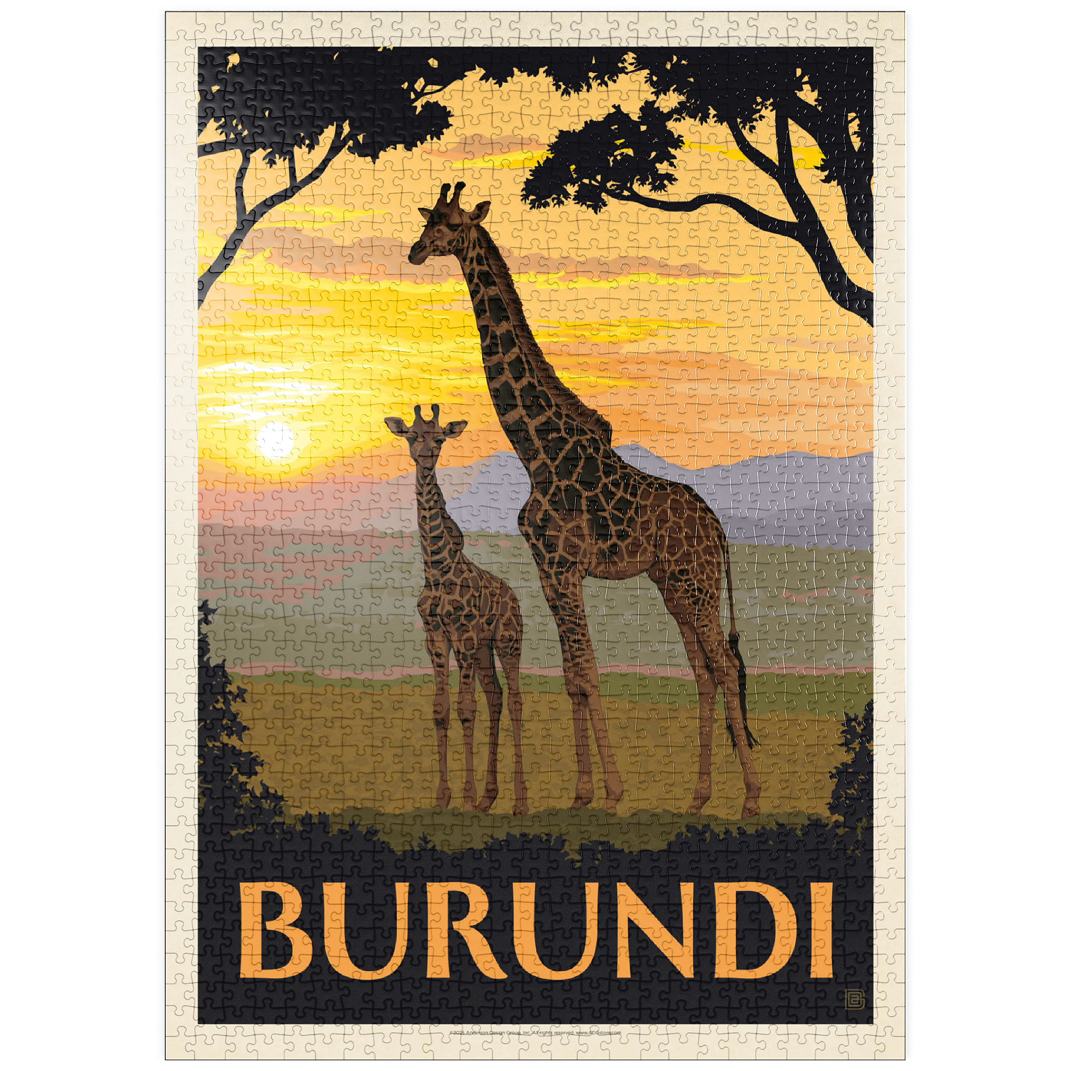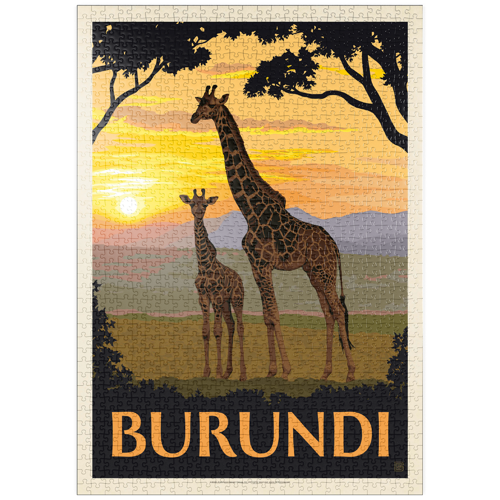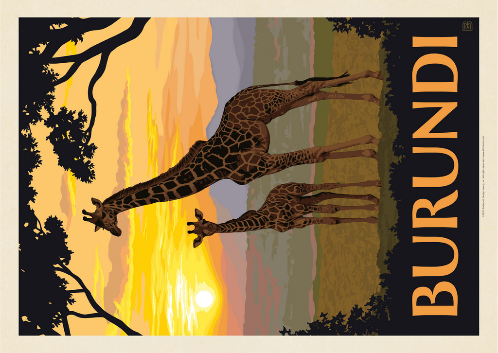 Diese fesselnde Szene zeigt zwei anmutige Giraffen, die sich vor dem lebendigen Hintergrund eines goldenen afrikanischen Sonnenuntergangs in Burundi erheben. Das eindrucksvolle Bild zeigt eine hoch aufragende erwachsene Giraffe und ein neugieriges junges Kalb, beide umgeben von der natürlichen Schönheit der Savanne. Silhouettierte Akazienbäume rahmen die Ansicht ein, während die warmen Farbtöne der untergehenden Sonne ein sanftes Licht auf die Landschaft werfen und eine ruhige und zeitlose Atmosphäre schaffen. Burundi liegt im Herzen Ostafrikas und beherbergt eine vielfältige Tierwelt und beeindruckende Naturreservate. Diese Darstellung spiegelt die reiche Artenvielfalt der Region wider, in der Giraffen frei über offene Ebenen und Graslandschaften streifen. Die friedliche Interaktion zwischen den Giraffen, gepaart mit dem dramatischen Himmel und den fernen Bergketten, unterstreicht die ungezähmte Schönheit der Landschaften Burundis. Diese Szene ist perfekt für Wildtier- und Naturliebhaber und fängt die Essenz einer afrikanischen Safari ein, indem sie die Eleganz und Majestät der Giraffen in ihrem natürlichen Lebensraum zeigt. Die warmen Farbtöne und die ruhige Umgebung wecken den Geist des Abenteuers und die zeitlose Faszination der afrikanischen Natur.