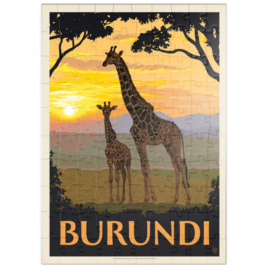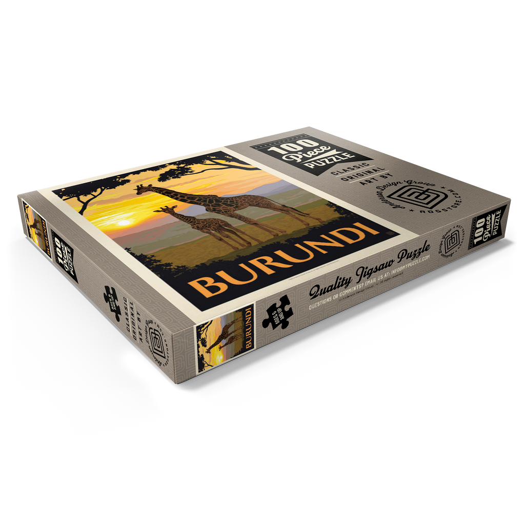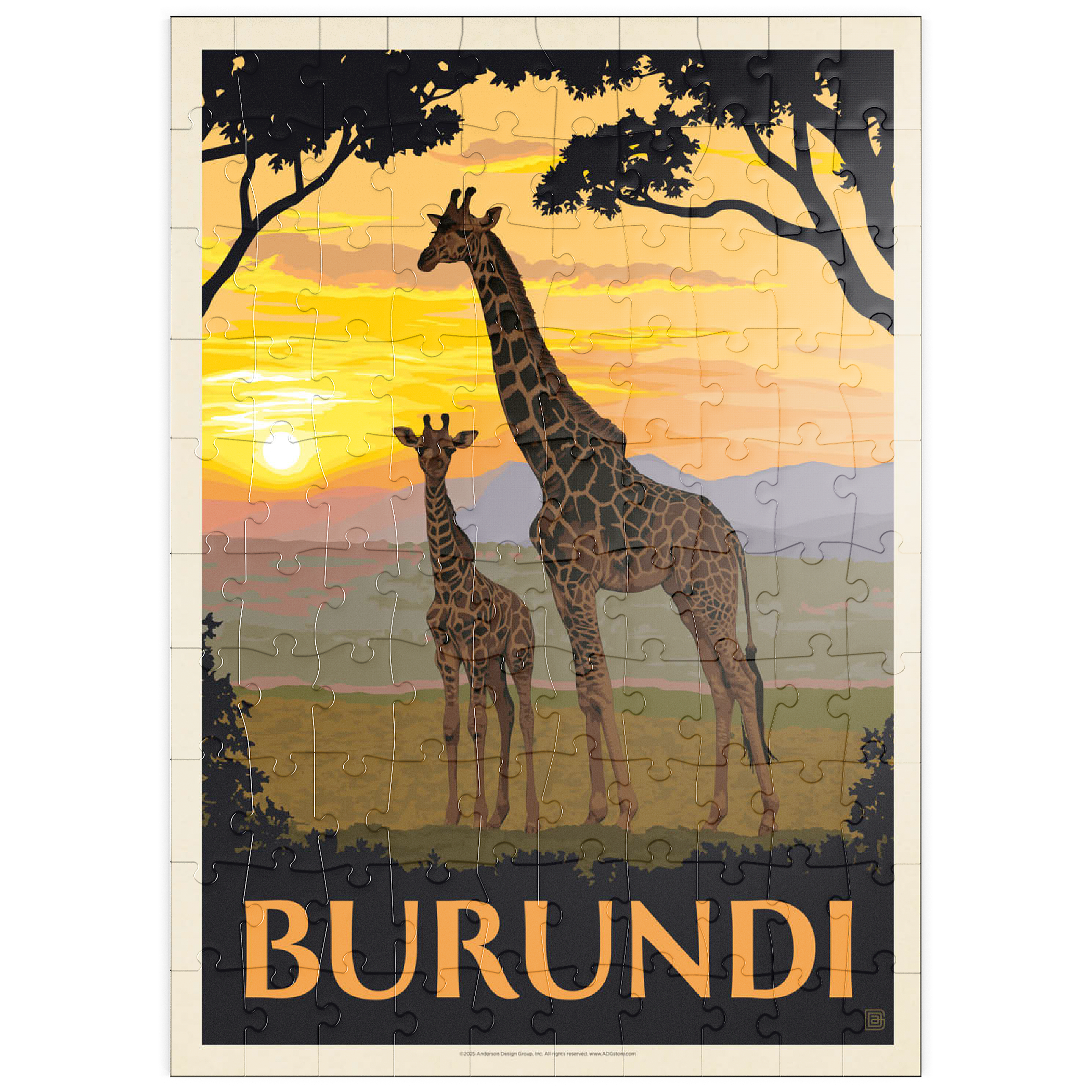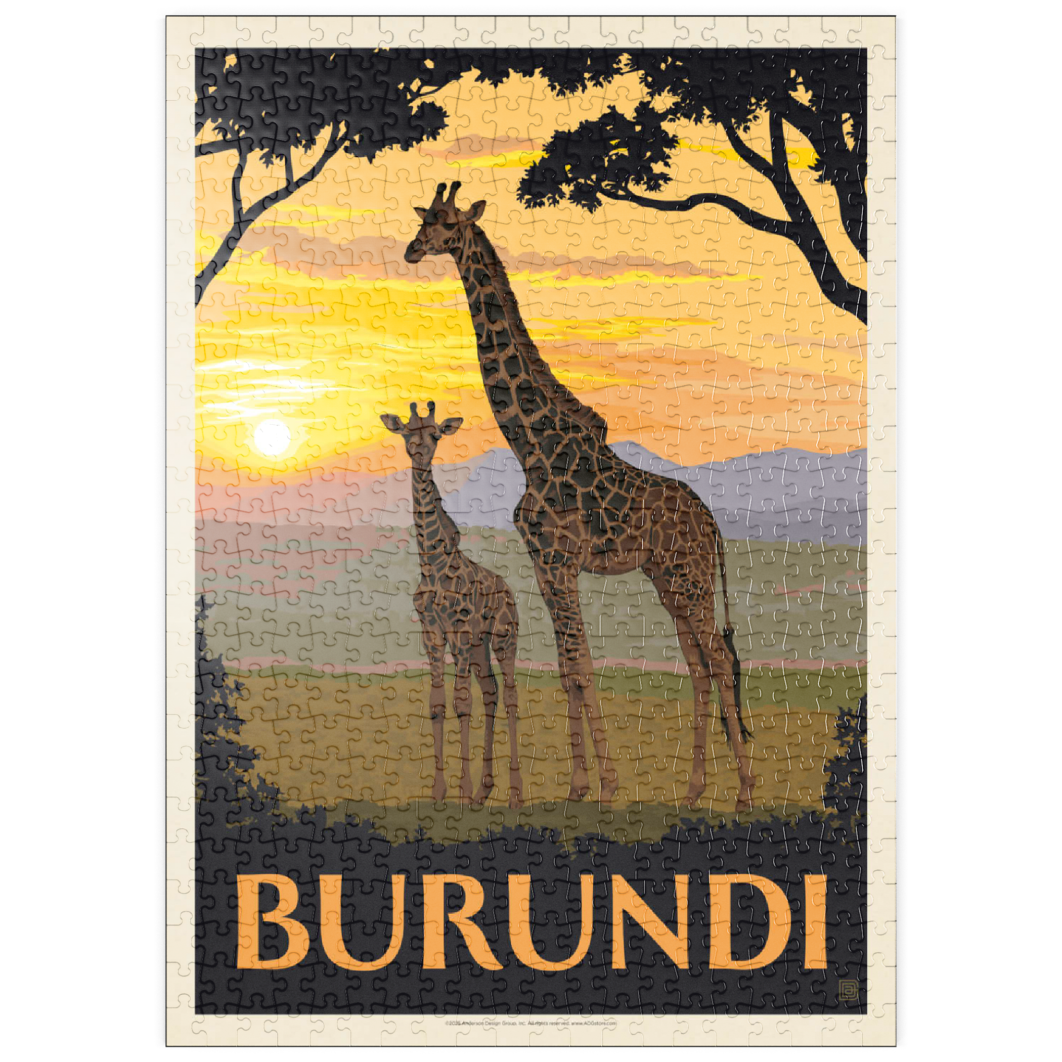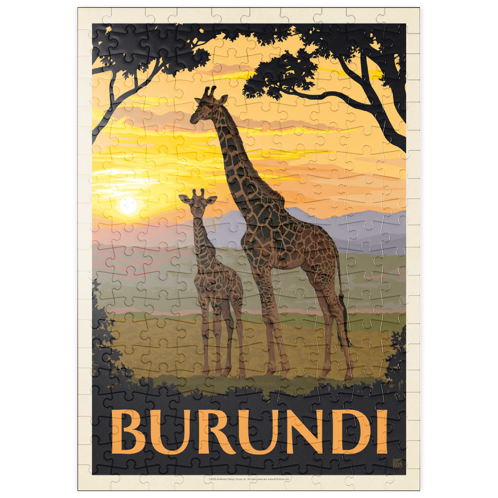 Diese fesselnde Szene zeigt zwei anmutige Giraffen, die sich vor dem lebendigen Hintergrund eines goldenen afrikanischen Sonnenuntergangs in Burundi erheben. Das eindrucksvolle Bild zeigt eine hoch aufragende erwachsene Giraffe und ein neugieriges junges Kalb, beide umgeben von der natürlichen Schönheit der Savanne. Silhouettierte Akazienbäume rahmen die Ansicht ein, während die warmen Farbtöne der untergehenden Sonne ein sanftes Licht auf die Landschaft werfen und eine ruhige und zeitlose Atmosphäre schaffen. Burundi liegt im Herzen Ostafrikas und beherbergt eine vielfältige Tierwelt und beeindruckende Naturreservate. Diese Darstellung spiegelt die reiche Artenvielfalt der Region wider, in der Giraffen frei über offene Ebenen und Graslandschaften streifen. Die friedliche Interaktion zwischen den Giraffen, gepaart mit dem dramatischen Himmel und den fernen Bergketten, unterstreicht die ungezähmte Schönheit der Landschaften Burundis. Diese Szene ist perfekt für Wildtier- und Naturliebhaber und fängt die Essenz einer afrikanischen Safari ein, indem sie die Eleganz und Majestät der Giraffen in ihrem natürlichen Lebensraum zeigt. Die warmen Farbtöne und die ruhige Umgebung wecken den Geist des Abenteuers und die zeitlose Faszination der afrikanischen Natur.
