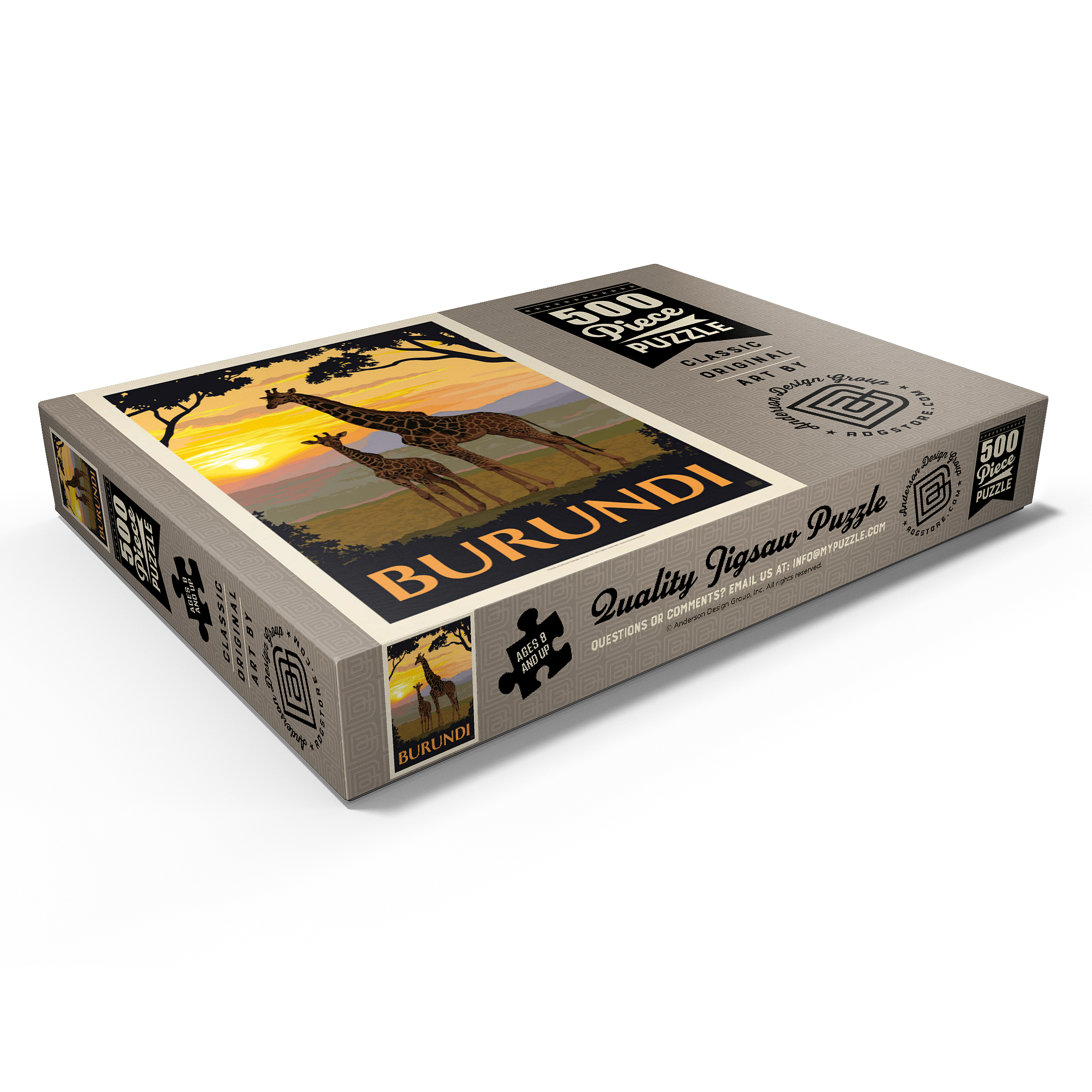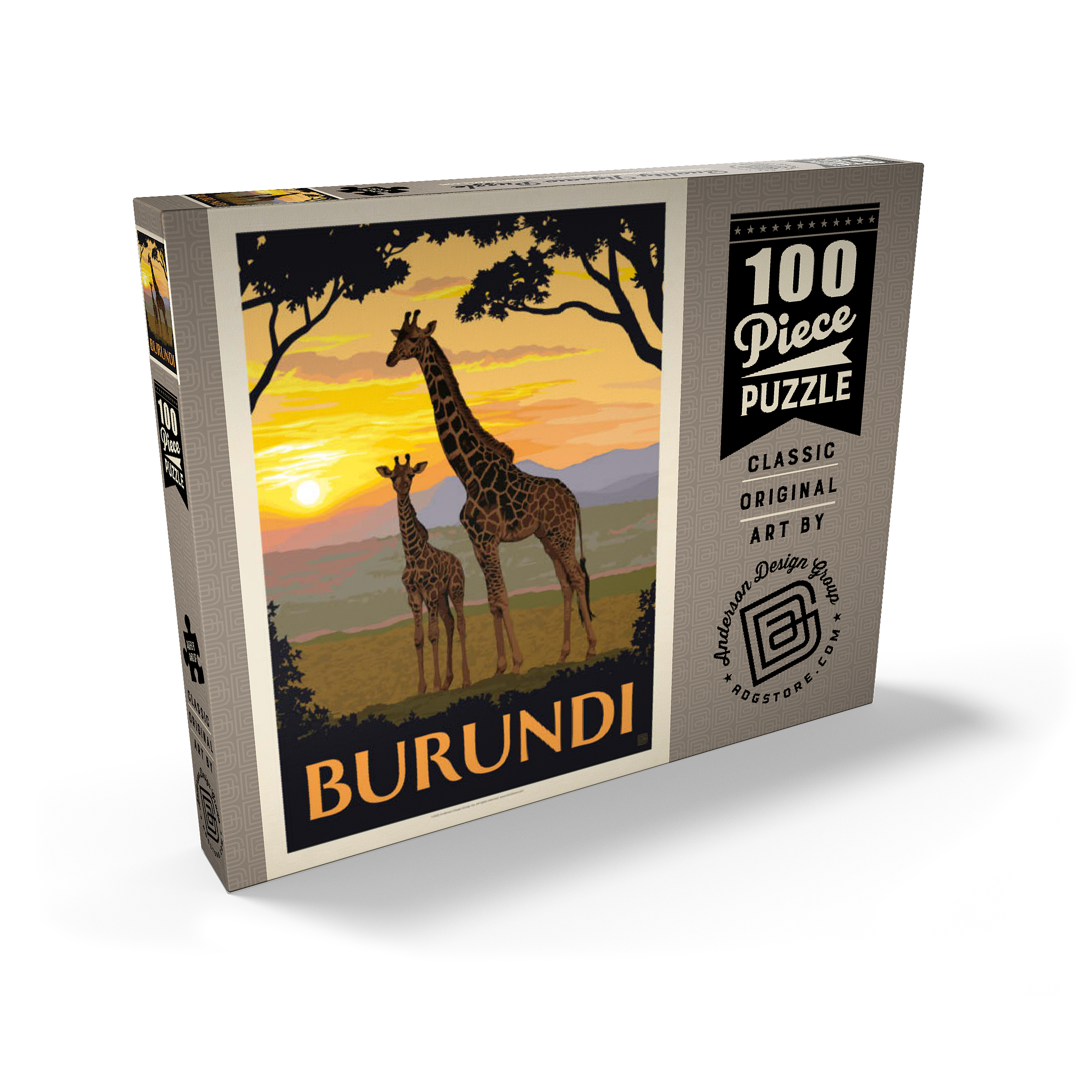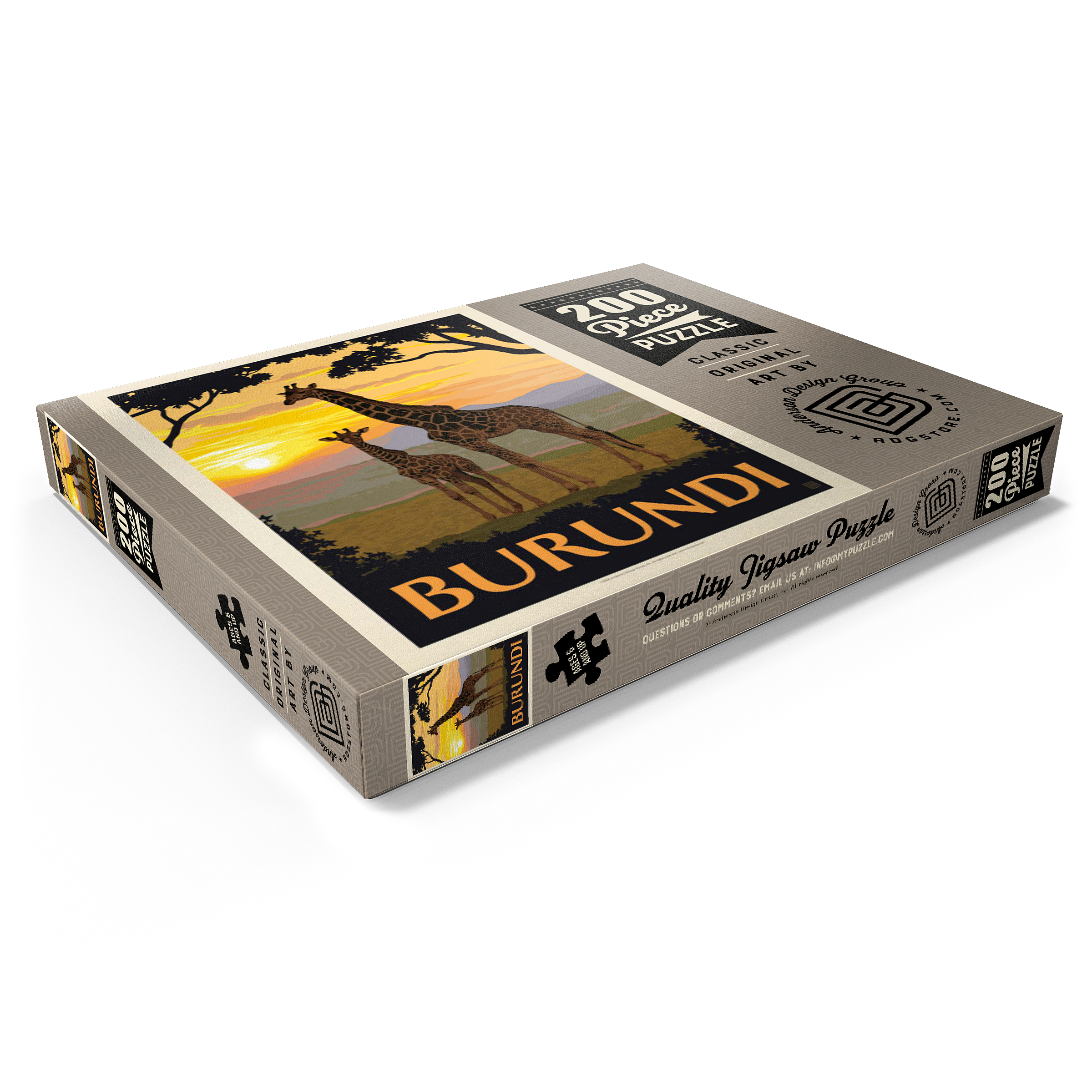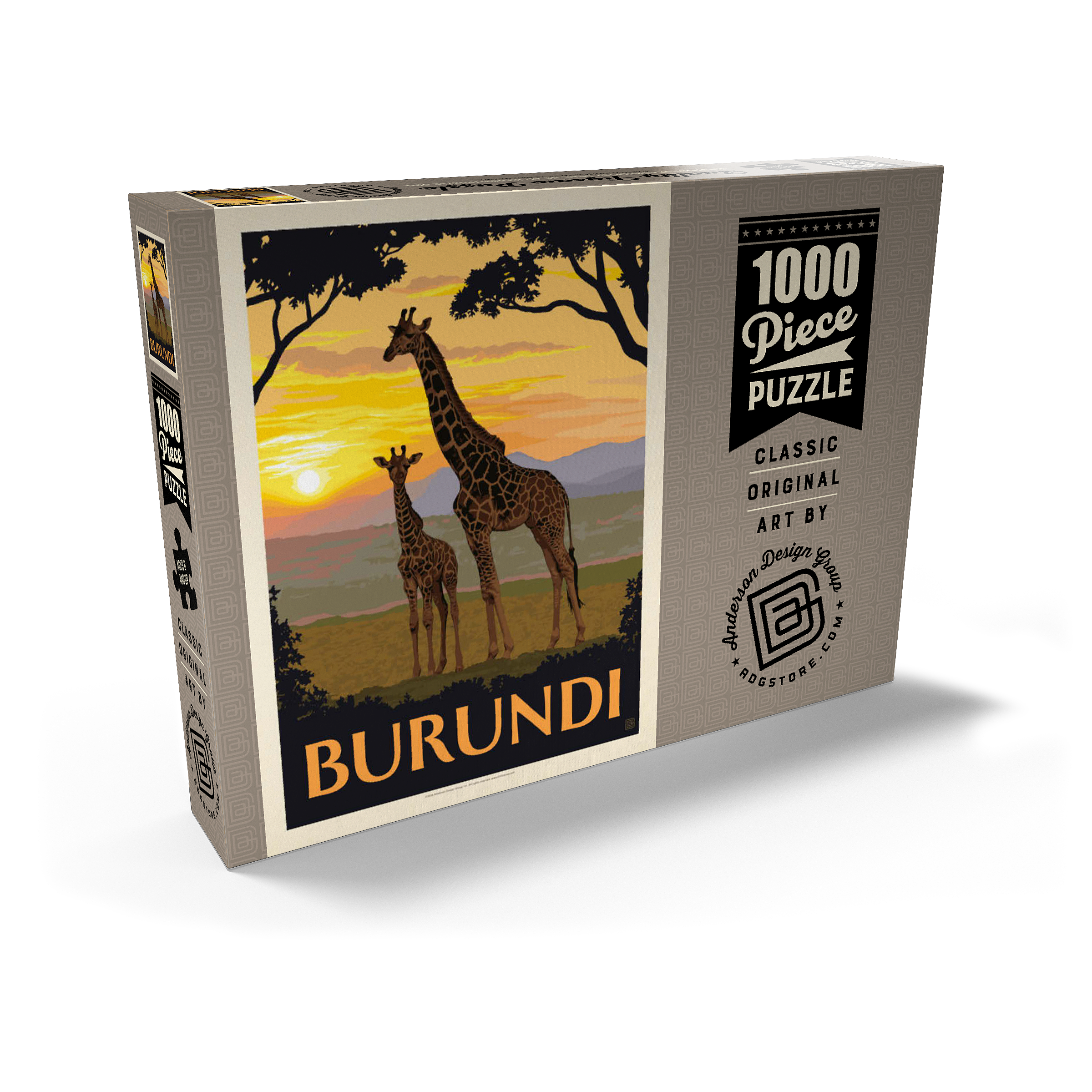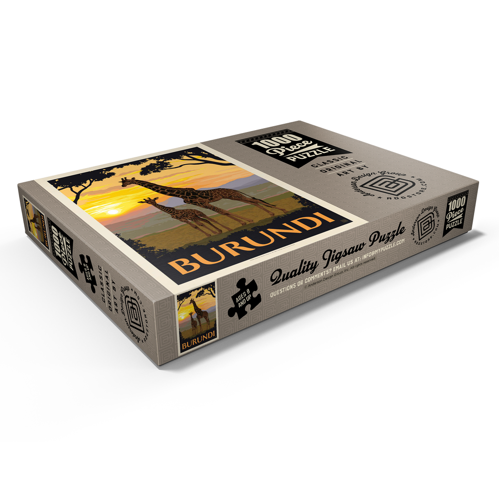 Diese fesselnde Szene zeigt zwei anmutige Giraffen, die sich vor dem lebendigen Hintergrund eines goldenen afrikanischen Sonnenuntergangs in Burundi erheben. Das eindrucksvolle Bild zeigt eine hoch aufragende erwachsene Giraffe und ein neugieriges junges Kalb, beide umgeben von der natürlichen Schönheit der Savanne. Silhouettierte Akazienbäume rahmen die Ansicht ein, während die warmen Farbtöne der untergehenden Sonne ein sanftes Licht auf die Landschaft werfen und eine ruhige und zeitlose Atmosphäre schaffen. Burundi liegt im Herzen Ostafrikas und beherbergt eine vielfältige Tierwelt und beeindruckende Naturreservate. Diese Darstellung spiegelt die reiche Artenvielfalt der Region wider, in der Giraffen frei über offene Ebenen und Graslandschaften streifen. Die friedliche Interaktion zwischen den Giraffen, gepaart mit dem dramatischen Himmel und den fernen Bergketten, unterstreicht die ungezähmte Schönheit der Landschaften Burundis. Diese Szene ist perfekt für Wildtier- und Naturliebhaber und fängt die Essenz einer afrikanischen Safari ein, indem sie die Eleganz und Majestät der Giraffen in ihrem natürlichen Lebensraum zeigt. Die warmen Farbtöne und die ruhige Umgebung wecken den Geist des Abenteuers und die zeitlose Faszination der afrikanischen Natur.