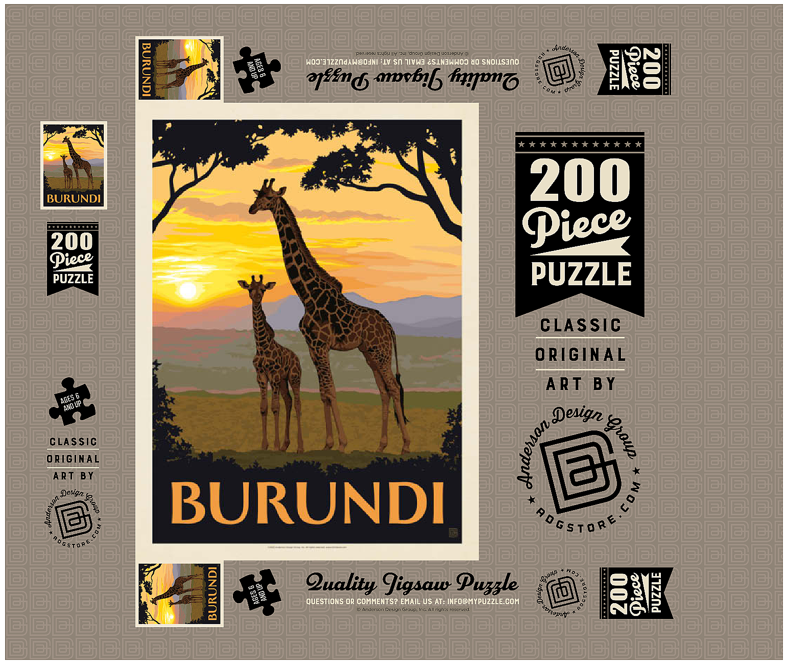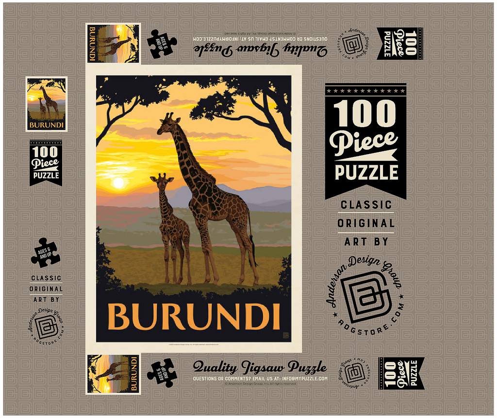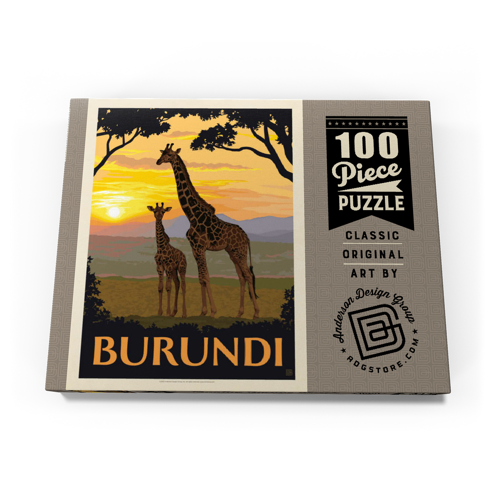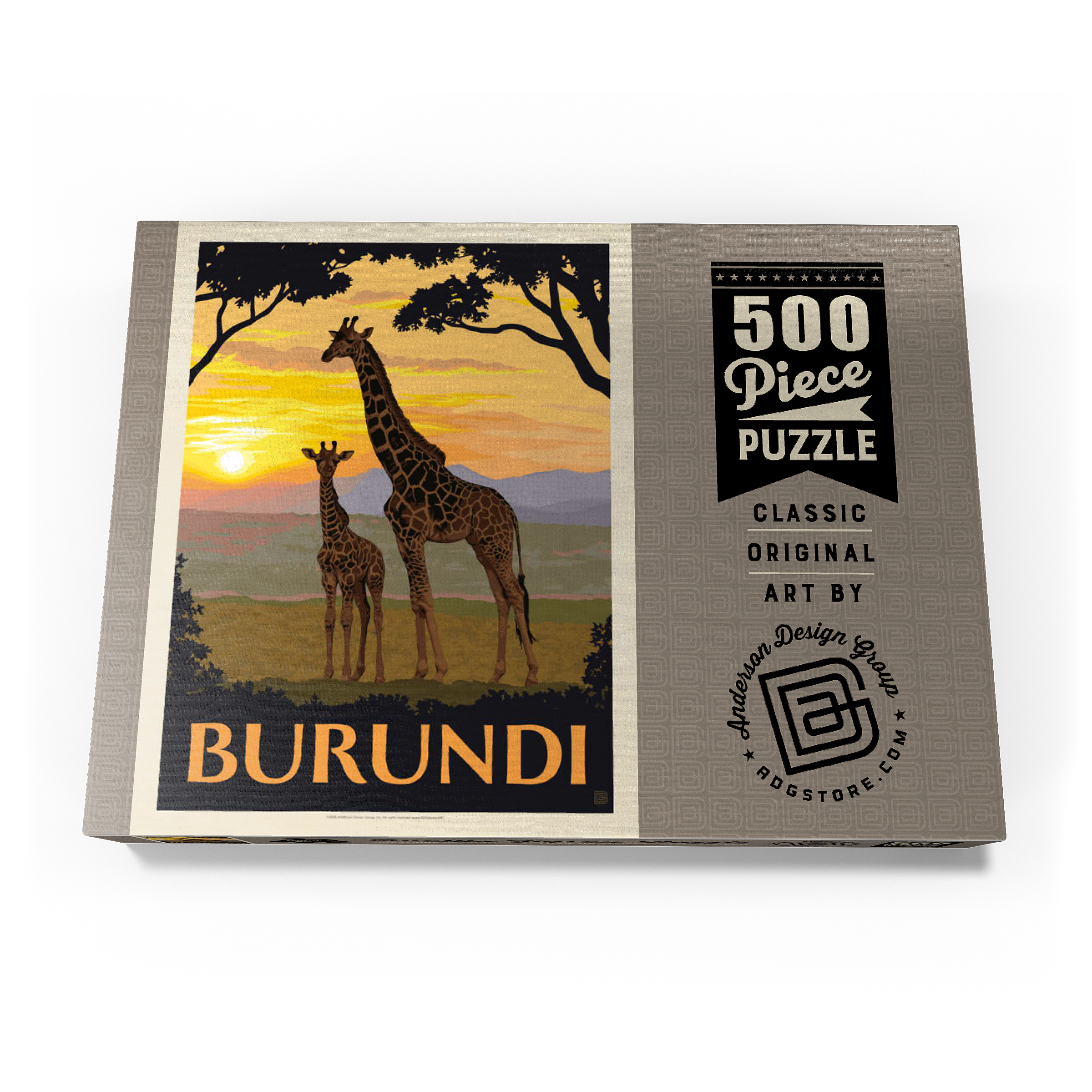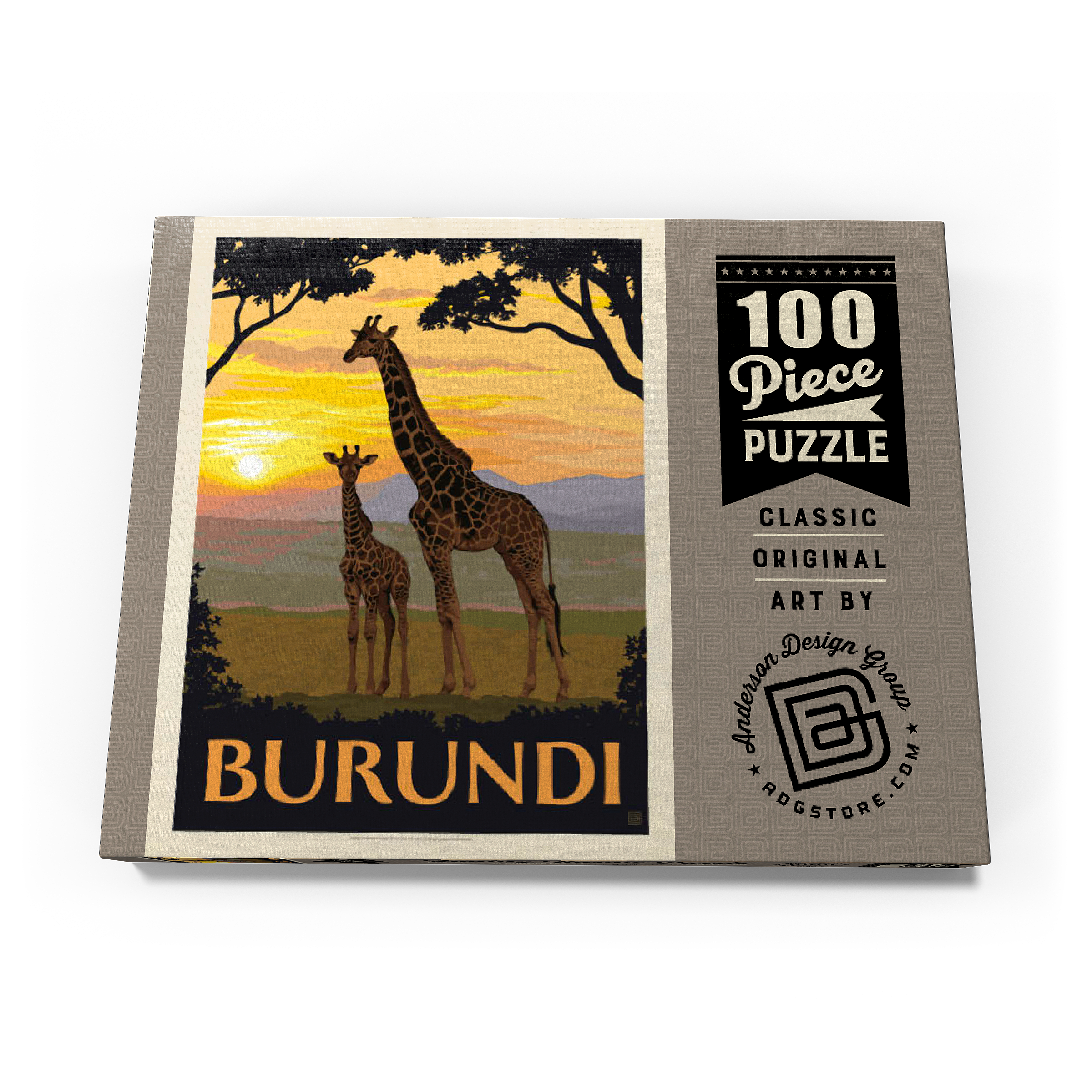 Diese fesselnde Szene zeigt zwei anmutige Giraffen, die sich vor dem lebendigen Hintergrund eines goldenen afrikanischen Sonnenuntergangs in Burundi erheben. Das eindrucksvolle Bild zeigt eine hoch aufragende erwachsene Giraffe und ein neugieriges junges Kalb, beide umgeben von der natürlichen Schönheit der Savanne. Silhouettierte Akazienbäume rahmen die Ansicht ein, während die warmen Farbtöne der untergehenden Sonne ein sanftes Licht auf die Landschaft werfen und eine ruhige und zeitlose Atmosphäre schaffen. Burundi liegt im Herzen Ostafrikas und beherbergt eine vielfältige Tierwelt und beeindruckende Naturreservate. Diese Darstellung spiegelt die reiche Artenvielfalt der Region wider, in der Giraffen frei über offene Ebenen und Graslandschaften streifen. Die friedliche Interaktion zwischen den Giraffen, gepaart mit dem dramatischen Himmel und den fernen Bergketten, unterstreicht die ungezähmte Schönheit der Landschaften Burundis. Diese Szene ist perfekt für Wildtier- und Naturliebhaber und fängt die Essenz einer afrikanischen Safari ein, indem sie die Eleganz und Majestät der Giraffen in ihrem natürlichen Lebensraum zeigt. Die warmen Farbtöne und die ruhige Umgebung wecken den Geist des Abenteuers und die zeitlose Faszination der afrikanischen Natur.