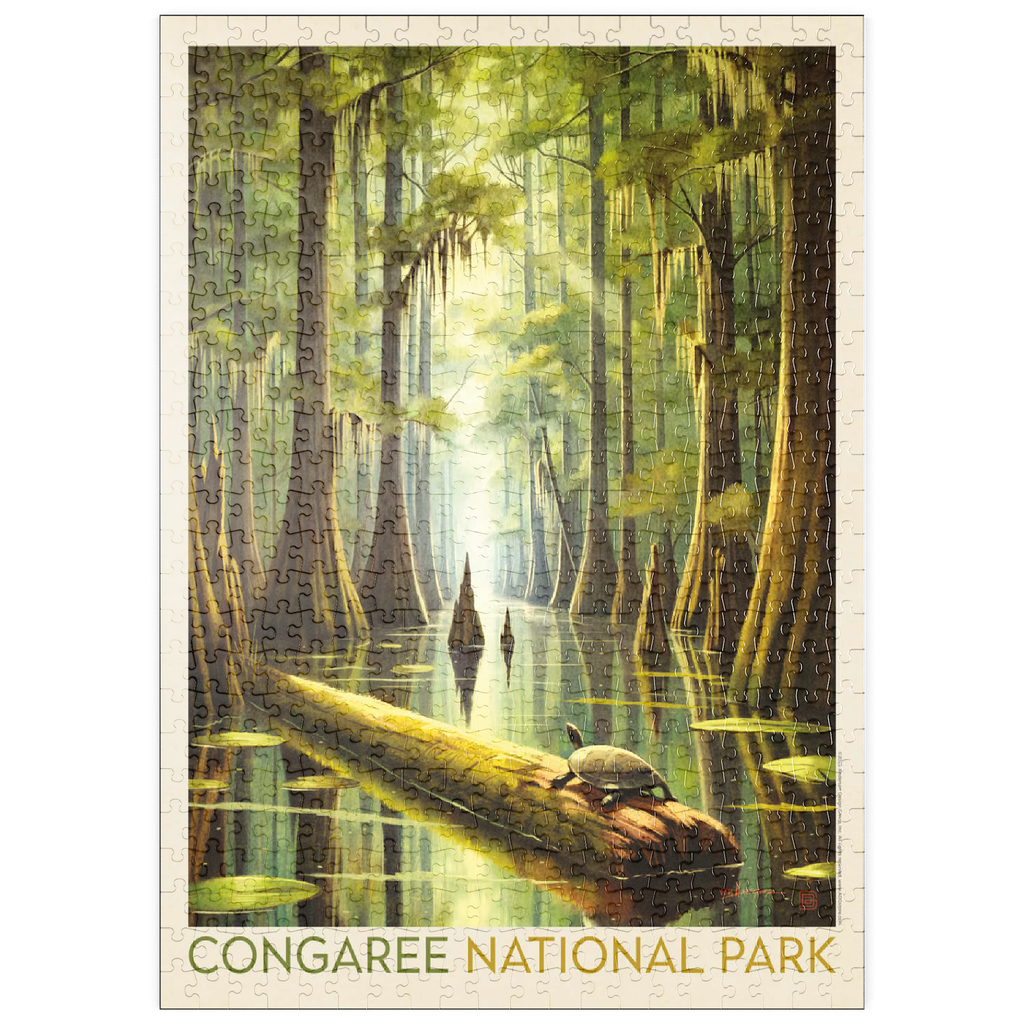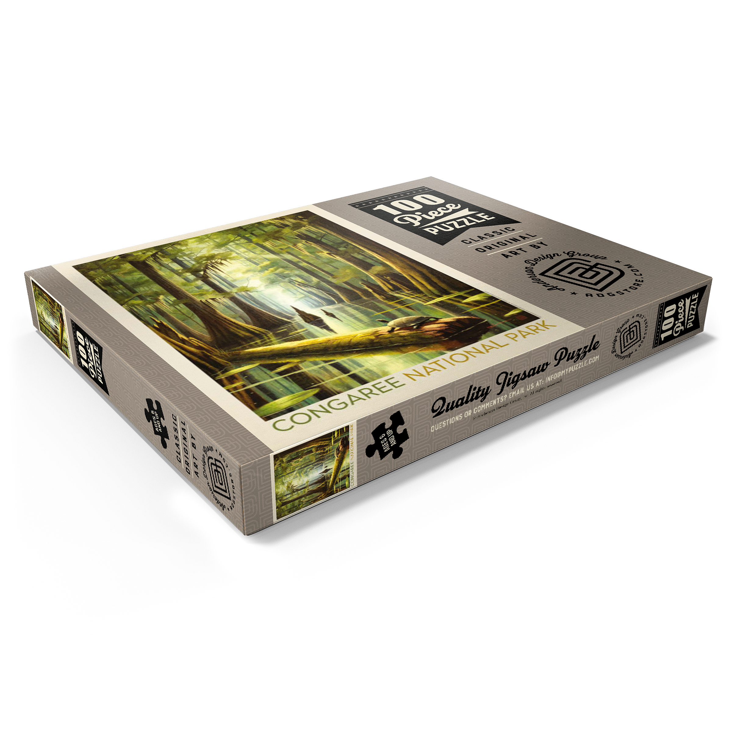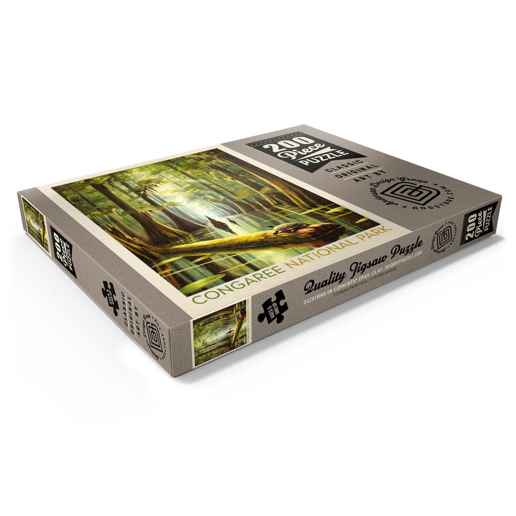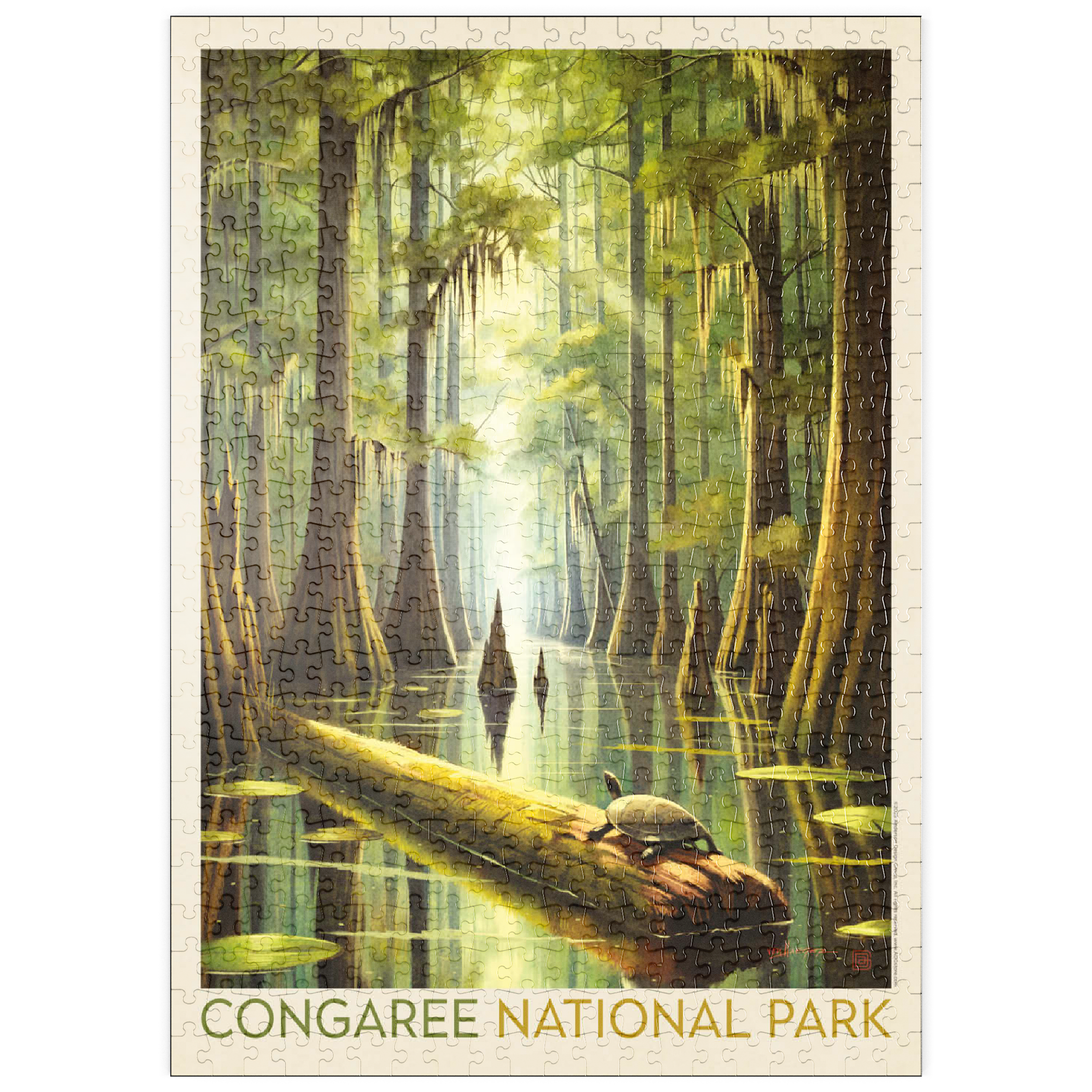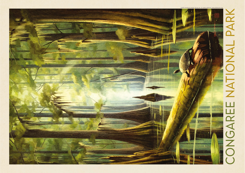 Tauchen Sie ein in die bezaubernde Welt des Congaree-Nationalparks, ein Reich aus hoch aufragenden Bäumen, ruhigen Überschwemmungsgebieten und stillen Wasserläufen. Diese Darstellung zeigt eine Schildkröte, die sich auf einem umgestürzten Baumstamm sonnt, umgeben von Spiegelungen uralter Zypressen und spanischem Moos. Als Meisterwerk der Naturschönheit präsentiert dieser Park die Wunder der üppigen Wildnis South Carolinas.