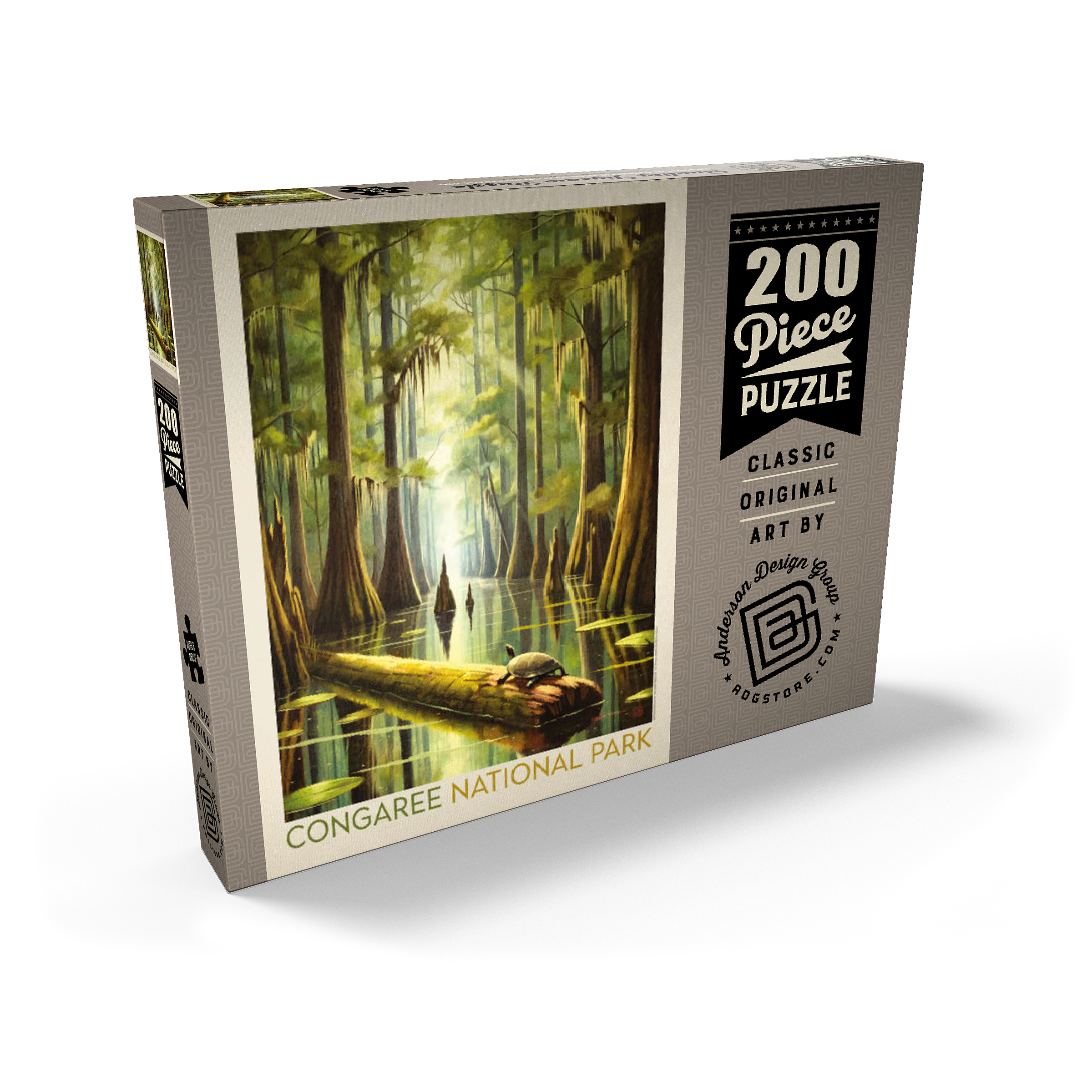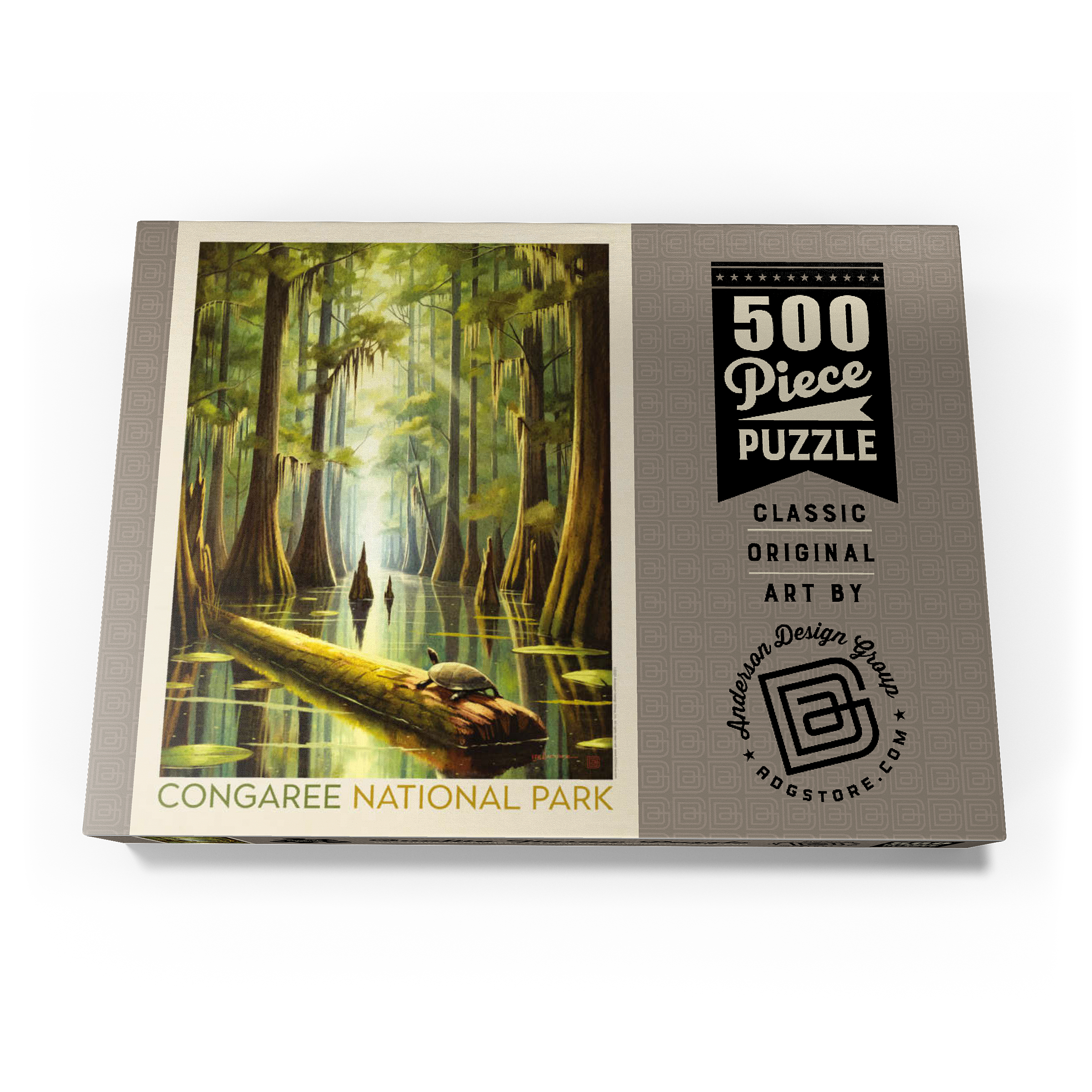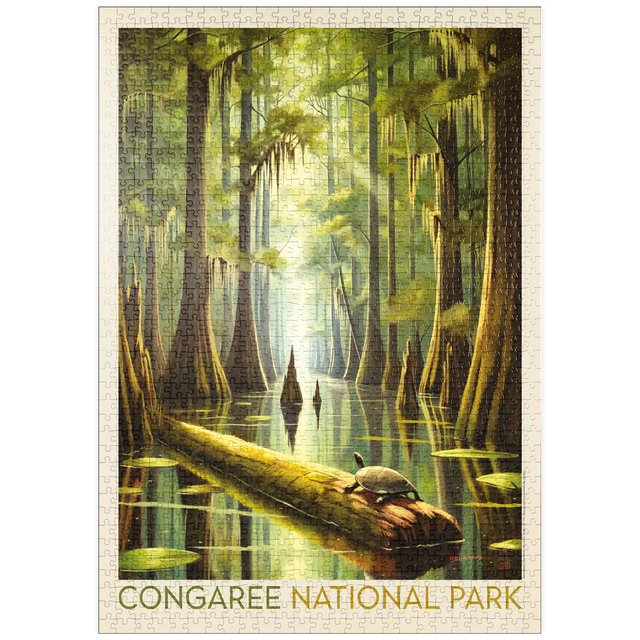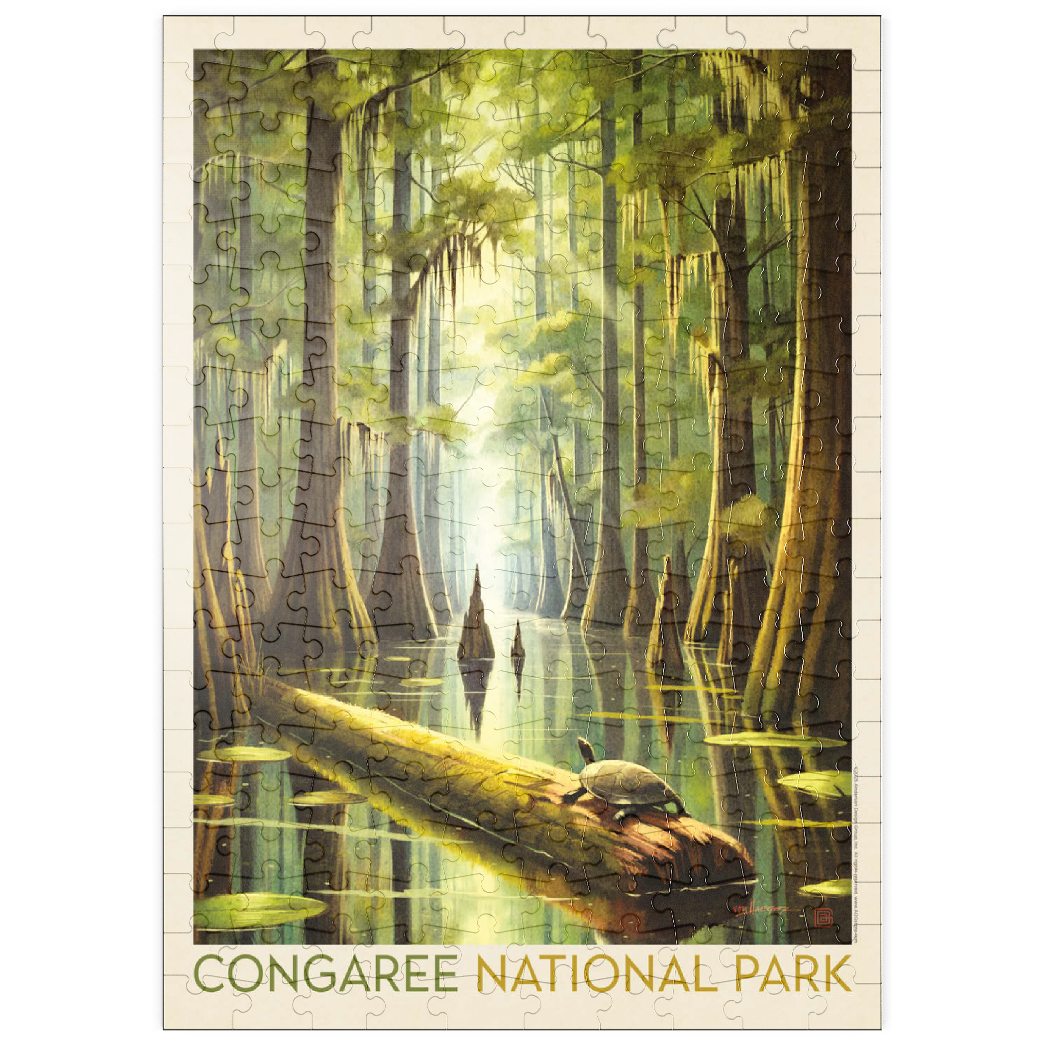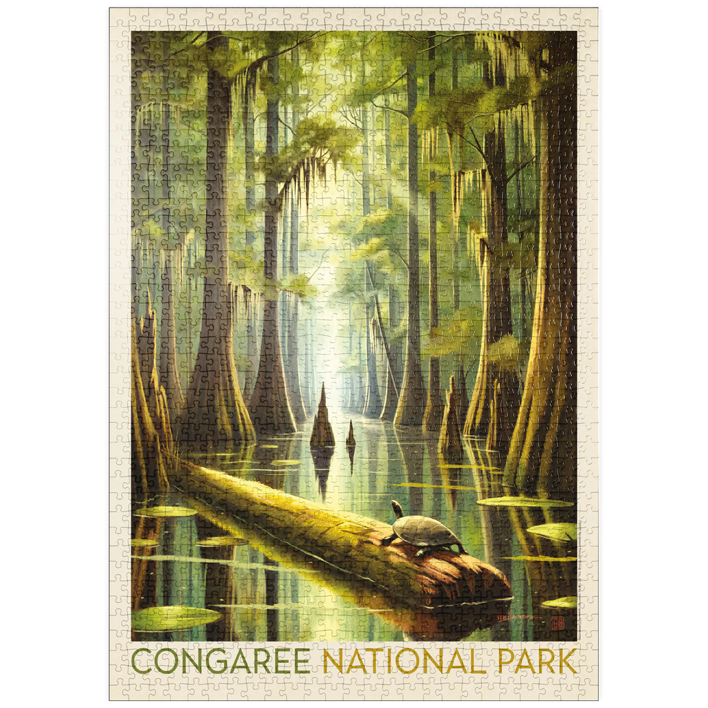 Tauchen Sie ein in die bezaubernde Welt des Congaree-Nationalparks, ein Reich aus hoch aufragenden Bäumen, ruhigen Überschwemmungsgebieten und stillen Wasserläufen. Diese Darstellung zeigt eine Schildkröte, die sich auf einem umgestürzten Baumstamm sonnt, umgeben von Spiegelungen uralter Zypressen und spanischem Moos. Als Meisterwerk der Naturschönheit präsentiert dieser Park die Wunder der üppigen Wildnis South Carolinas.