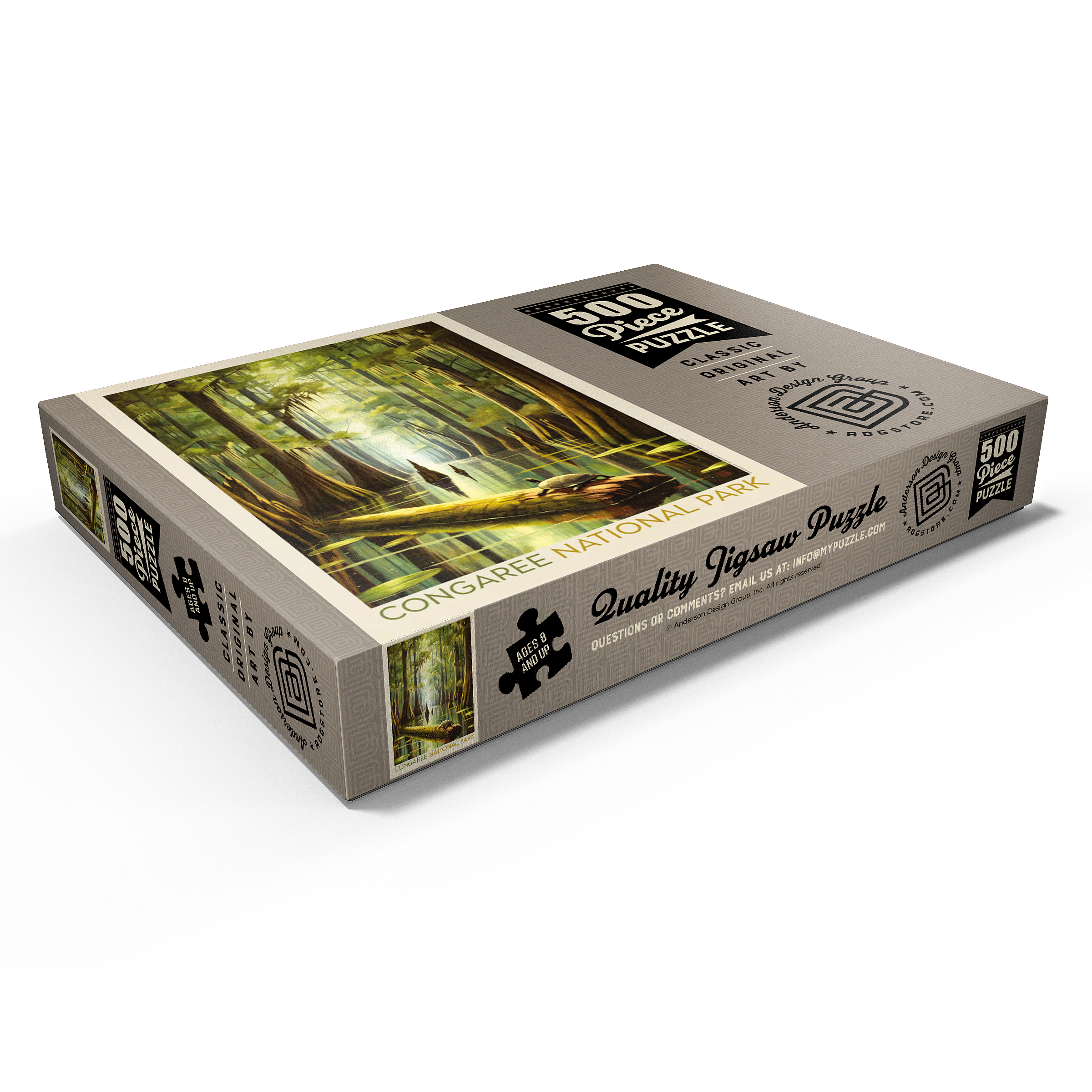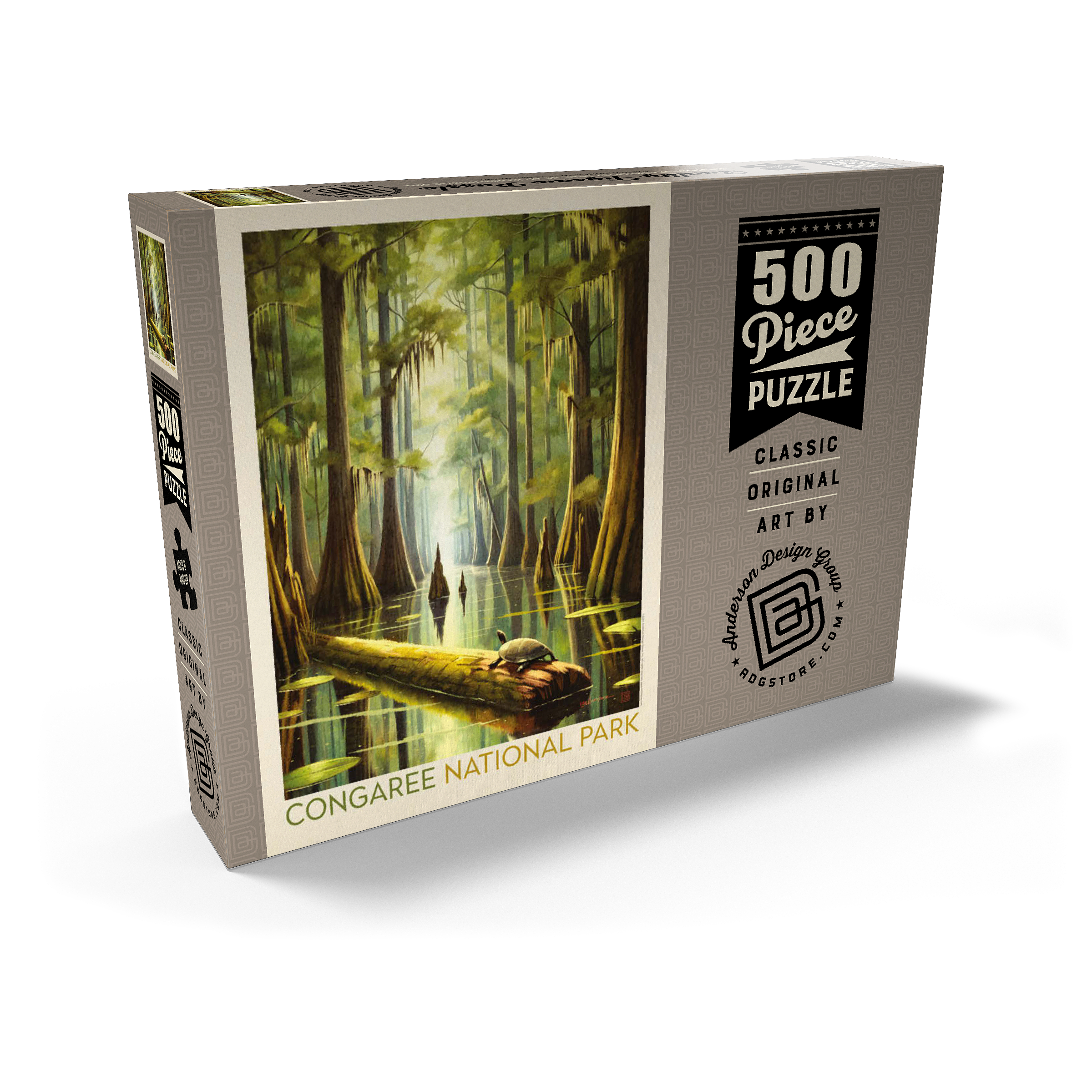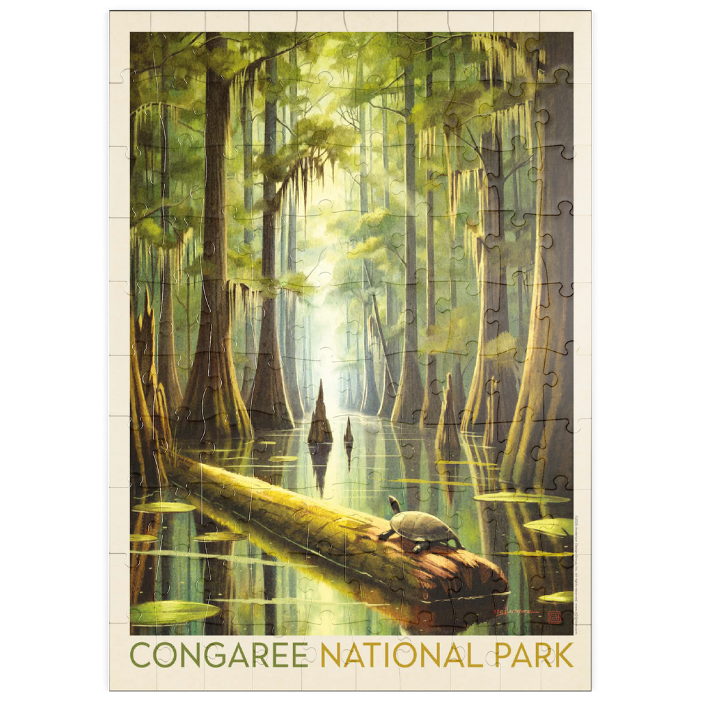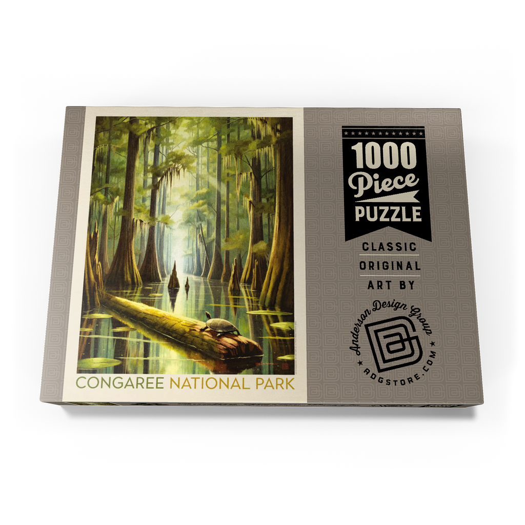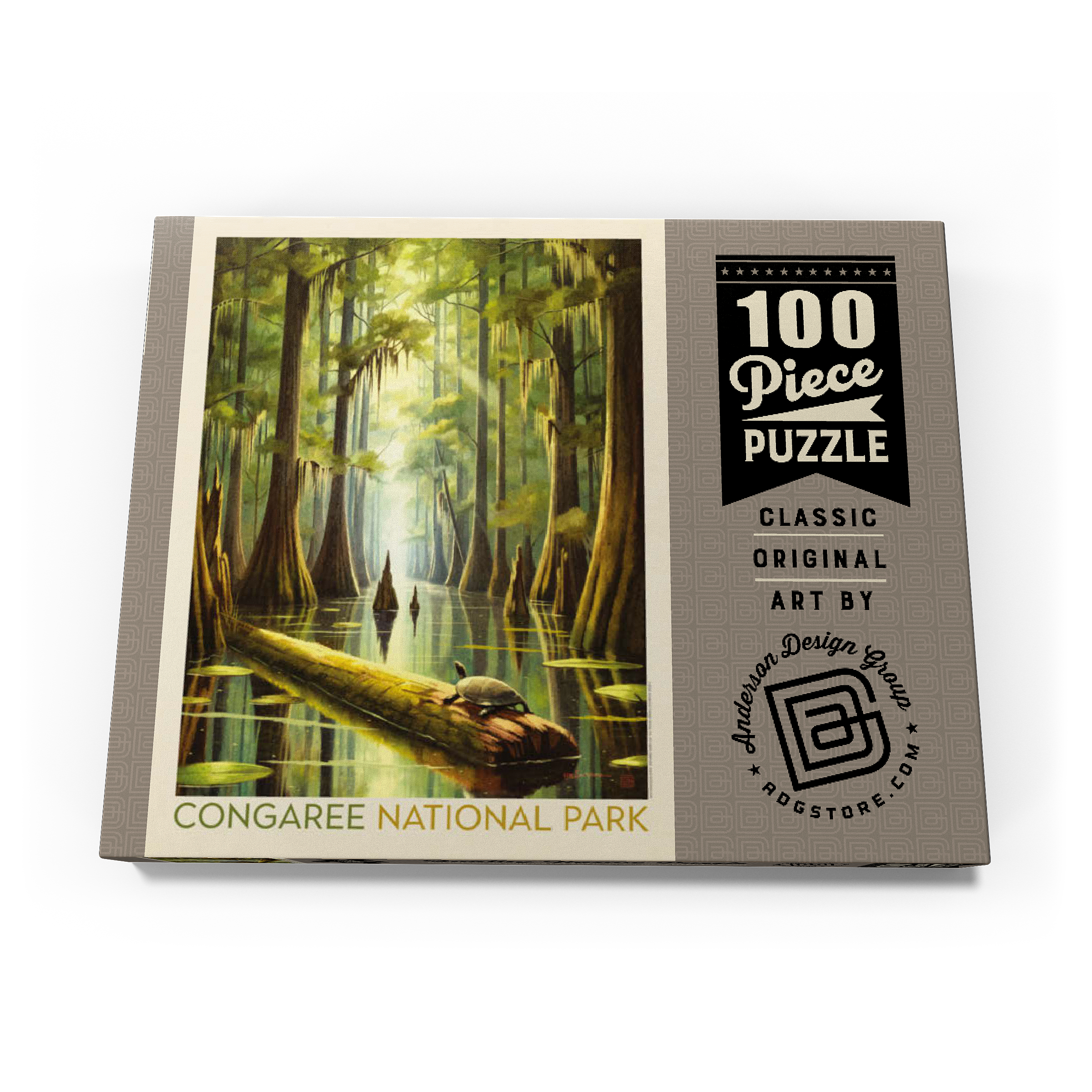 Tauchen Sie ein in die bezaubernde Welt des Congaree-Nationalparks, ein Reich aus hoch aufragenden Bäumen, ruhigen Überschwemmungsgebieten und stillen Wasserläufen. Diese Darstellung zeigt eine Schildkröte, die sich auf einem umgestürzten Baumstamm sonnt, umgeben von Spiegelungen uralter Zypressen und spanischem Moos. Als Meisterwerk der Naturschönheit präsentiert dieser Park die Wunder der üppigen Wildnis South Carolinas.