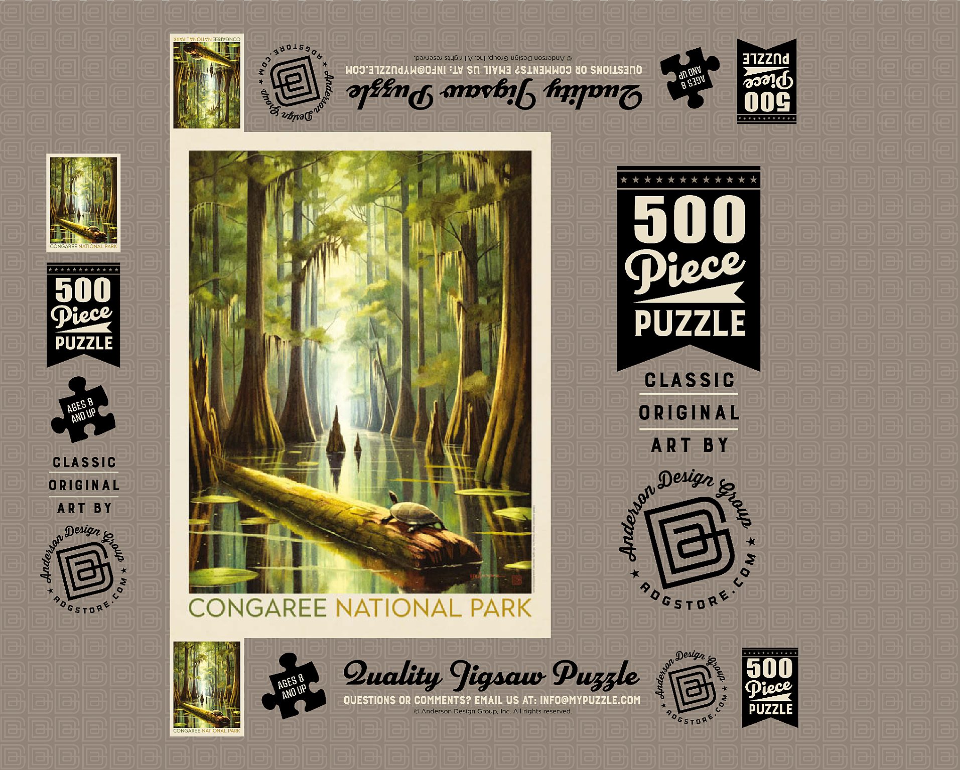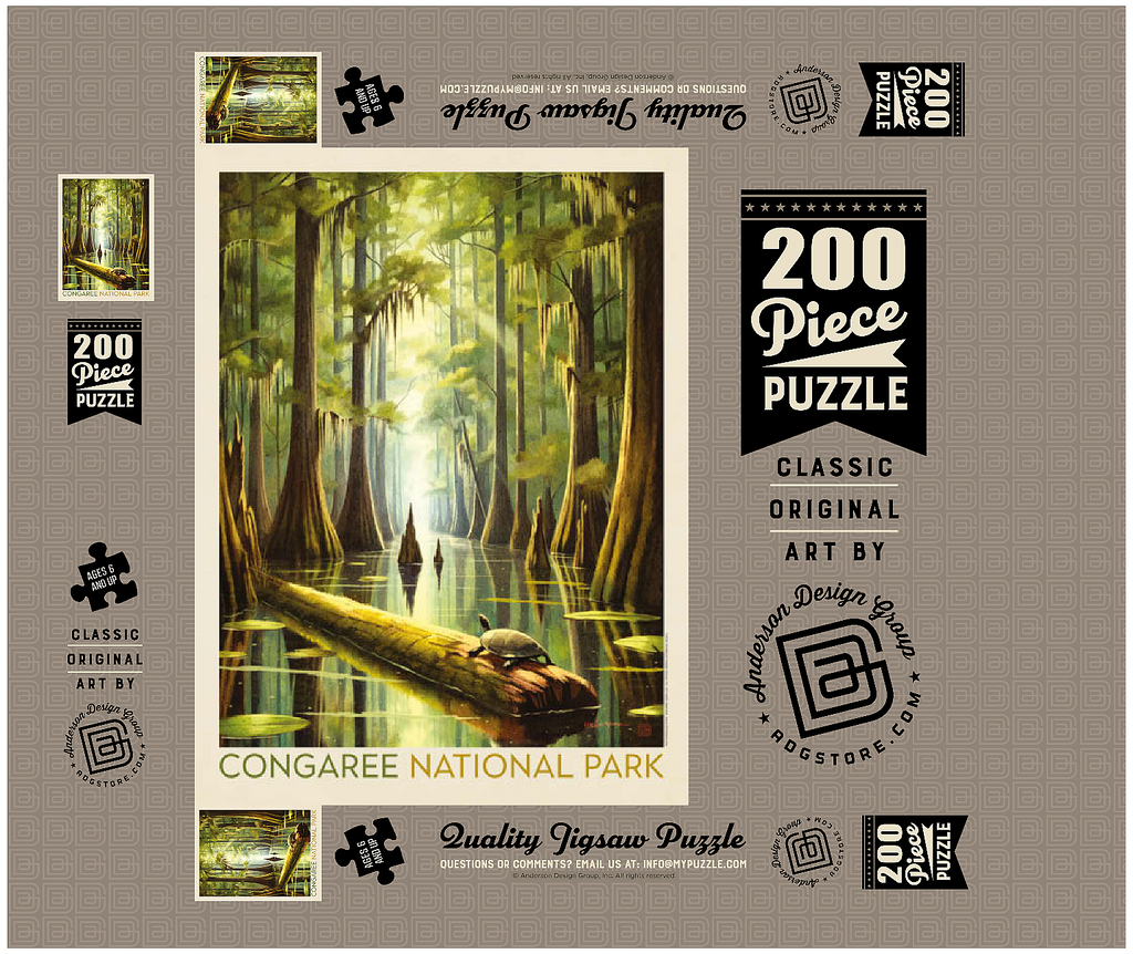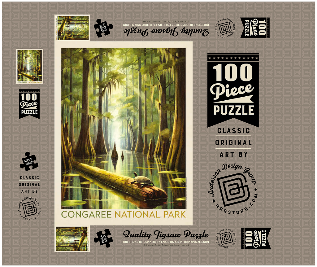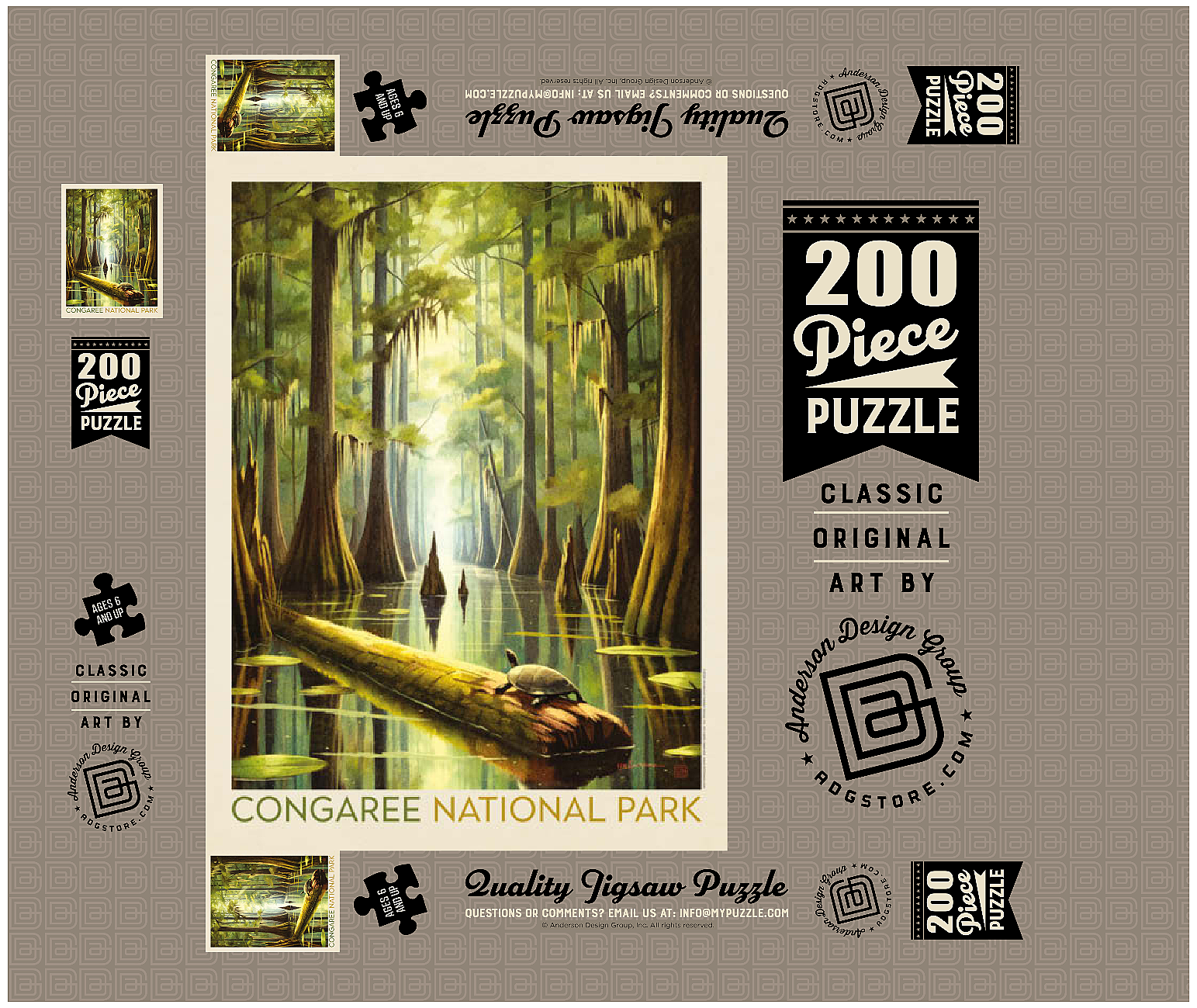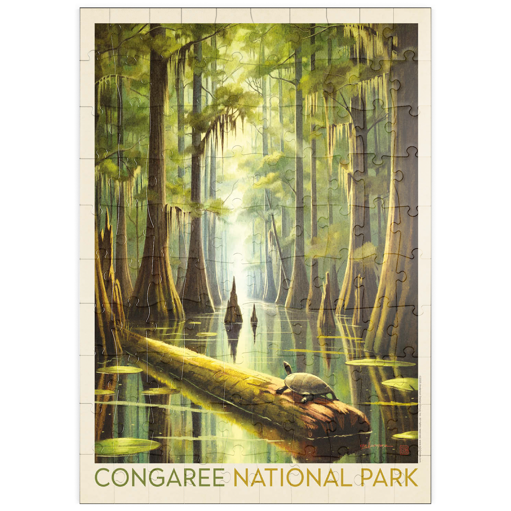 Tauchen Sie ein in die bezaubernde Welt des Congaree-Nationalparks, ein Reich aus hoch aufragenden Bäumen, ruhigen Überschwemmungsgebieten und stillen Wasserläufen. Diese Darstellung zeigt eine Schildkröte, die sich auf einem umgestürzten Baumstamm sonnt, umgeben von Spiegelungen uralter Zypressen und spanischem Moos. Als Meisterwerk der Naturschönheit präsentiert dieser Park die Wunder der üppigen Wildnis South Carolinas.