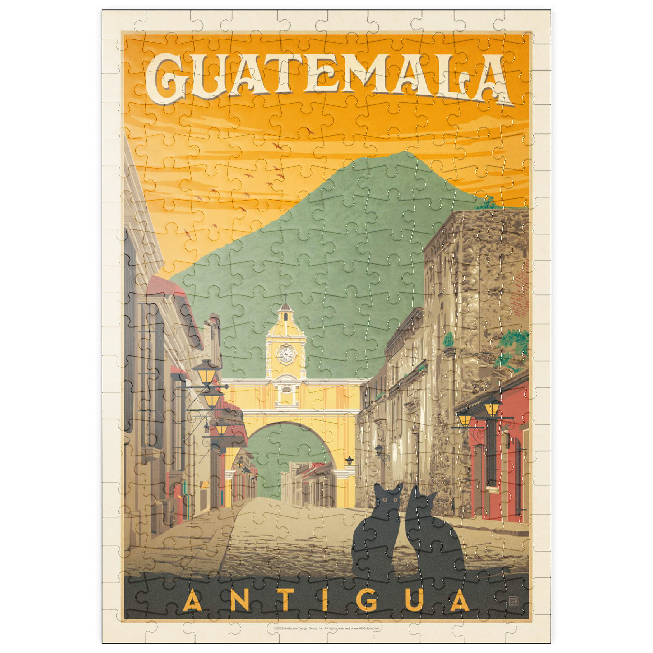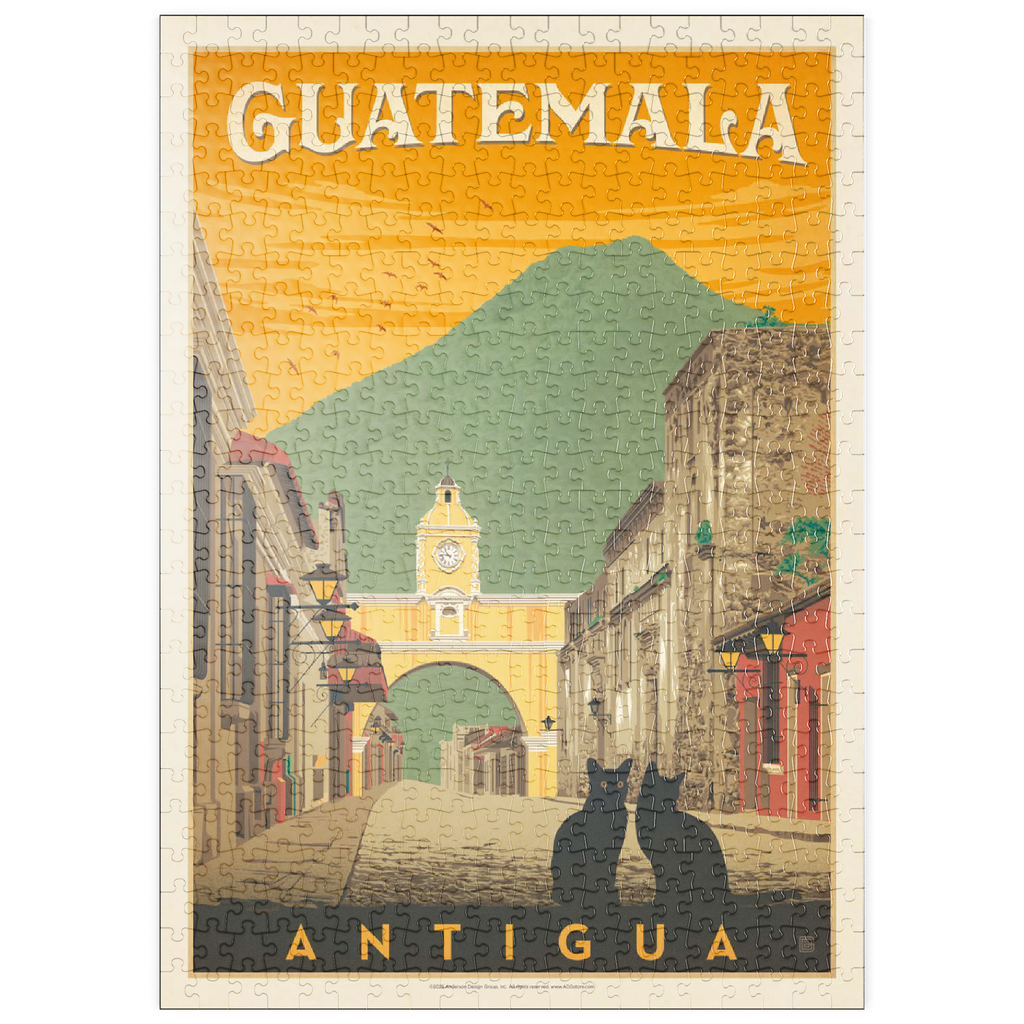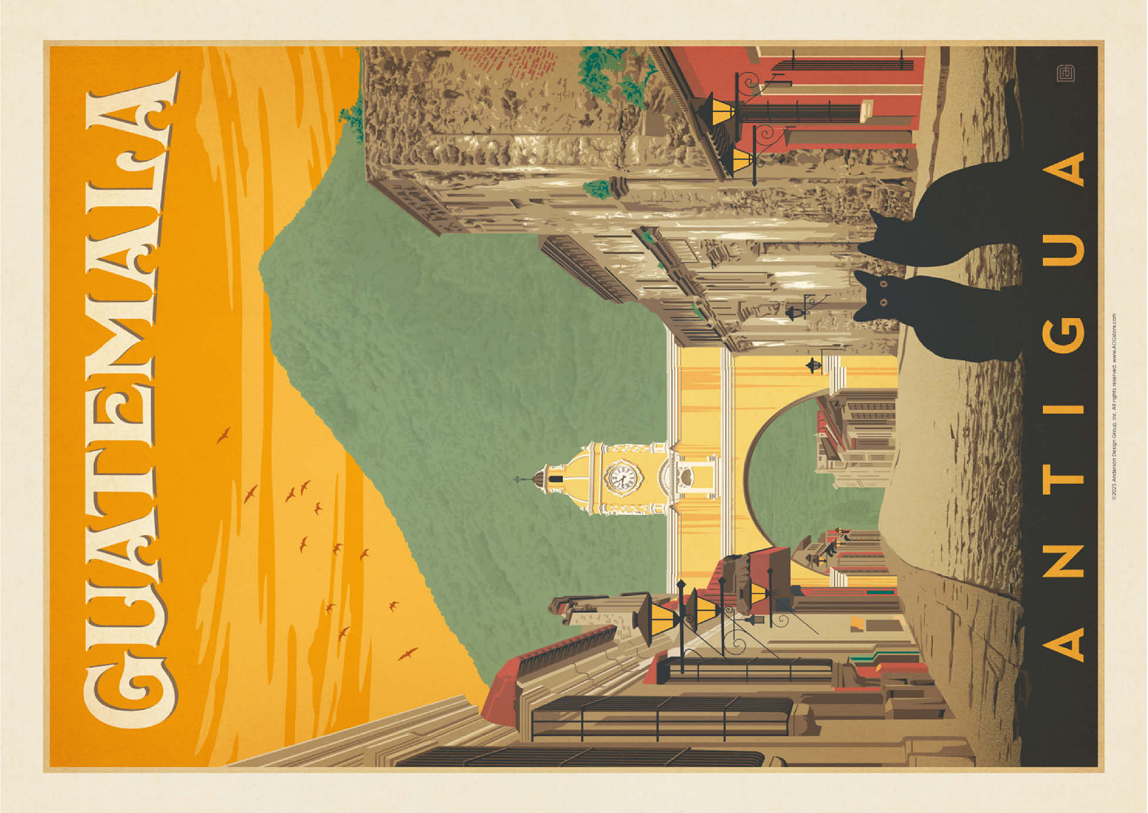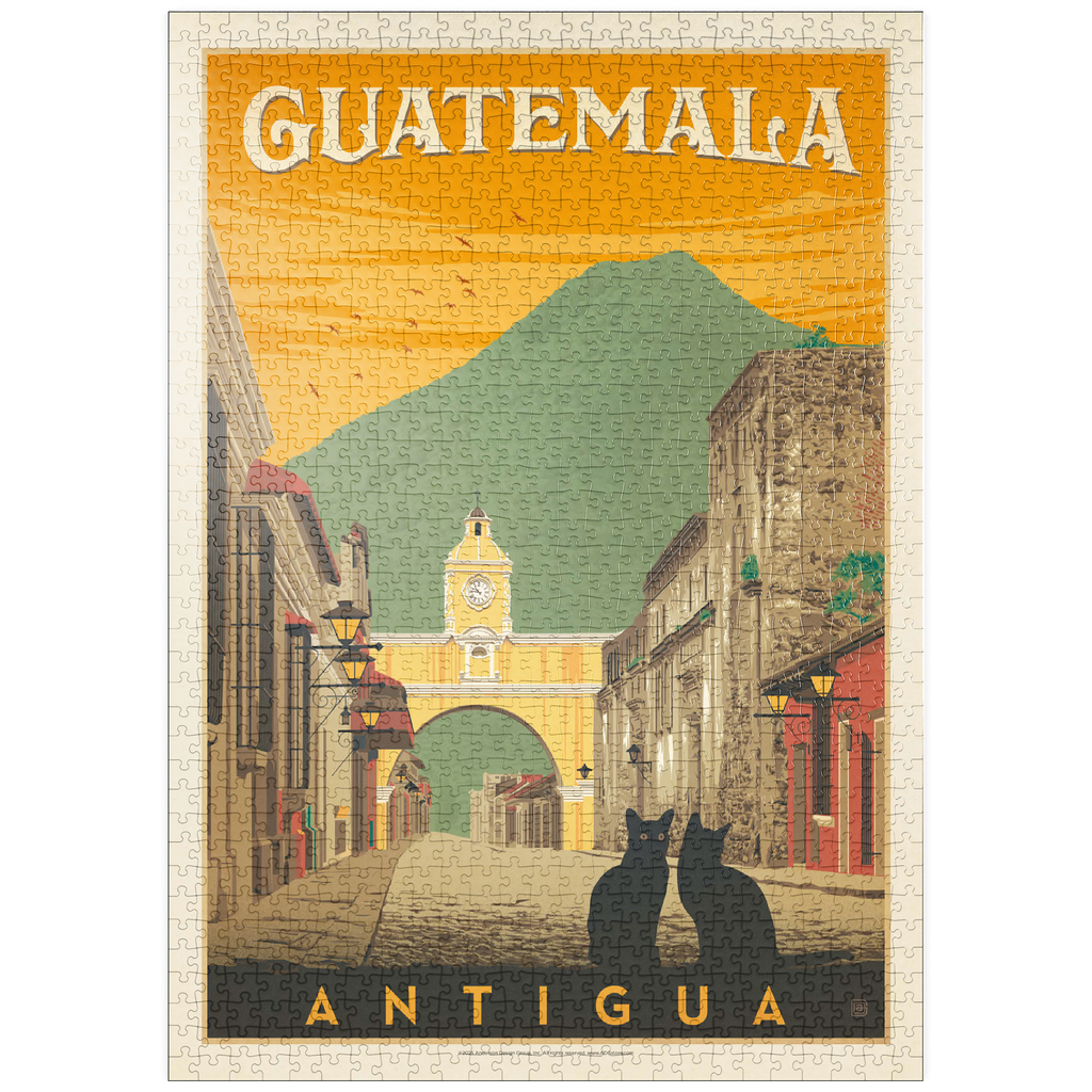 Der ikonische Santa Catalina-Bogen in Antigua, Guatemala, ist eines der bekanntesten Wahrzeichen Mittelamerikas und bildet eine wunderschöne Kulisse vor dem majestätischen Vulkan Agua. Diese historische spanische Kolonialstadt, einst Hauptstadt Guatemalas, ist bekannt für ihre Kopfsteinpflasterstraßen, bunten Fassaden und gut erhaltene Barockarchitektur. Der Bogen, der im 17. Jahrhundert erbaut wurde, um Klostergebäude zu verbinden, ist zu einem kulturellen Symbol von Antigua und zu einem beliebten Ziel für Reisende geworden, die Geschichte, Charme und atemberaubende Landschaften suchen. In dieser Darstellung sitzen zwei schwarze Katzen ruhig im Vordergrund und verleihen der malerischen Straßenszene einen Hauch von Geheimnis und Intimität. Der warme orangefarbene Himmel mit den Vögeln unterstreicht die zeitlose Atmosphäre der Stadt bei Sonnenuntergang, während die filigranen Details der Kolonialgebäude das architektonische Erbe der Stadt hervorheben. Antigua, ein UNESCO-Weltkulturerbe, wird nicht nur für seine Geschichte bewundert, sondern auch für seine wunderschöne Natur, die es zu einem der meistfotografierten und beliebtesten Reiseziele in Guatemala macht.