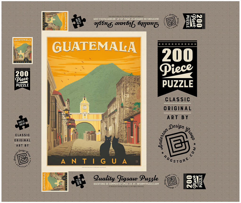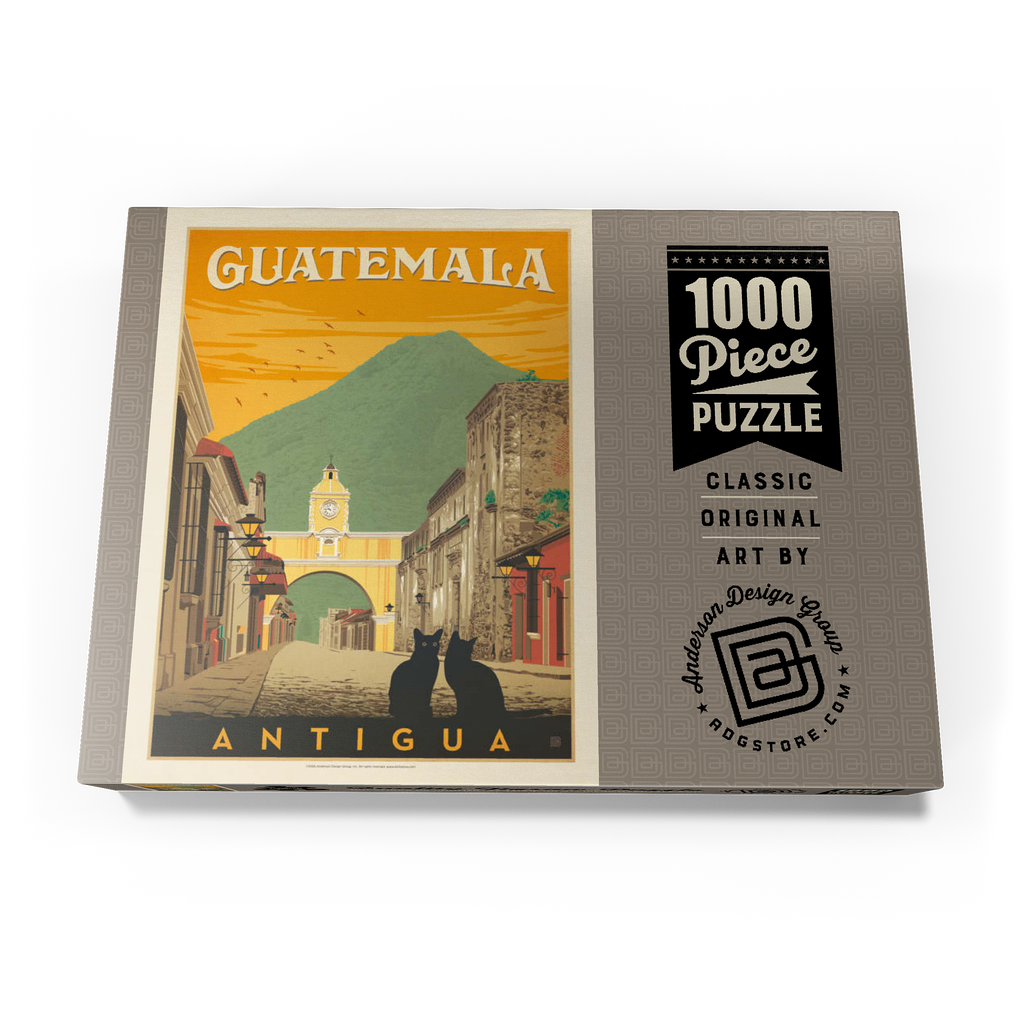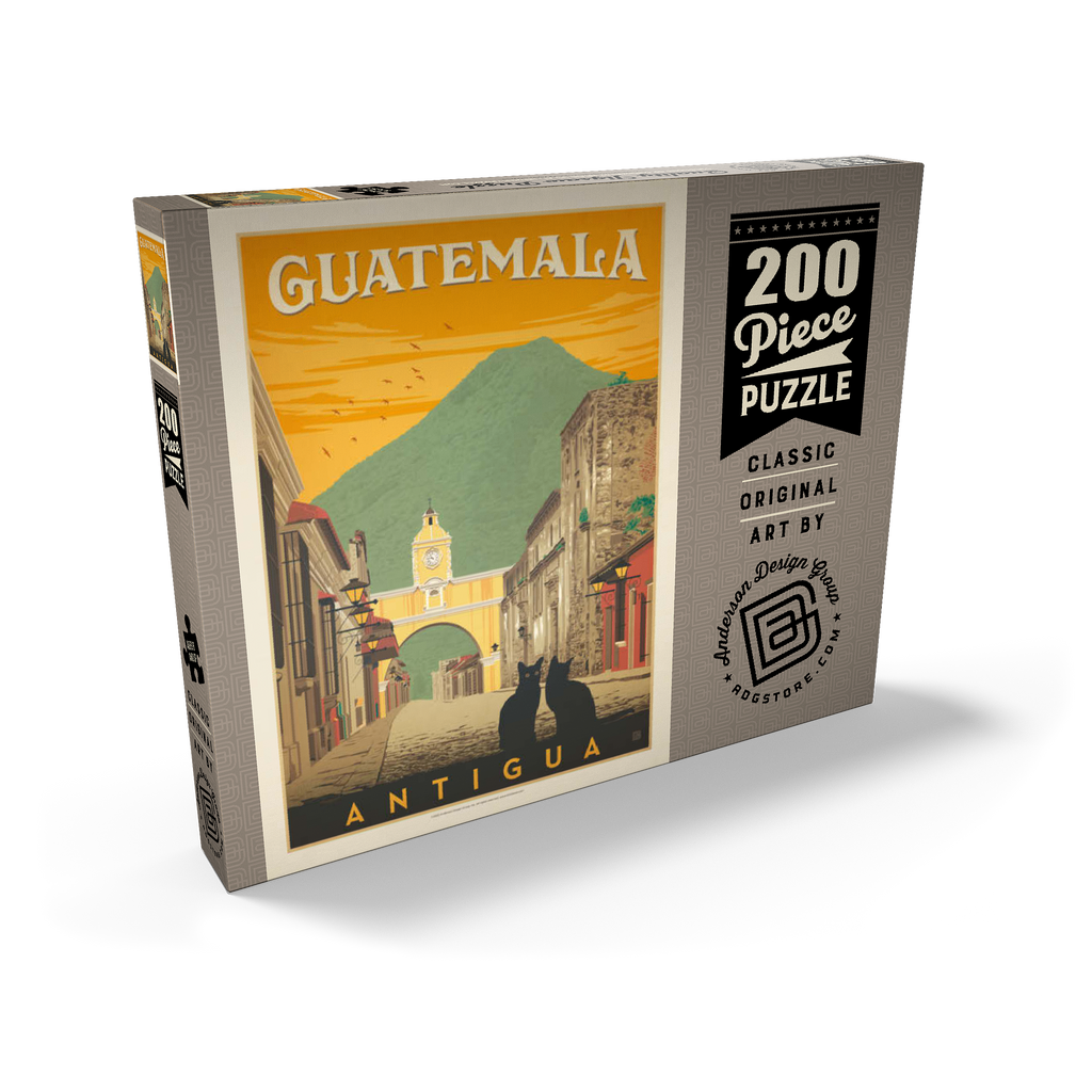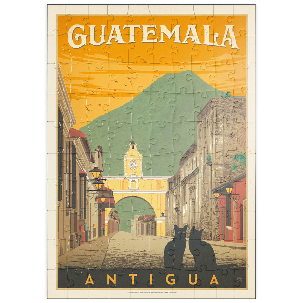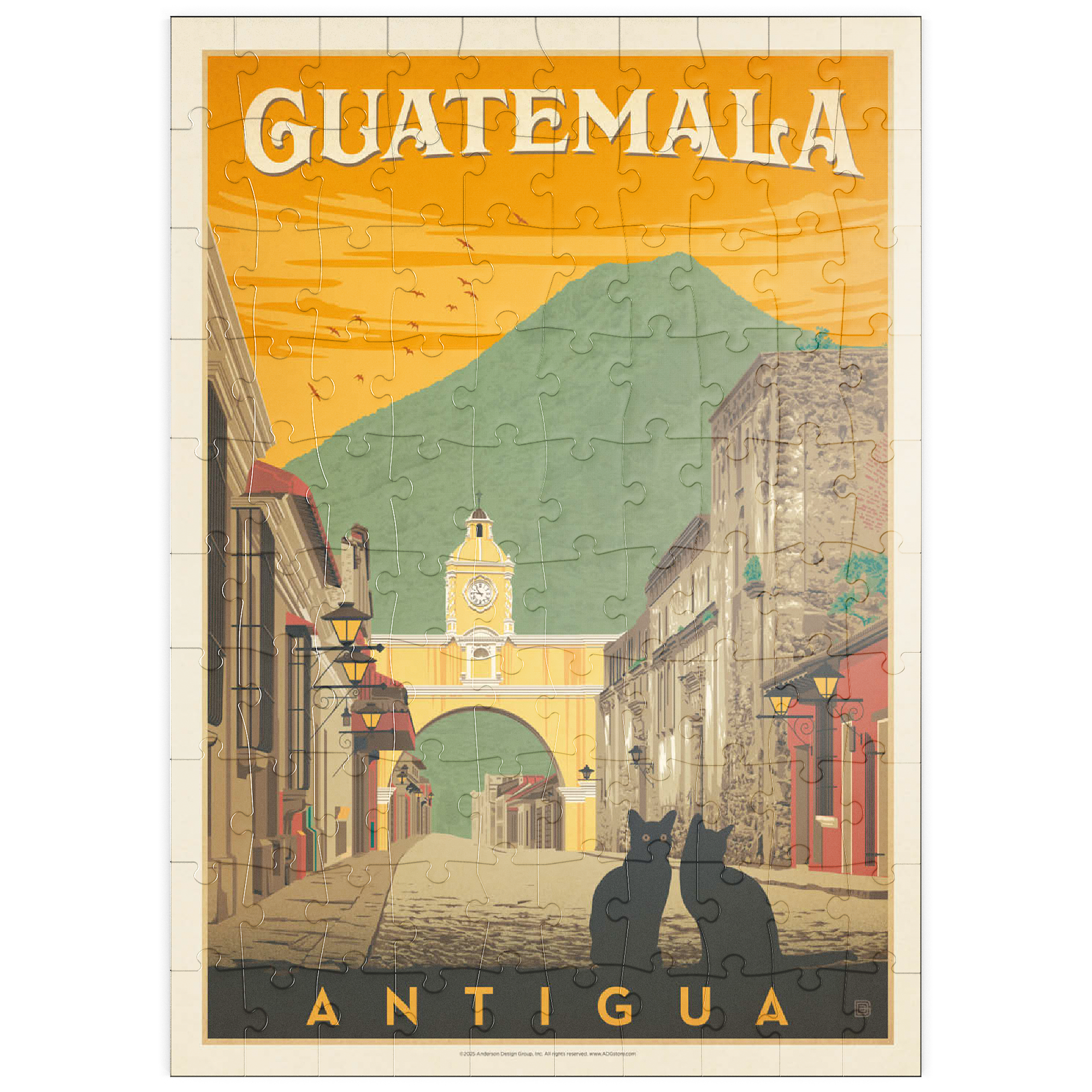 Der ikonische Santa Catalina-Bogen in Antigua, Guatemala, ist eines der bekanntesten Wahrzeichen Mittelamerikas und bildet eine wunderschöne Kulisse vor dem majestätischen Vulkan Agua. Diese historische spanische Kolonialstadt, einst Hauptstadt Guatemalas, ist bekannt für ihre Kopfsteinpflasterstraßen, bunten Fassaden und gut erhaltene Barockarchitektur. Der Bogen, der im 17. Jahrhundert erbaut wurde, um Klostergebäude zu verbinden, ist zu einem kulturellen Symbol von Antigua und zu einem beliebten Ziel für Reisende geworden, die Geschichte, Charme und atemberaubende Landschaften suchen. In dieser Darstellung sitzen zwei schwarze Katzen ruhig im Vordergrund und verleihen der malerischen Straßenszene einen Hauch von Geheimnis und Intimität. Der warme orangefarbene Himmel mit den Vögeln unterstreicht die zeitlose Atmosphäre der Stadt bei Sonnenuntergang, während die filigranen Details der Kolonialgebäude das architektonische Erbe der Stadt hervorheben. Antigua, ein UNESCO-Weltkulturerbe, wird nicht nur für seine Geschichte bewundert, sondern auch für seine wunderschöne Natur, die es zu einem der meistfotografierten und beliebtesten Reiseziele in Guatemala macht.