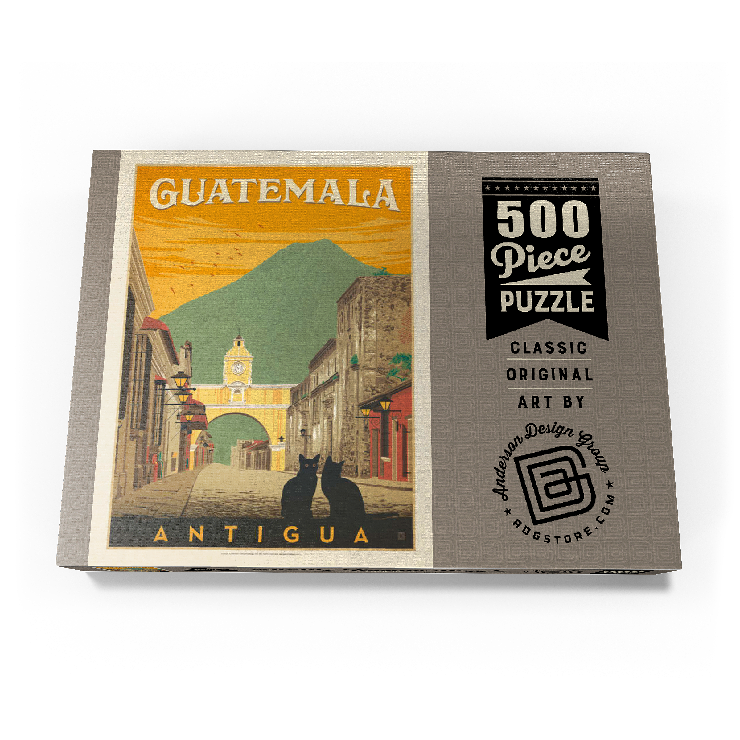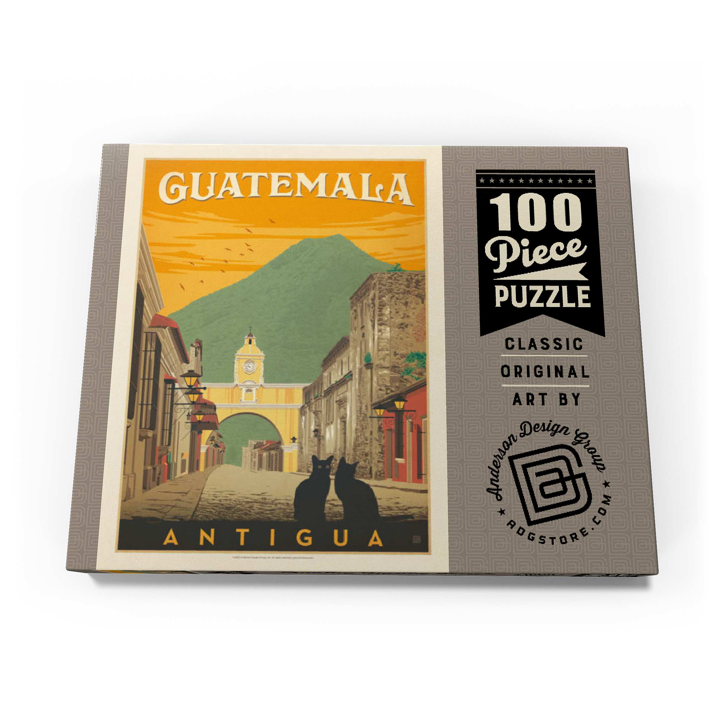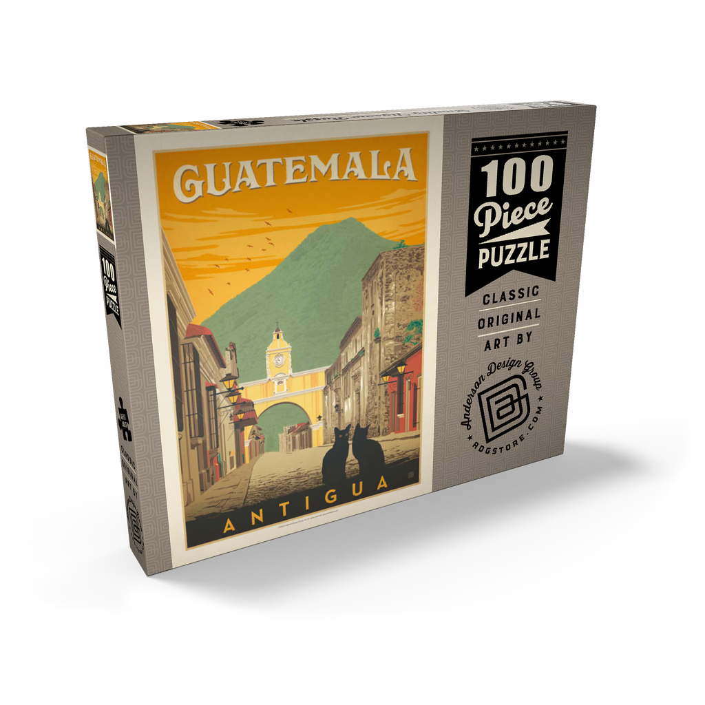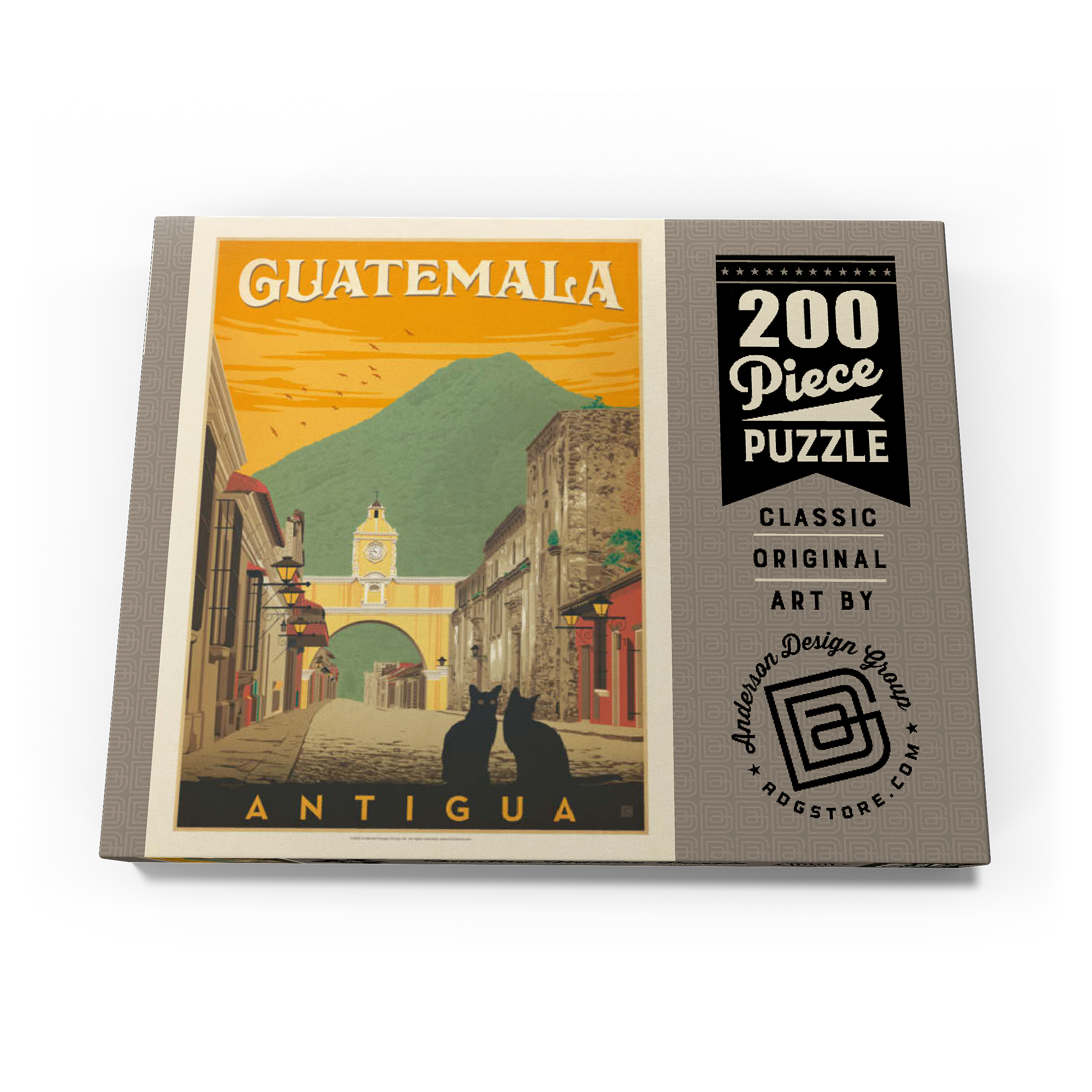 Der ikonische Santa Catalina-Bogen in Antigua, Guatemala, ist eines der bekanntesten Wahrzeichen Mittelamerikas und bildet eine wunderschöne Kulisse vor dem majestätischen Vulkan Agua. Diese historische spanische Kolonialstadt, einst Hauptstadt Guatemalas, ist bekannt für ihre Kopfsteinpflasterstraßen, bunten Fassaden und gut erhaltene Barockarchitektur. Der Bogen, der im 17. Jahrhundert erbaut wurde, um Klostergebäude zu verbinden, ist zu einem kulturellen Symbol von Antigua und zu einem beliebten Ziel für Reisende geworden, die Geschichte, Charme und atemberaubende Landschaften suchen. In dieser Darstellung sitzen zwei schwarze Katzen ruhig im Vordergrund und verleihen der malerischen Straßenszene einen Hauch von Geheimnis und Intimität. Der warme orangefarbene Himmel mit den Vögeln unterstreicht die zeitlose Atmosphäre der Stadt bei Sonnenuntergang, während die filigranen Details der Kolonialgebäude das architektonische Erbe der Stadt hervorheben. Antigua, ein UNESCO-Weltkulturerbe, wird nicht nur für seine Geschichte bewundert, sondern auch für seine wunderschöne Natur, die es zu einem der meistfotografierten und beliebtesten Reiseziele in Guatemala macht.