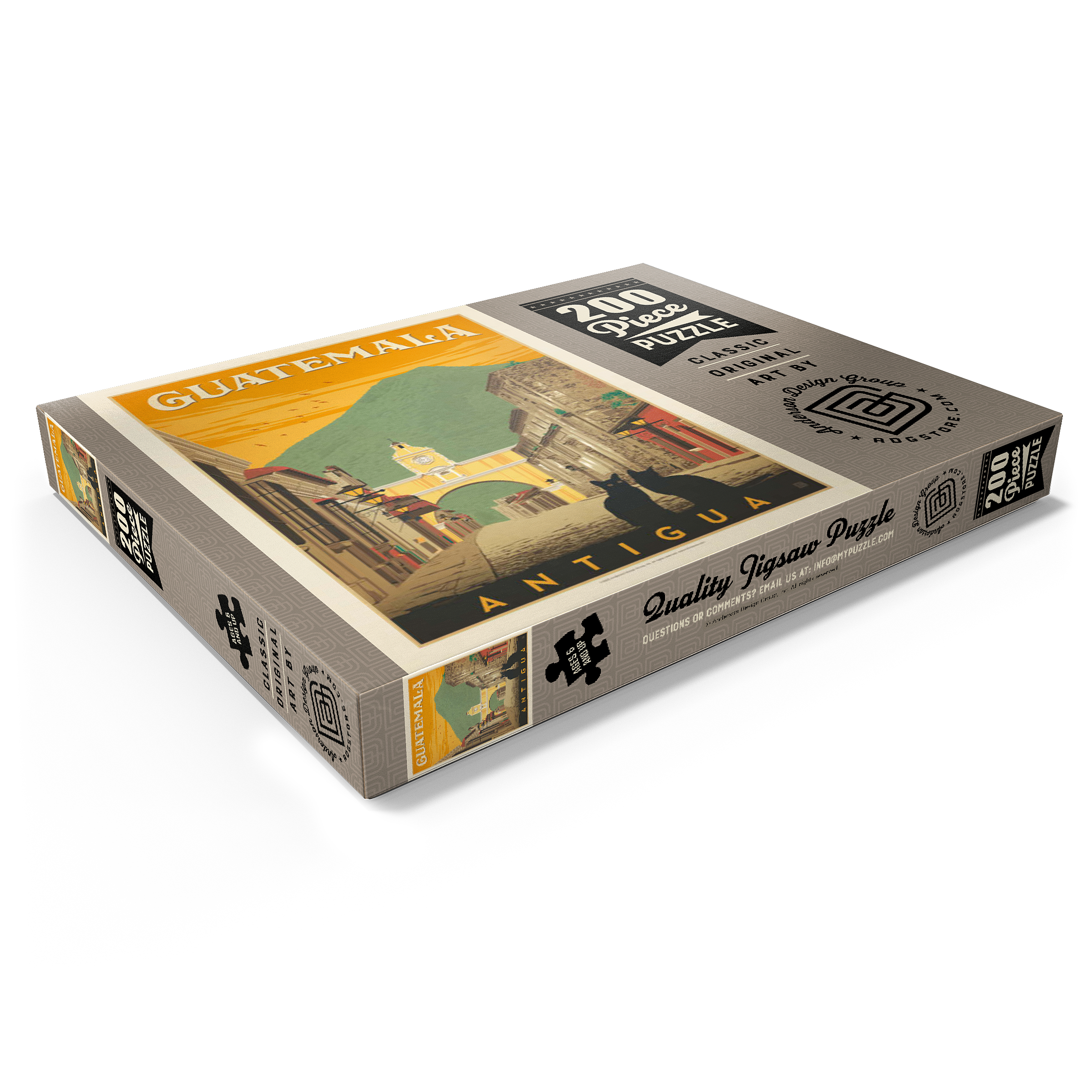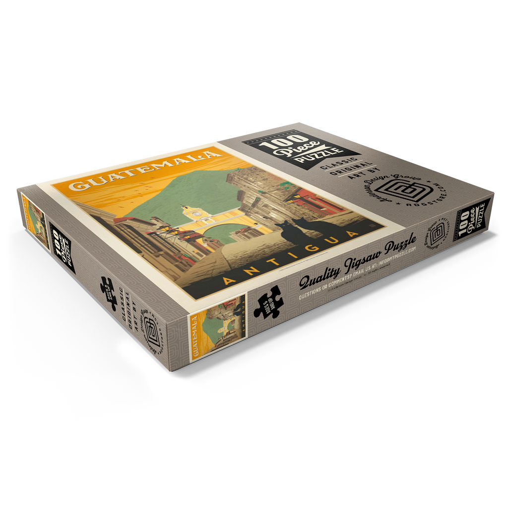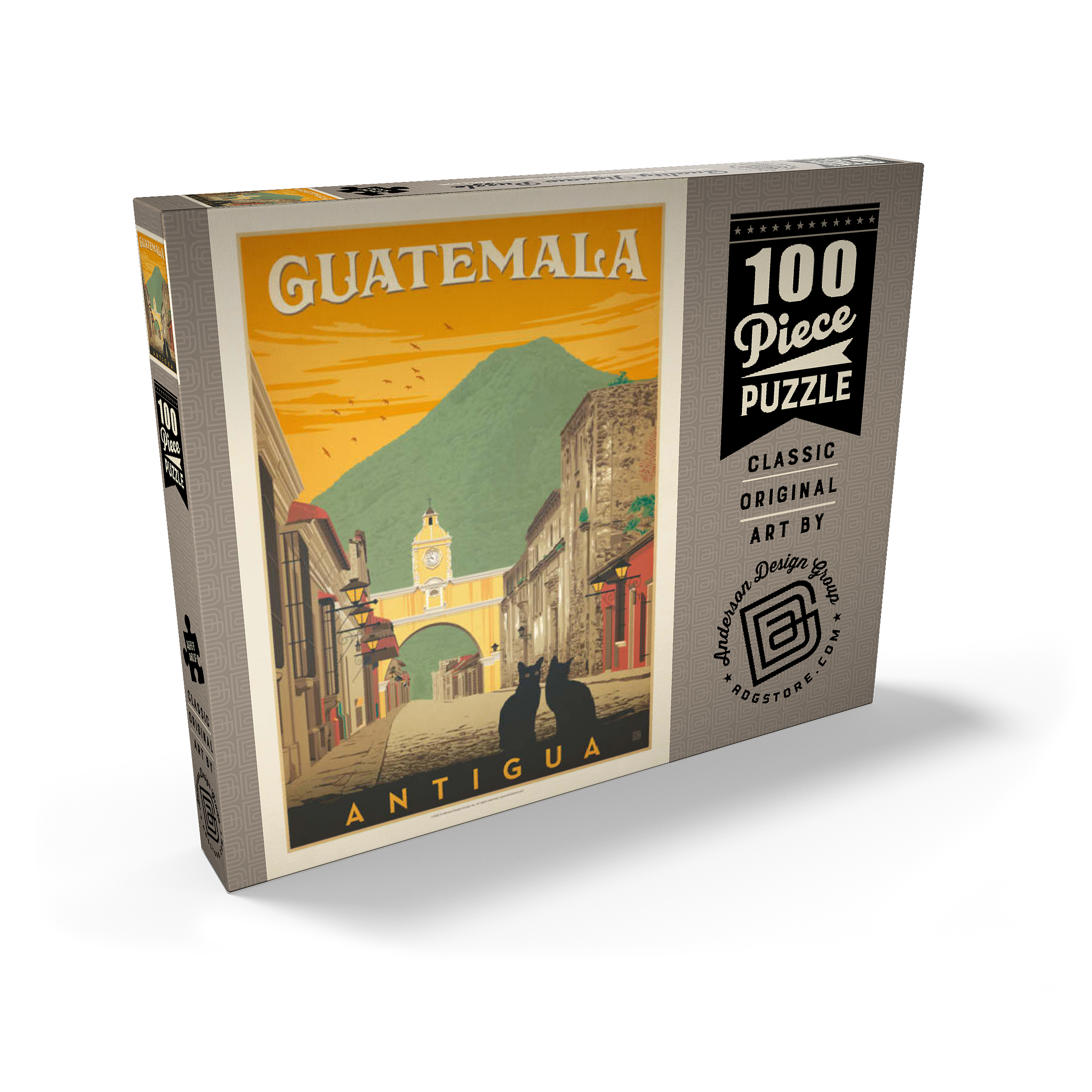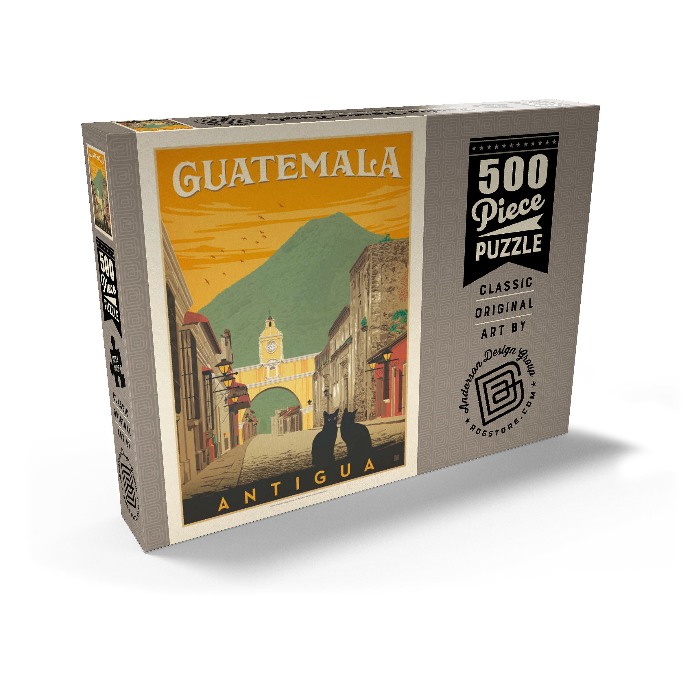 Der ikonische Santa Catalina-Bogen in Antigua, Guatemala, ist eines der bekanntesten Wahrzeichen Mittelamerikas und bildet eine wunderschöne Kulisse vor dem majestätischen Vulkan Agua. Diese historische spanische Kolonialstadt, einst Hauptstadt Guatemalas, ist bekannt für ihre Kopfsteinpflasterstraßen, bunten Fassaden und gut erhaltene Barockarchitektur. Der Bogen, der im 17. Jahrhundert erbaut wurde, um Klostergebäude zu verbinden, ist zu einem kulturellen Symbol von Antigua und zu einem beliebten Ziel für Reisende geworden, die Geschichte, Charme und atemberaubende Landschaften suchen. In dieser Darstellung sitzen zwei schwarze Katzen ruhig im Vordergrund und verleihen der malerischen Straßenszene einen Hauch von Geheimnis und Intimität. Der warme orangefarbene Himmel mit den Vögeln unterstreicht die zeitlose Atmosphäre der Stadt bei Sonnenuntergang, während die filigranen Details der Kolonialgebäude das architektonische Erbe der Stadt hervorheben. Antigua, ein UNESCO-Weltkulturerbe, wird nicht nur für seine Geschichte bewundert, sondern auch für seine wunderschöne Natur, die es zu einem der meistfotografierten und beliebtesten Reiseziele in Guatemala macht.