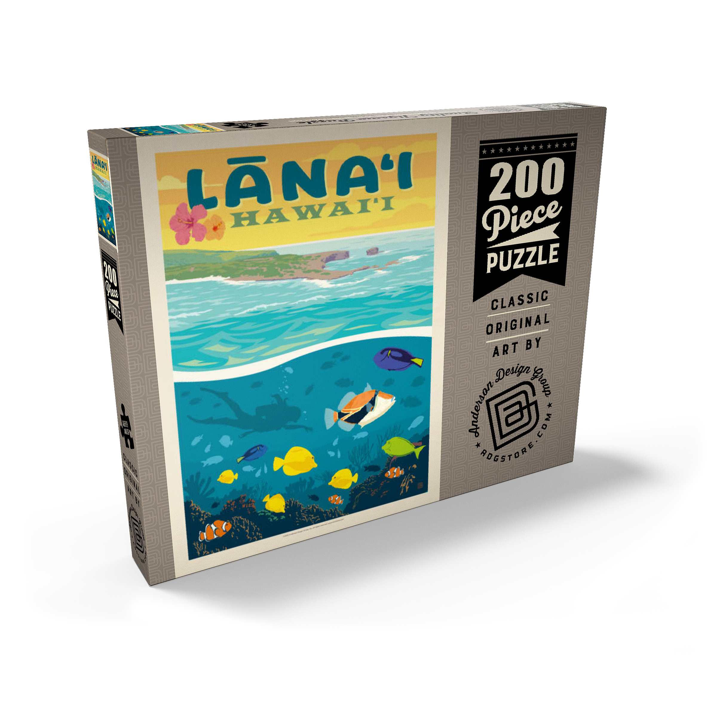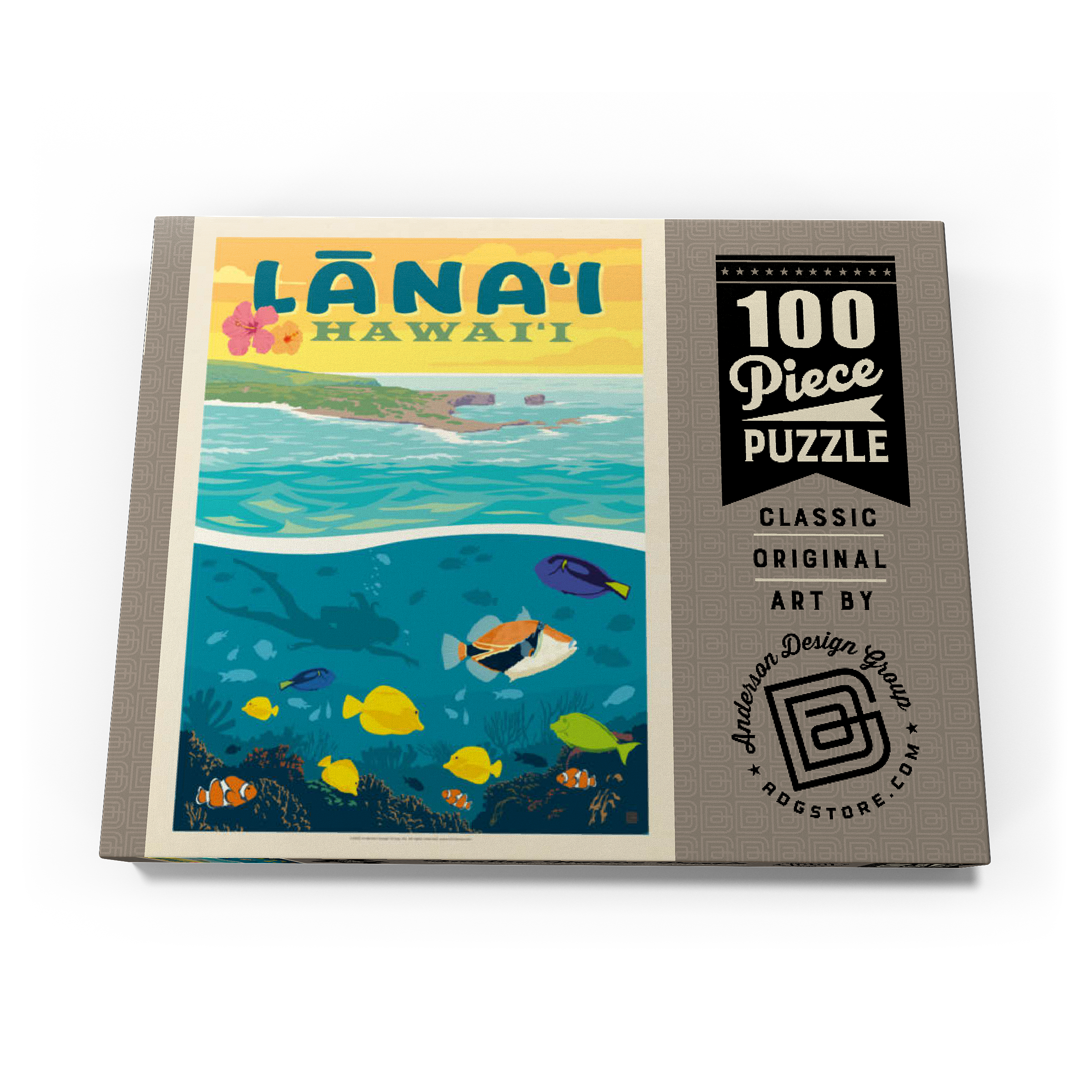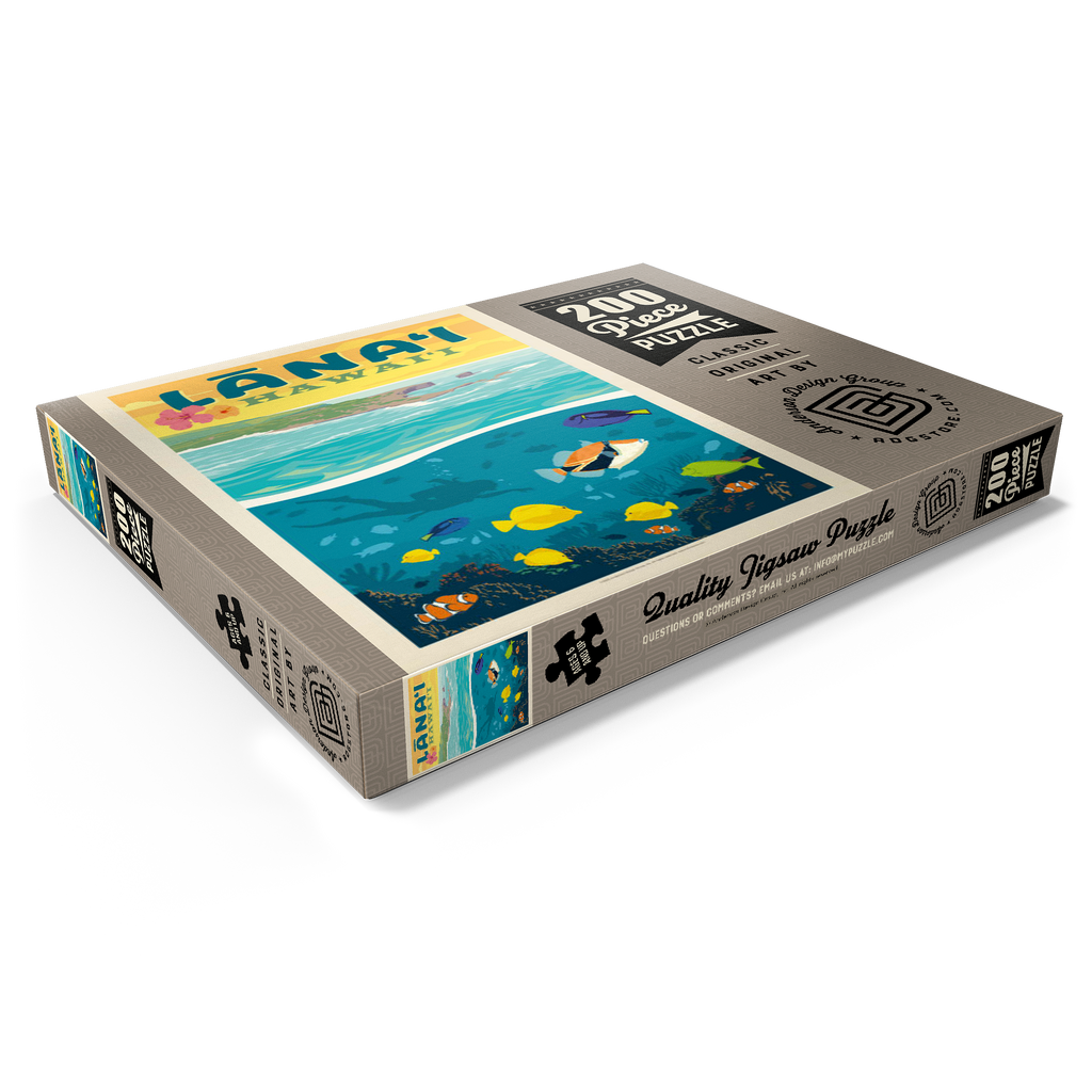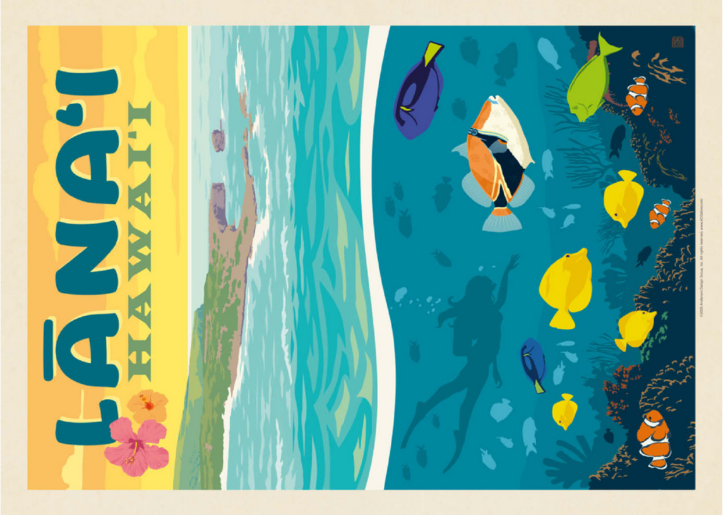 Diese farbenfrohe Darstellung zeigt die natürliche Schönheit von Lāna'i, Hawaii, und hebt die unberührte Küstenlinie und die lebendige Unterwasserwelt hervor. Über der Wasseroberfläche treffen die üppig grünen Klippen auf das türkisfarbene Wasser, eingerahmt von einem goldenen Sonnenuntergangshimmel mit sanften Wolken und tropischen Hibiskusblüten, die den heiteren Charme der Insel symbolisieren. Die zerklüftete Küste von Lāna'i, die oft als Ananasinsel bezeichnet wird, bietet atemberaubende Ausblicke und einsame Strände, die zum Entspannen und Erkunden einladen. Unterhalb der Wellen erwacht eine lebendige Unterwasserszene mit einer Vielzahl tropischer Fische zum Leben, darunter gelbe Tangs, Clownfische, Papageienfische und der berühmte hawaiianische Staatsfisch, der humuhumunukunukuāpuaʻa. Ein Schnorchler gleitet friedlich durch das kristallklare Wasser und erkundet die farbenfrohen Korallenriffe, in denen es von Meereslebewesen nur so wimmelt. Lāna'i ist bekannt für seine außergewöhnlichen Schnorchel- und Tauchspots, die hautnahe Begegnungen mit der reichen Artenvielfalt der Ozeane Hawaiis ermöglichen. Diese Illustration fängt die Essenz der doppelten Schönheit von Lāna'i ein - die ruhigen Landschaften oben und das blühende Ökosystem unten. Lāna'i ist ideal für Naturliebhaber, Schnorchler und Abenteurer und lädt Besucher ein, die unberührte Pracht einer der abgelegensten Inseln Hawaiis zu erleben.