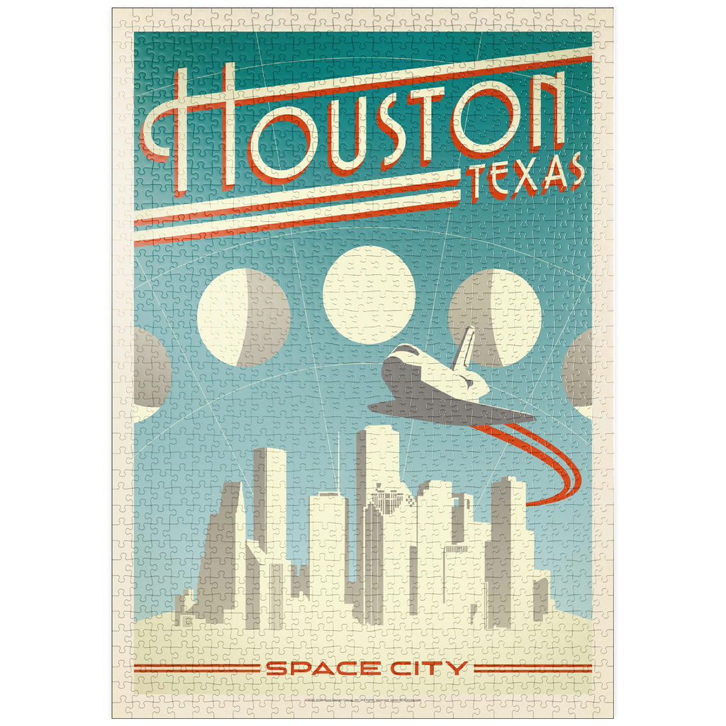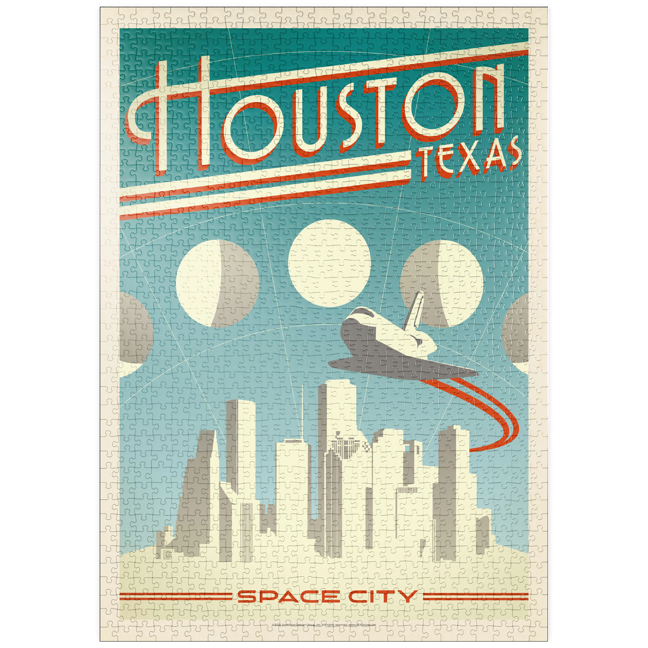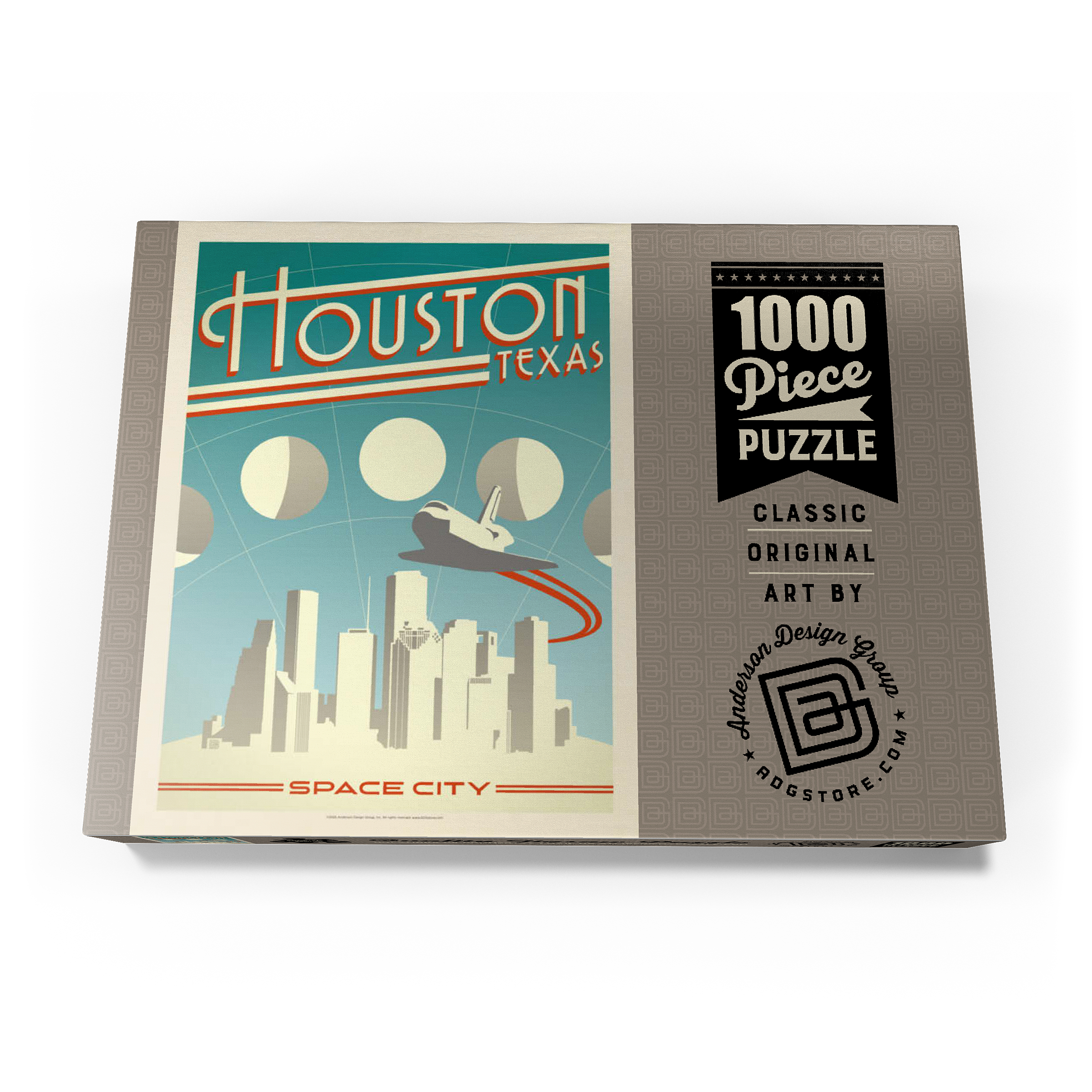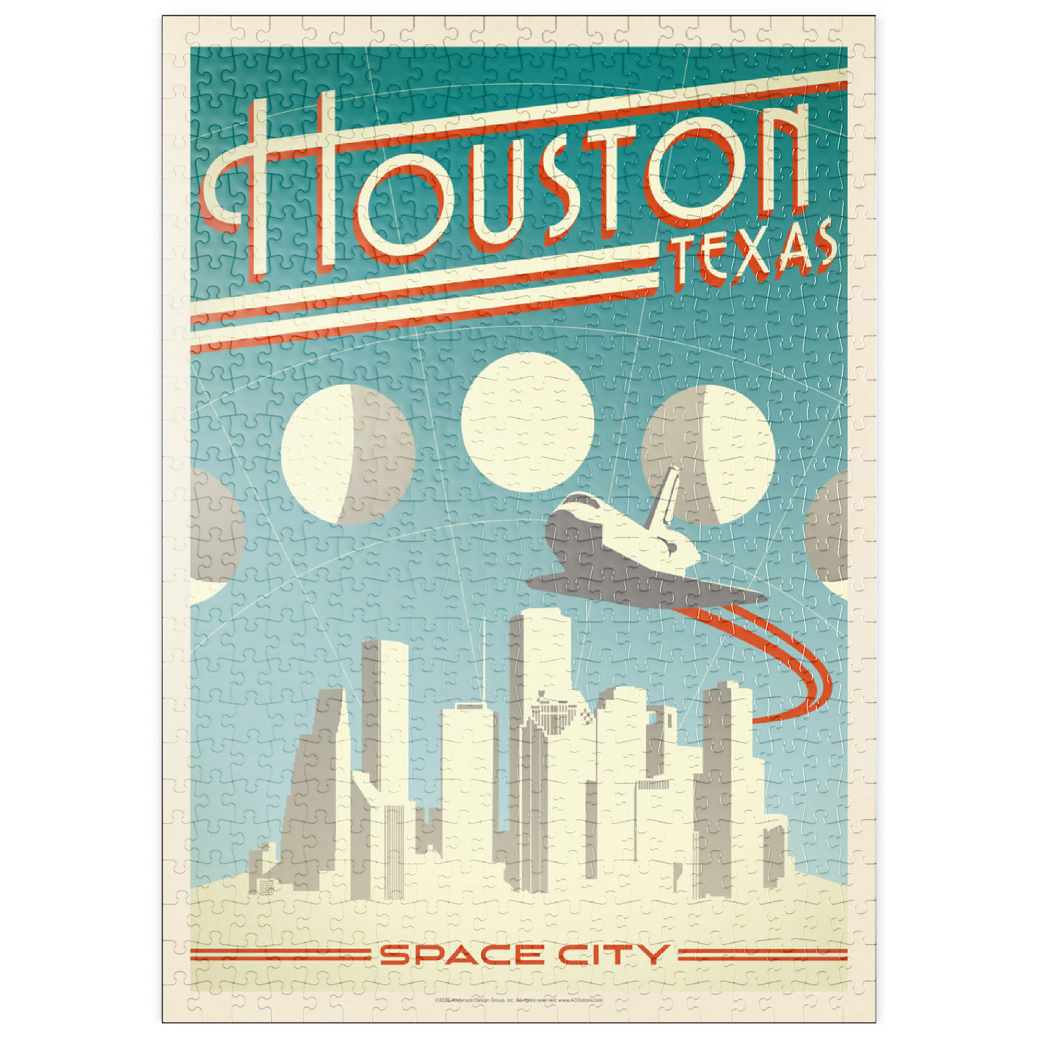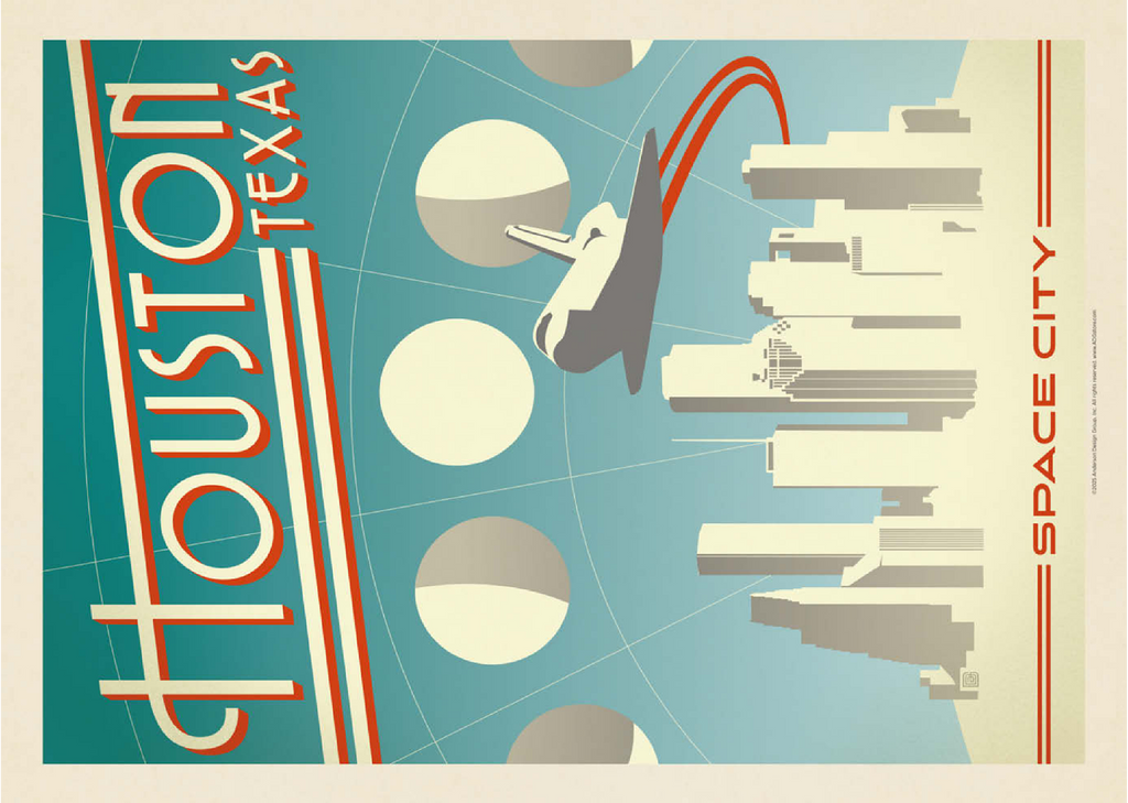 Houston, Texas, bekannt als „Space City“, steht für Raumfahrt, moderne Skyline und kulturelle Vielfalt. Über der Stadt schwebt ein Space Shuttle und verweist auf das Johnson Space Center und Houstons historische Rolle in der US-Raumfahrt. Die markanten Wolkenkratzer unterstreichen die Bedeutung als Zentrum für Energie, Innovation und Wirtschaft. Als viertgrößte Stadt der USA ist Houston auch für Kunst, Museen, kulinarische Vielfalt und Profisport bekannt. Oft als „Energiehauptstadt der Welt“ bezeichnet, gilt die Metropole zugleich als Knotenpunkt für Handel und internationale Vernetzung und verbindet Raumfahrterbe mit urbaner Dynamik.