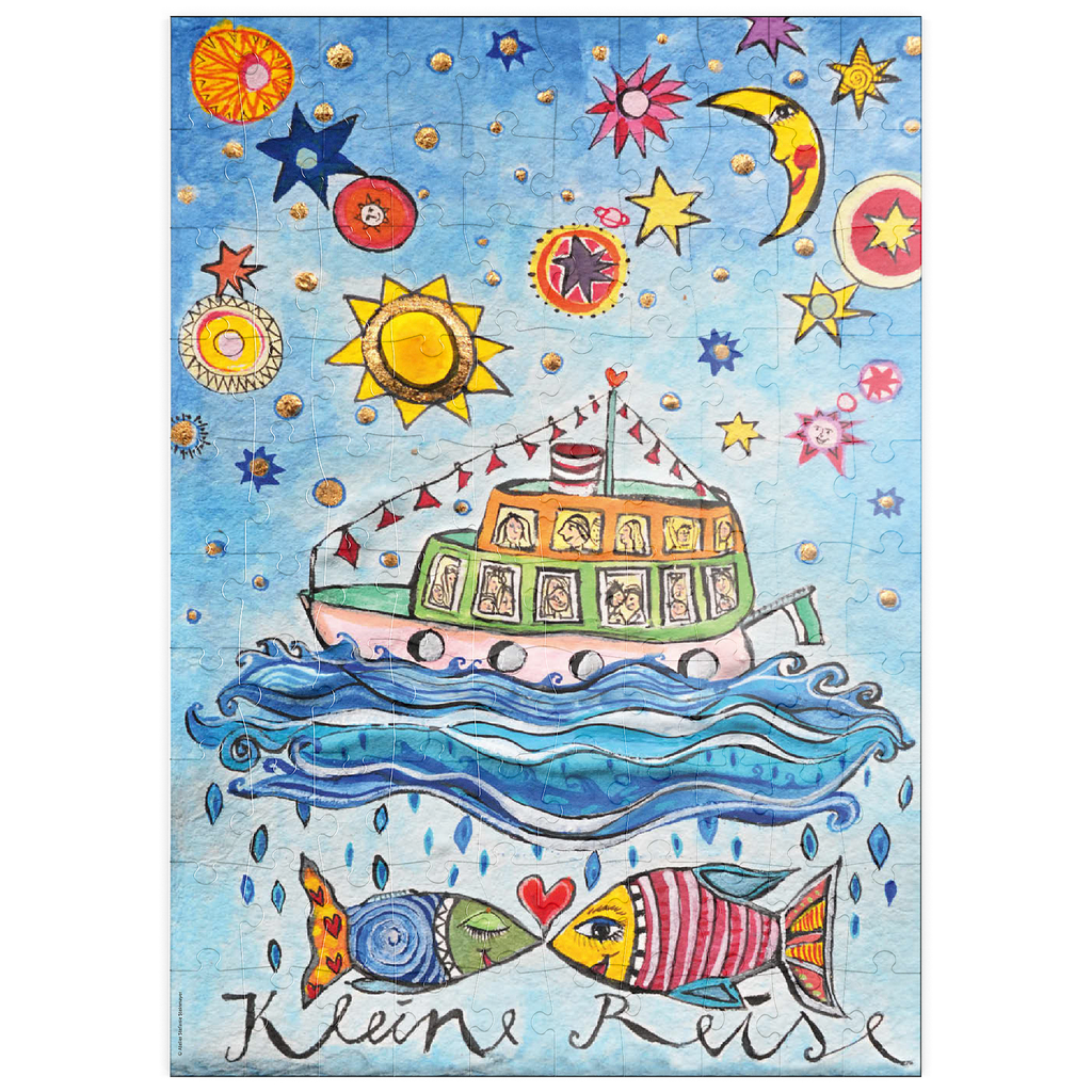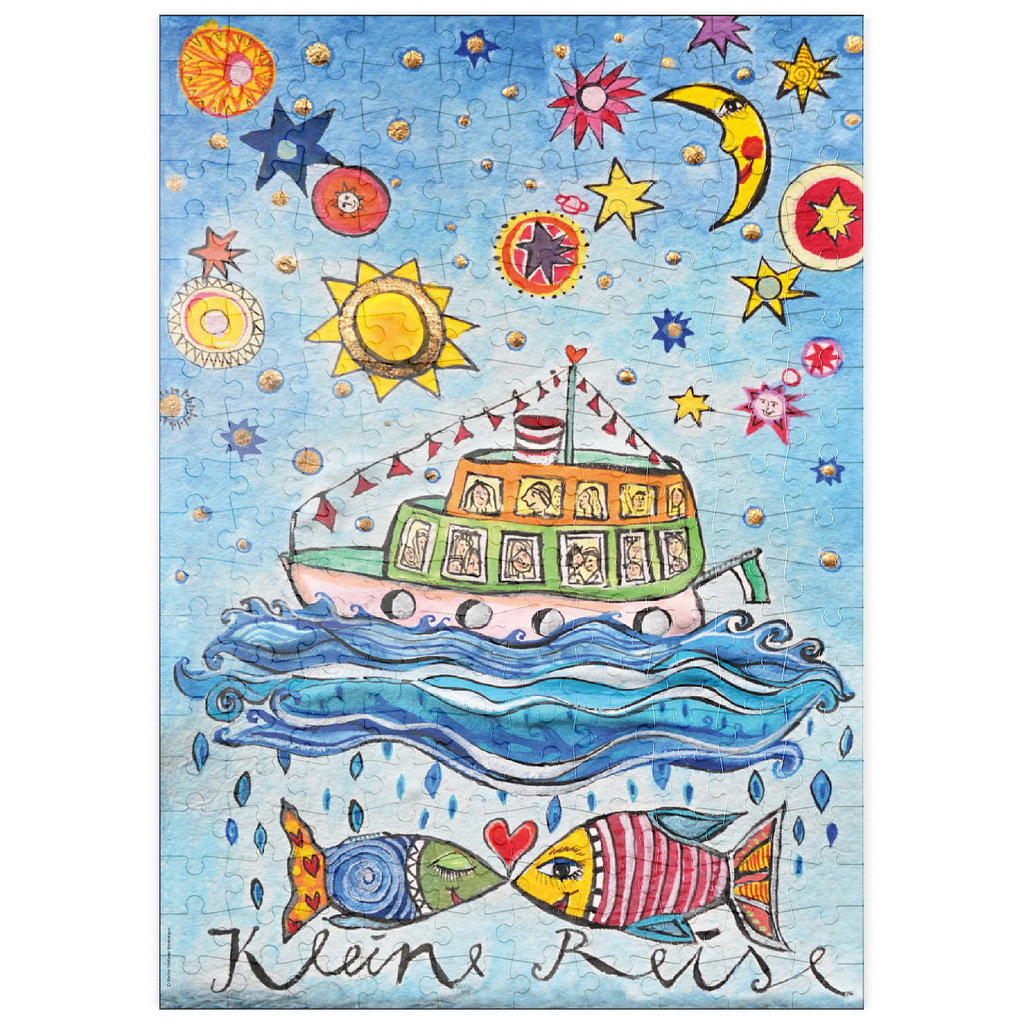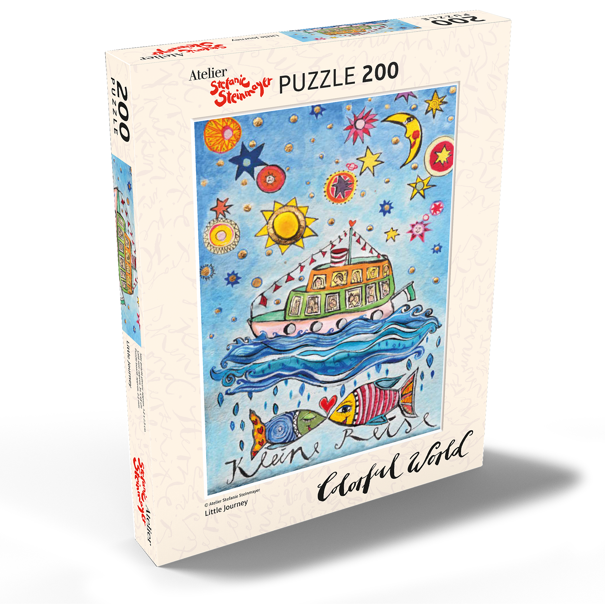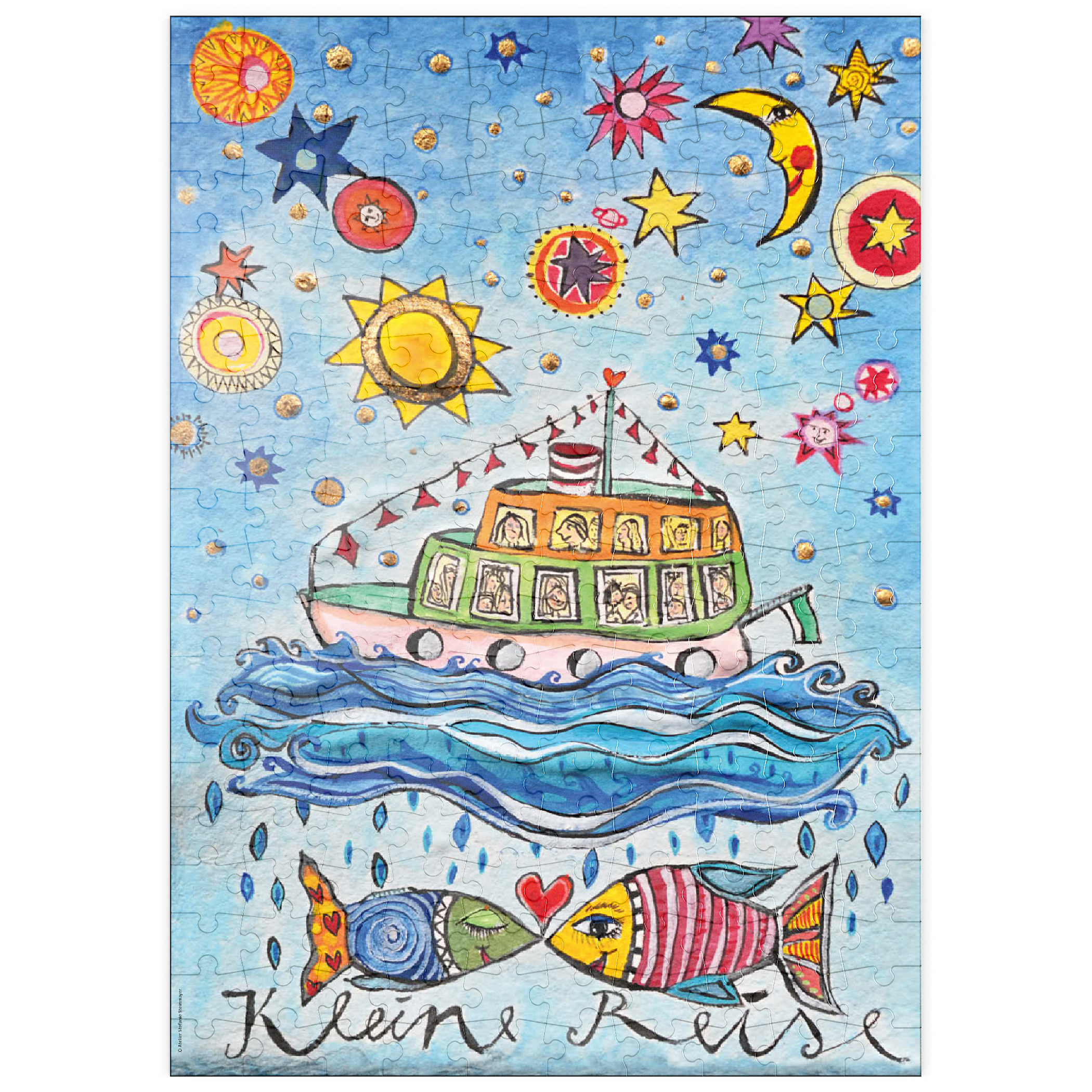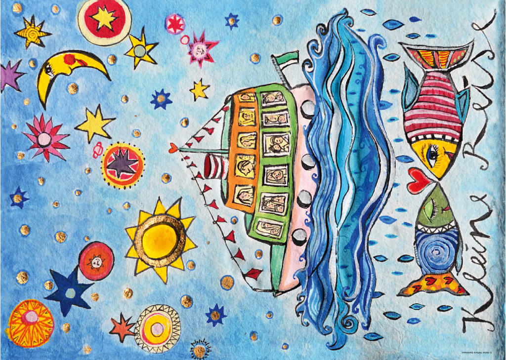 Ein Dampfer mit fröhlichen Passagieren fährt durch die Wellen, Darüber strahlt ein bunter Sternenhimmel. Im Wasser unter den Wellen treffen sich zwei verliebte Fischlein. Kleine Reise.