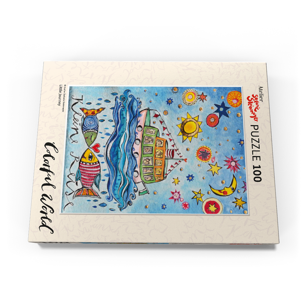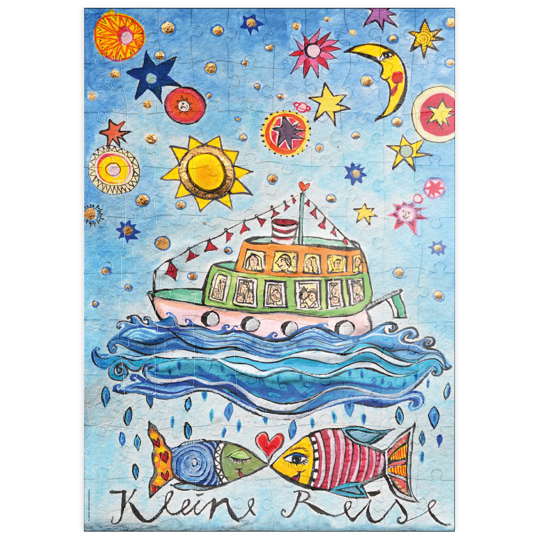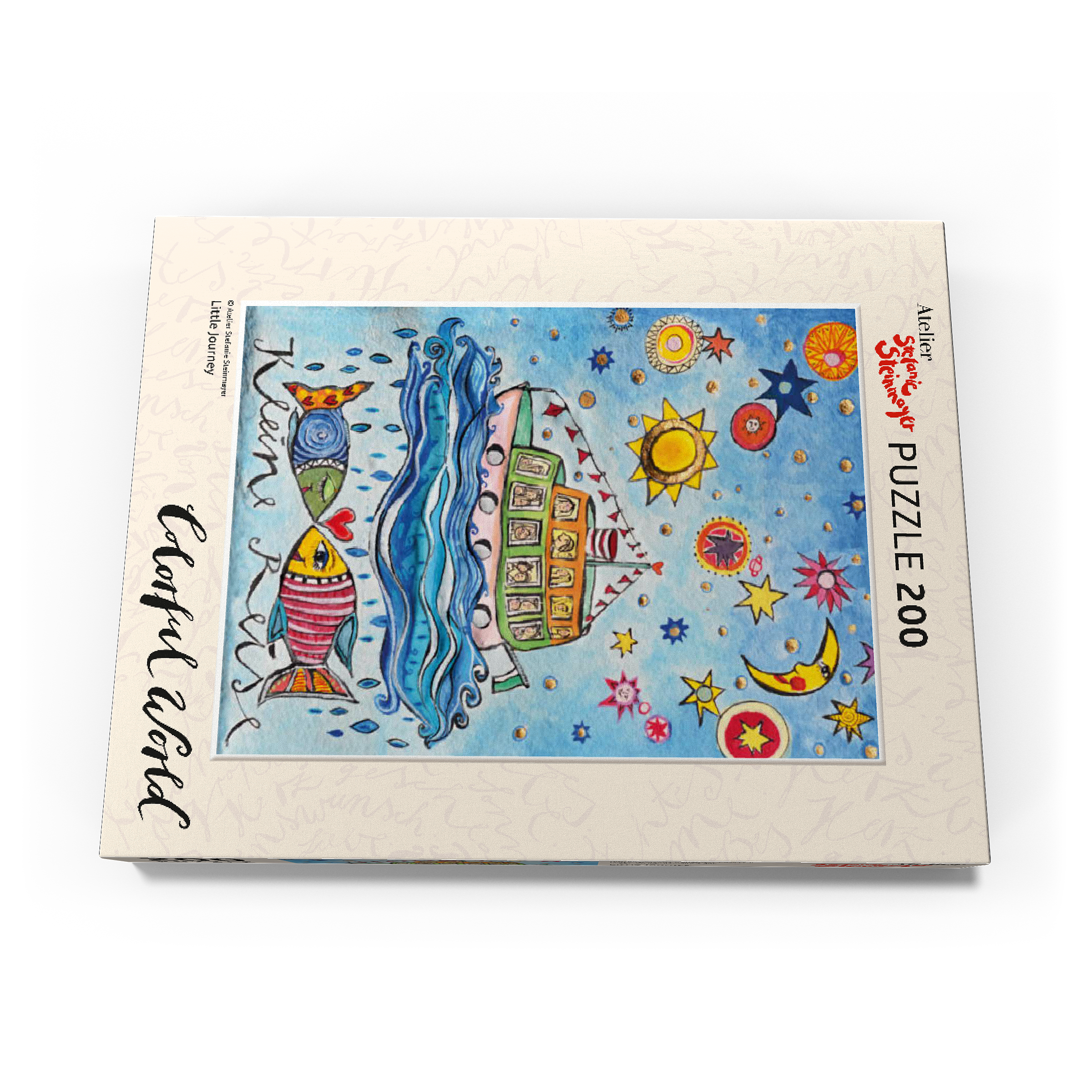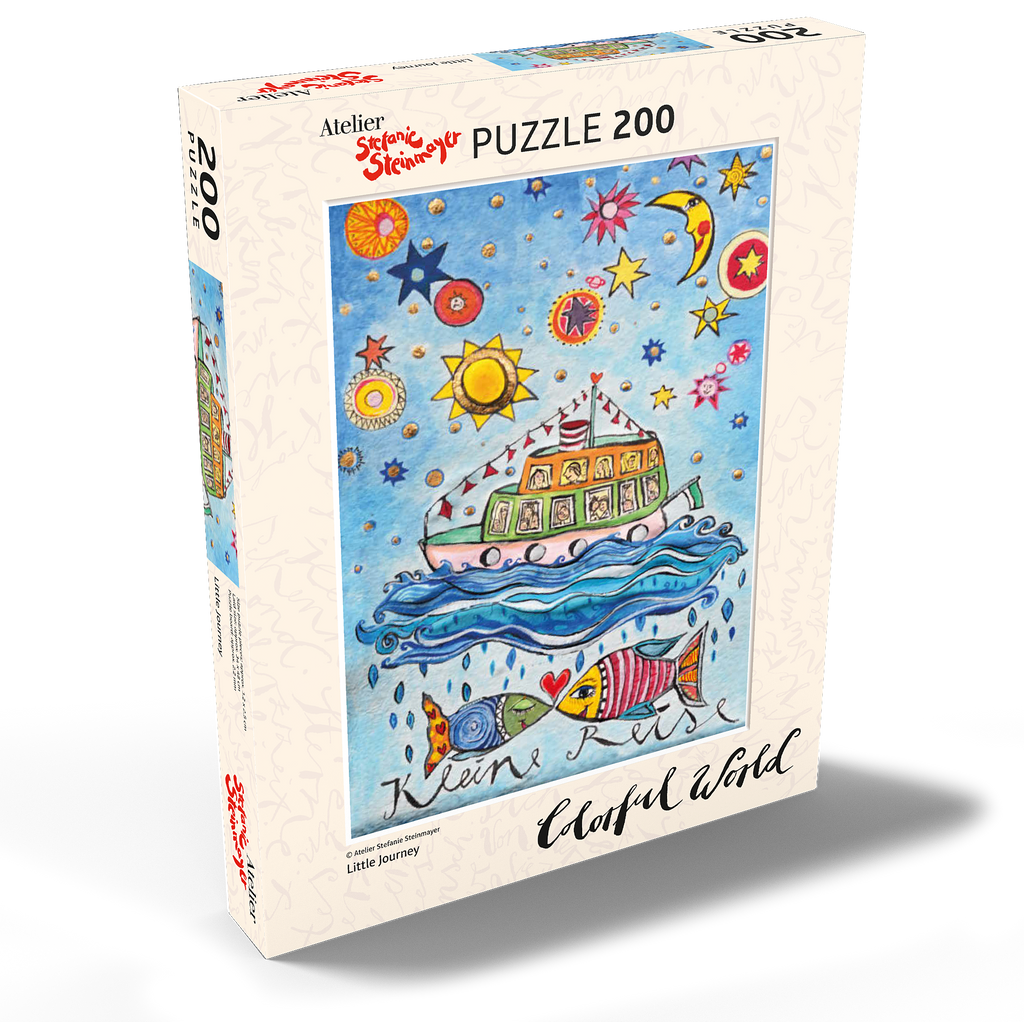 Ein Dampfer mit fröhlichen Passagieren fährt durch die Wellen, Darüber strahlt ein bunter Sternenhimmel. Im Wasser unter den Wellen treffen sich zwei verliebte Fischlein. Kleine Reise.