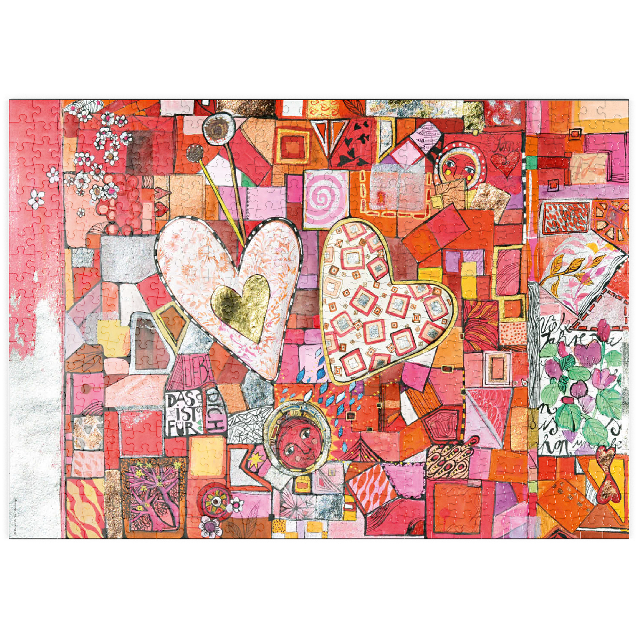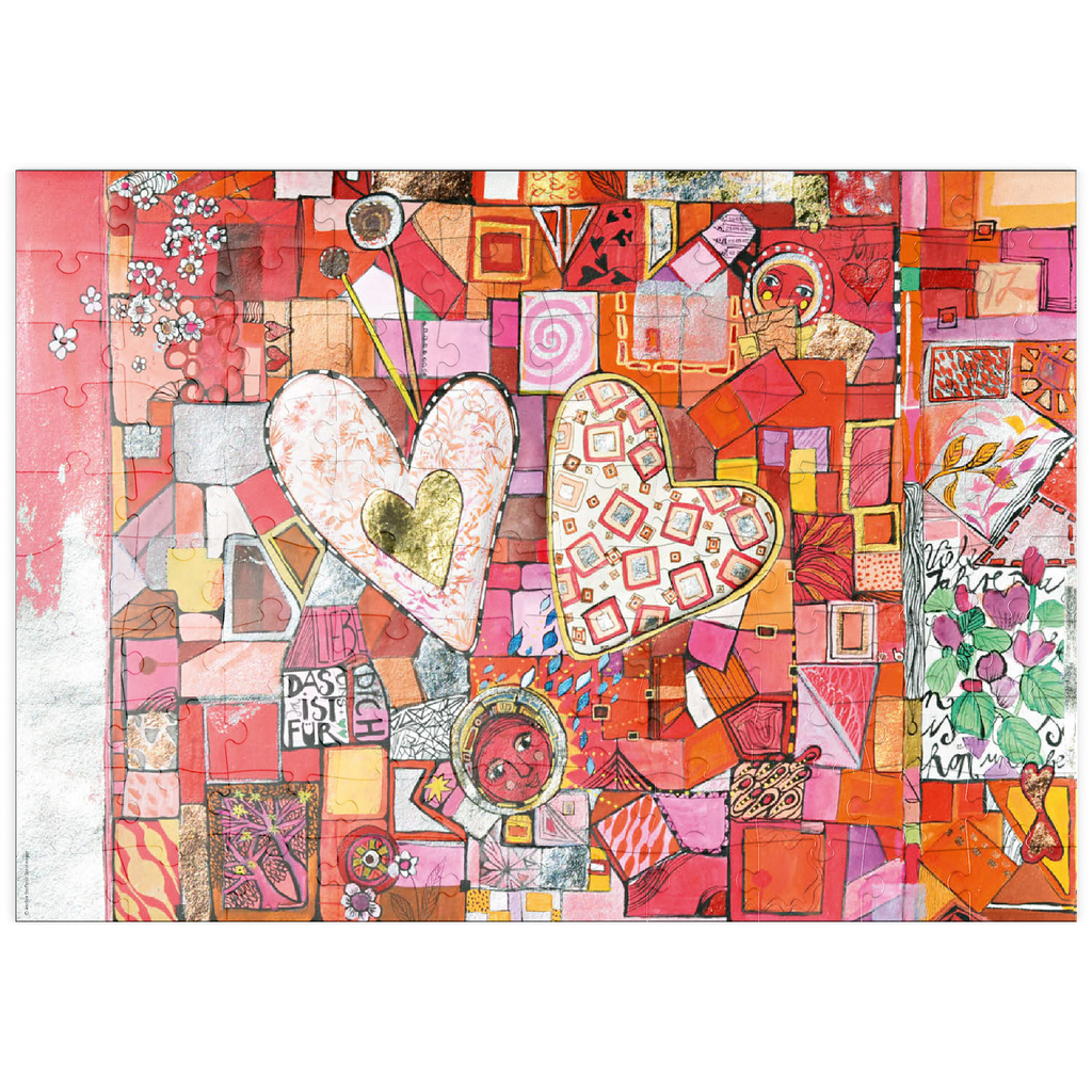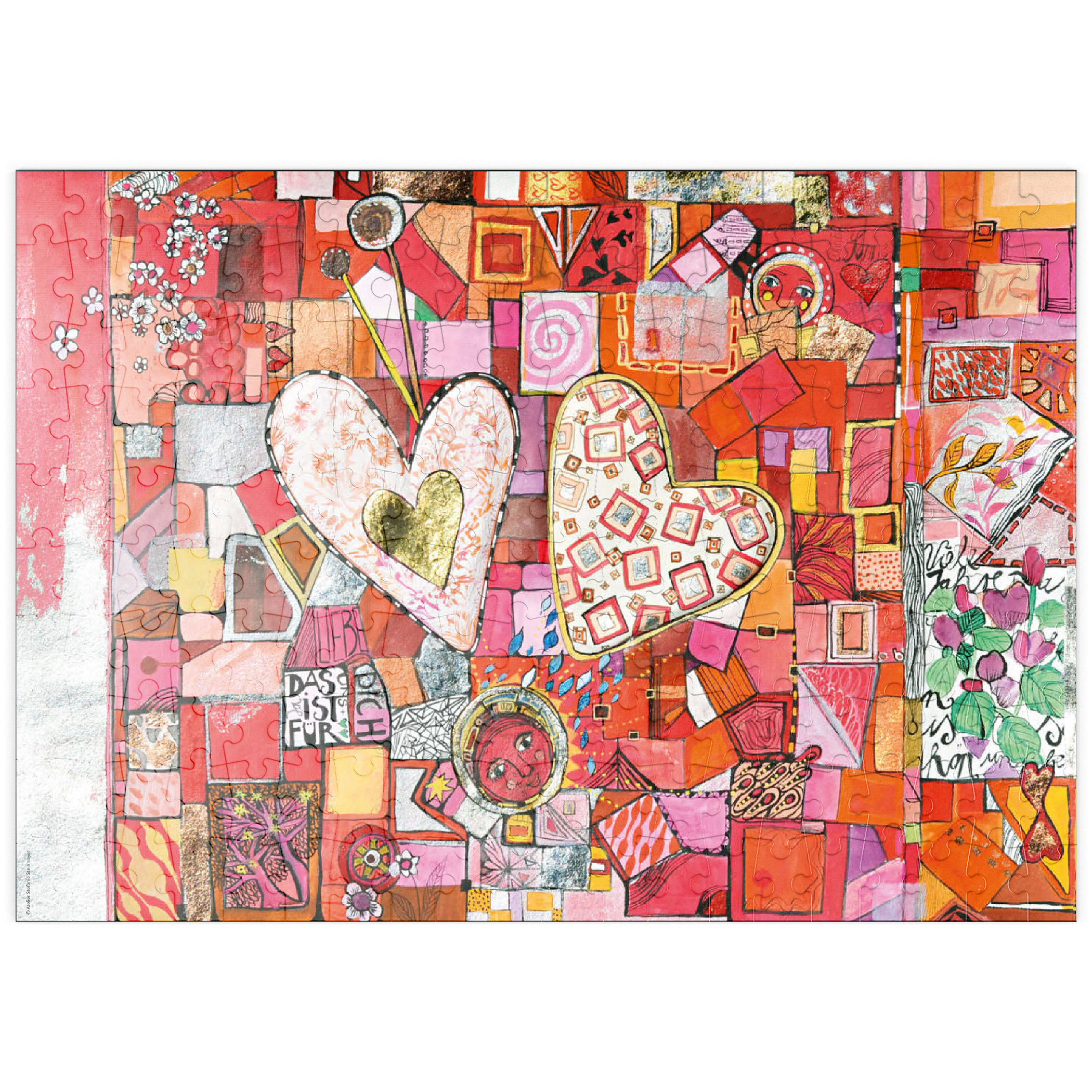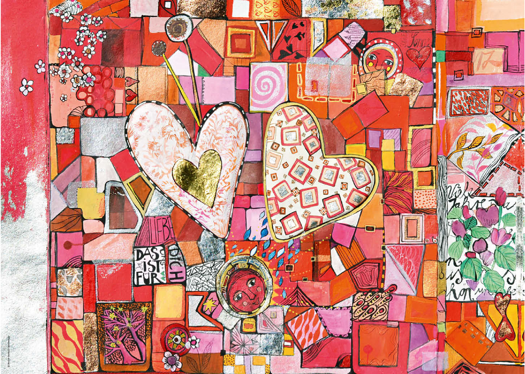 Ein Herzpaar, bemalt mit hellen, zarten Pastelltönen ruht auf einem kleinteiligen Fleckenteppich in rot, rosa und orange. Unter dem Herzpaar steht mittig ein kleines rotes Mondgesicht.