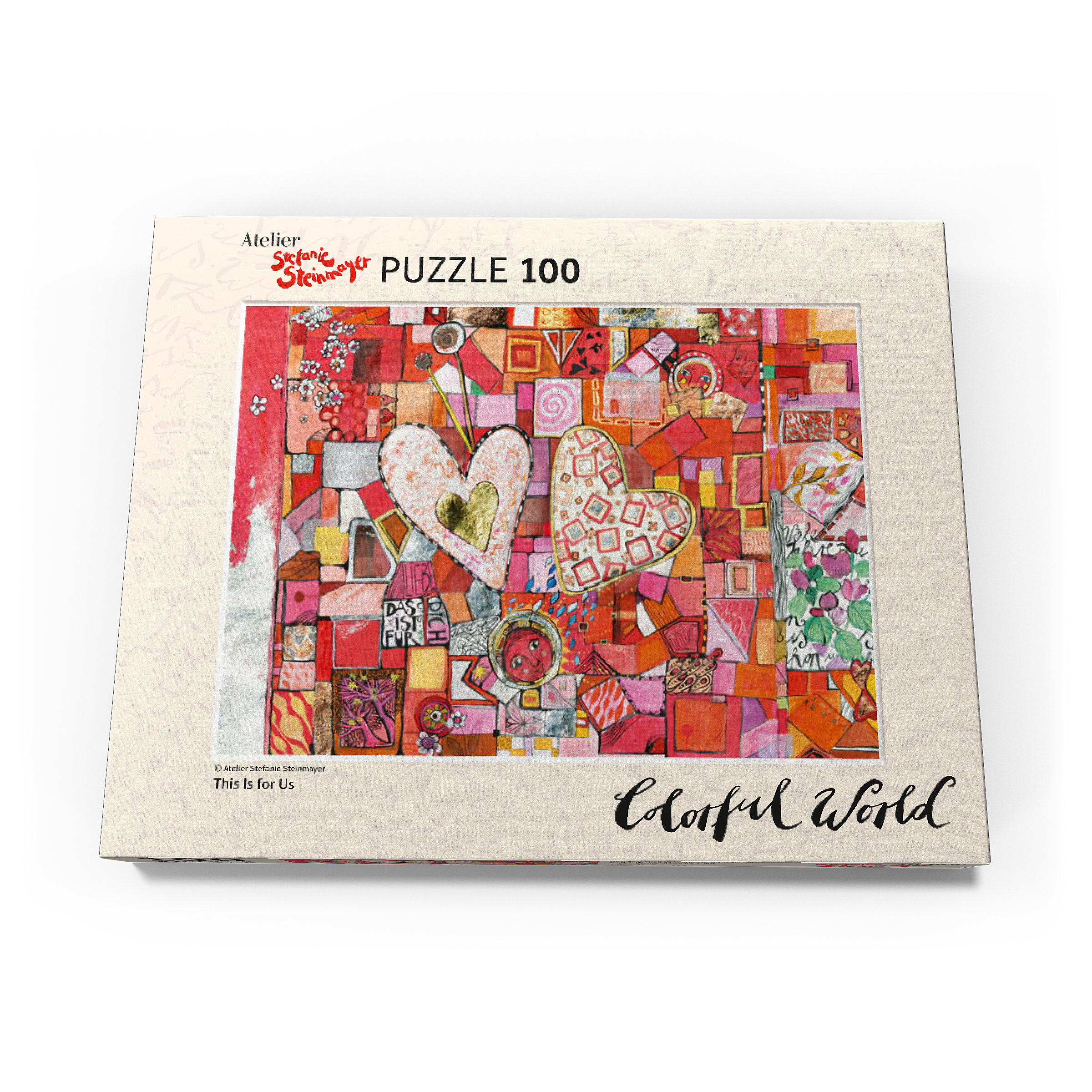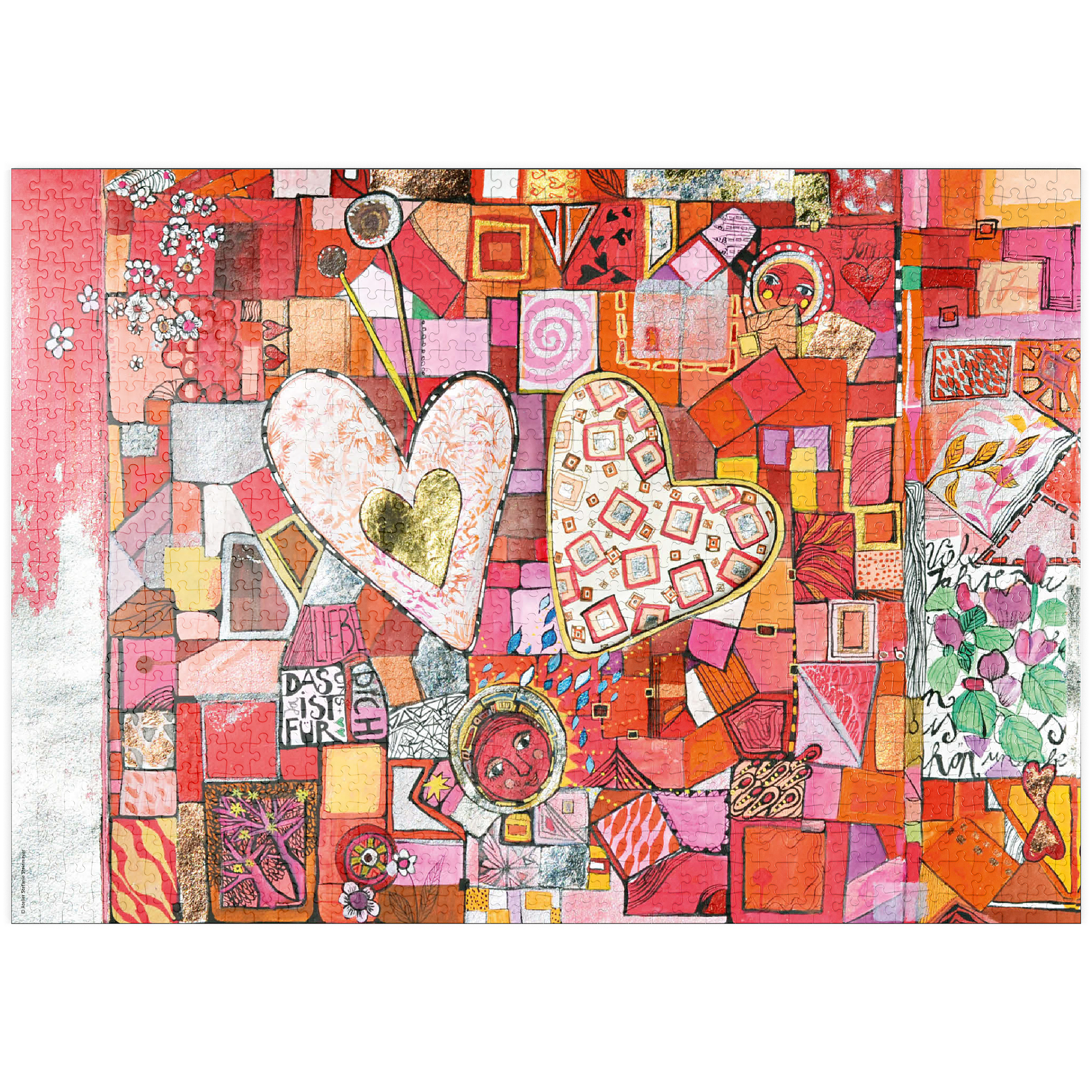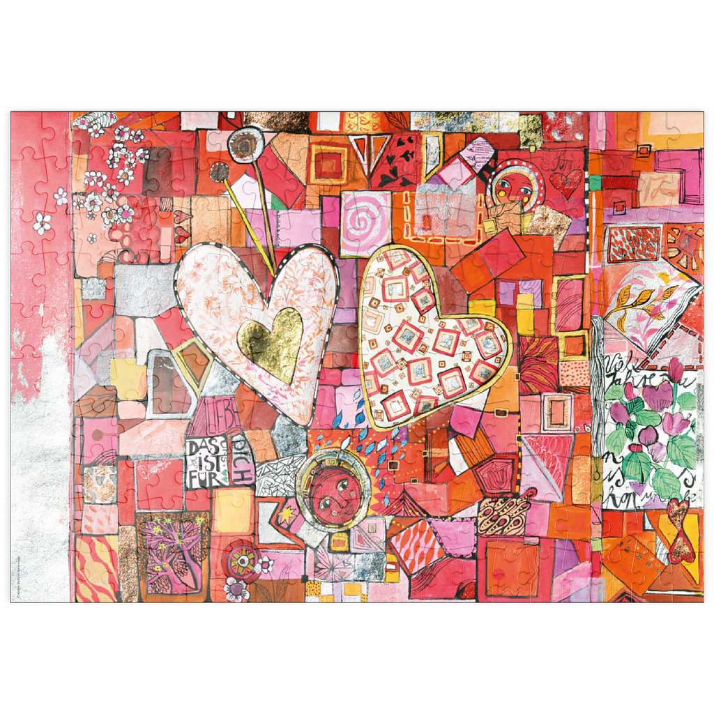 Ein Herzpaar, bemalt mit hellen, zarten Pastelltönen ruht auf einem kleinteiligen Fleckenteppich in rot, rosa und orange. Unter dem Herzpaar steht mittig ein kleines rotes Mondgesicht.