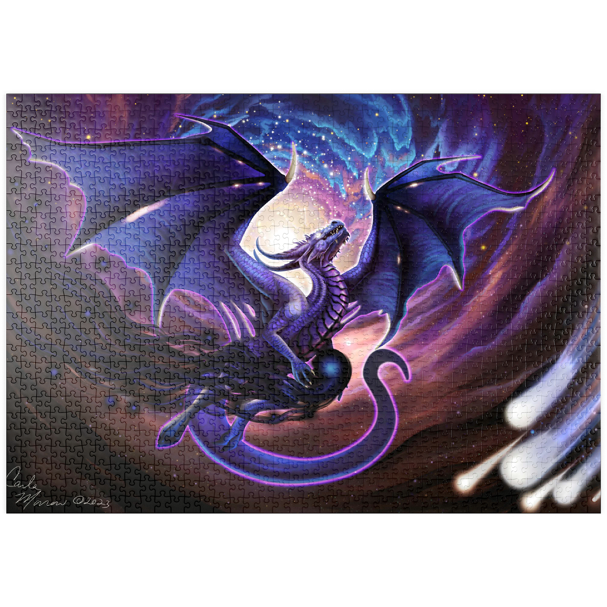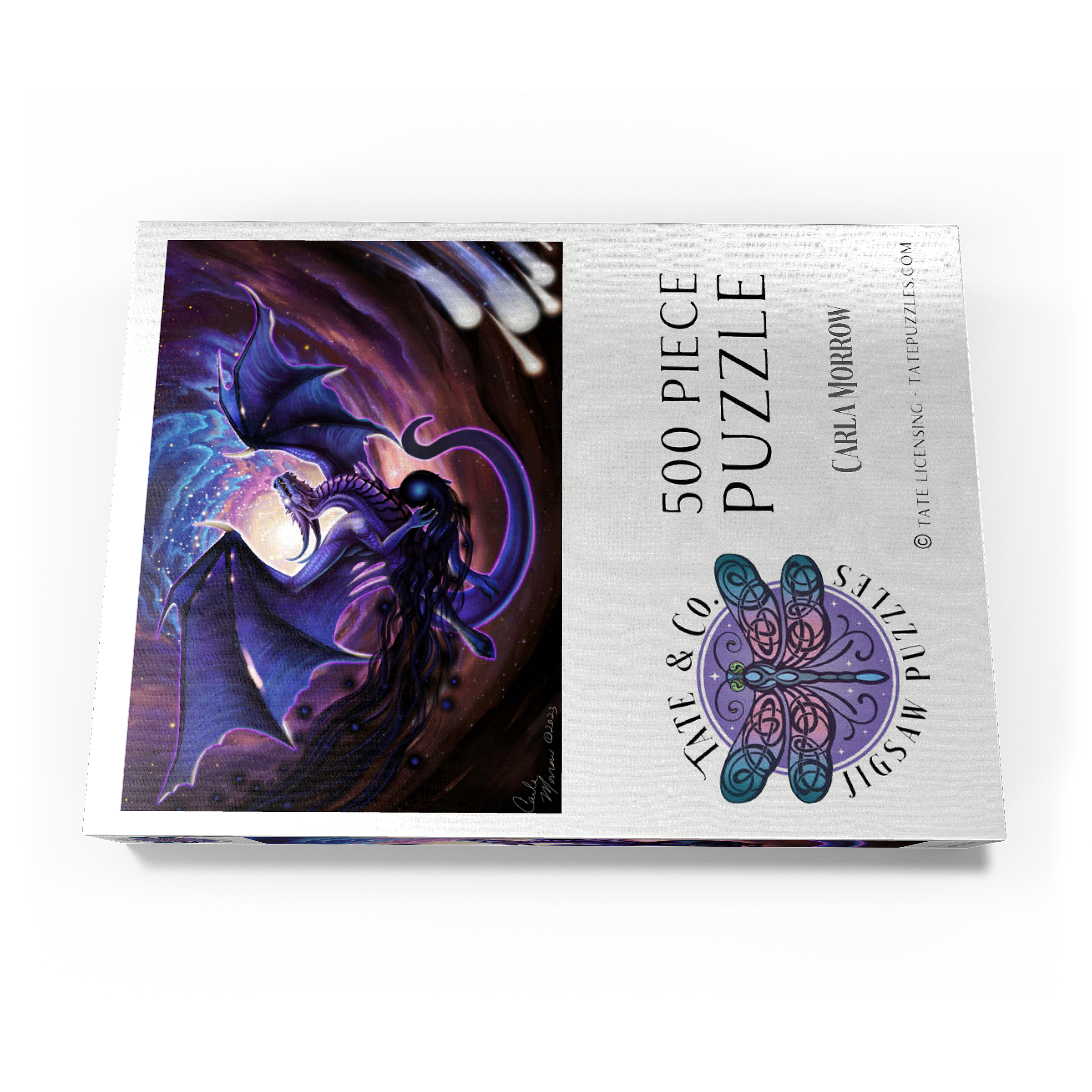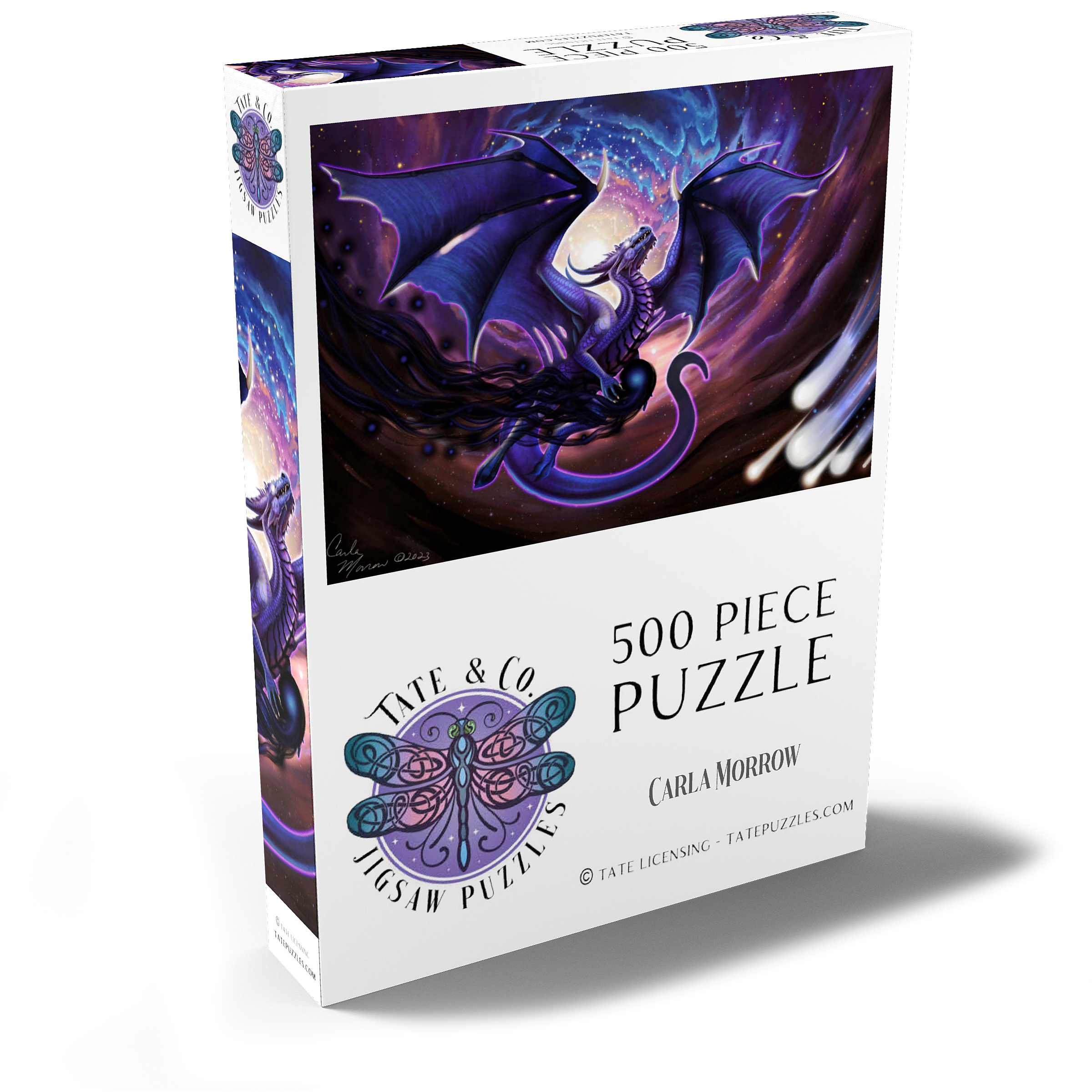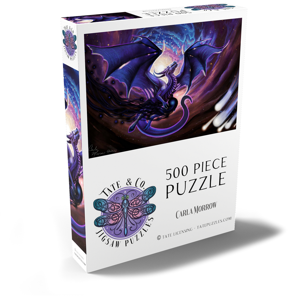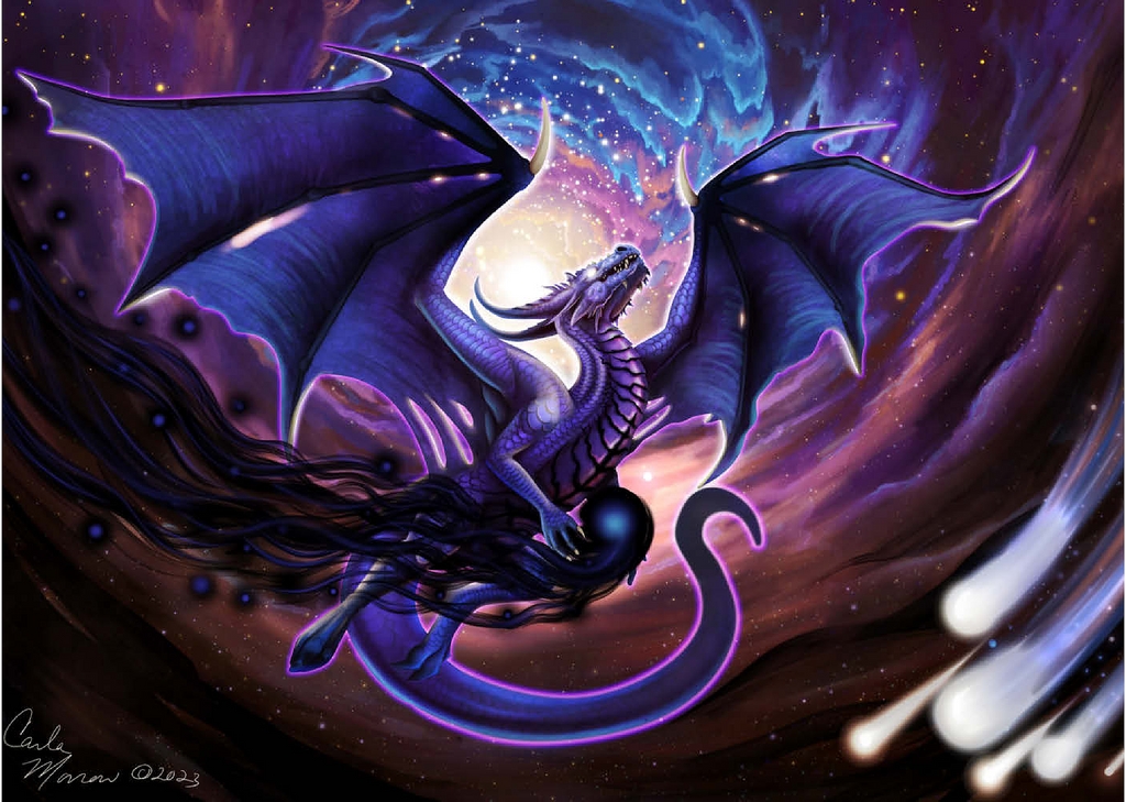 Carla Morrows „Dark Star“ ist ein majestätischer Drache, der in tiefe Violett- und Kosmictöne gehüllt ist und scheinbar aus einer sternenübersäten Leere auftaucht oder durch sie hindurchfliegt. Seine Schuppen schimmern mit einem galaxisähnlichen Muster, und seine Augen leuchten mit einem überirdischen Licht, das ein Gefühl von Geheimnis und Macht hervorruft. Vor dem Hintergrund wirbelnder Nebel und entfernter Sterne fängt es eine Mischung aus Fantasie und kosmischem Staunen ein.