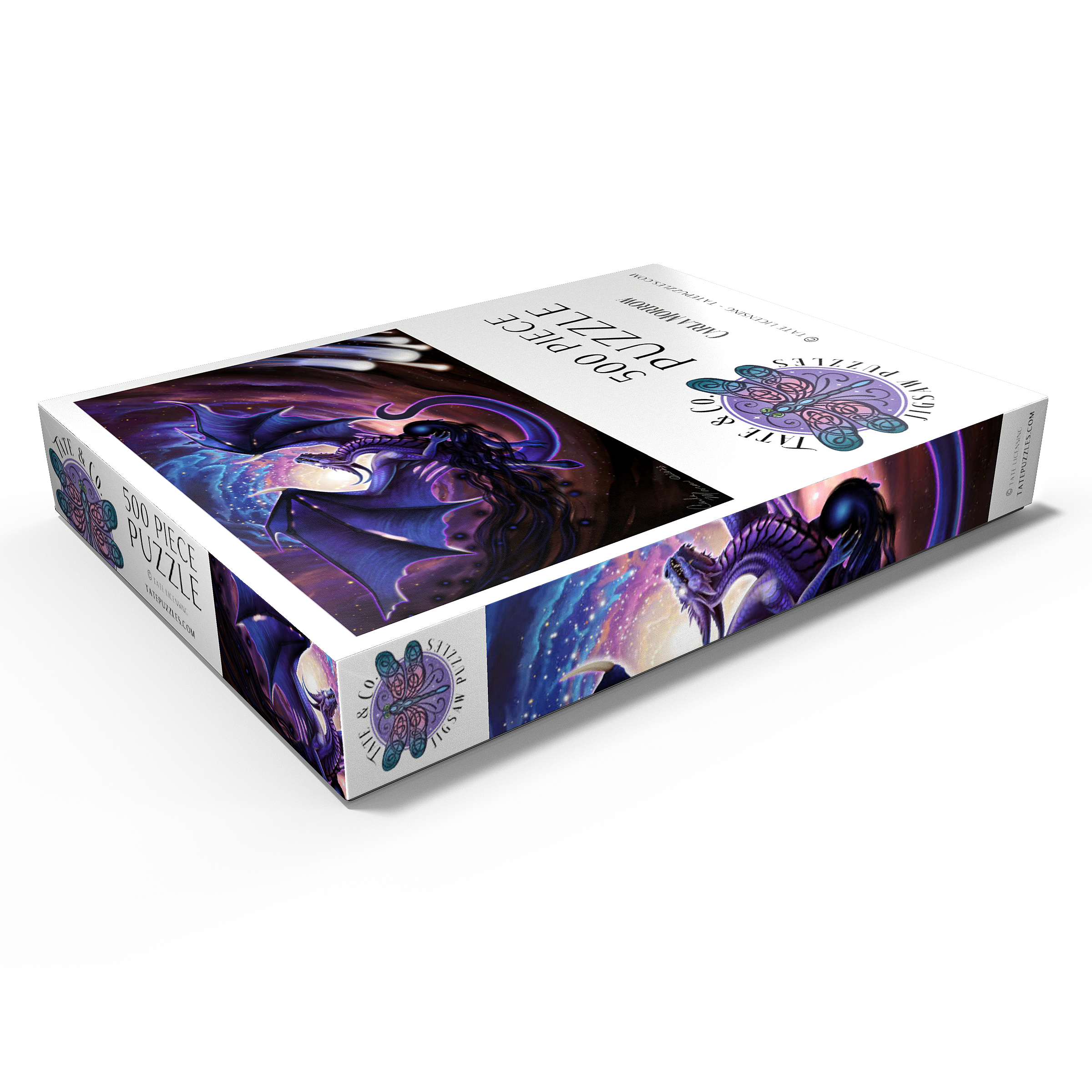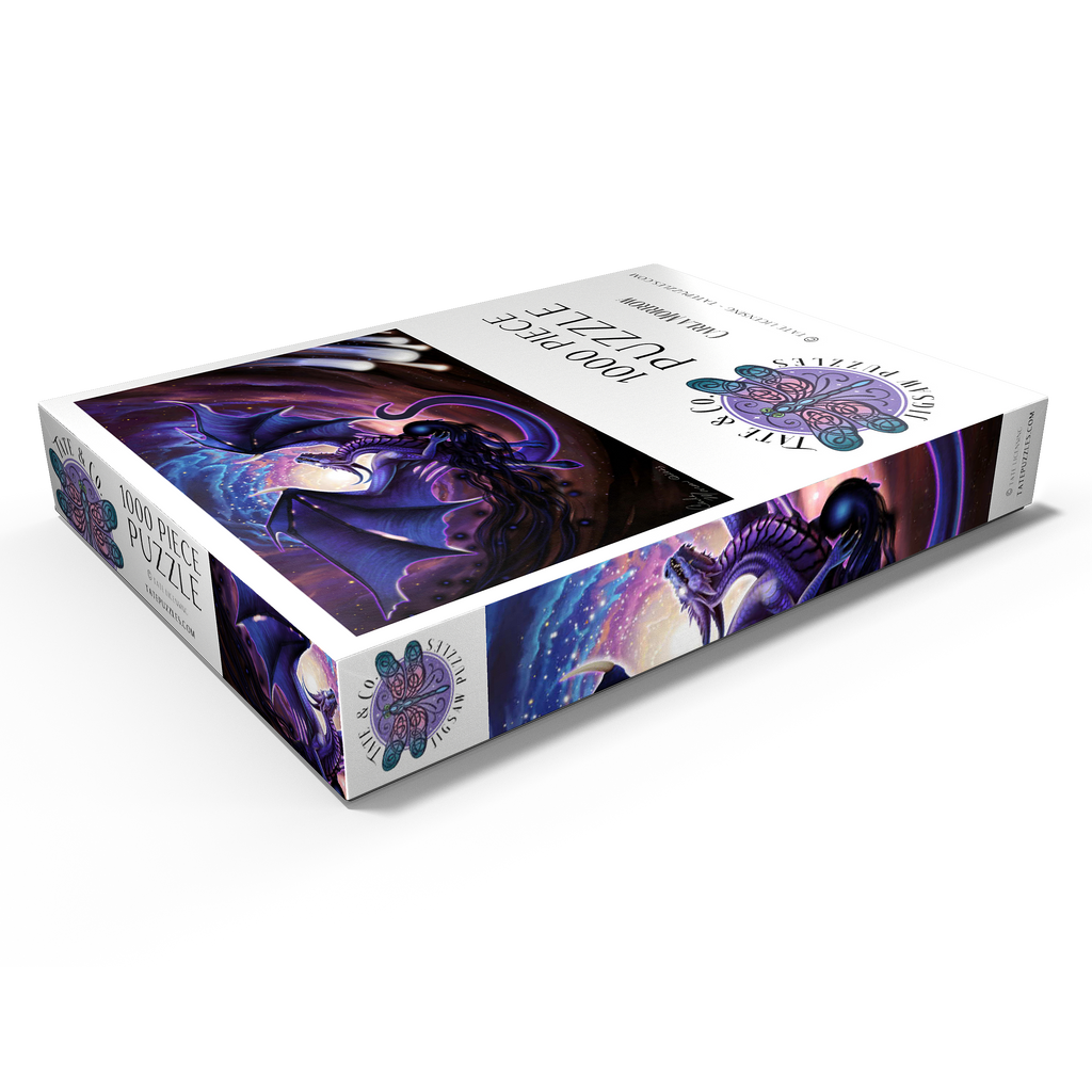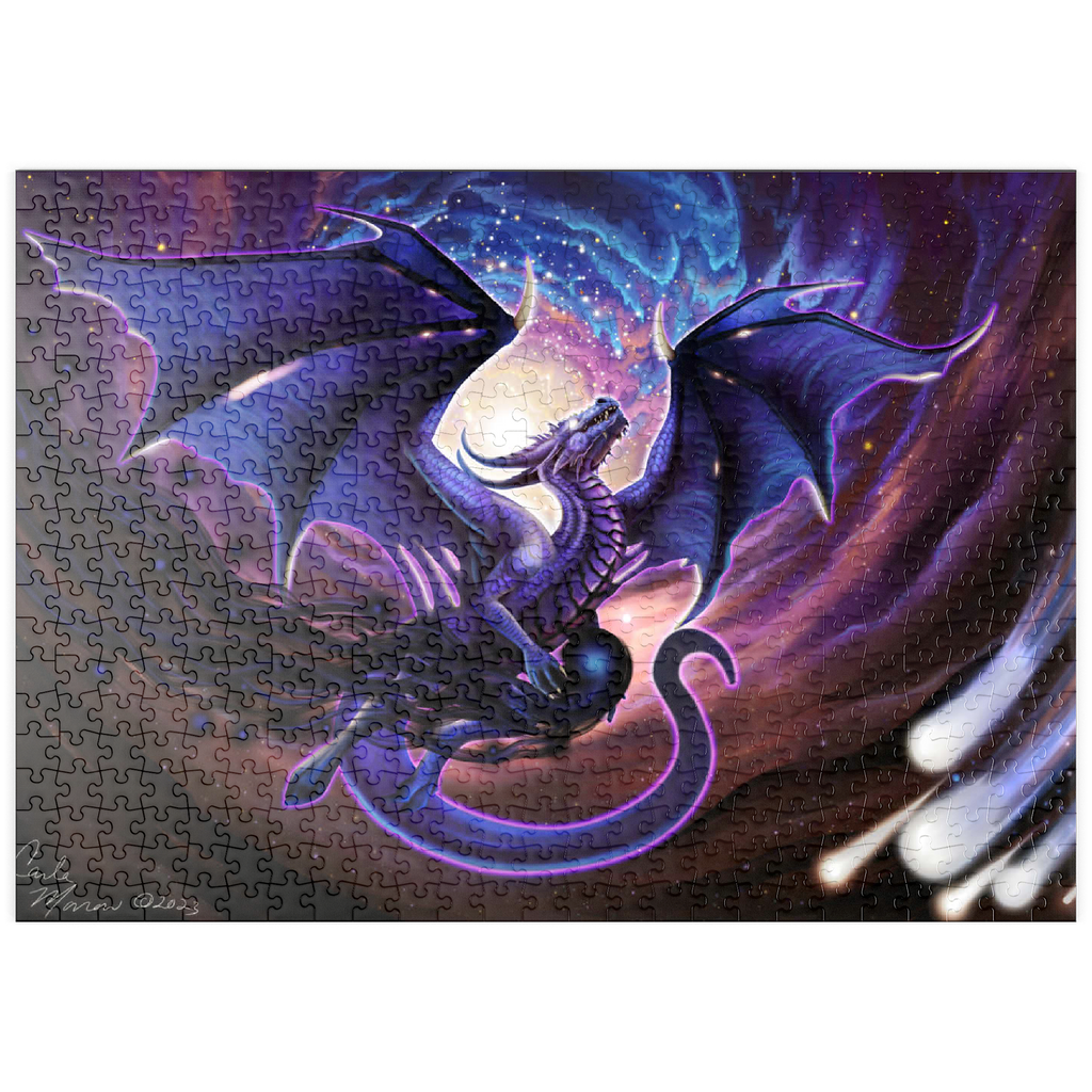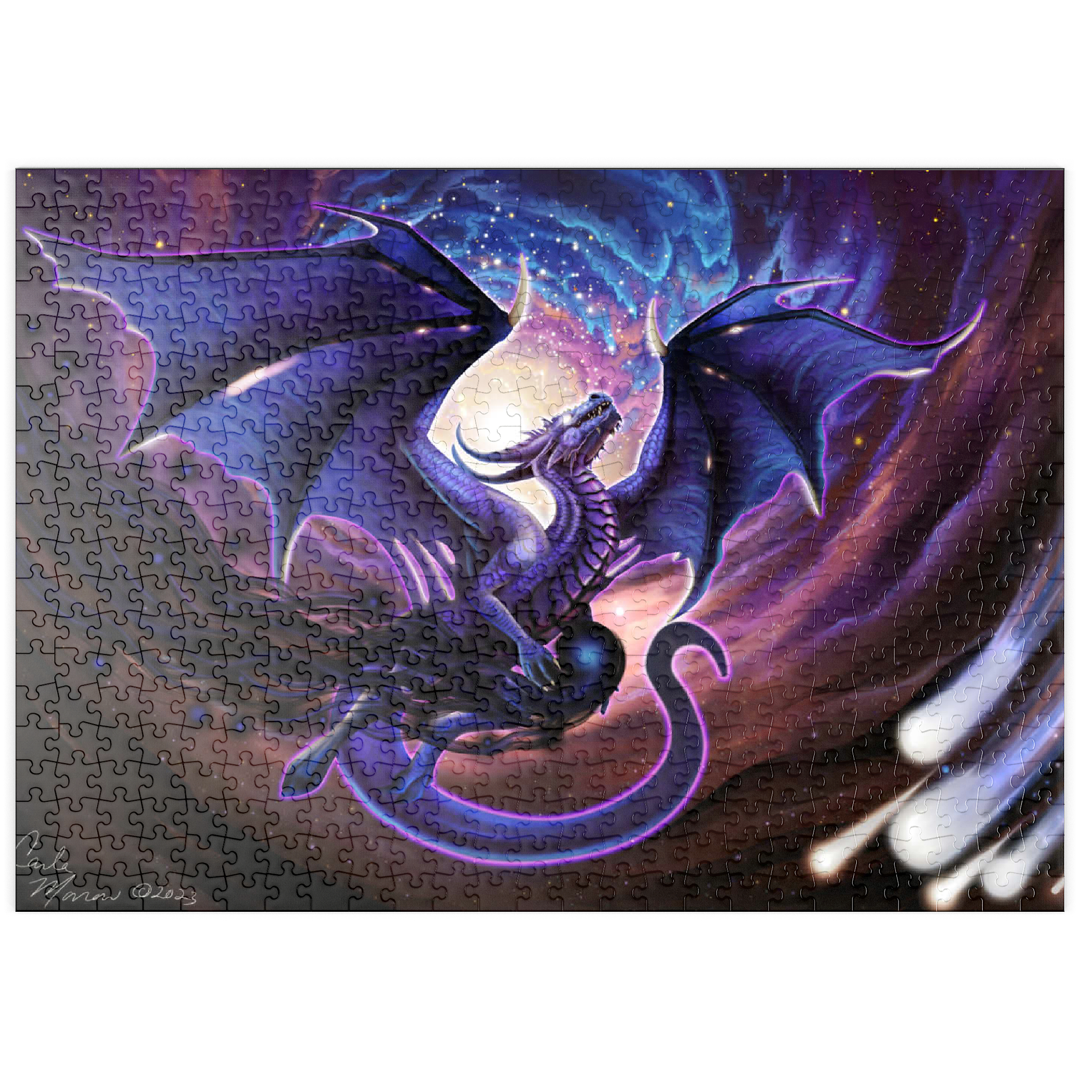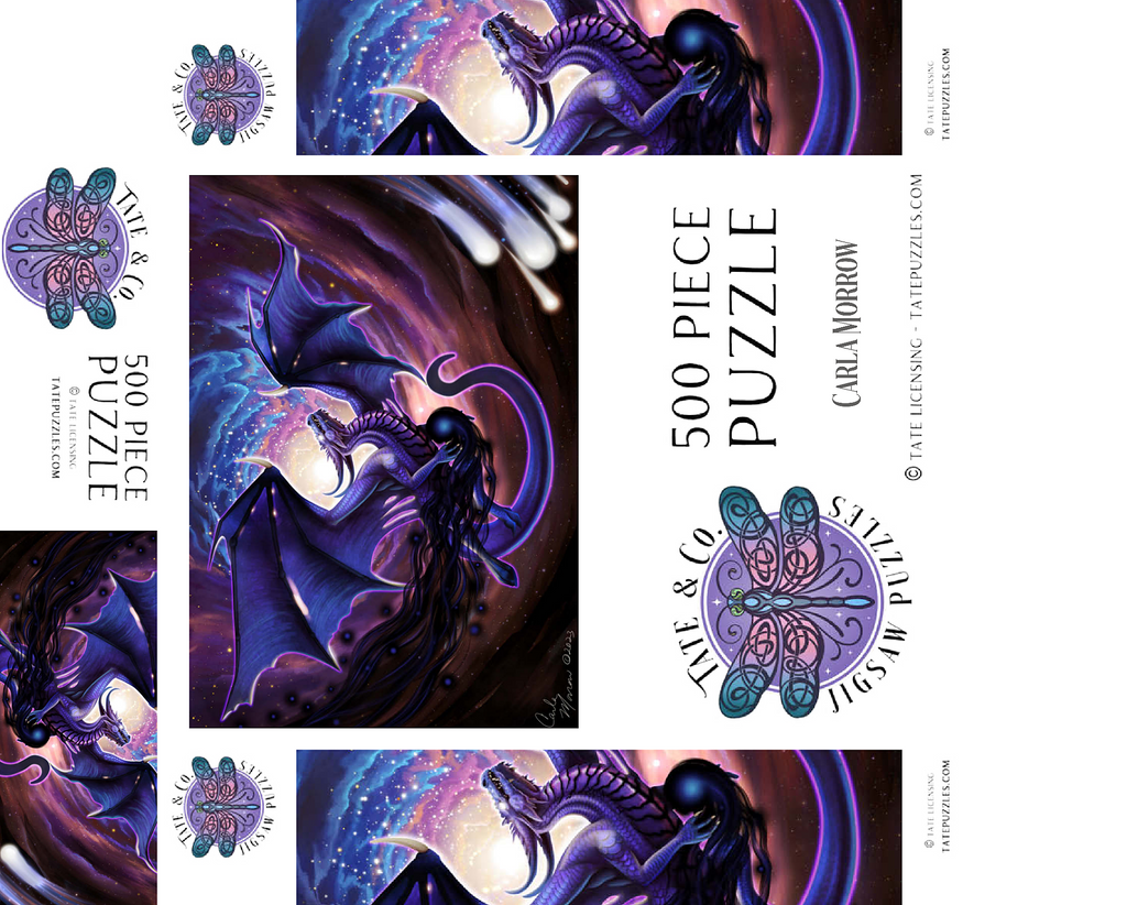 Carla Morrows „Dark Star“ ist ein majestätischer Drache, der in tiefe Violett- und Kosmictöne gehüllt ist und scheinbar aus einer sternenübersäten Leere auftaucht oder durch sie hindurchfliegt. Seine Schuppen schimmern mit einem galaxisähnlichen Muster, und seine Augen leuchten mit einem überirdischen Licht, das ein Gefühl von Geheimnis und Macht hervorruft. Vor dem Hintergrund wirbelnder Nebel und entfernter Sterne fängt es eine Mischung aus Fantasie und kosmischem Staunen ein.
