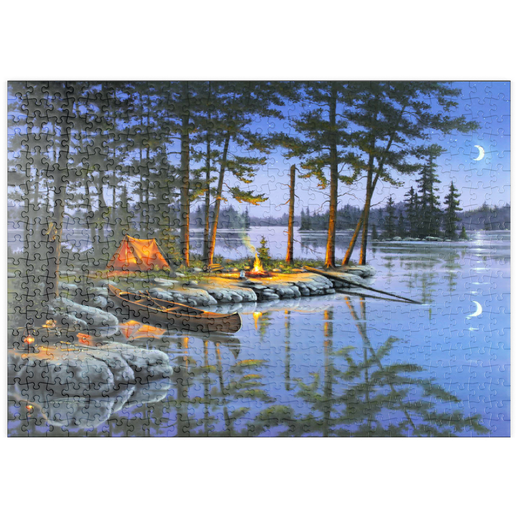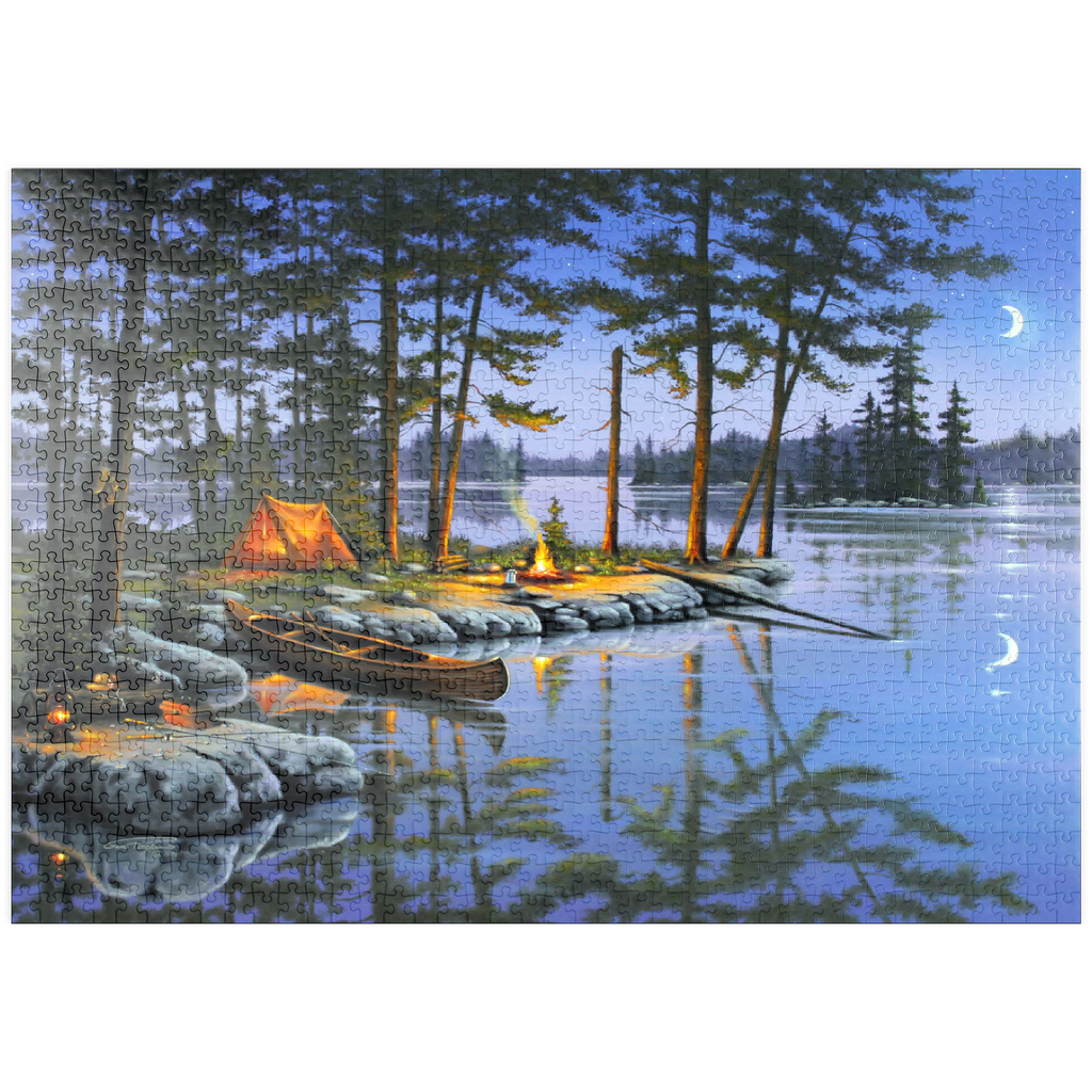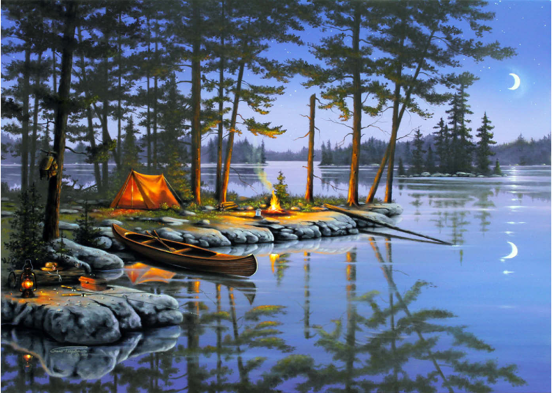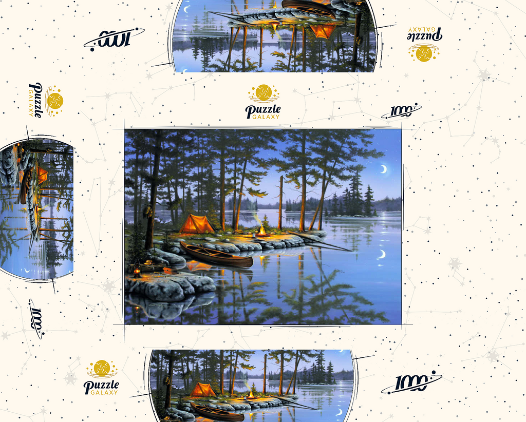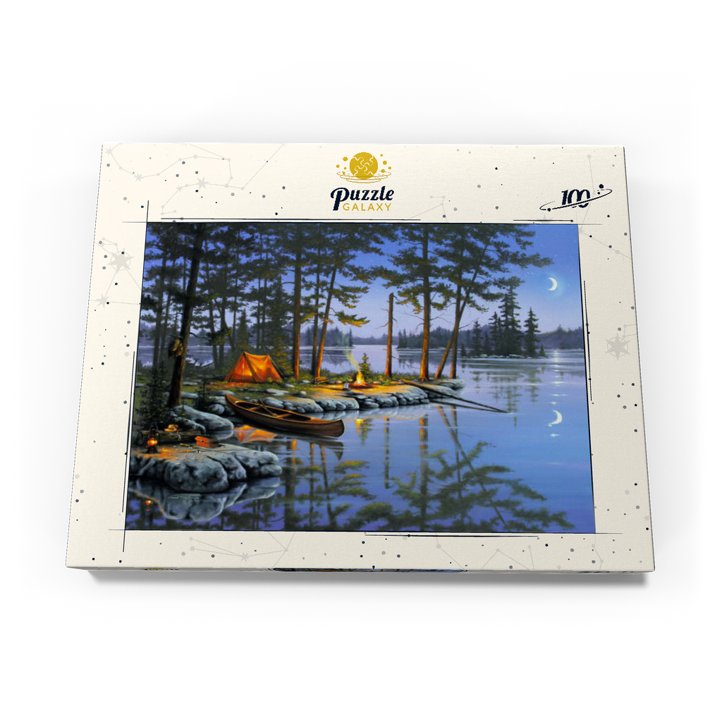 Eine ruhige Szene am See, die die Essenz des Campings im Freien einfängt. Das leuchtende Lagerfeuer wirft ein warmes Licht auf die umliegenden Kiefern und ein gemütliches orangefarbenes Zelt. Ein Holzkanu liegt am Ufer und spiegelt sich in der ruhigen Seeoberfläche. Angelausrüstung und Laternen tragen zum rustikalen Charme bei. Der Halbmond und der sternenklare Himmel schaffen eine friedliche Atmosphäre, während entfernte Inseln und hohe Kiefern die Schönheit dieses Rückzugsortes in der Wildnis unterstreichen.