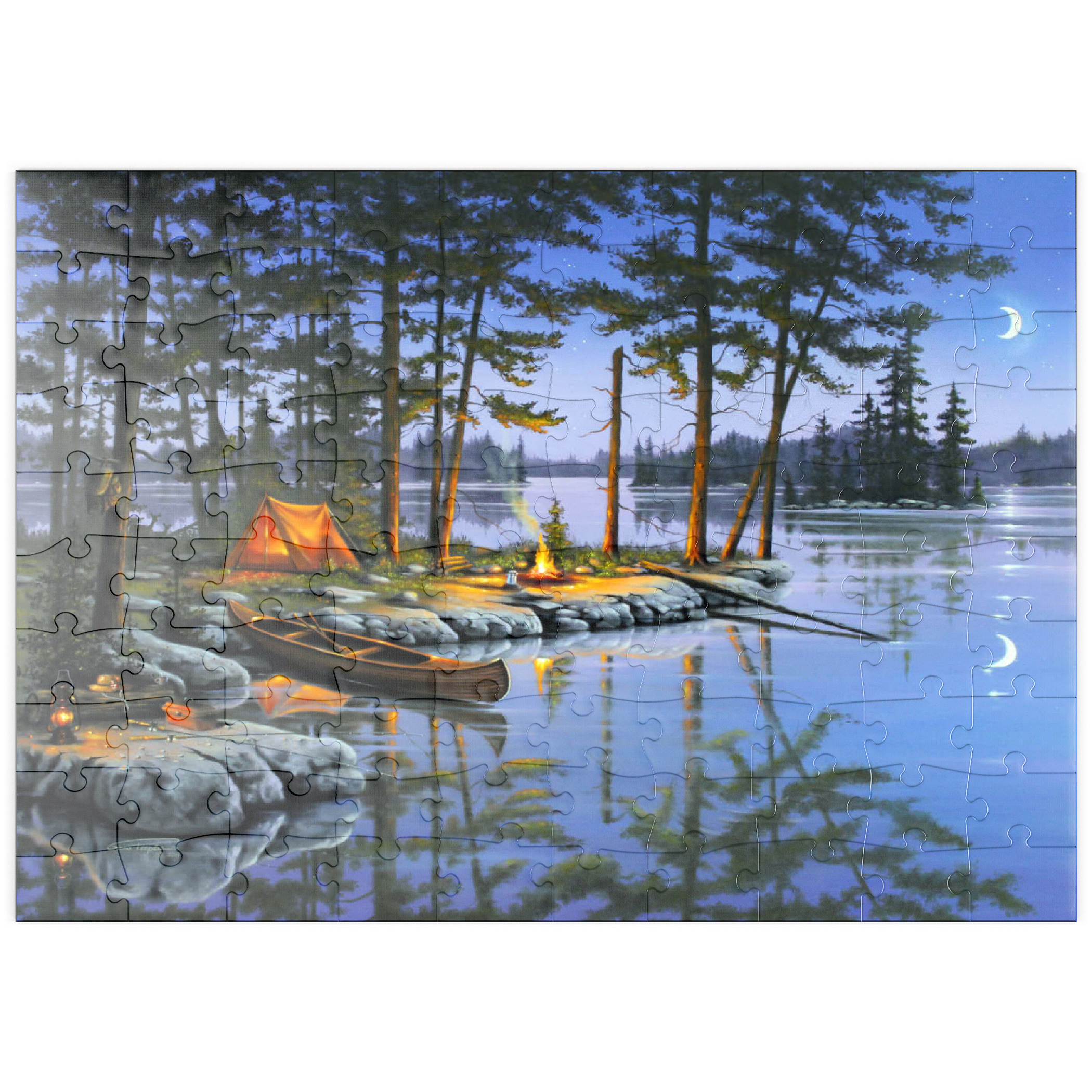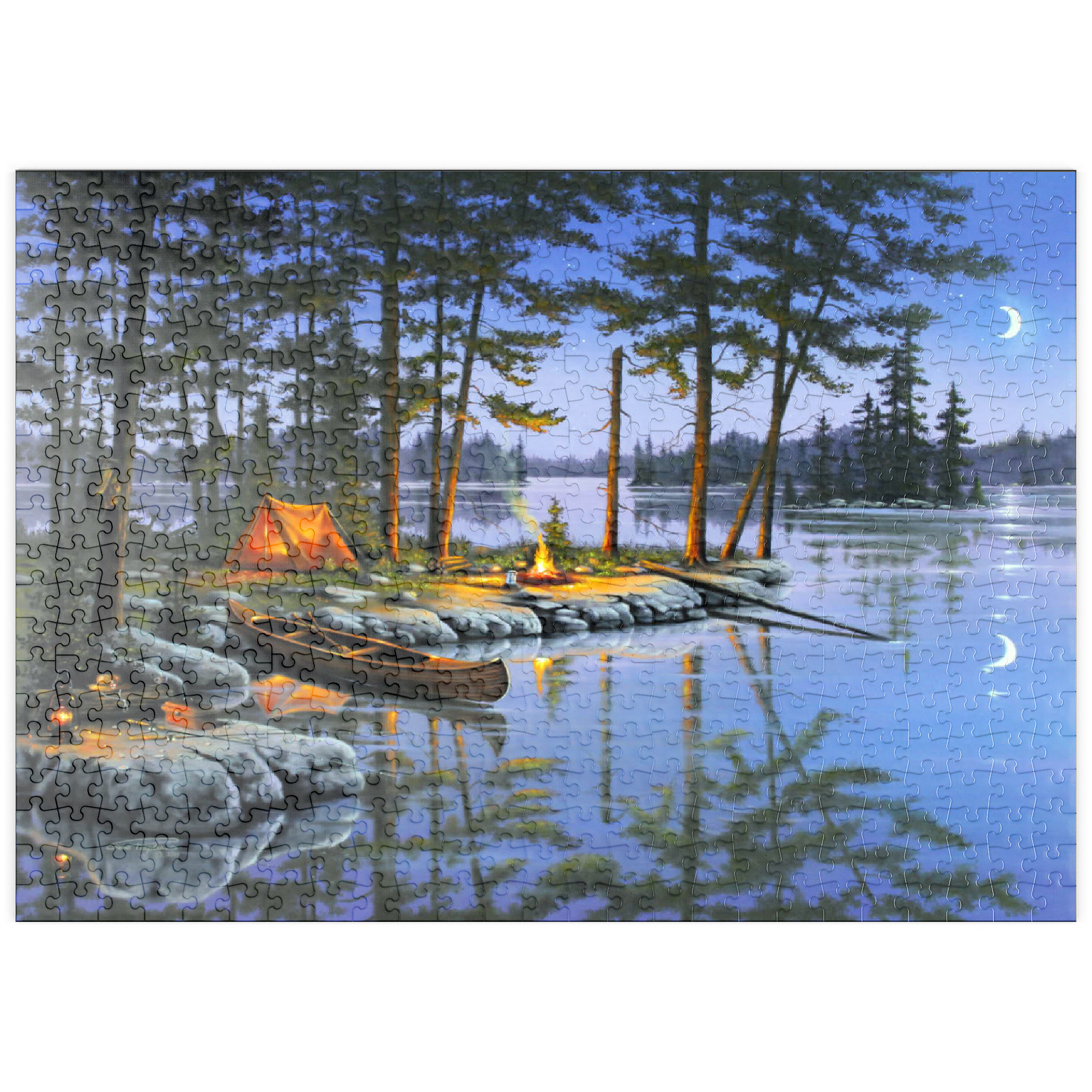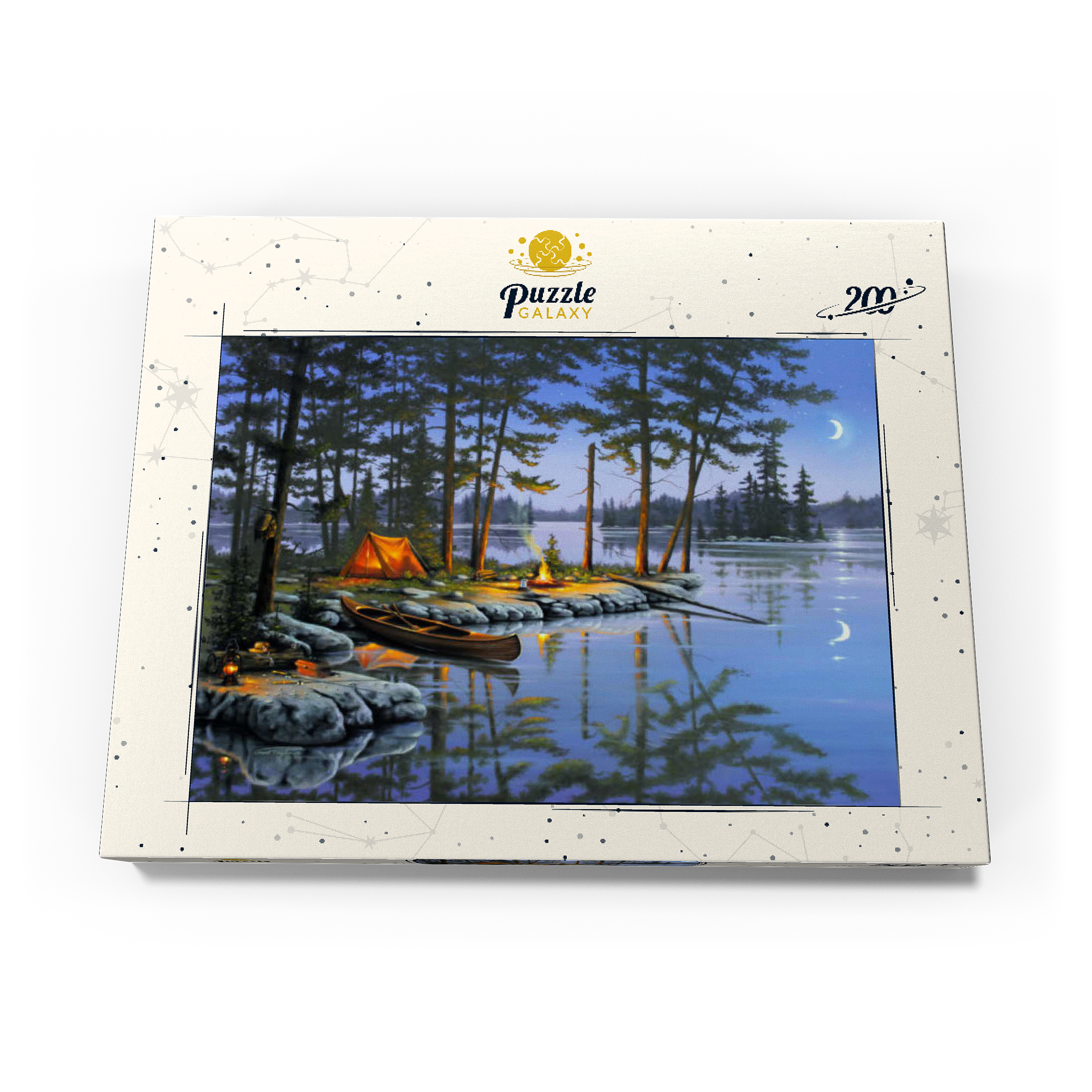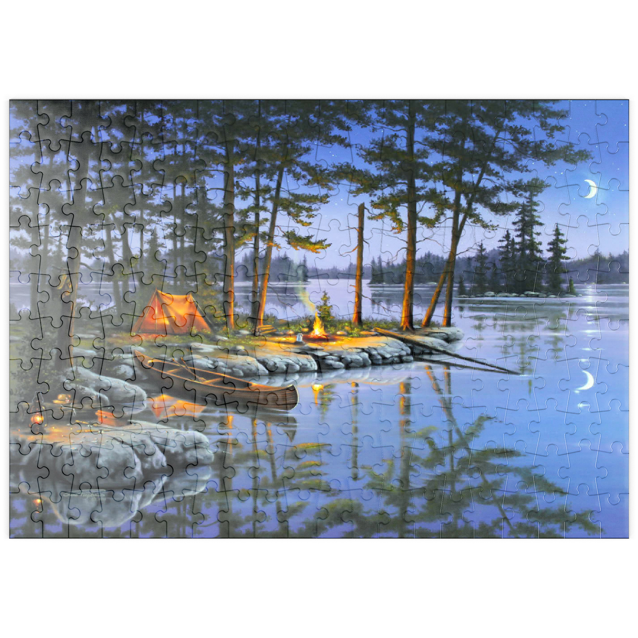 Eine ruhige Szene am See, die die Essenz des Campings im Freien einfängt. Das leuchtende Lagerfeuer wirft ein warmes Licht auf die umliegenden Kiefern und ein gemütliches orangefarbenes Zelt. Ein Holzkanu liegt am Ufer und spiegelt sich in der ruhigen Seeoberfläche. Angelausrüstung und Laternen tragen zum rustikalen Charme bei. Der Halbmond und der sternenklare Himmel schaffen eine friedliche Atmosphäre, während entfernte Inseln und hohe Kiefern die Schönheit dieses Rückzugsortes in der Wildnis unterstreichen.