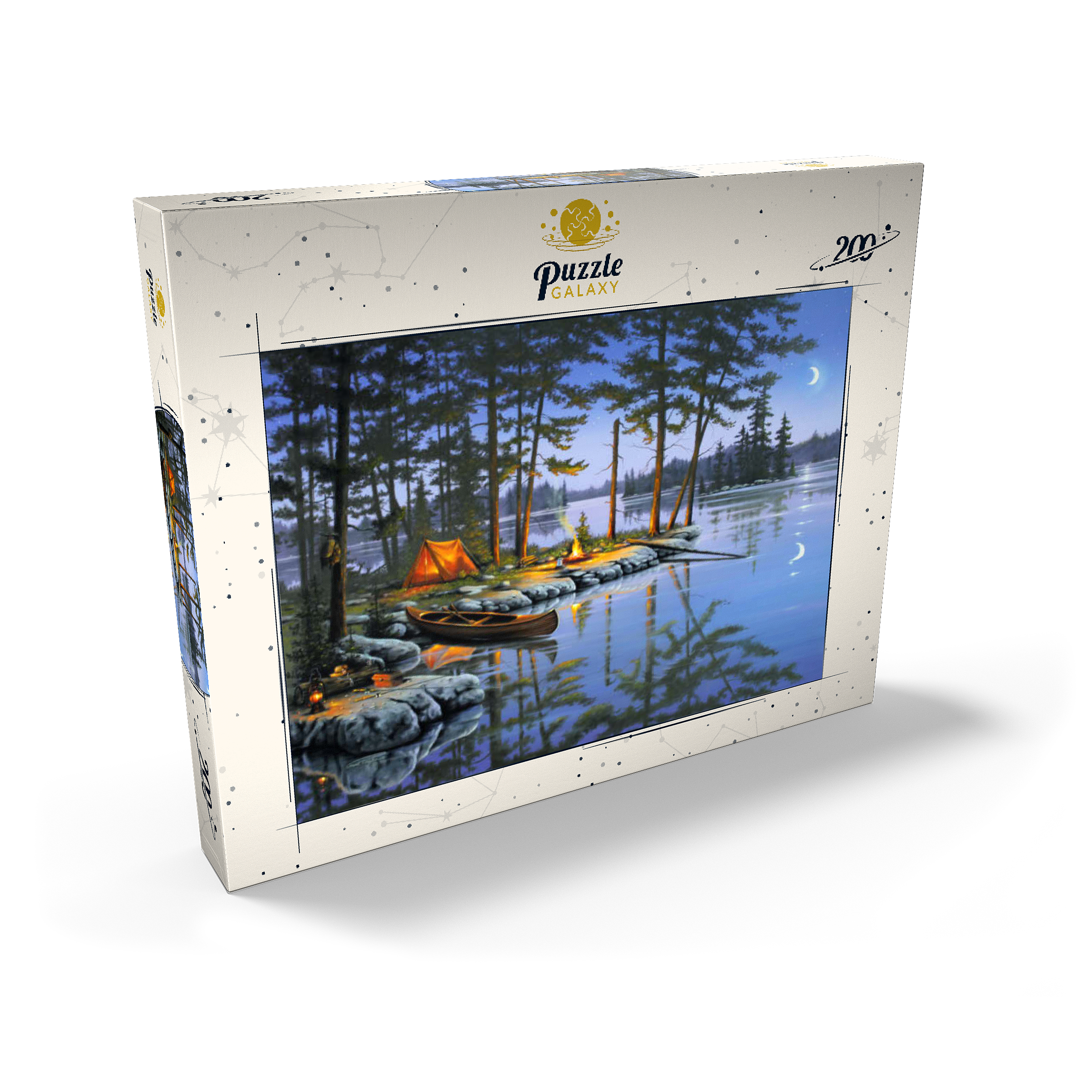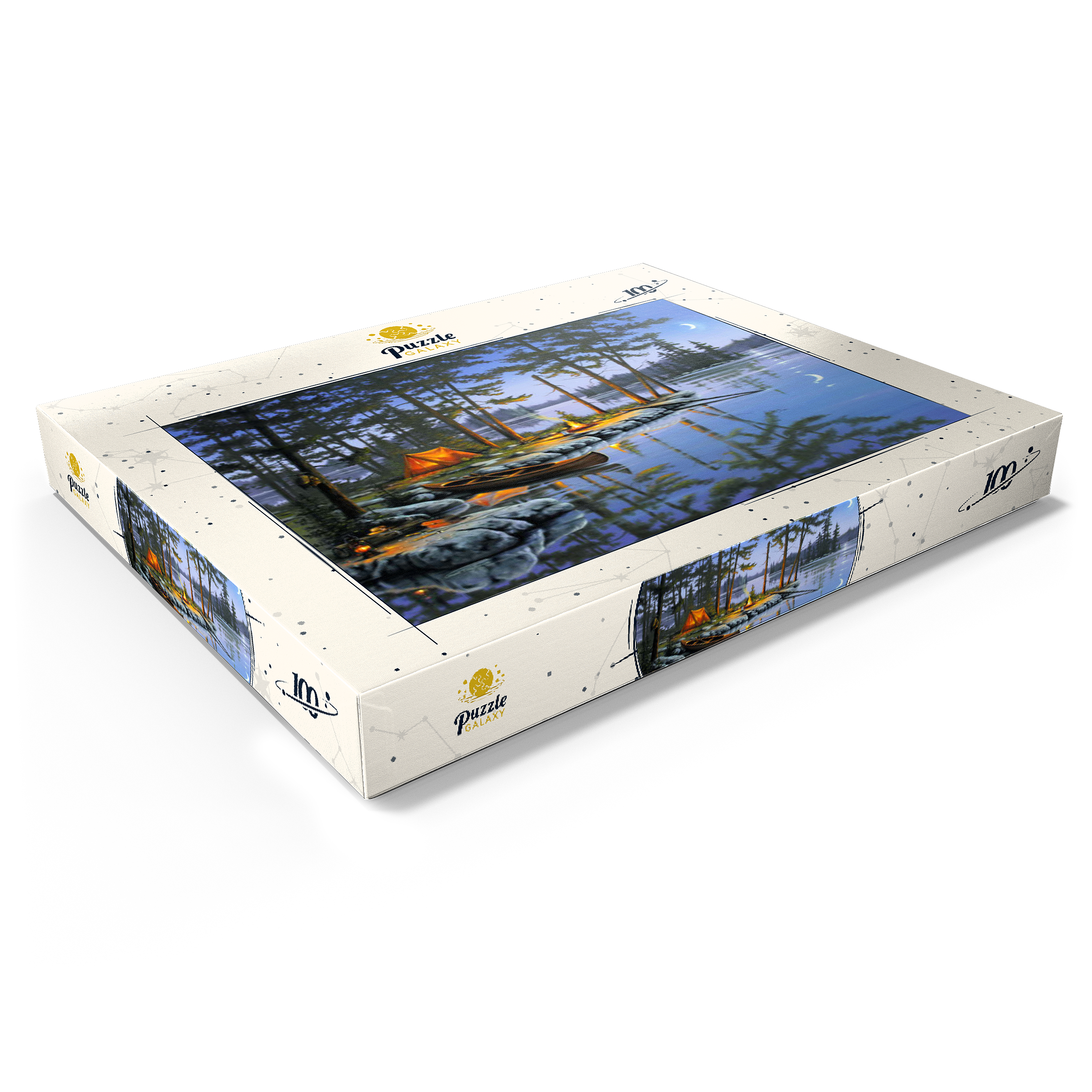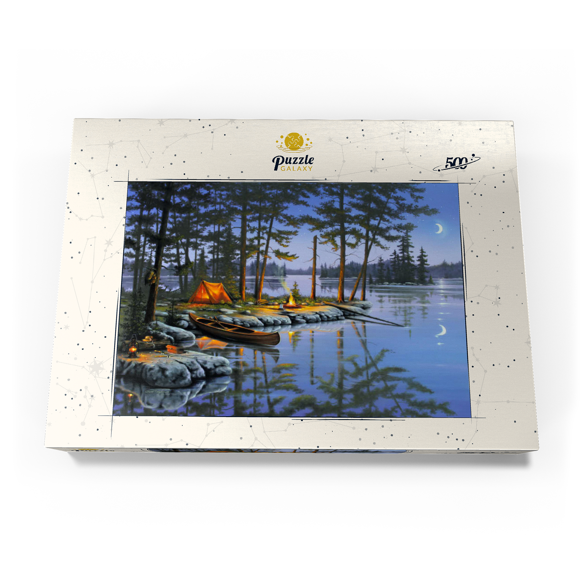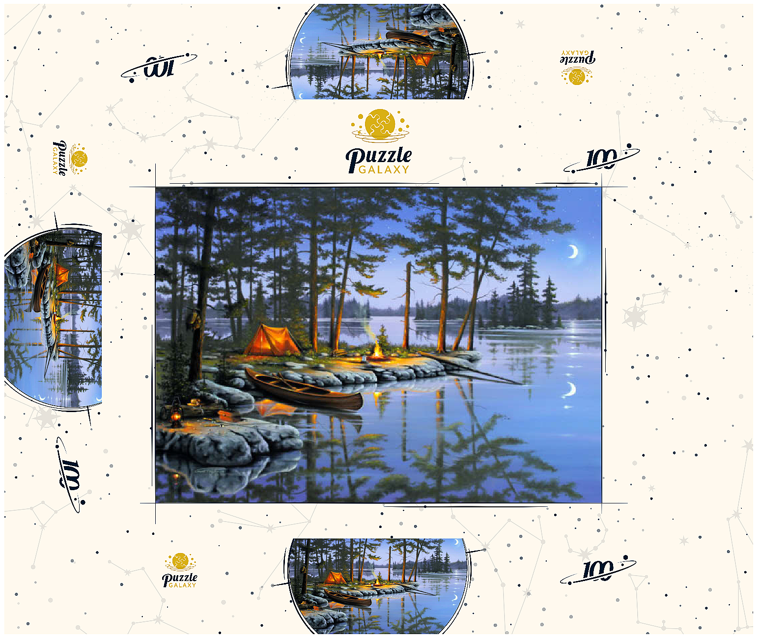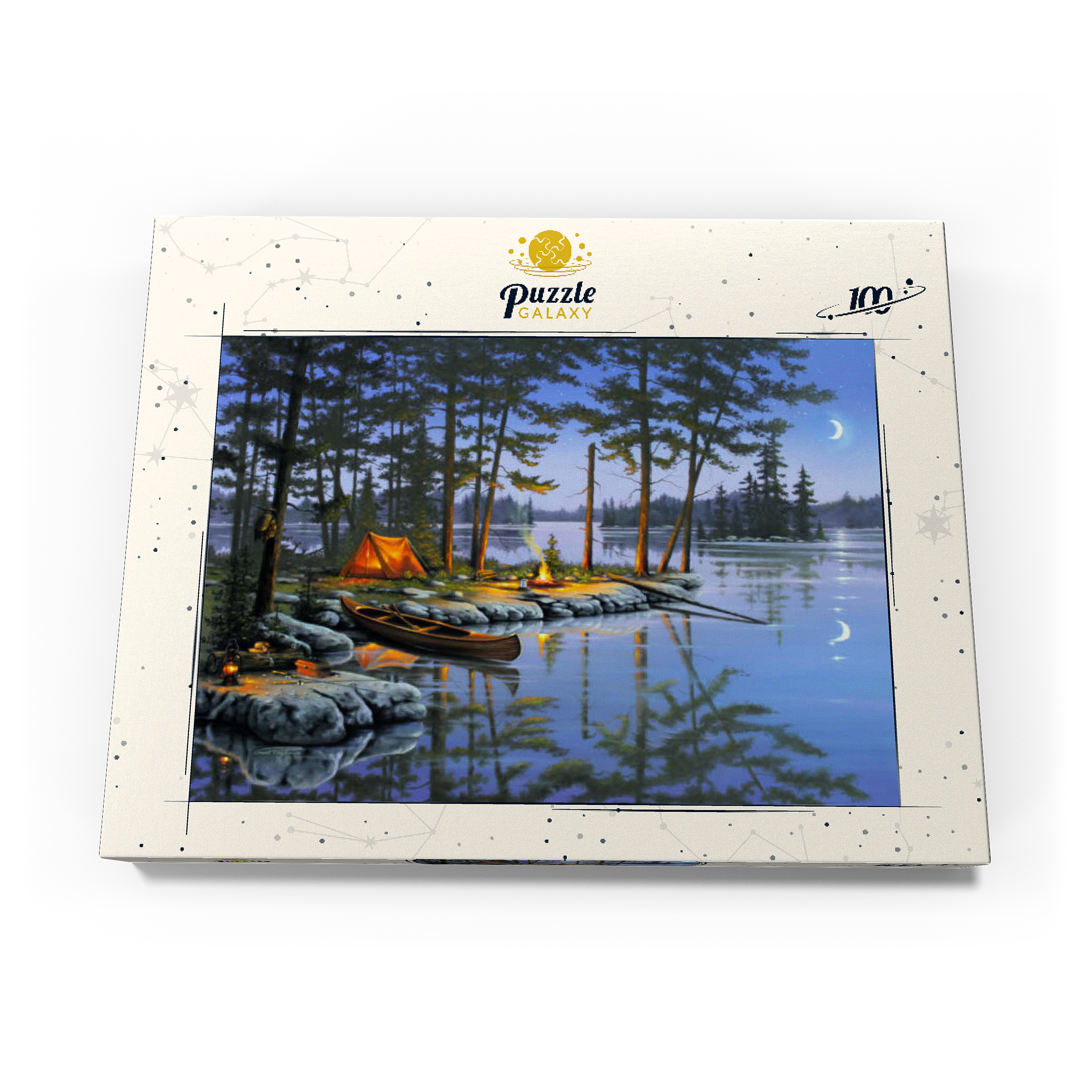 Eine ruhige Szene am See, die die Essenz des Campings im Freien einfängt. Das leuchtende Lagerfeuer wirft ein warmes Licht auf die umliegenden Kiefern und ein gemütliches orangefarbenes Zelt. Ein Holzkanu liegt am Ufer und spiegelt sich in der ruhigen Seeoberfläche. Angelausrüstung und Laternen tragen zum rustikalen Charme bei. Der Halbmond und der sternenklare Himmel schaffen eine friedliche Atmosphäre, während entfernte Inseln und hohe Kiefern die Schönheit dieses Rückzugsortes in der Wildnis unterstreichen.
