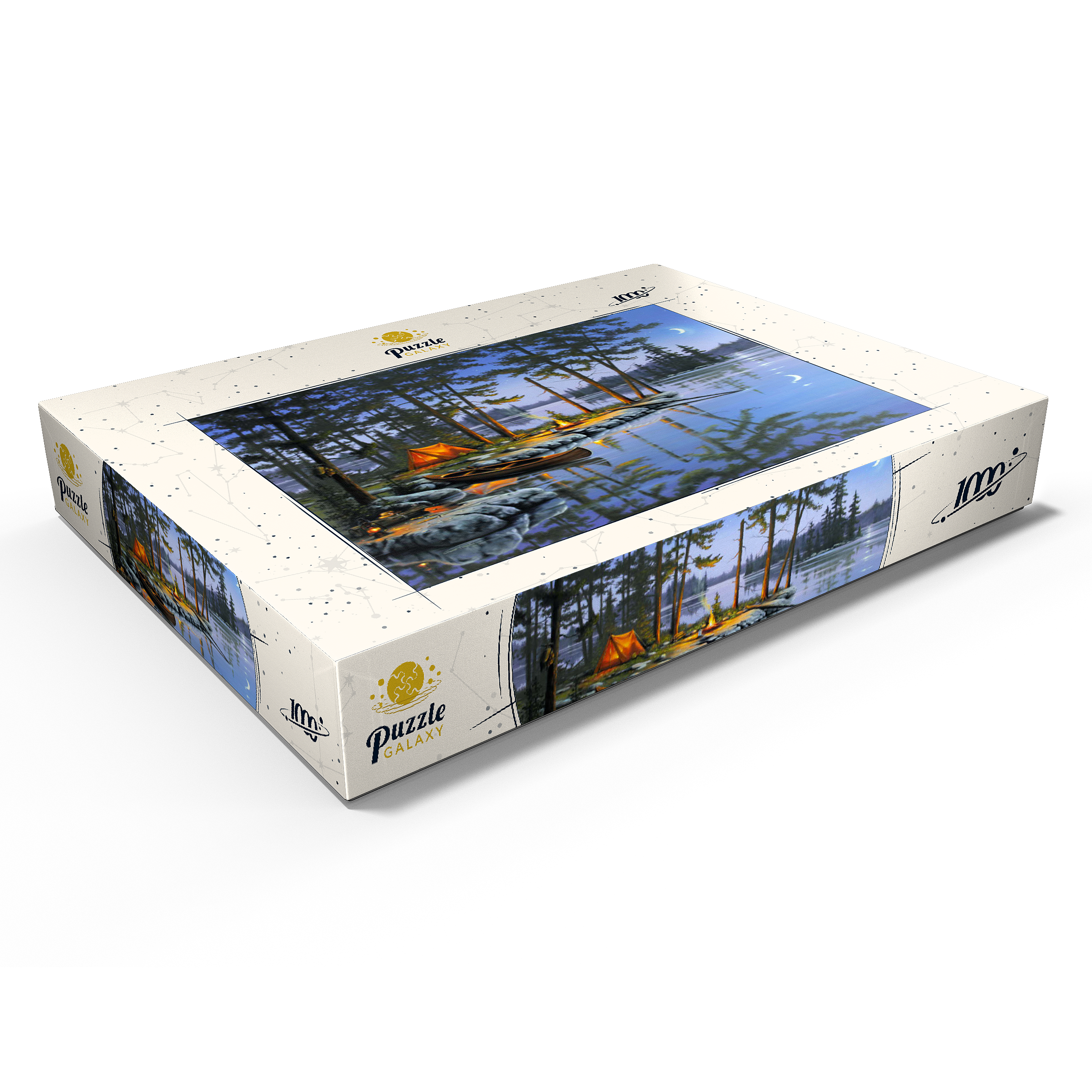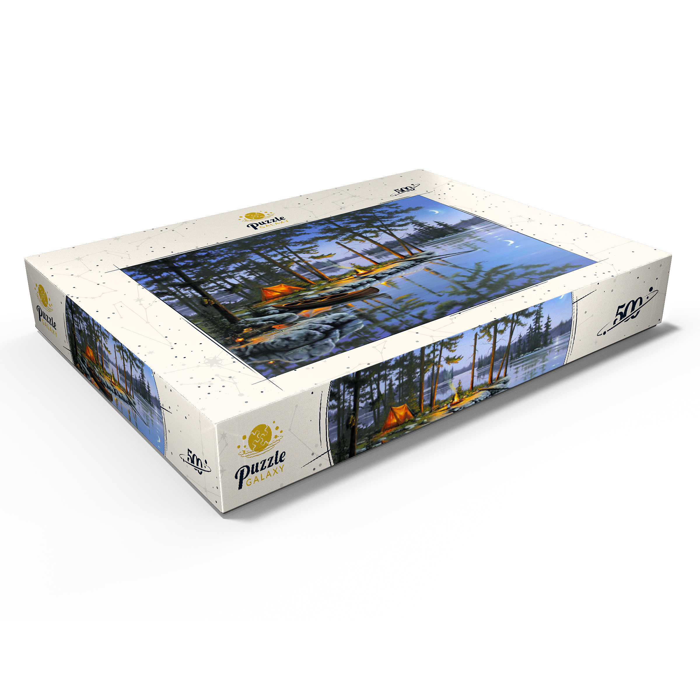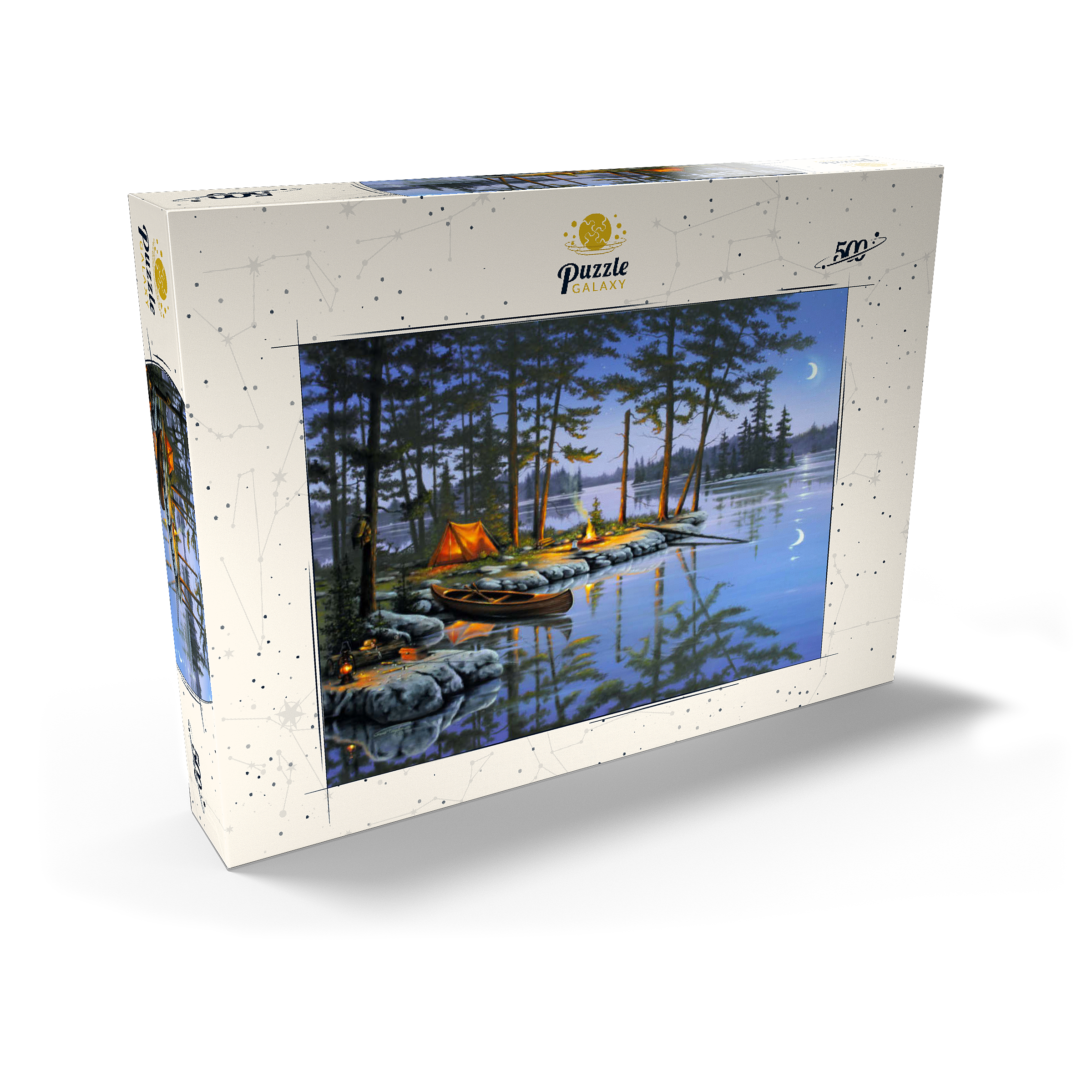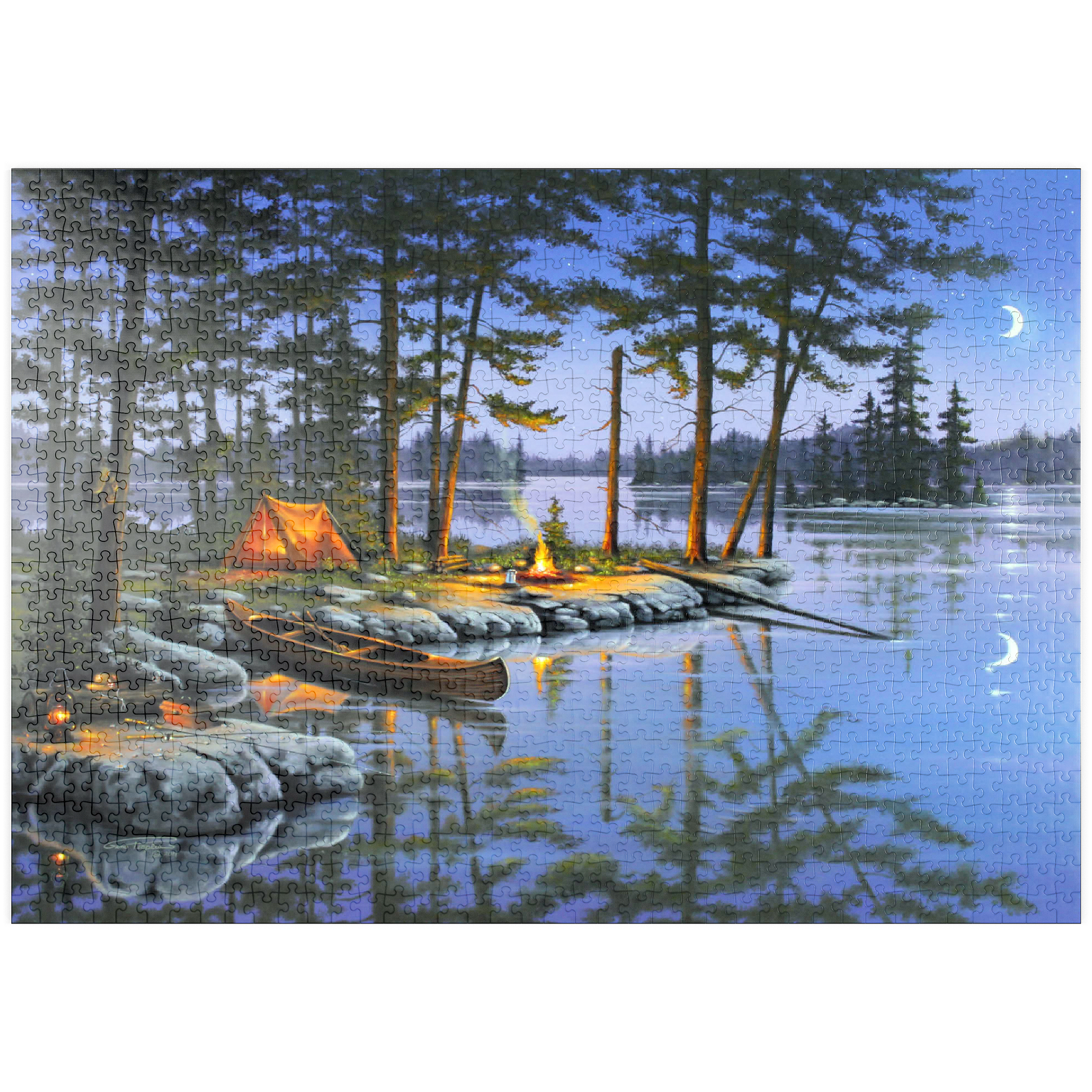Eine ruhige Szene am See, die die Essenz des Campings im Freien einfängt. Das leuchtende Lagerfeuer wirft ein warmes Licht auf die umliegenden Kiefern und ein gemütliches orangefarbenes Zelt. Ein Holzkanu liegt am Ufer und spiegelt sich in der ruhigen Seeoberfläche. Angelausrüstung und Laternen tragen zum rustikalen Charme bei. Der Halbmond und der sternenklare Himmel schaffen eine friedliche Atmosphäre, während entfernte Inseln und hohe Kiefern die Schönheit dieses Rückzugsortes in der Wildnis unterstreichen.