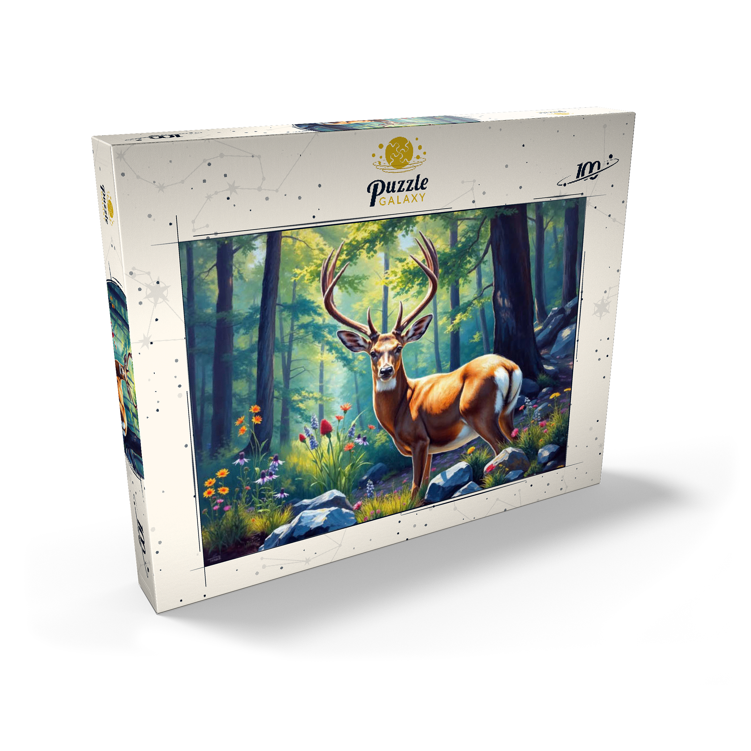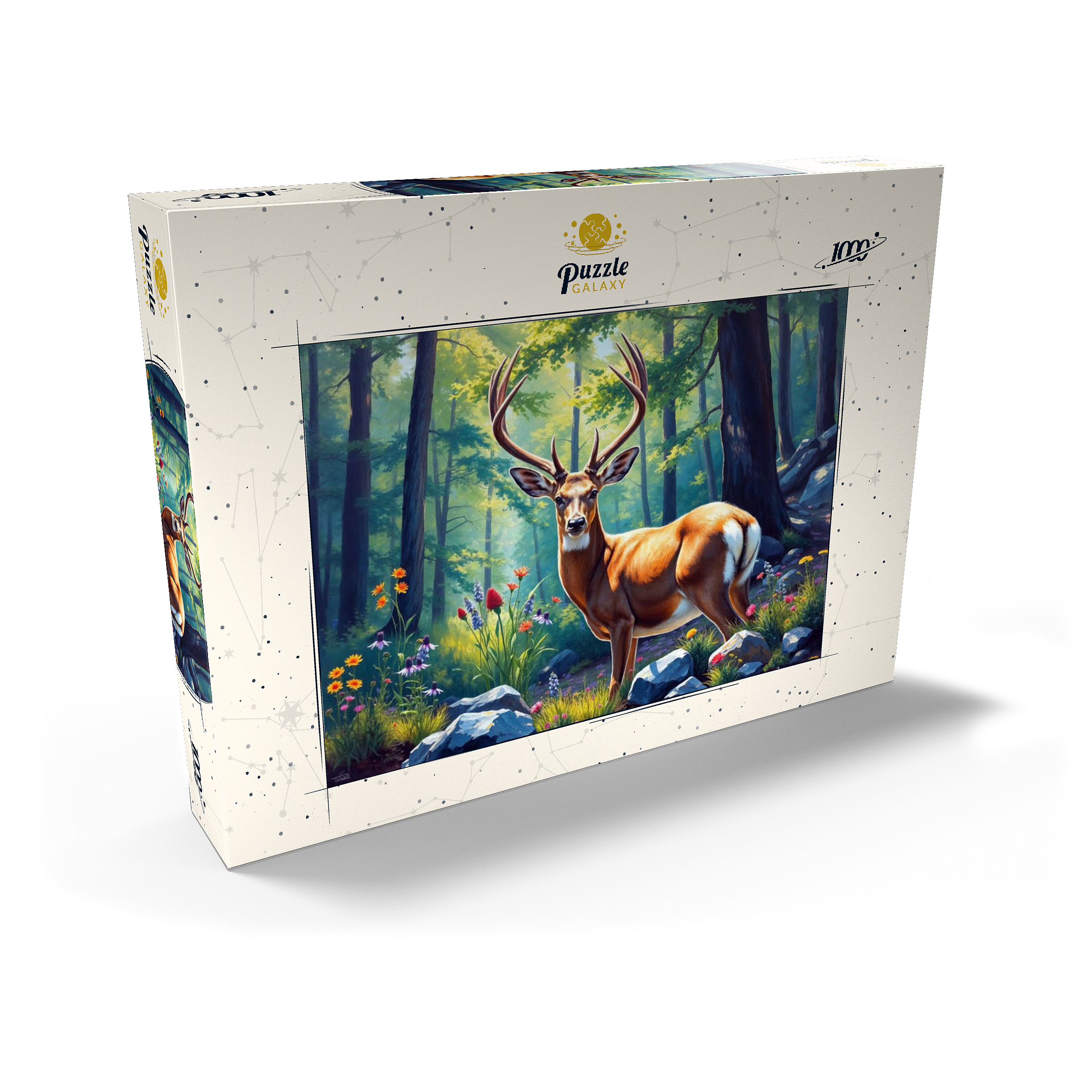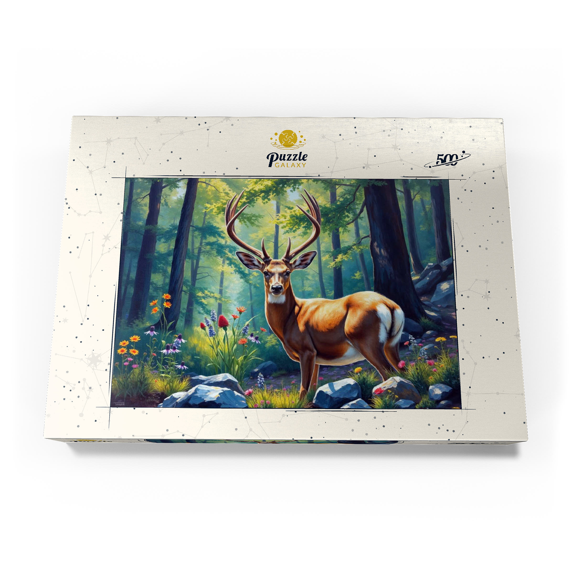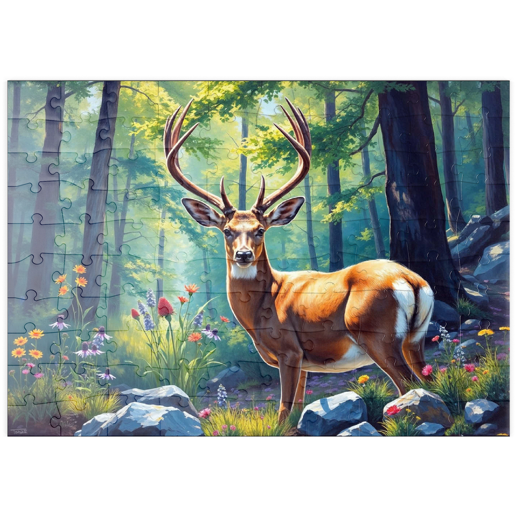 Majestätischer Hirsch in einem sonnenbeschienenen Wald mit Wildblumen
