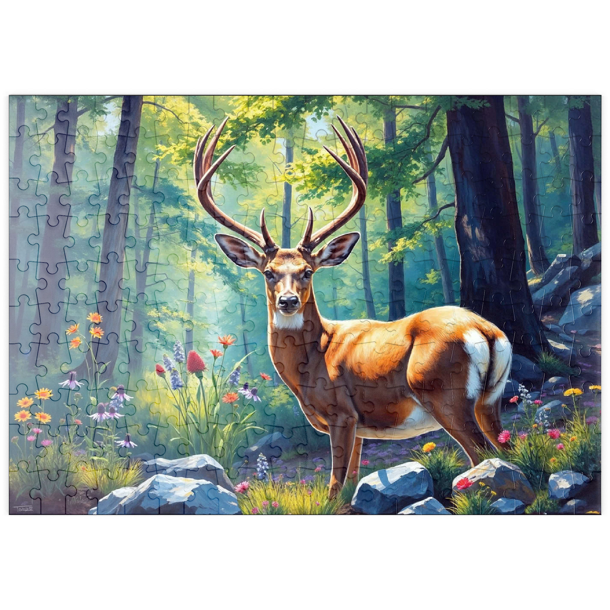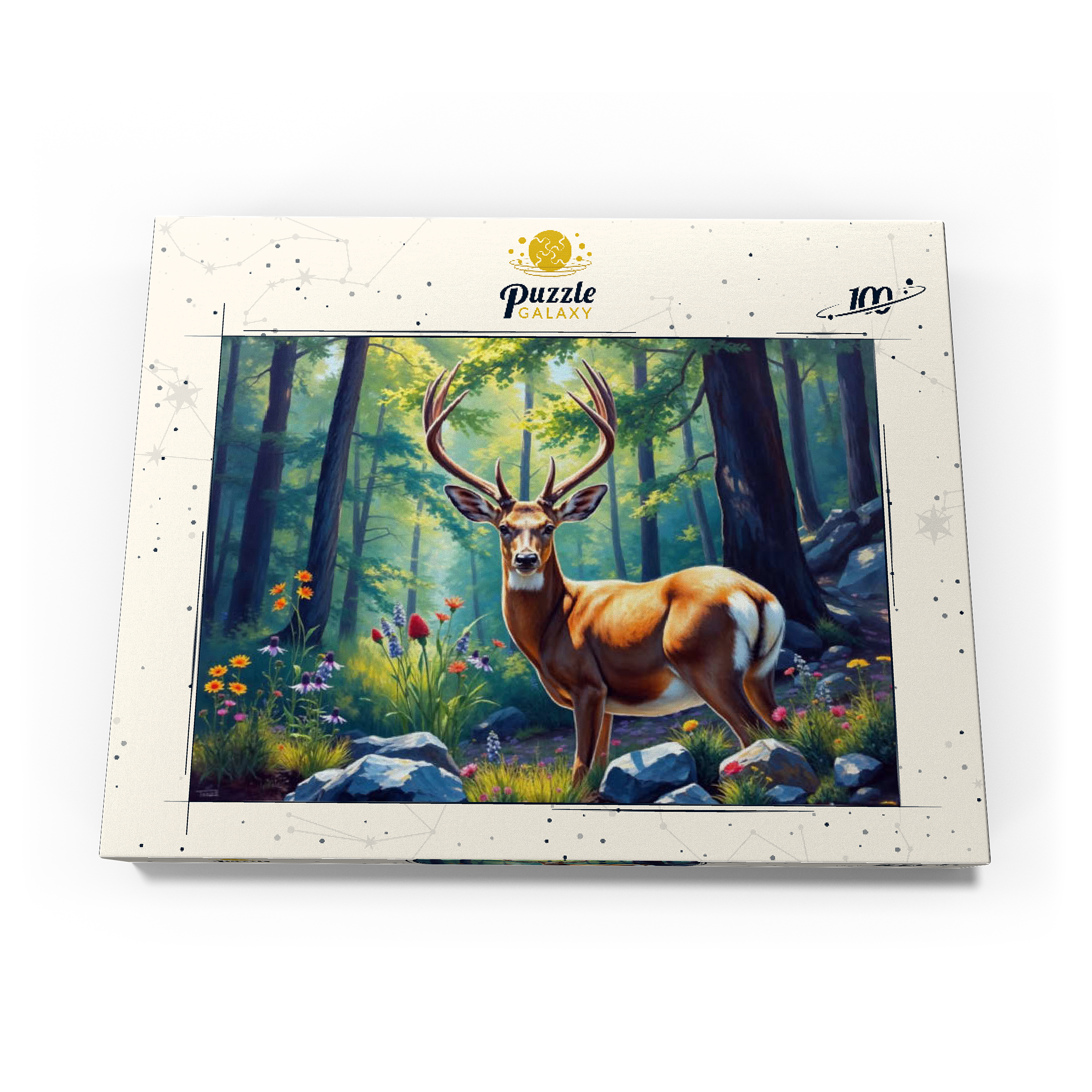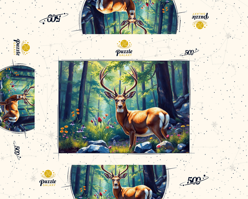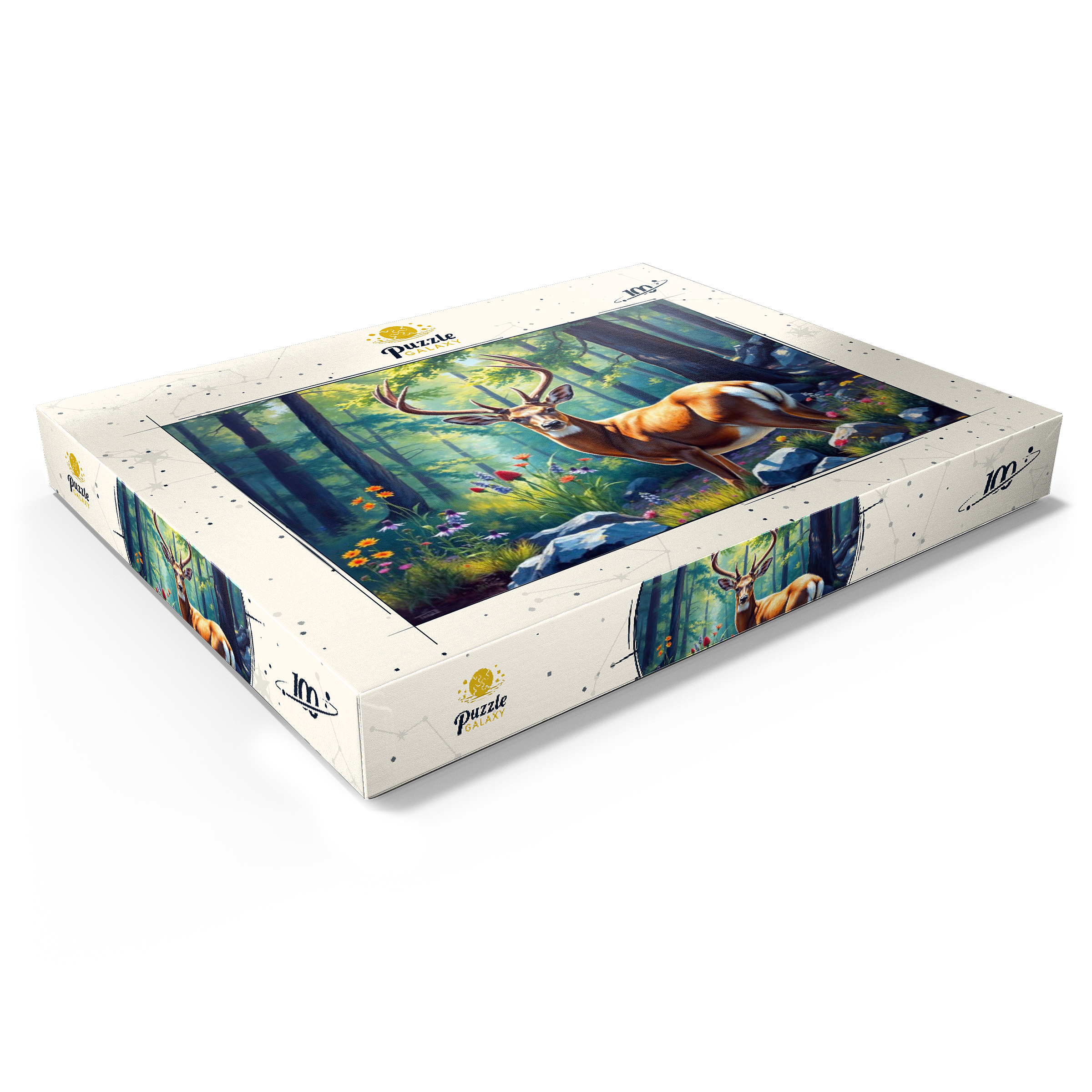 Majestätischer Hirsch in einem sonnenbeschienenen Wald mit Wildblumen