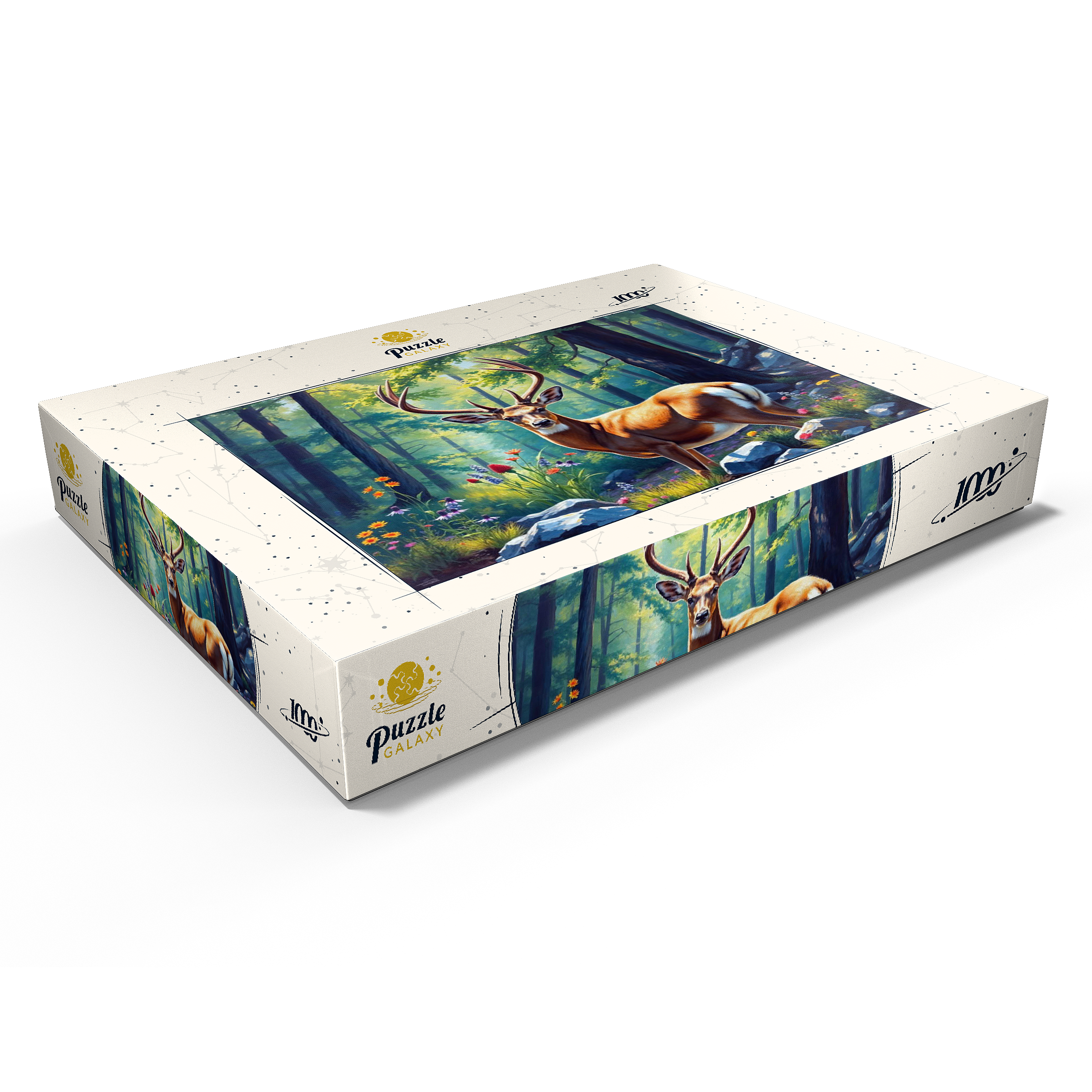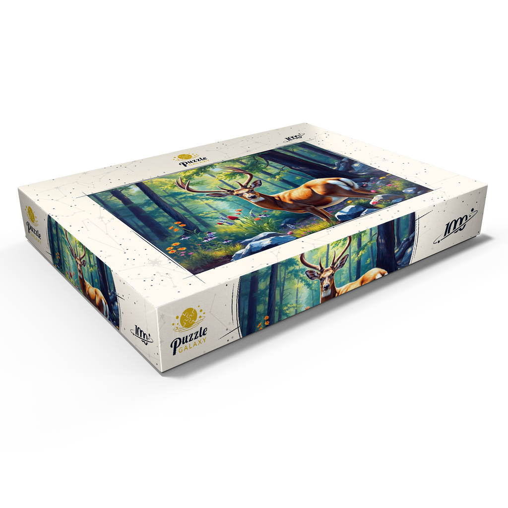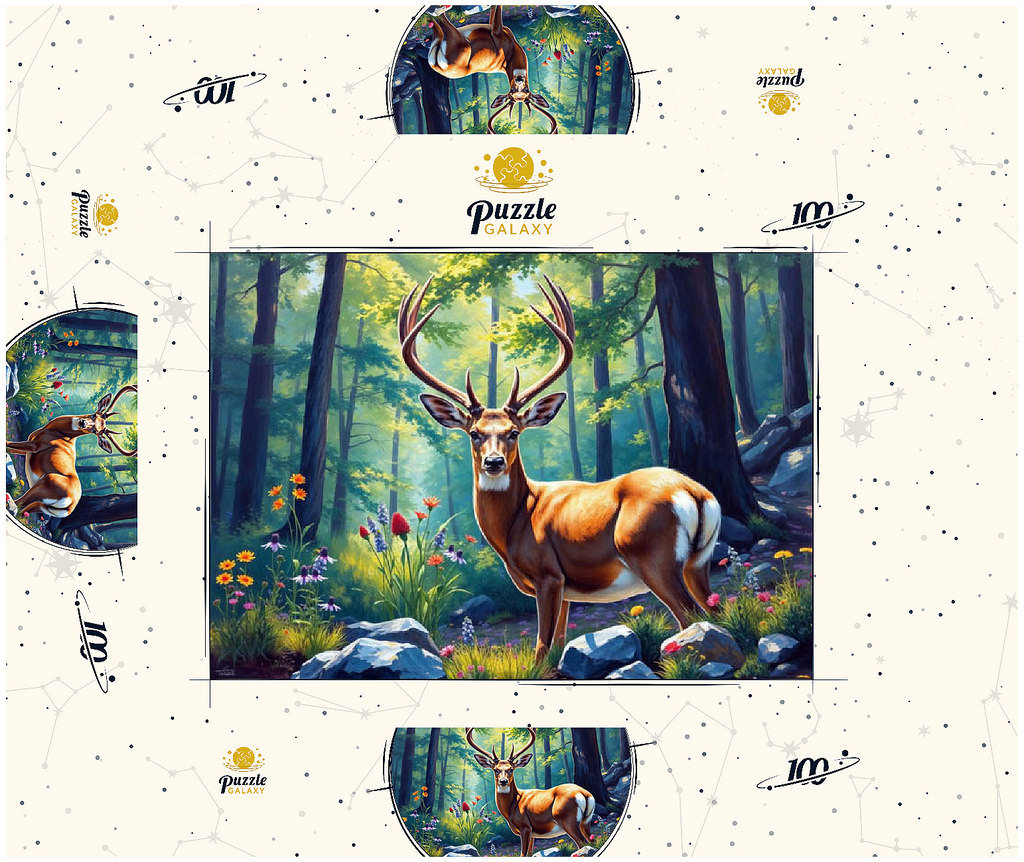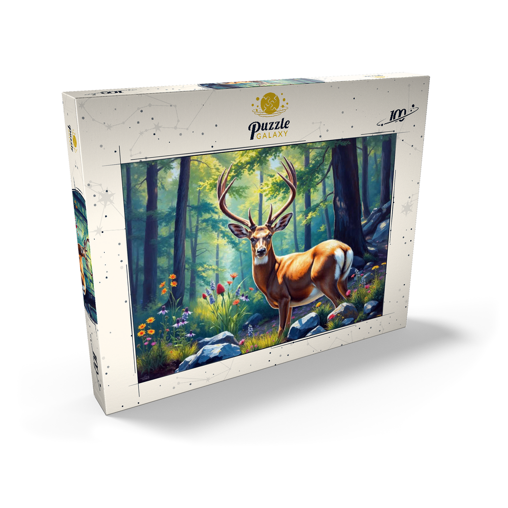 Majestätischer Hirsch in einem sonnenbeschienenen Wald mit Wildblumen