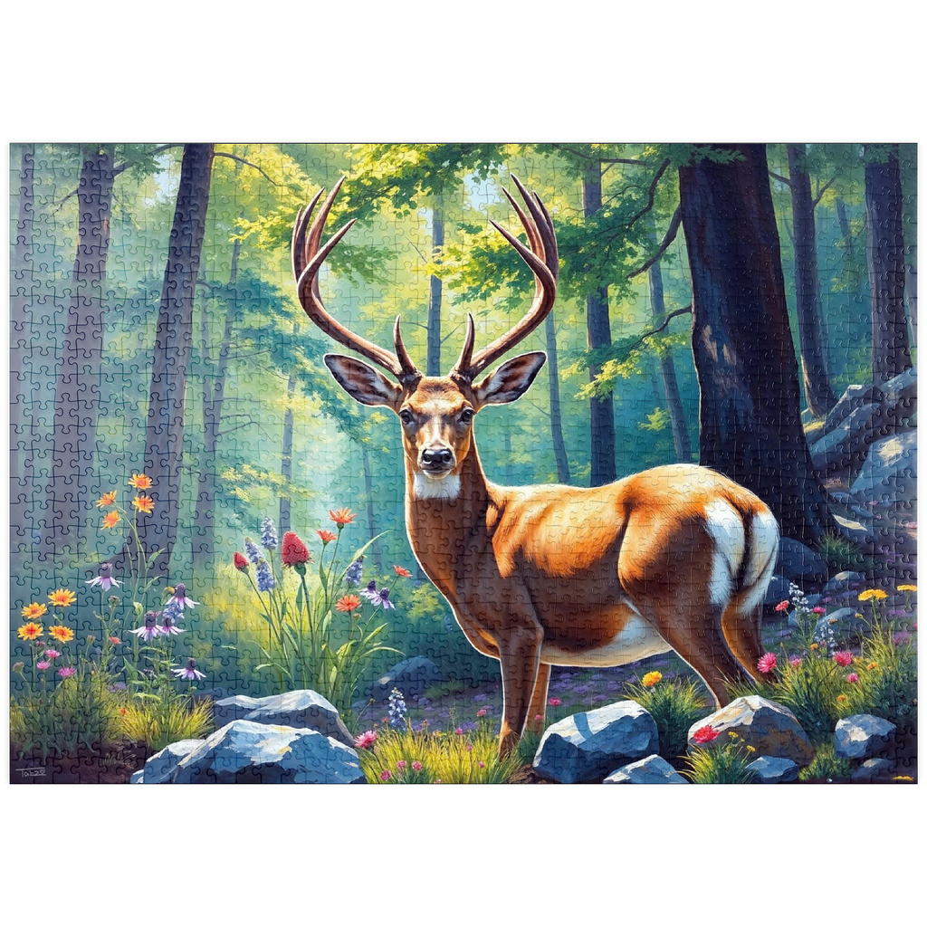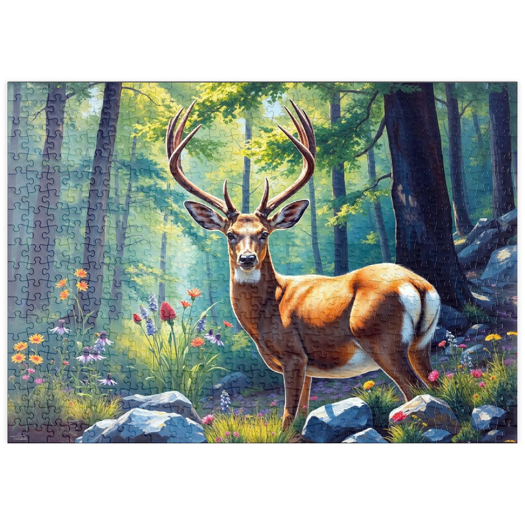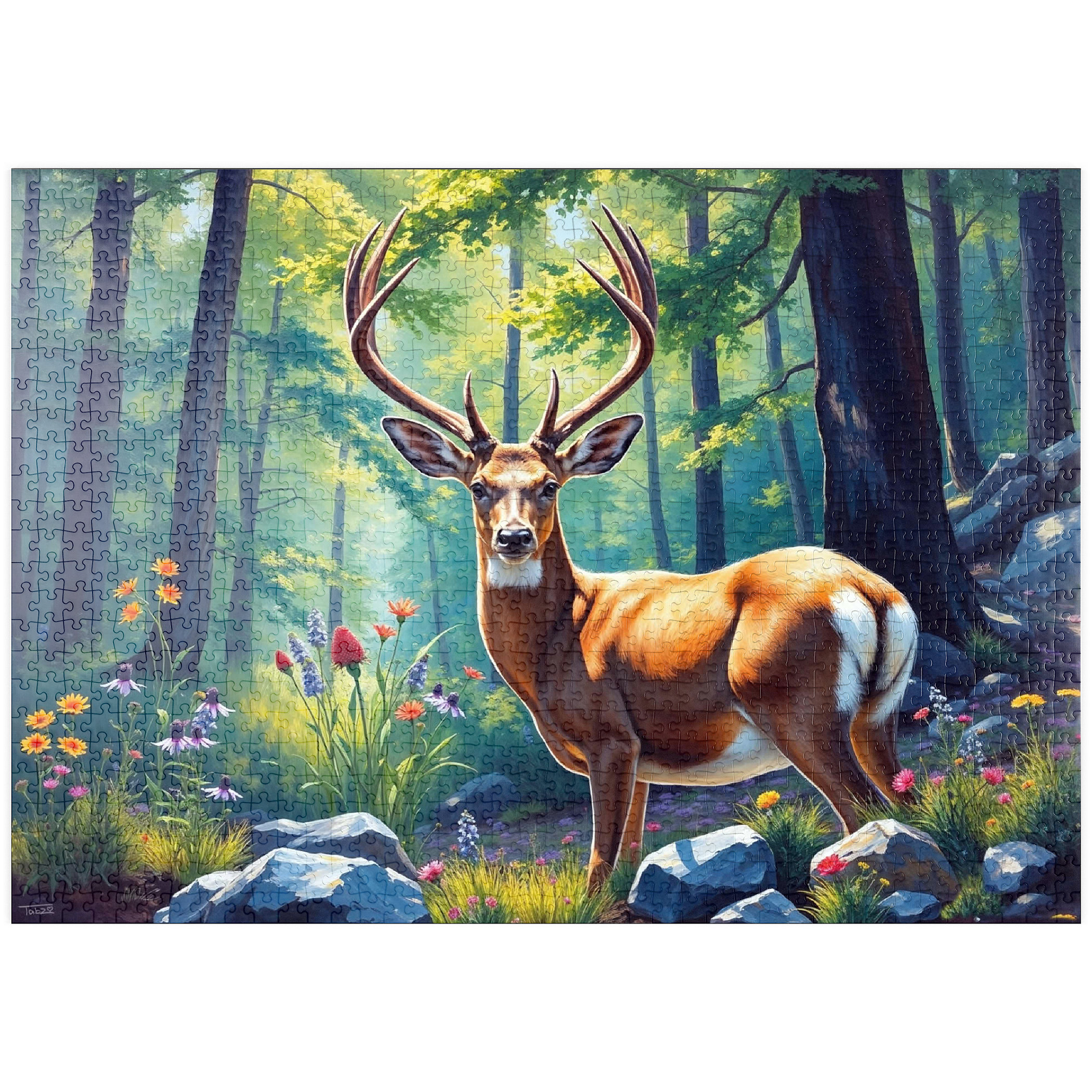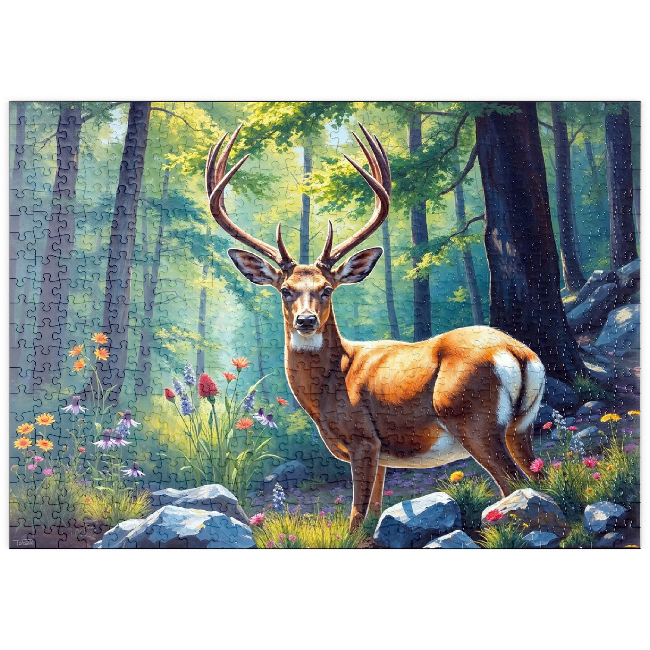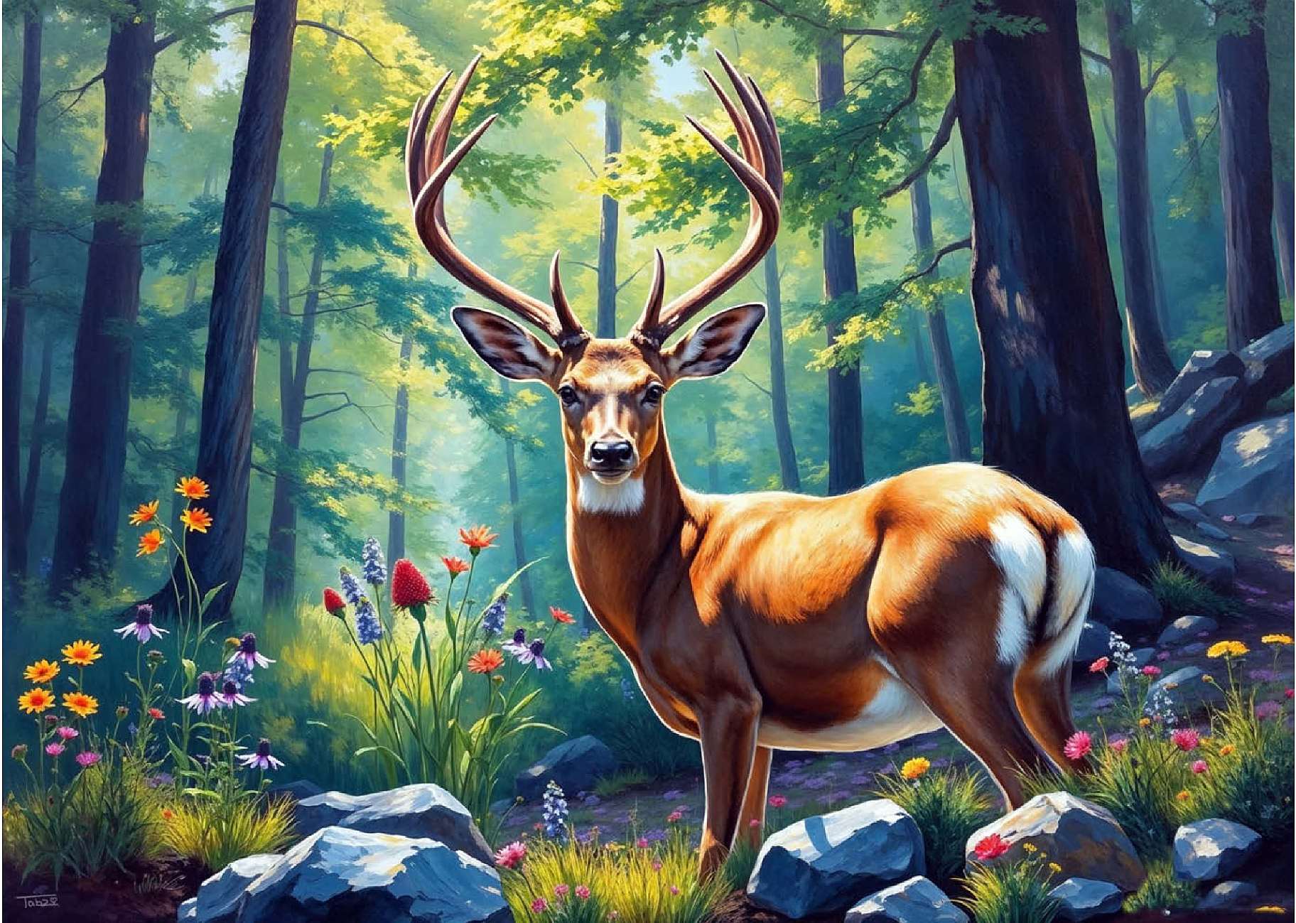 Ein atemberaubendes digitales Kunstwerk, das einen majestätischen Hirsch zeigt, der anmutig in einer sonnenbeschienenen Waldlichtung steht, umgeben von leuchtenden Wildblumen. Das Sonnenlicht fällt durch die hohen Bäume und taucht das satte Braun des Fells des Hirsches in einen goldenen Schimmer, der sein beeindruckendes Geweih hervorhebt. Die Szene wird durch bunte Blüten wie Gänseblümchen, Sonnenhut und Lupinen verziert, die einen Hauch von natürlicher Schönheit verleihen. Die friedliche Waldatmosphäre vermittelt ein Gefühl von Ruhe und Staunen. Perfekt für Tierliebhaber, Naturfreunde und alle, die auf der Suche nach faszinierender Waldkunst für ihre Wohnungseinrichtung oder rustikal gestaltete Räume sind.