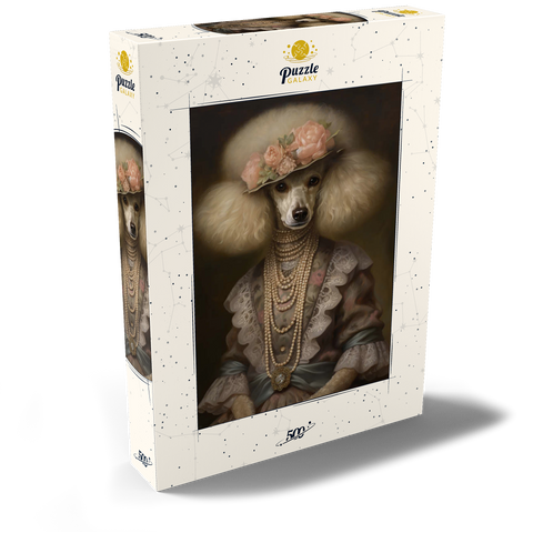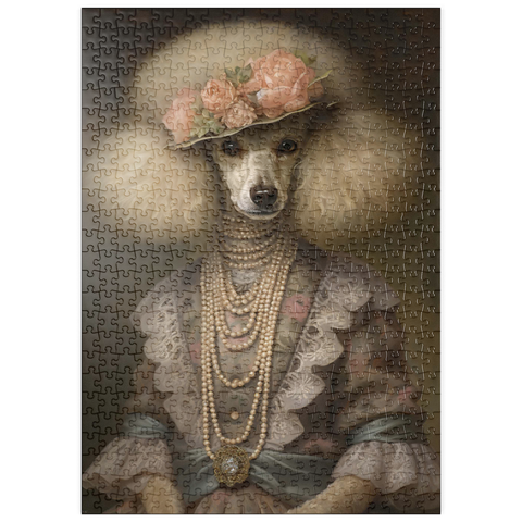 Dieses atemberaubende Kunstwerk zeigt einen königlichen Pudel in luxuriöser viktorianischer Kleidung, die Raffinesse und Adel verkörpert. Das detaillierte Porträt zeigt den Pudel mit einer opulenten Perlenkette, einem spitzenbesetzten Kleid und einem geblümten Hut, der aristokratische Eleganz ausstrahlt. Mit einer reichen klassischen Farbpalette und meisterhaftem Realismus versprüht dieses Stück einen altmodischen Charme, der an die Porträts europäischer Könige erinnert. Perfekt für Liebhaber von barocker, historischer und skurriler Tierkunst.