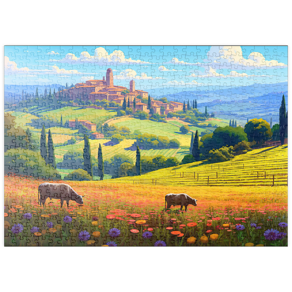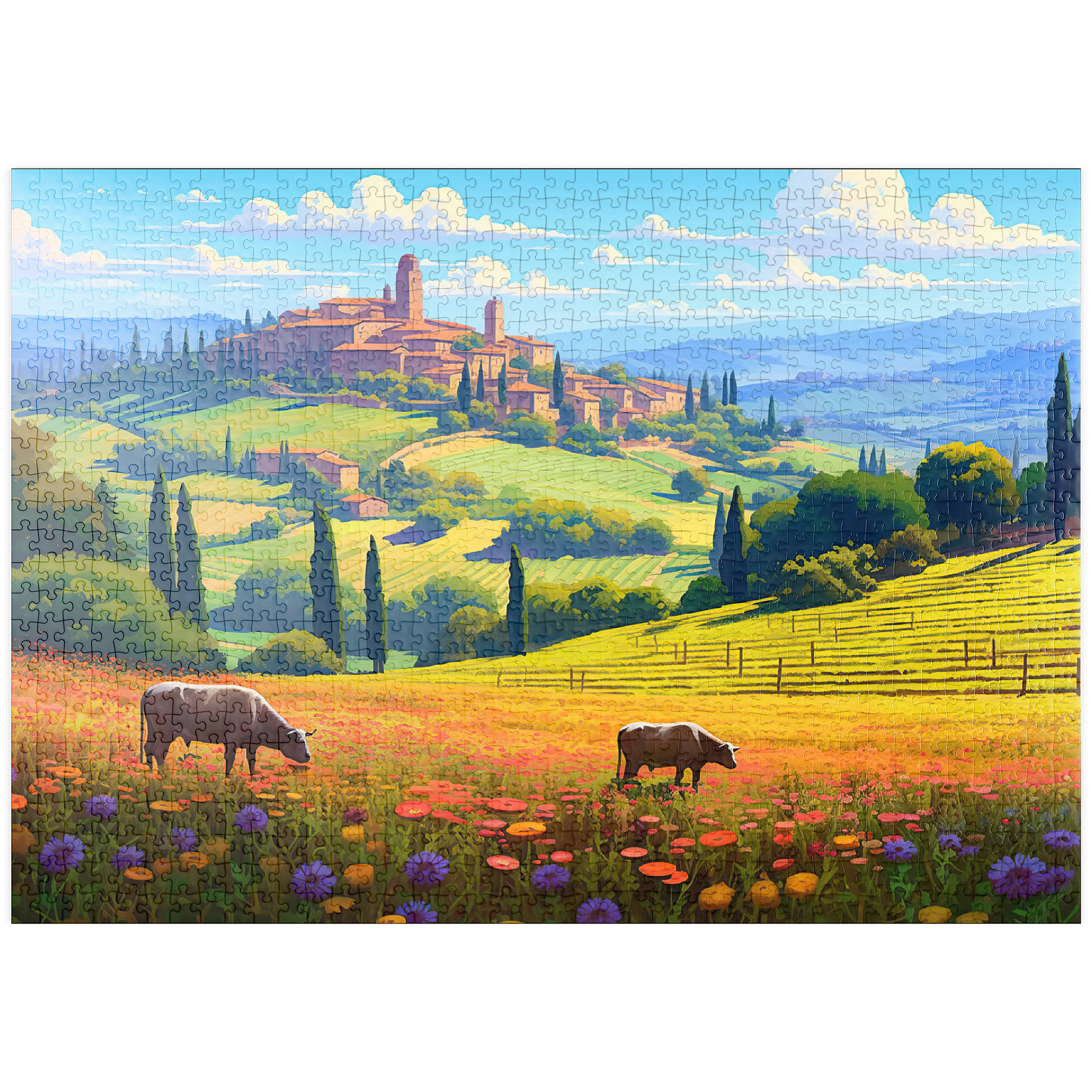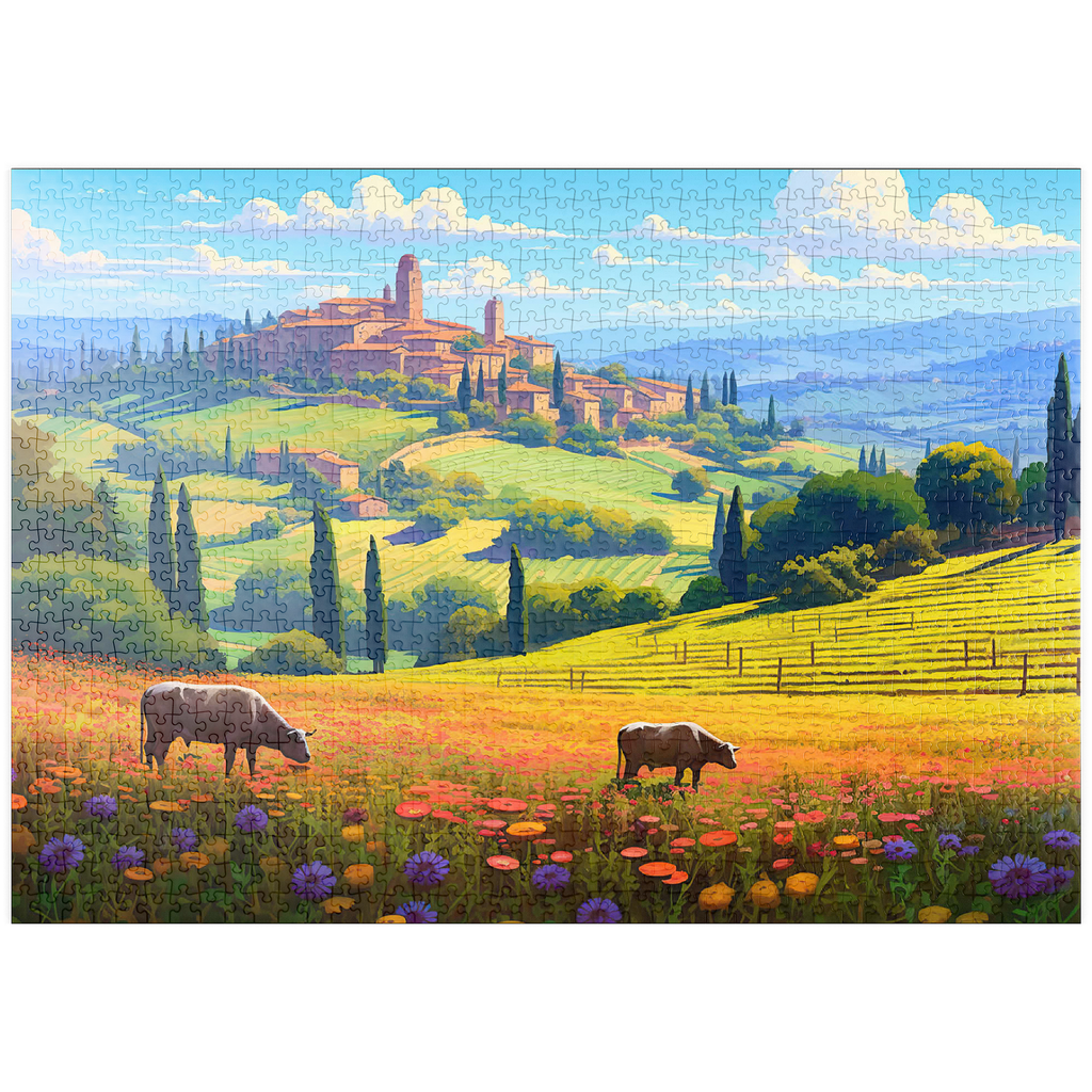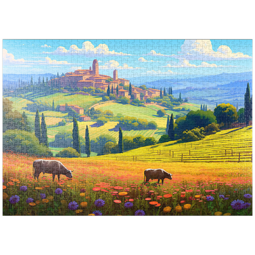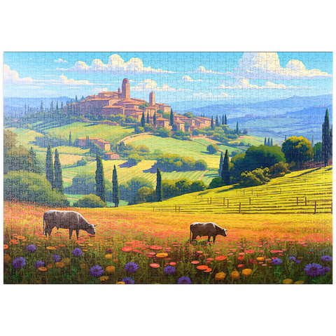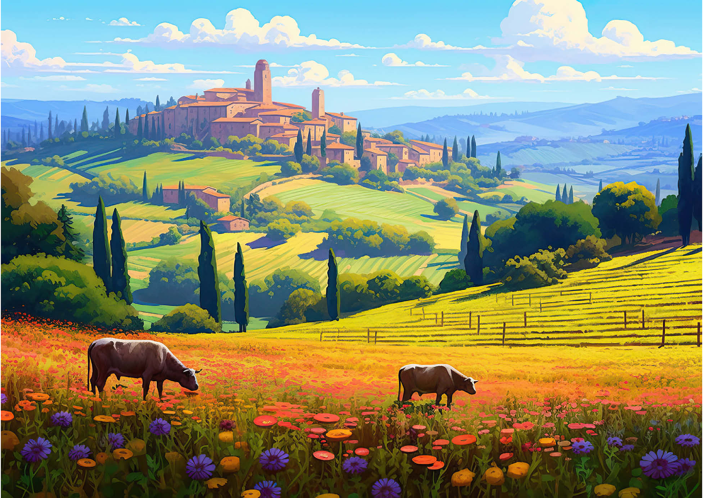 Dieser atemberaubende Blick auf die toskanische Landschaft zeigt eine lebendige Wiese voller bunter Wildblumen und grasender Kühe unter einem strahlenden Himmel. Sanfte grüne Hügel mit Zypressen führen zu einem charmanten Dorf auf einem Hügel mit rustikalen Steinhäusern, die in warmes Sonnenlicht getaucht sind. Der Flickenteppich aus Feldern und Weinbergen bildet eine heitere und malerische Kulisse, die an die zeitlose Schönheit und pastorale Ruhe der Toskana erinnert.