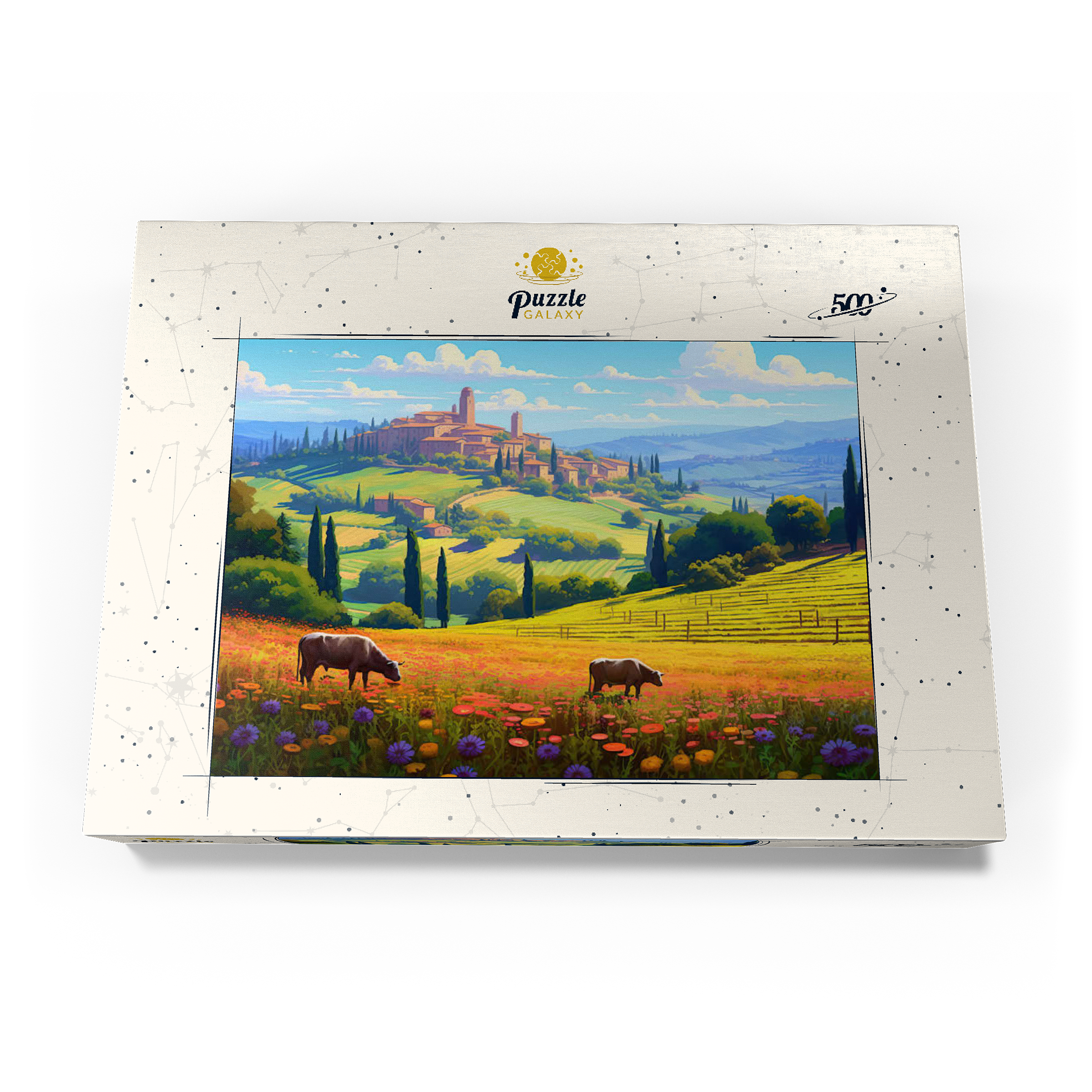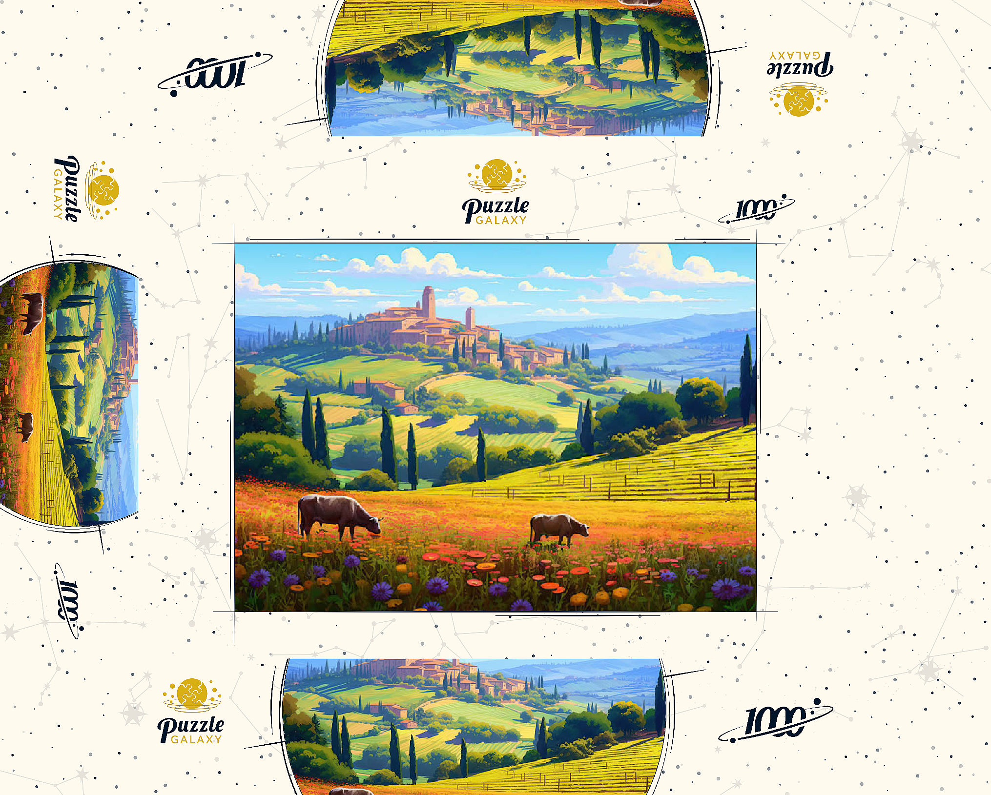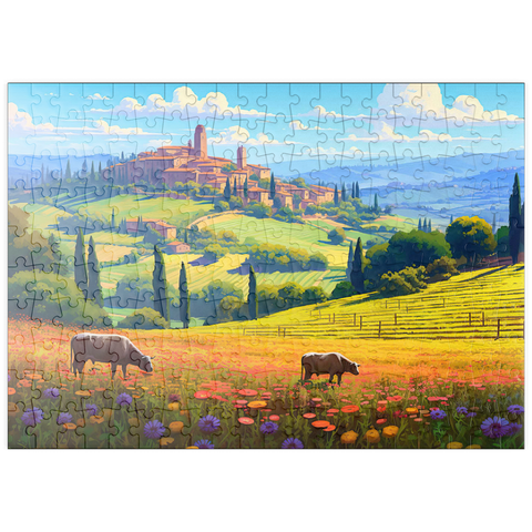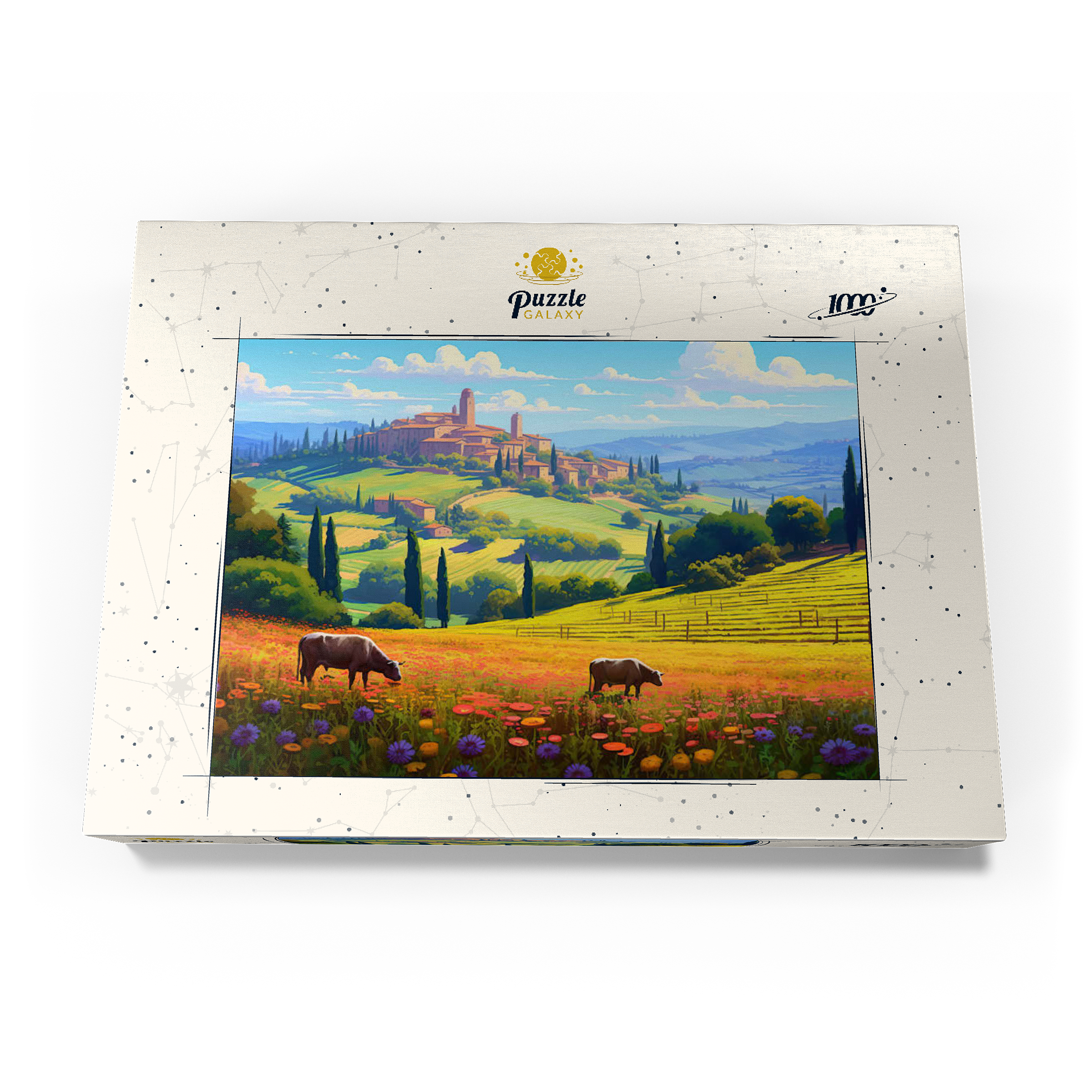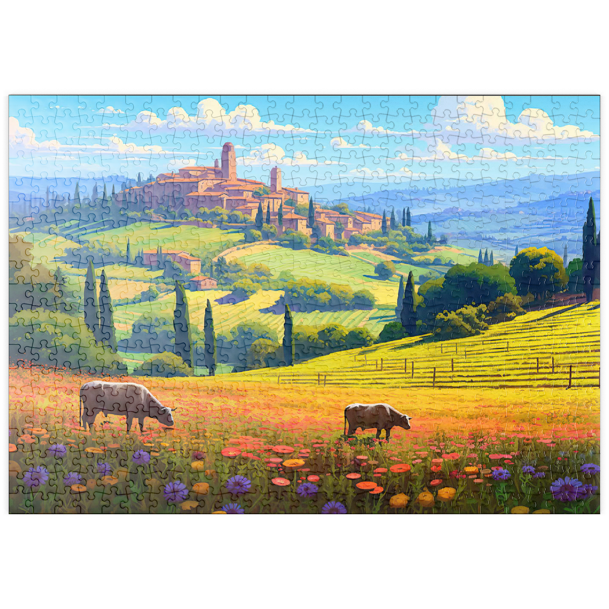 Dieser atemberaubende Blick auf die toskanische Landschaft zeigt eine lebendige Wiese voller bunter Wildblumen und grasender Kühe unter einem strahlenden Himmel. Sanfte grüne Hügel mit Zypressen führen zu einem charmanten Dorf auf einem Hügel mit rustikalen Steinhäusern, die in warmes Sonnenlicht getaucht sind. Der Flickenteppich aus Feldern und Weinbergen bildet eine heitere und malerische Kulisse, die an die zeitlose Schönheit und pastorale Ruhe der Toskana erinnert.
