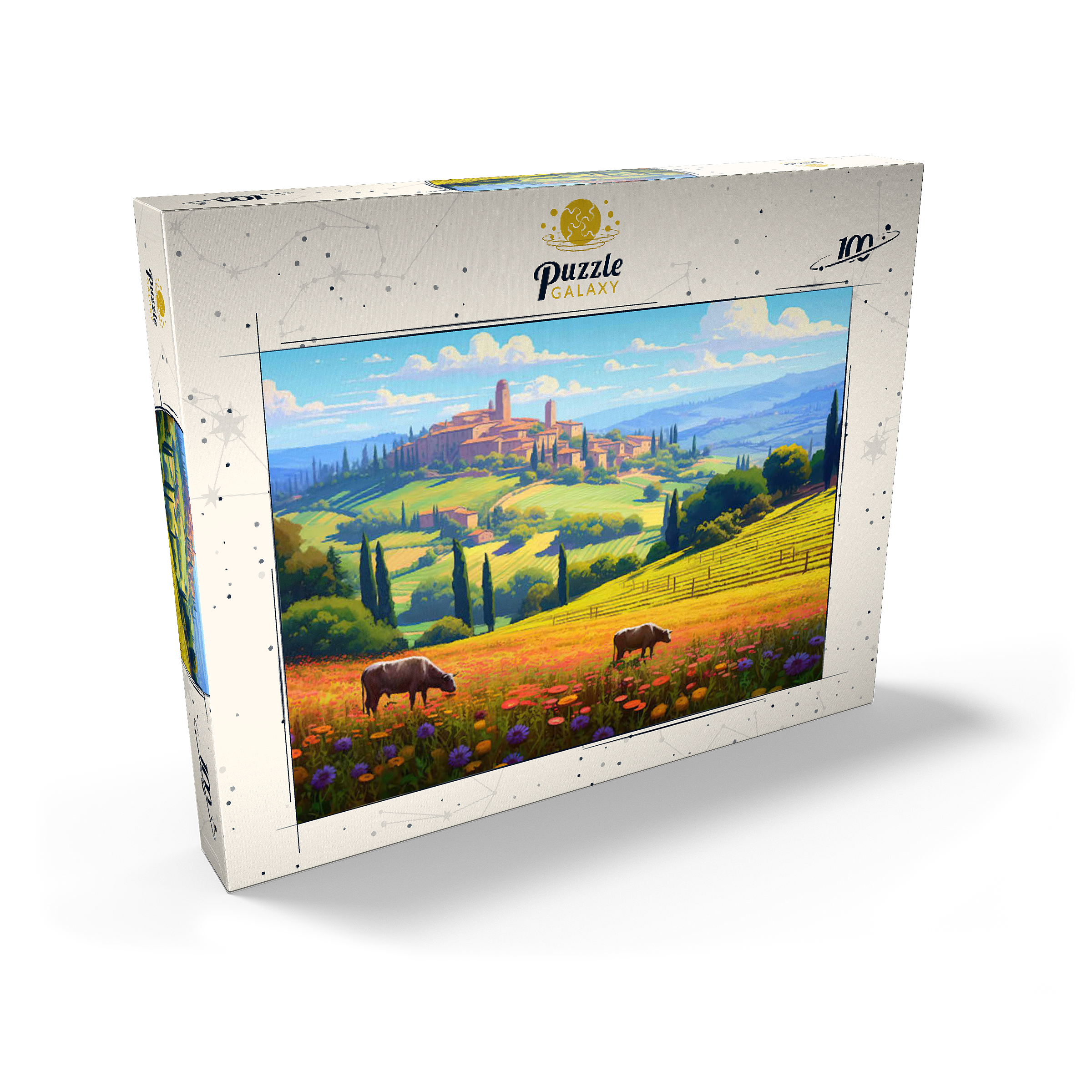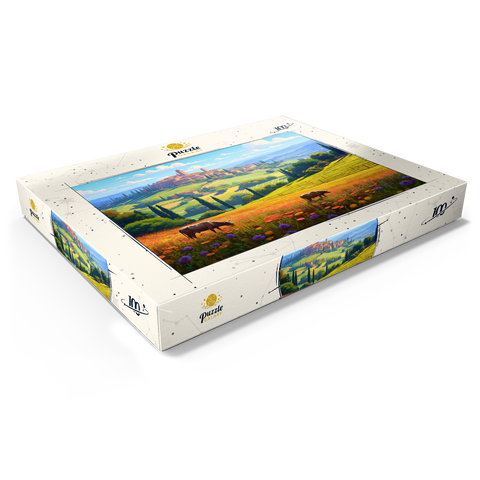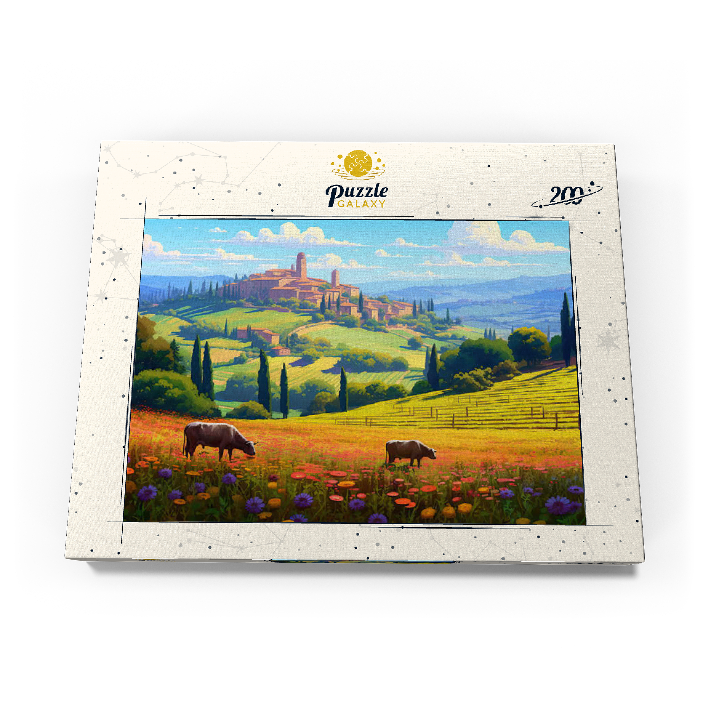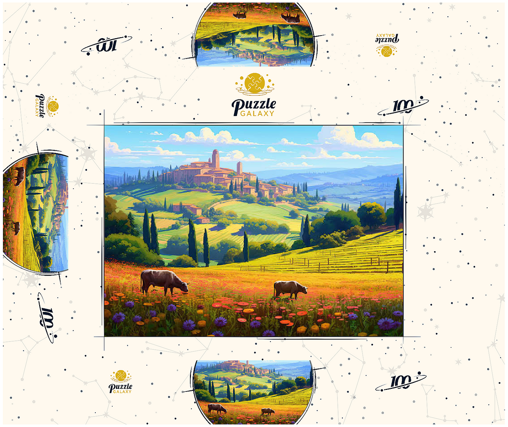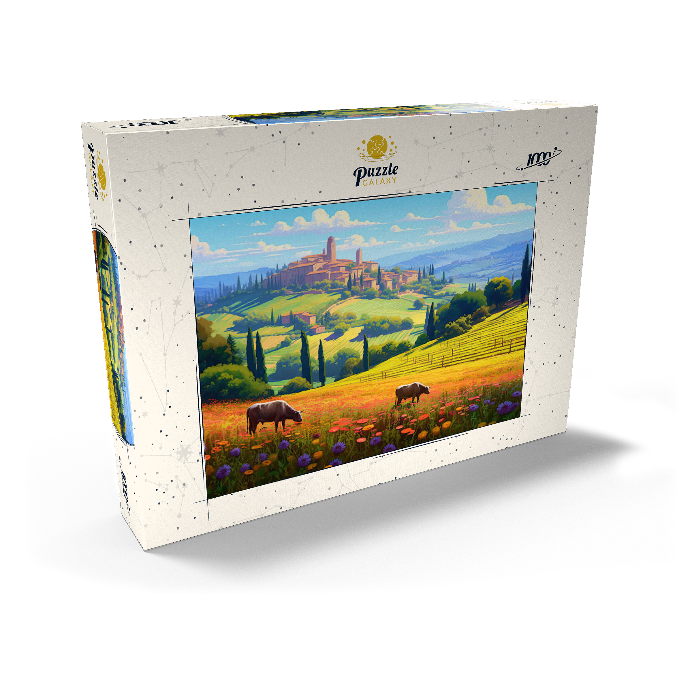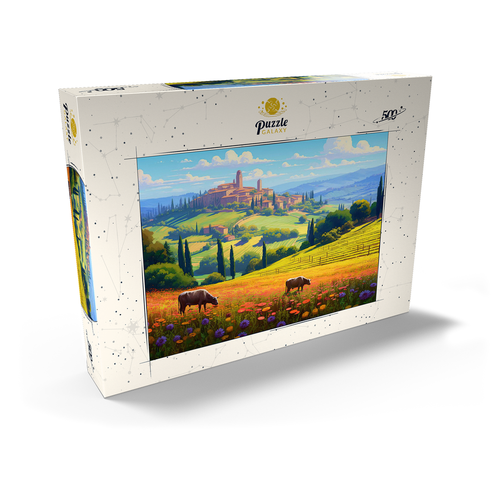Dieser atemberaubende Blick auf die toskanische Landschaft zeigt eine lebendige Wiese voller bunter Wildblumen und grasender Kühe unter einem strahlenden Himmel. Sanfte grüne Hügel mit Zypressen führen zu einem charmanten Dorf auf einem Hügel mit rustikalen Steinhäusern, die in warmes Sonnenlicht getaucht sind. Der Flickenteppich aus Feldern und Weinbergen bildet eine heitere und malerische Kulisse, die an die zeitlose Schönheit und pastorale Ruhe der Toskana erinnert.