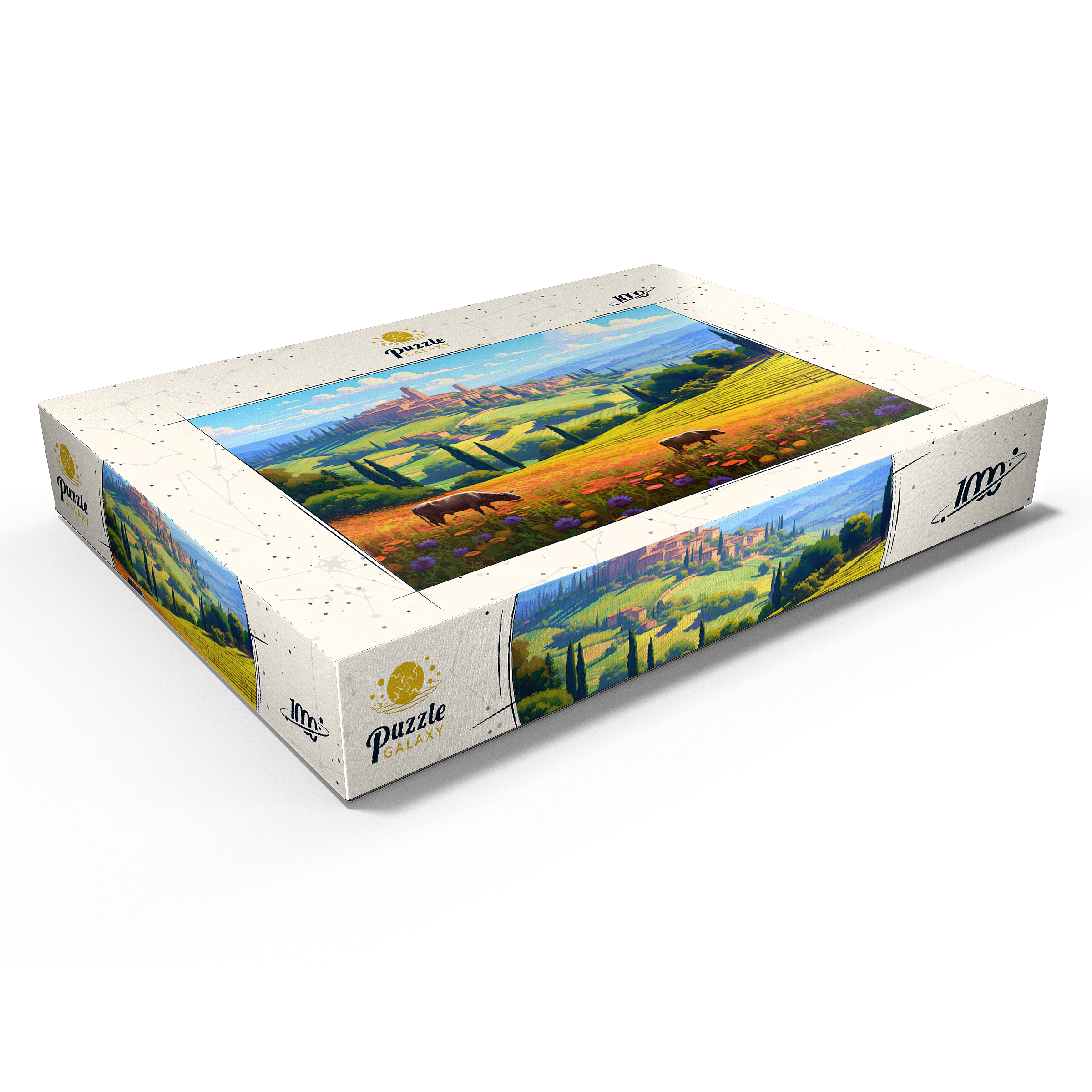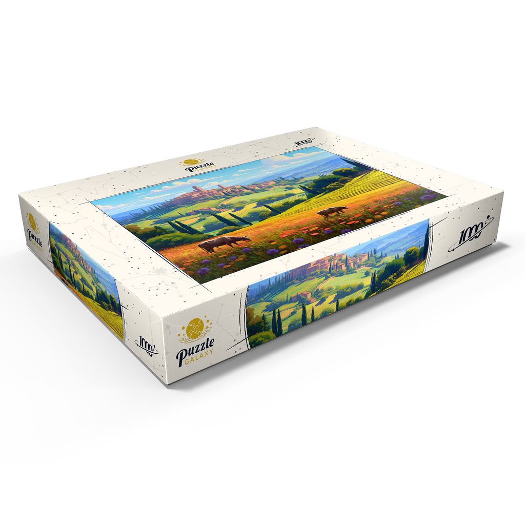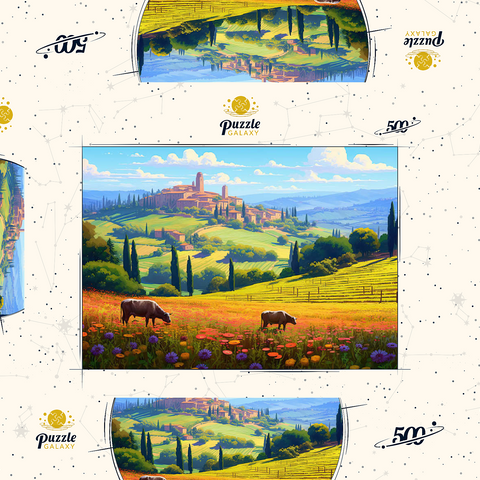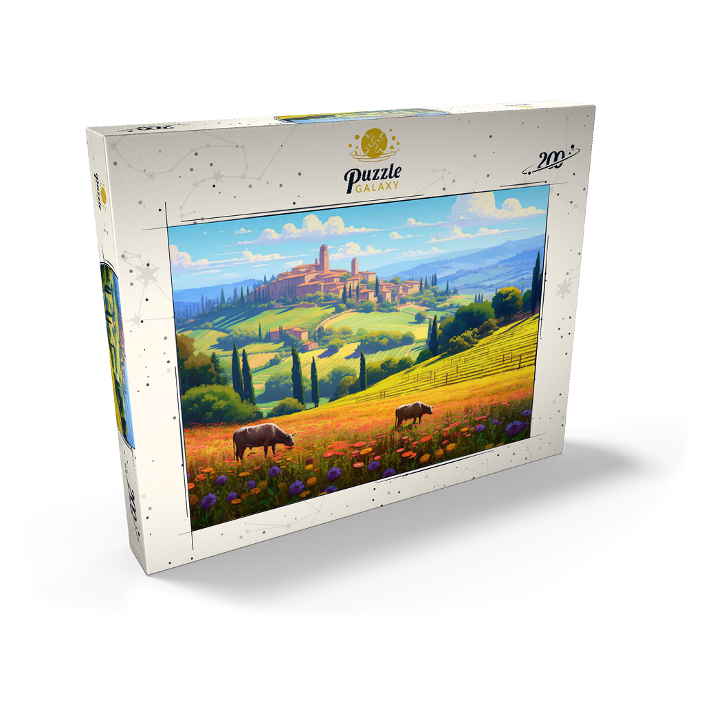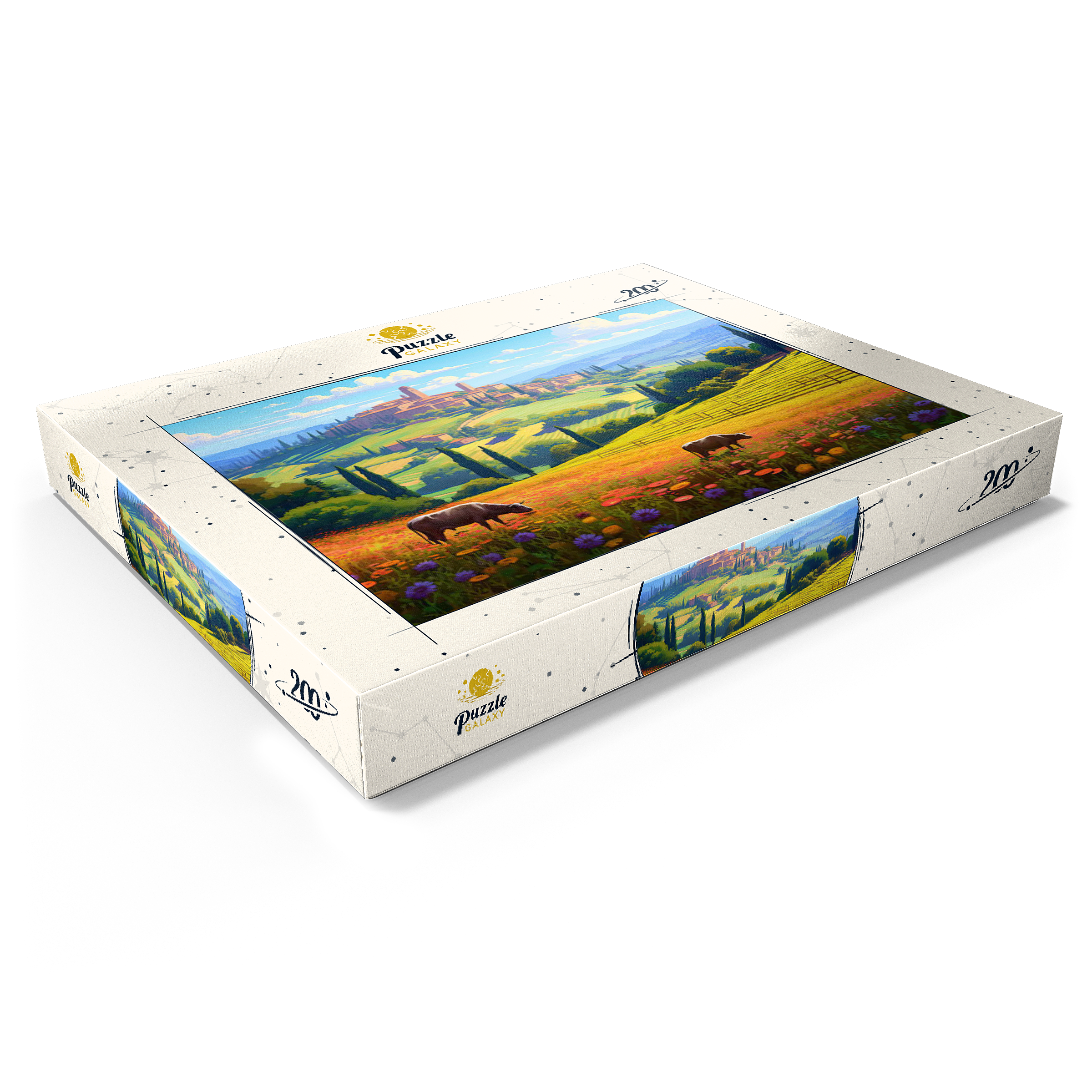 Dieser atemberaubende Blick auf die toskanische Landschaft zeigt eine lebendige Wiese voller bunter Wildblumen und grasender Kühe unter einem strahlenden Himmel. Sanfte grüne Hügel mit Zypressen führen zu einem charmanten Dorf auf einem Hügel mit rustikalen Steinhäusern, die in warmes Sonnenlicht getaucht sind. Der Flickenteppich aus Feldern und Weinbergen bildet eine heitere und malerische Kulisse, die an die zeitlose Schönheit und pastorale Ruhe der Toskana erinnert.