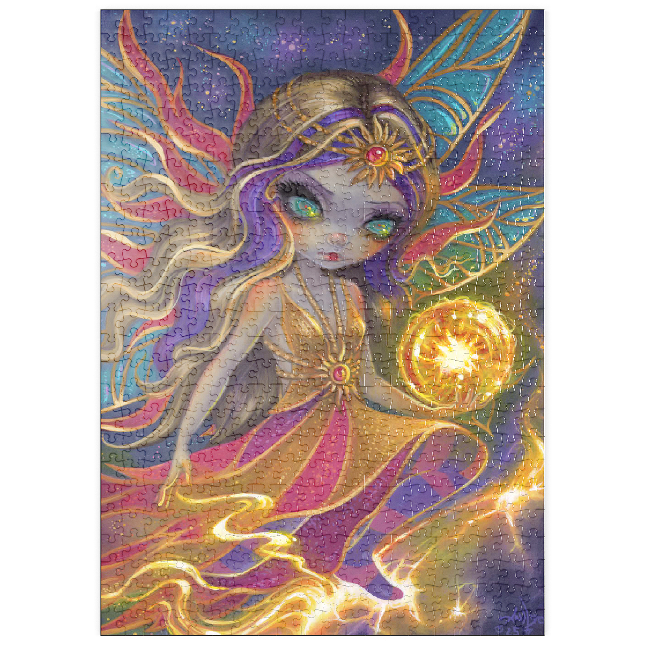 Nutzen Sie die Kraft der Sonne mit dem strahlenden Solara Sunflare-Puzzle! Diese wunderschöne Strangeling-Fee fängt die Energie von Sonneneruptionen ein und leitet Licht und Wärme in die Welt. Als beliebte Himmels- und Elementarfee ist Solara die atemberaubende Schwester von Onyx Moonshadow. Erwecken Sie die Hitze des Sonnensterns und dieses wunderschöne Kunstwerk Stück für Stück zum Leben. Ein unverzichtbares Fantasy-Kunstpuzzle für Liebhaber des Himmels!
