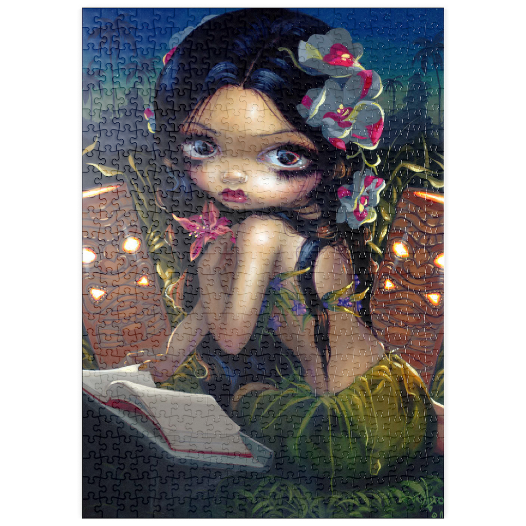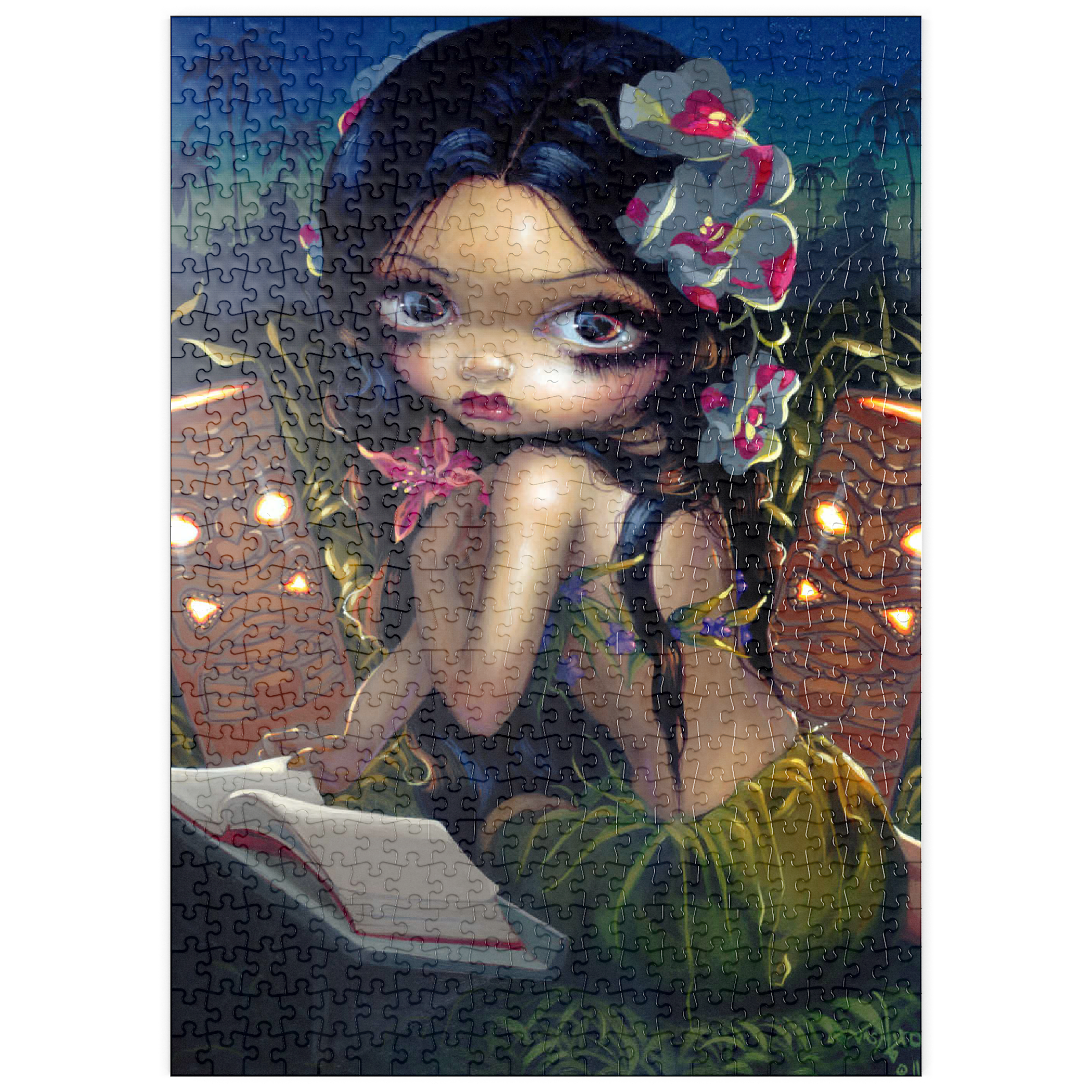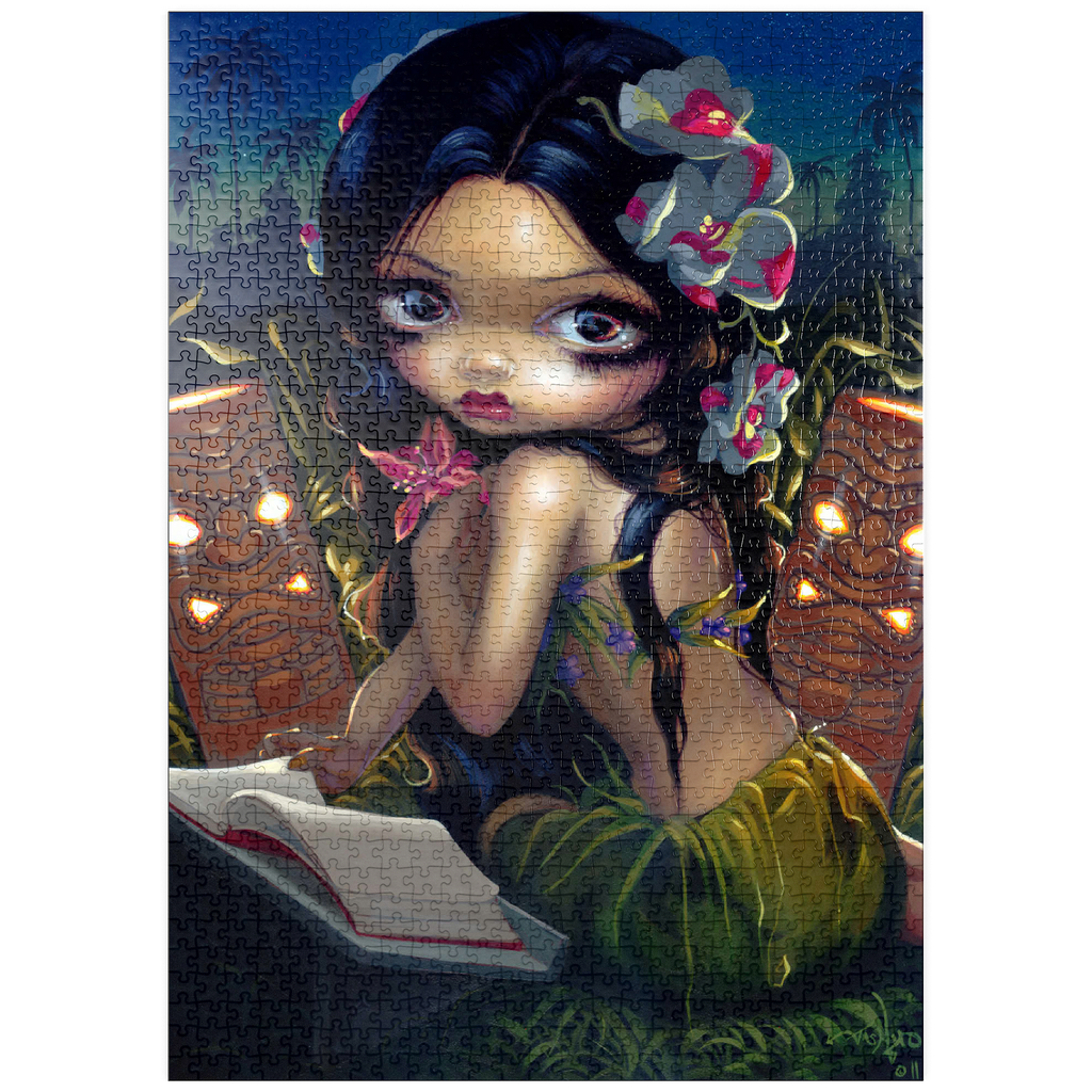 Entdecken Sie Amara und das Buch! Dieses wunderschöne Porträt zeigt Amara, ein polynesisch-hawaiianisches Fabelwesen, auch bekannt als Menehune (bedeutet „Paradies“). Sie steht in einem üppigen tropischen Wald mit leuchtenden Tiki-Göttern und bewacht ein heiliges Buch. Ein lebendiges, hochwertiges Puzzle für Sammler polynesischer Mythologie, tropischer Fantasie und einzigartiger Feenkunst. Holen Sie sich dieses Paradies-Porträt nach Hause!