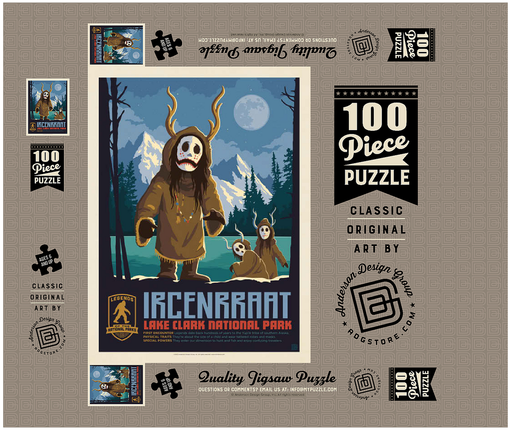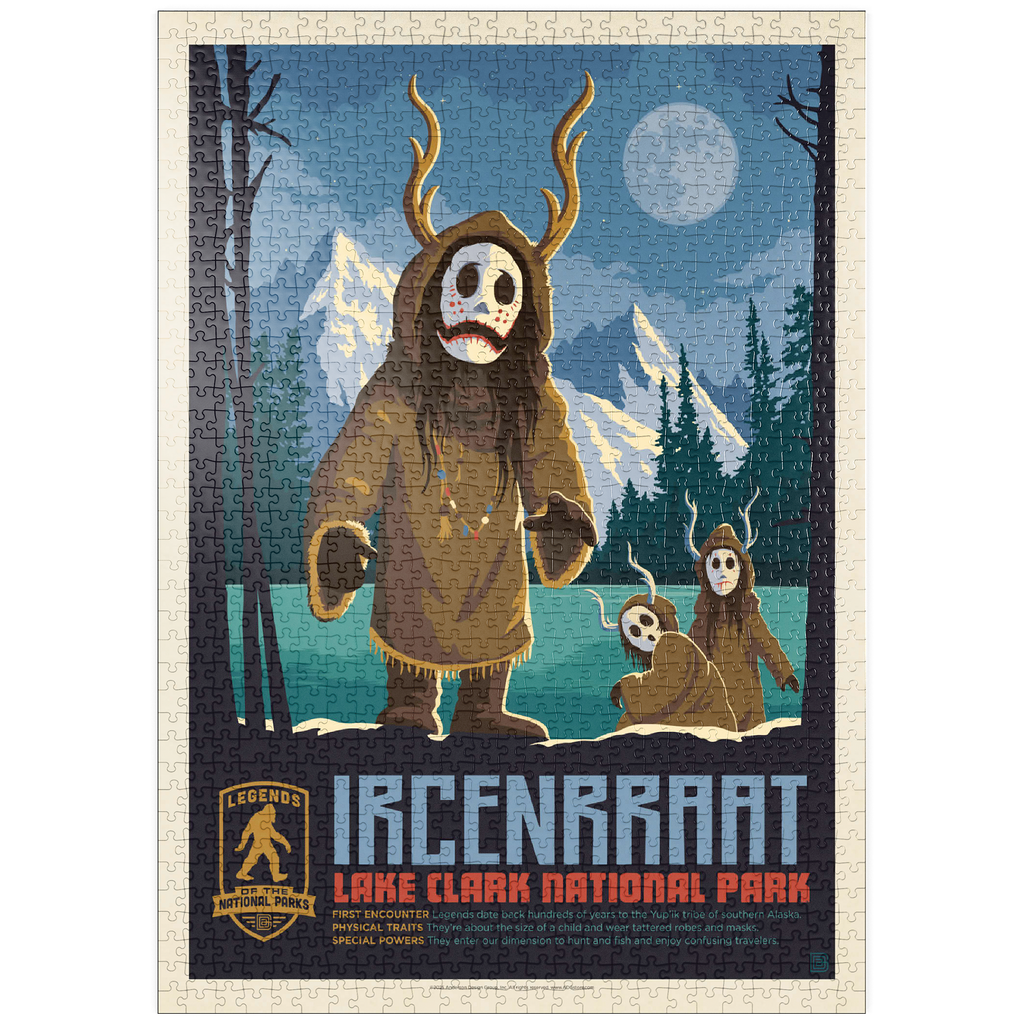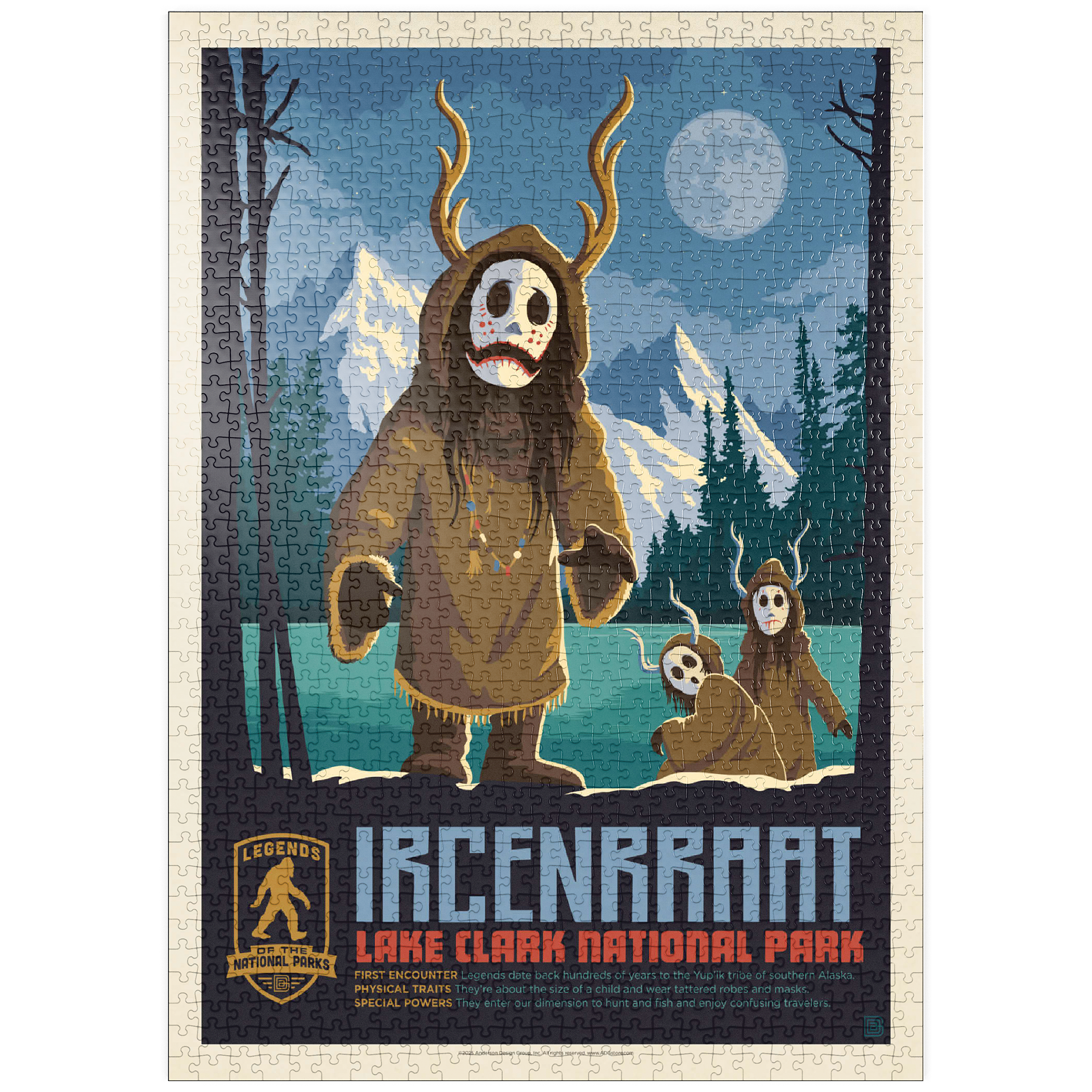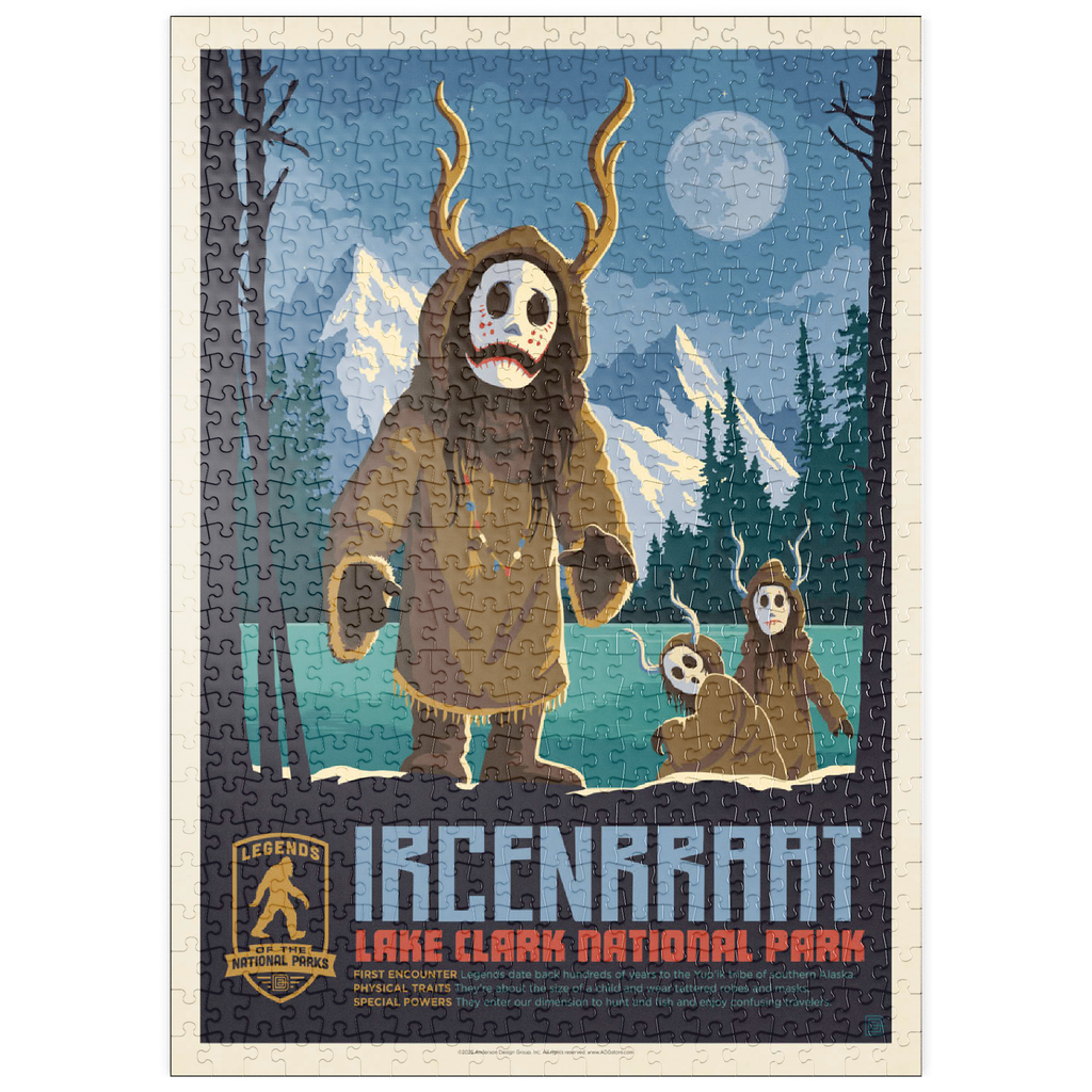 Die Ircenrraat sind unheimliche, übernatürliche Wesen aus der Folklore der Yup'ik, von denen man annimmt, dass sie die abgelegene Wildnis des Lake Clark National Park in Alaska durchstreifen. Der Legende nach bewegen sich diese mysteriösen Wesen zwischen den Dimensionen und tauchen in unserer Welt auf, um zu jagen, zu fischen und Reisende zu verwirren. Sie werden als kindliche Gestalten beschrieben, die zerschlissene Gewänder und gespenstische Masken tragen. Man sagt, dass sie in den Schatten der schroffen Berge und eisigen Seen Alaskas lauern und oft spurlos verschwinden. Diese Illustration im Vintage-Stil zeigt die beunruhigende Präsenz der Ircenrraat bei Vollmond vor einem Hintergrund aus schneebedeckten Gipfeln und dunklen Wäldern. Dieses Kunstwerk ist ein Muss für Folklore-Enthusiasten, Liebhaber von Kryptiden und Fans indigener Legenden und erweckt einen schaurigen Mythos zum Leben.