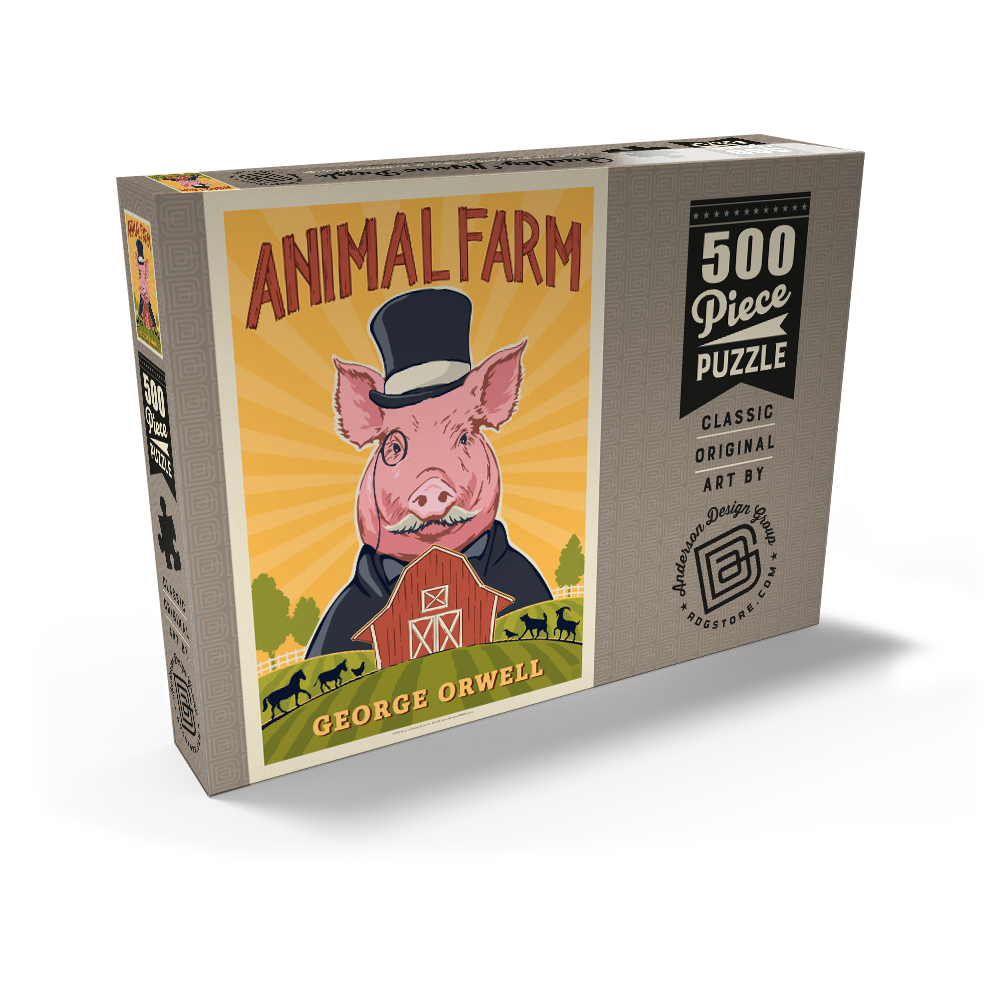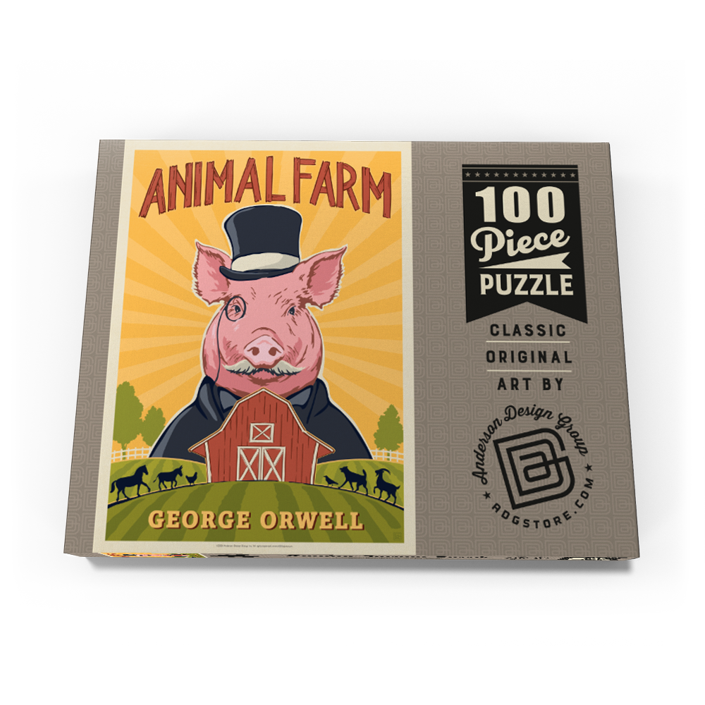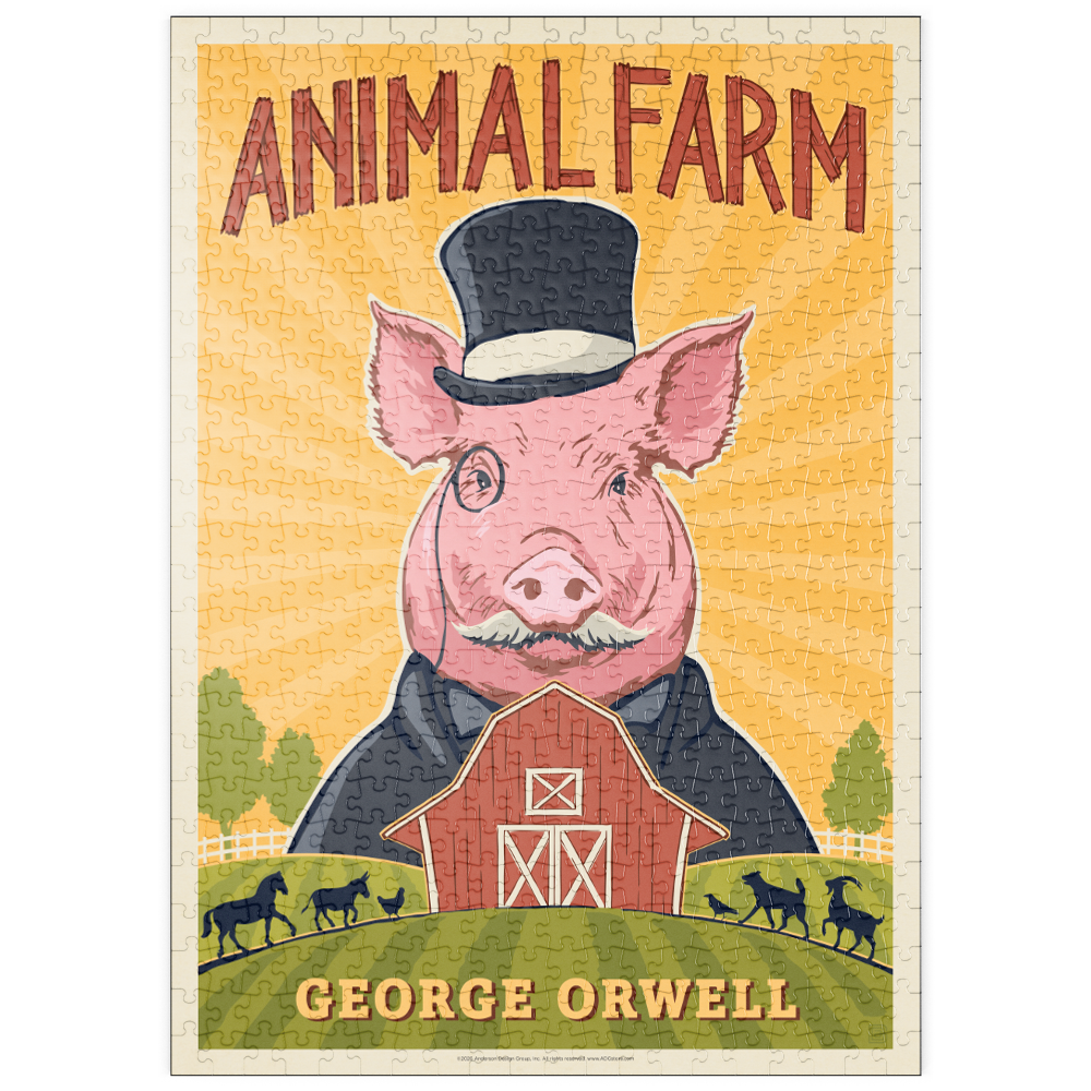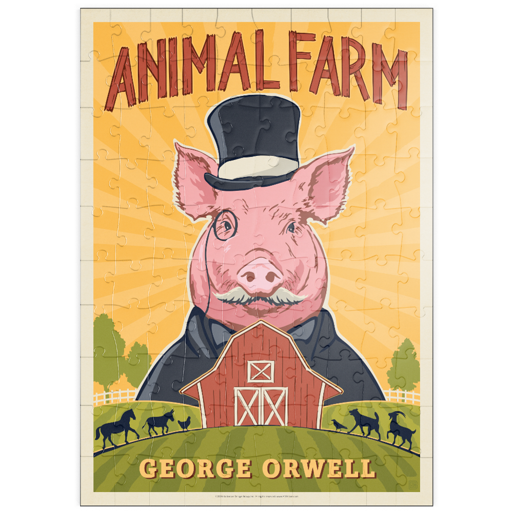 Diese lebendige Darstellung von George Orwells „Animal Farm“ zeigt ein stilisiertes rosa Schwein mit Zylinder und Anzug, das die satirischen Themen und die Kritik an der Macht des Romans symbolisiert. Vor einem strahlend gelben Hintergrund mit Sonnenstrahlen hebt die Szene eine klassische rote Scheune und sanfte grüne Weiden hervor, auf denen sich die Silhouetten von Pferden, Ziegen und Schafen abzeichnen. Der kühne, grafische Stil mit starken Konturen und lebhaften Farben schafft einen auffälligen, vintage-inspirierten Look, der an die Plakatkunst der Mitte des Jahrhunderts erinnert. Diese Darstellung fängt die Essenz der allegorischen Farmkulisse ein und ist somit ideal für Fans klassischer Literatur, politischer Satire und ikonischer Buchkunst. Perfekt für Literaturliebhaber, die nach einer einzigartigen Wanddekoration suchen.