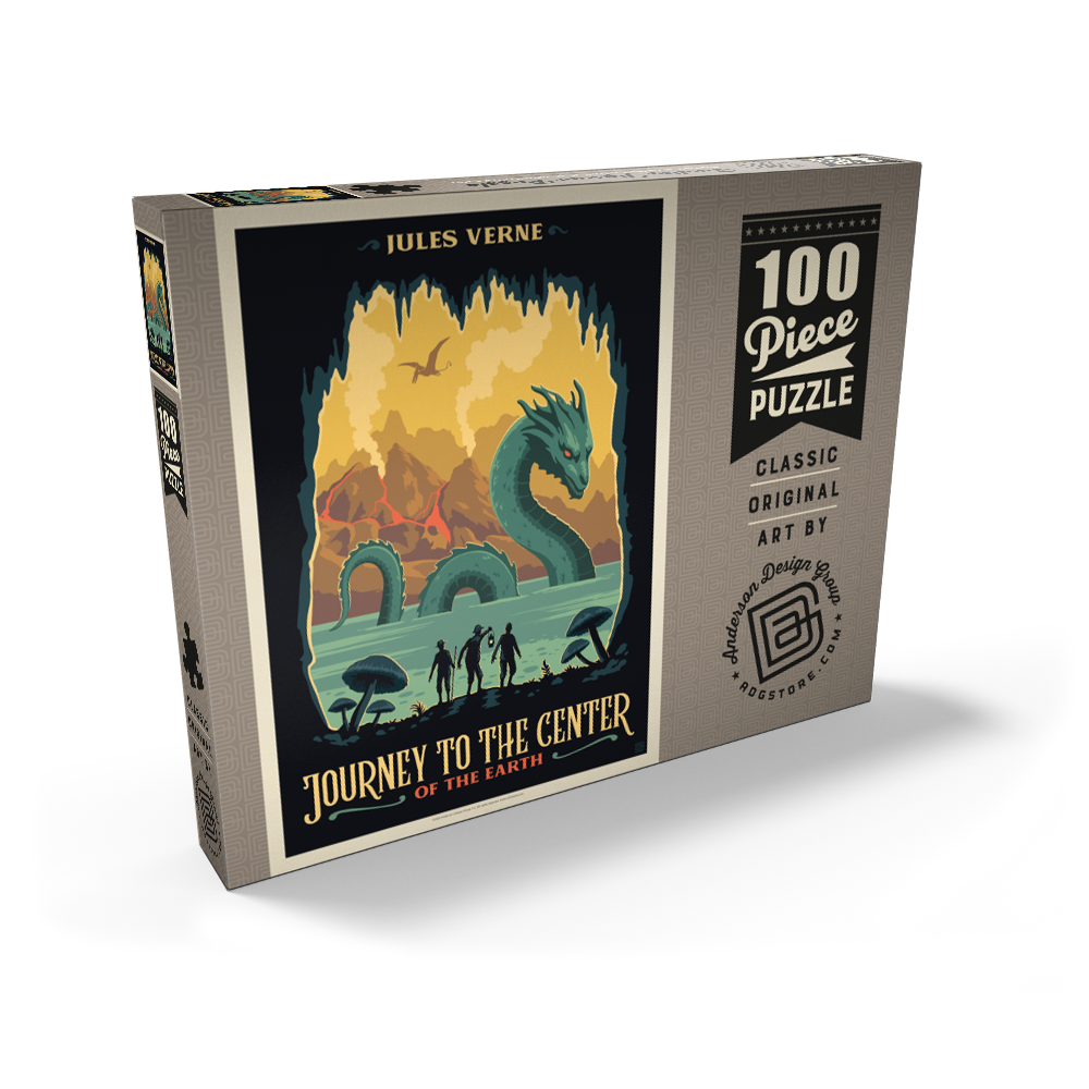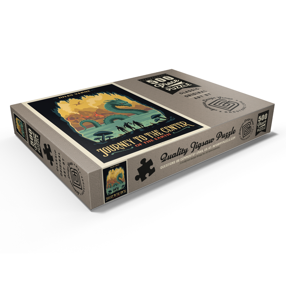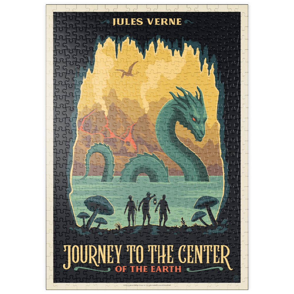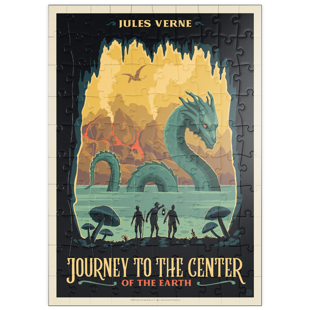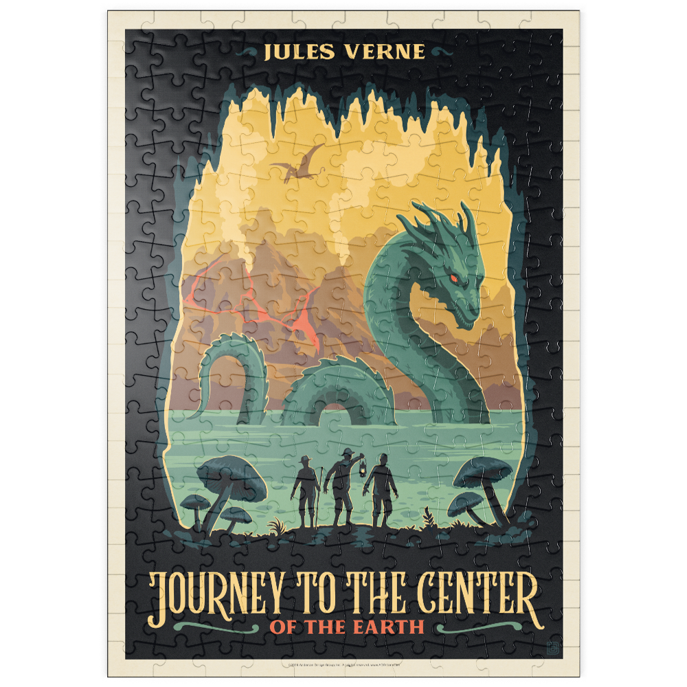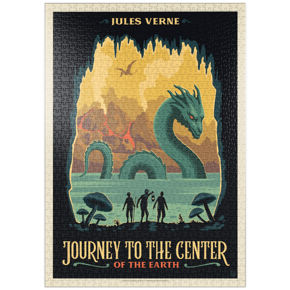 Diese dynamische Darstellung von Jules Vernes „Reise zum Mittelpunkt der Erde“ fängt eine dramatische Unterwelt voller Abenteuer und Entdeckungen ein. Die Szene zeigt drei Forscher am Rande eines geheimnisvollen unterirdischen Sees, die mit einer riesigen Seeschlange konfrontiert sind, während im Hintergrund hoch aufragende Pilze, Vulkanberge und ein fliegender Pterosaurier zu sehen sind. Kräftige Farben und scharfe Kontraste schaffen eine lebendige, fantasievolle Atmosphäre, die die prähistorischen und fantastischen Elemente der Geschichte hervorhebt. Die stilisierte Darstellung betont die Themen Erkundung, Gefahr und die verborgenen Wunder unter der Erdoberfläche und ist somit ideal für Fans von klassischer Literatur, Science-Fiction und abenteuerlichen Landschaften.