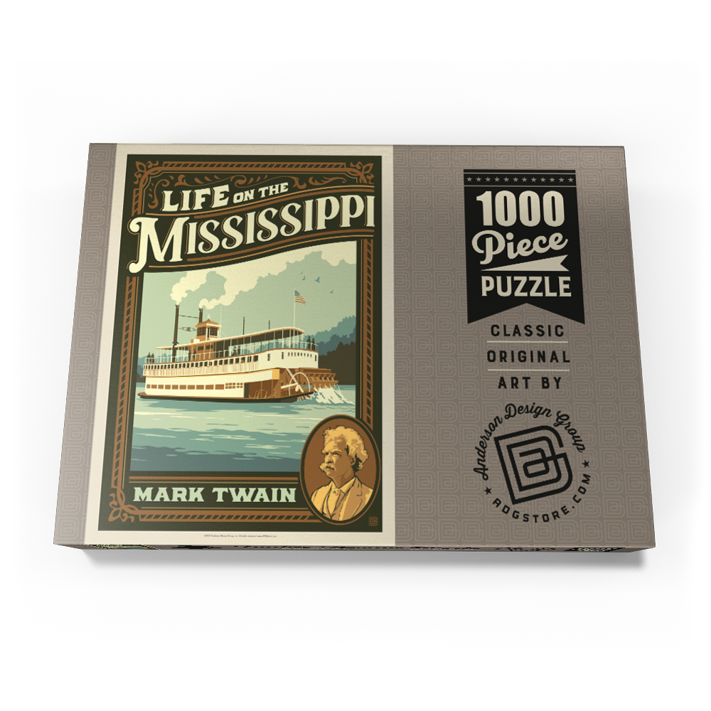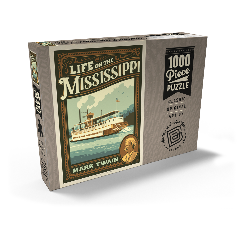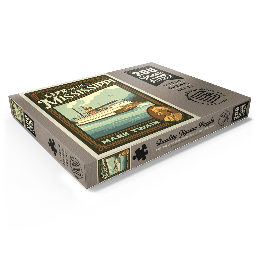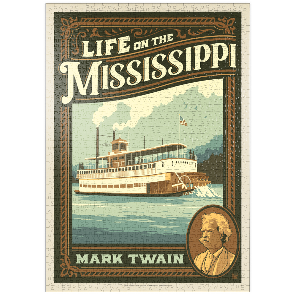 Der Mississippi, eines der bekanntesten Wahrzeichen der Vereinigten Staaten, ist in dieser Vintage-inspirierten Darstellung mit einem historischen Raddampfer zu sehen, der auf seinen Gewässern fährt. Die Szene unterstreicht die kulturelle und literarische Bedeutung des Mississippi, mit Passagieren, die die Reise genießen, und einer darüber wehenden amerikanischen Flagge, die an die Blütezeit der Flussschifffahrt erinnert. Die stilisierte Verwendung kräftiger Retro-Farben und dynamischer Linien fängt die Nostalgie und das Abenteuer ein, die mit dem klassischen Amerika verbunden sind. Ein Porträt von Mark Twain in der unteren Ecke unterstreicht seine tiefe Verbindung zum Fluss, der als Kulisse für viele seiner berühmtesten Werke diente. Diese Darstellung ist ideal für Liebhaber der amerikanischen Geschichte, Flussboote und des literarischen Erbes und bietet eine einzigartige Mischung aus landschaftlicher Schönheit und kulturellem Erbe.