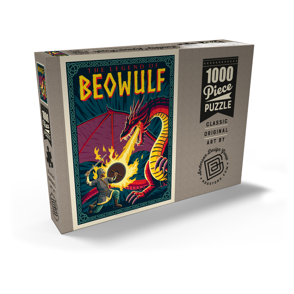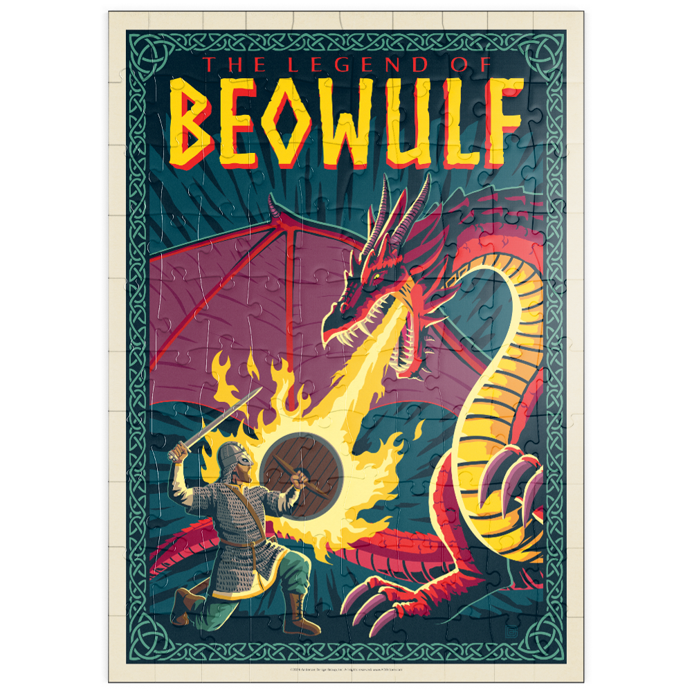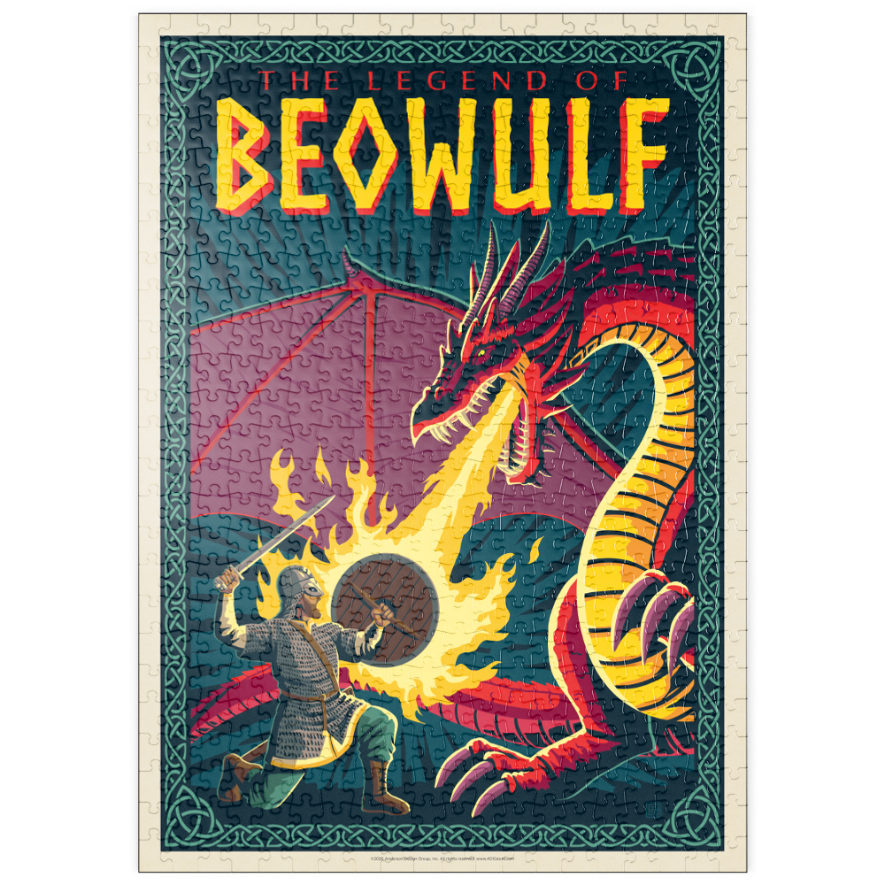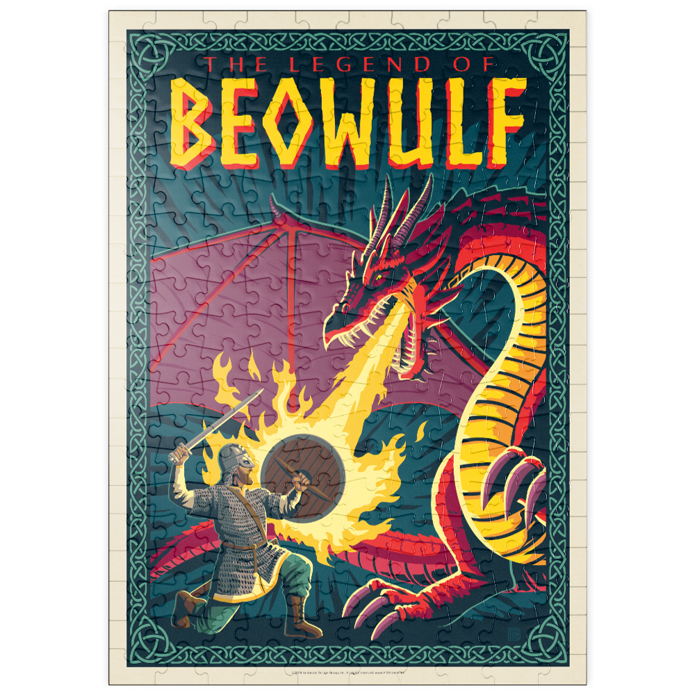Die Legende von Beowulf wird in einer dramatischen mittelalterlichen Fantasieszene dargestellt, in der der ikonische Kampf zwischen Beowulf und dem Drachen aus dem altenglischen Epos, das mit der skandinavischen und wikingerzeitlichen Überlieferung in Verbindung steht, zu sehen ist. Ein wildes rot-schwarzes Drachenwesen mit gekrümmten Hörnern und breiten violetten Flügeln speit Feuer, während ein gepanzerter Krieger mit erhobenem Schwert und gespannztem Schild vorwärts stürmt. Die kräftigen, kontrastreichen Farben und der grafische Vintage-Look im Stil eines Reiseplakats sorgen für eine starke Wirkung als Wanddekoration, die durch einen Rahmen aus keltischen Knotenmustern unterstrichen wird, der einen Hauch nordischer Mythologie vermittelt. Ideale Stichworte sind Beowulf-Legende, Drachentöter, mittelalterlicher Krieger, heldenhafter Kampf und skandinavische Folklore.