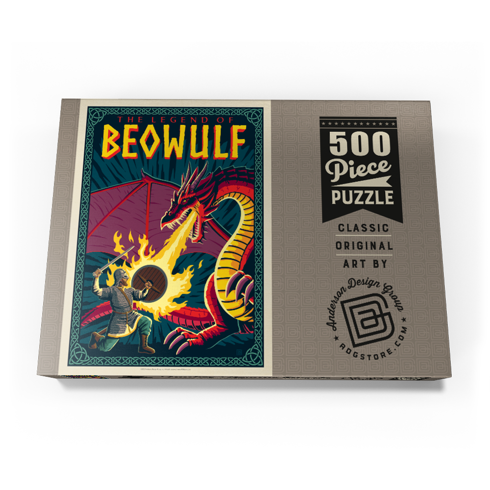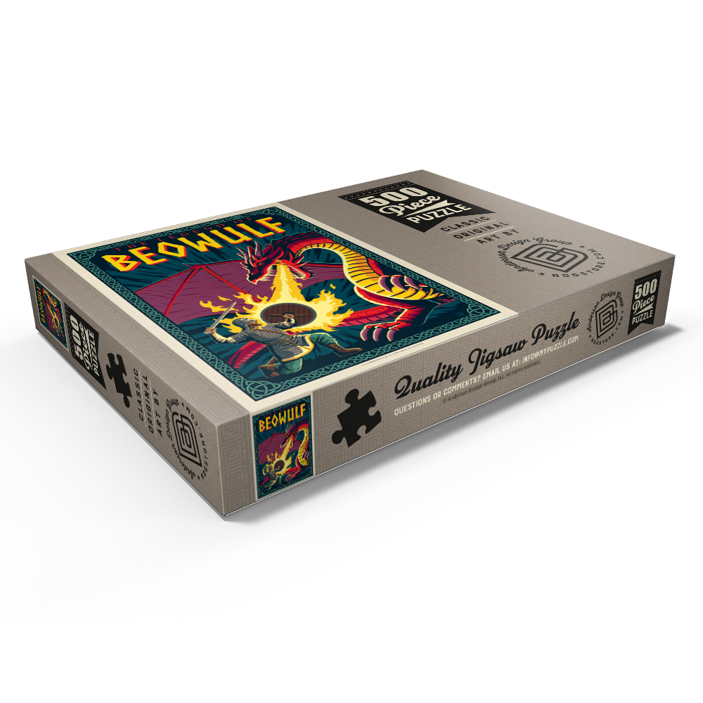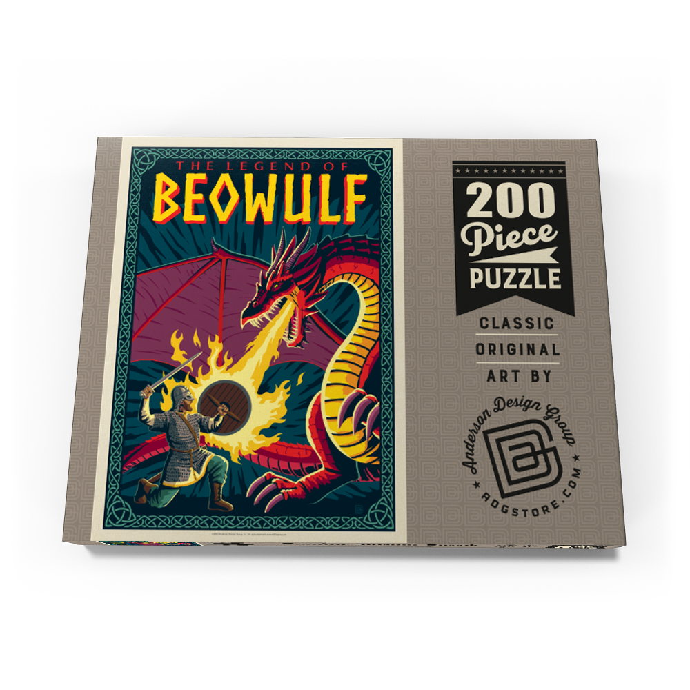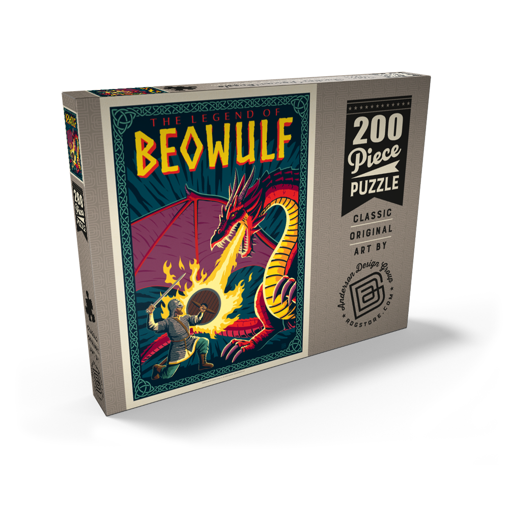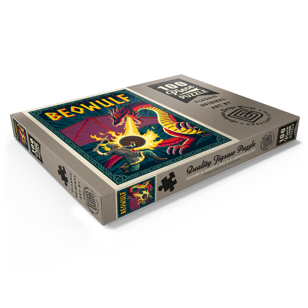 Die Legende von Beowulf wird in einer dramatischen mittelalterlichen Fantasieszene dargestellt, in der der ikonische Kampf zwischen Beowulf und dem Drachen aus dem altenglischen Epos, das mit der skandinavischen und wikingerzeitlichen Überlieferung in Verbindung steht, zu sehen ist. Ein wildes rot-schwarzes Drachenwesen mit gekrümmten Hörnern und breiten violetten Flügeln speit Feuer, während ein gepanzerter Krieger mit erhobenem Schwert und gespannztem Schild vorwärts stürmt. Die kräftigen, kontrastreichen Farben und der grafische Vintage-Look im Stil eines Reiseplakats sorgen für eine starke Wirkung als Wanddekoration, die durch einen Rahmen aus keltischen Knotenmustern unterstrichen wird, der einen Hauch nordischer Mythologie vermittelt. Ideale Stichworte sind Beowulf-Legende, Drachentöter, mittelalterlicher Krieger, heldenhafter Kampf und skandinavische Folklore.