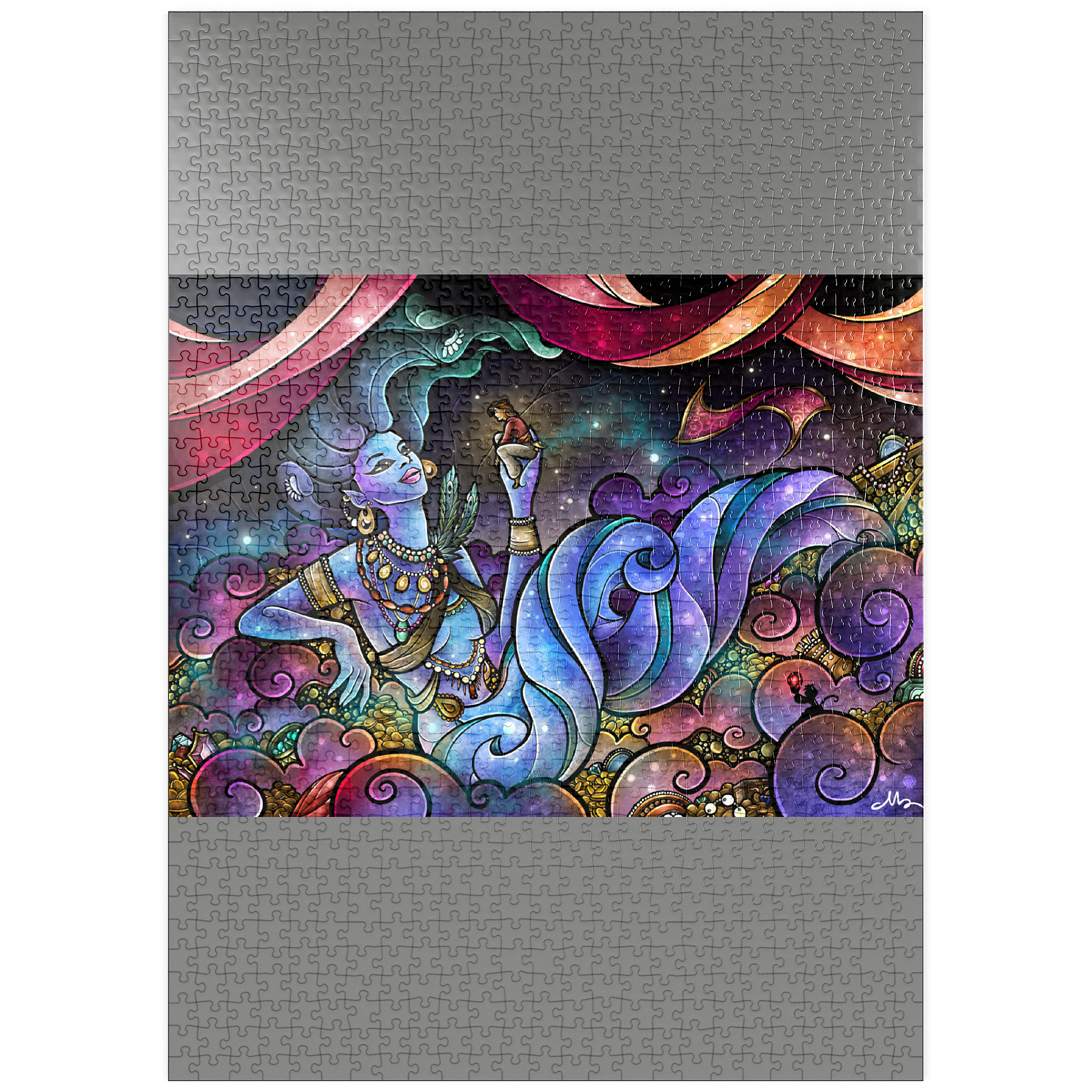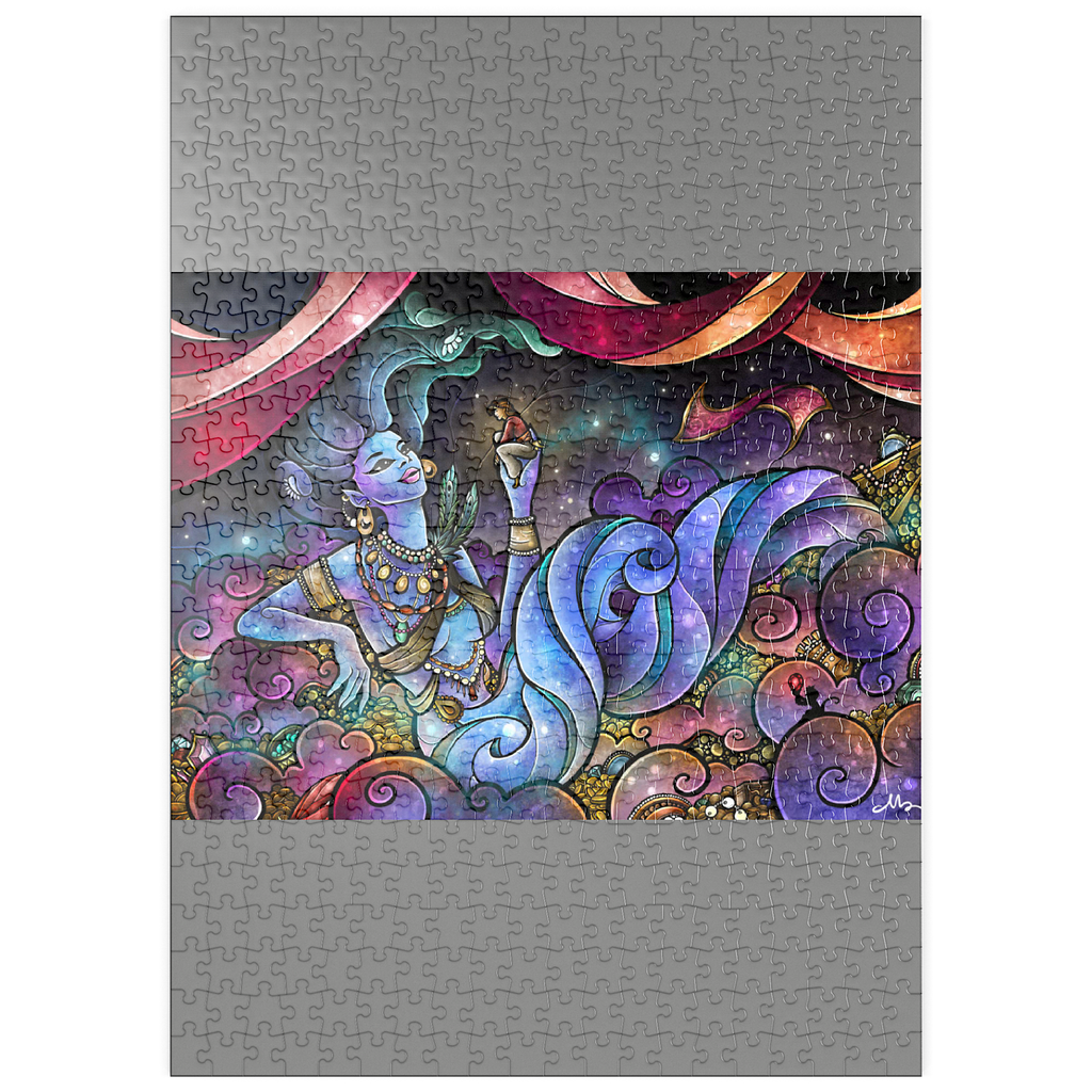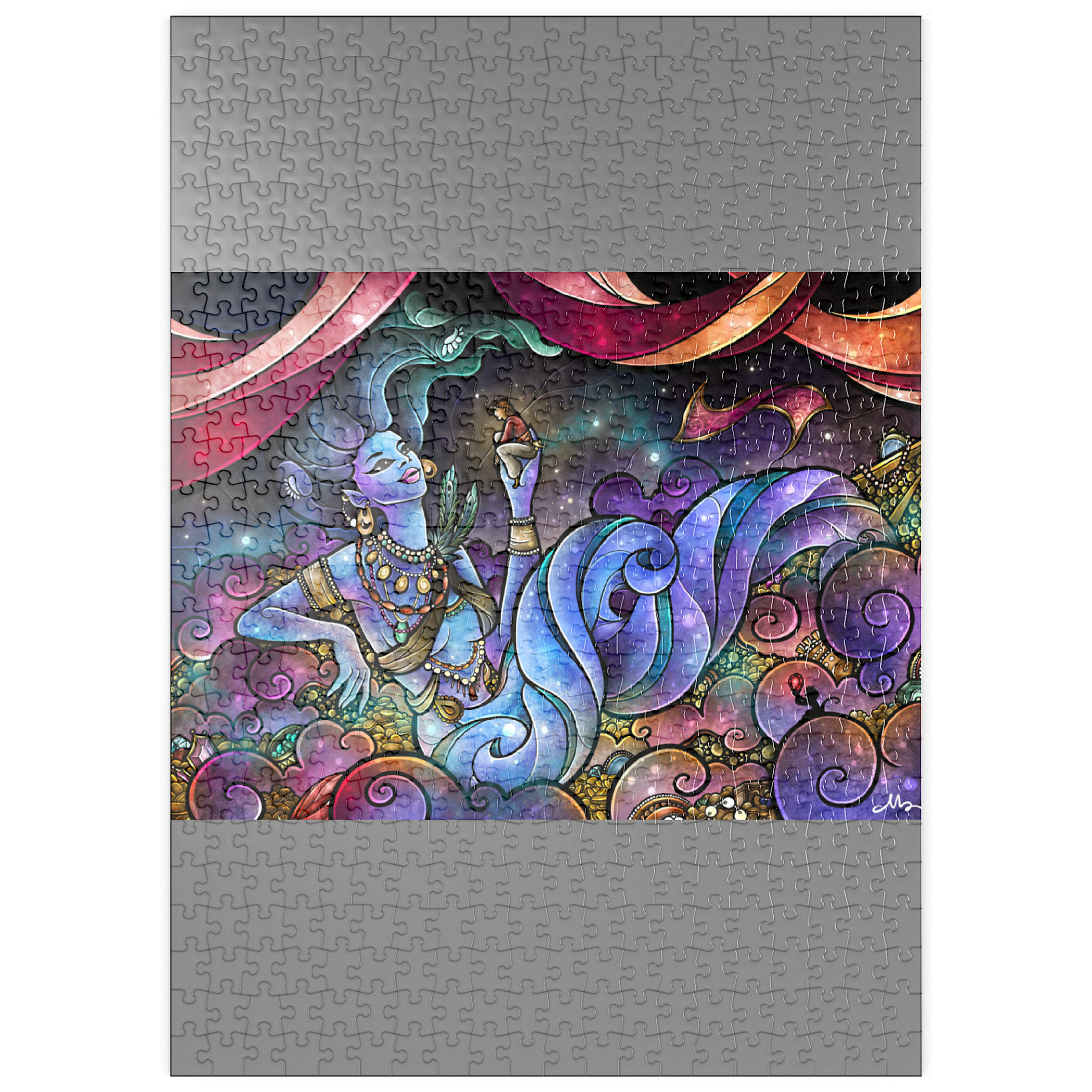 Entdecke diese lebhafte Szene, in der Aladdin auf den mächtigen Dschinni trifft! Erlebe den Moment, in dem das mystische Wesen in einem Wirbel aus Blau- und Violetttönen erscheint und dem überraschten jungen Helden seine magischen Dienste anbietet. Umgeben von wirbelnden Wolken und Schätzen sprüht dieses fantastische Bild vor Farben und Wunder. Setze dieses ikonische Märchen voller Wünsche und Abenteuer zusammen!