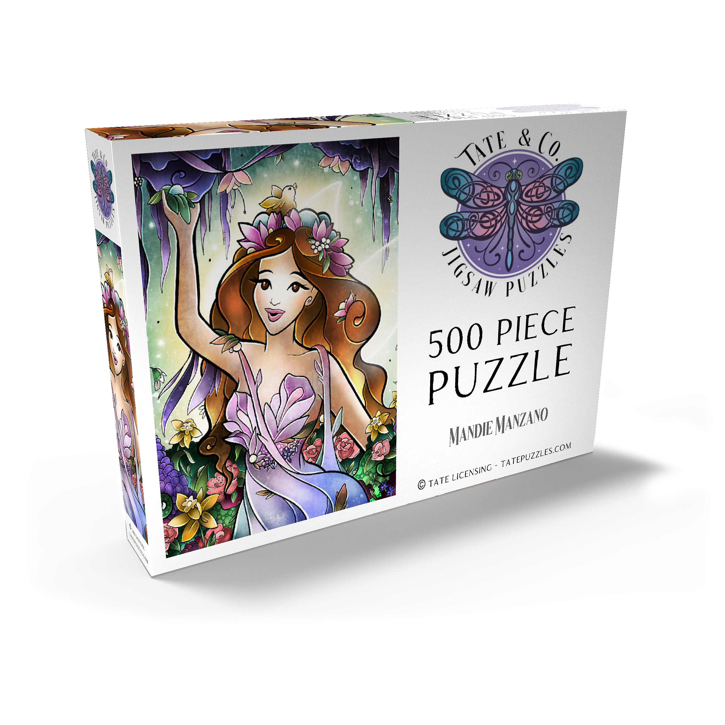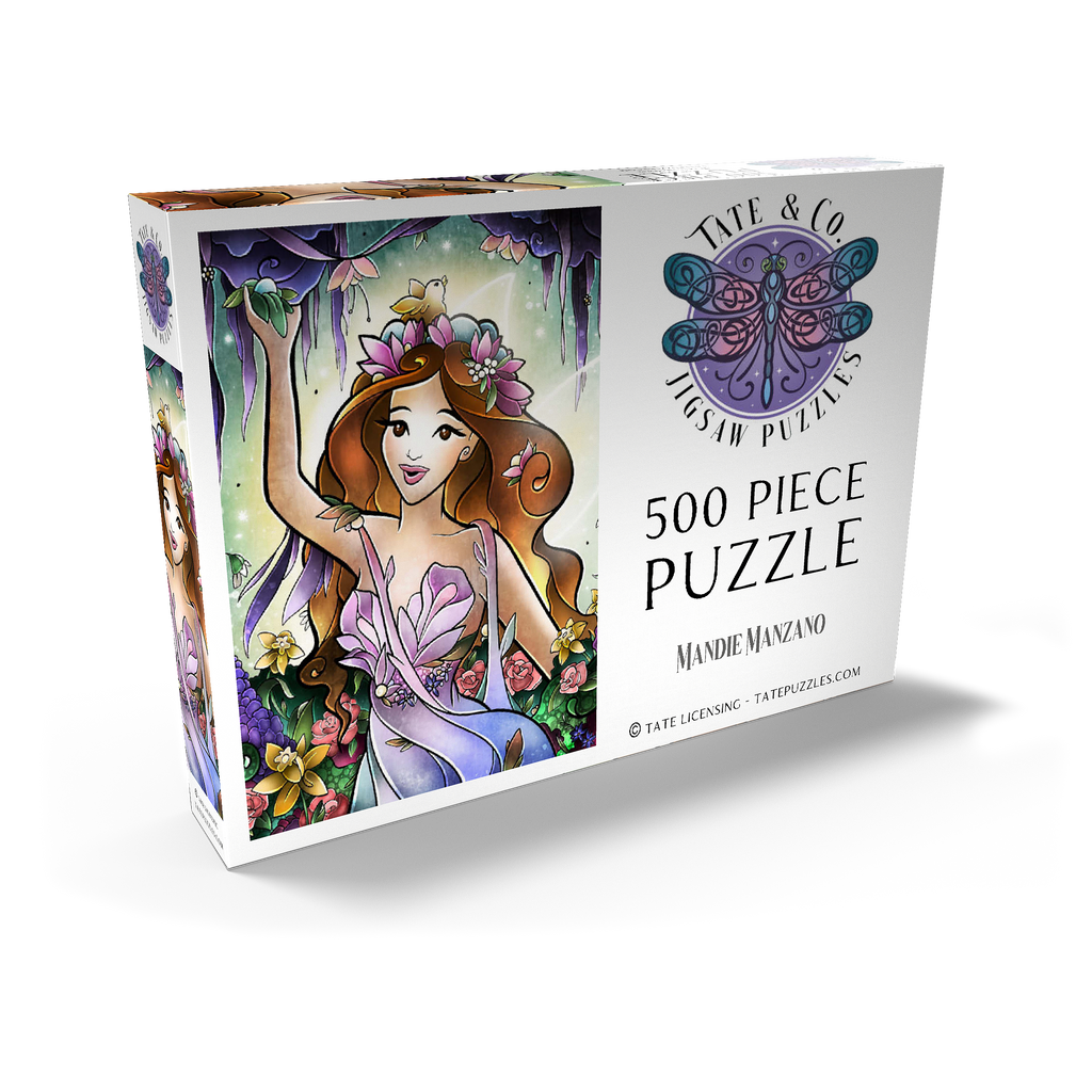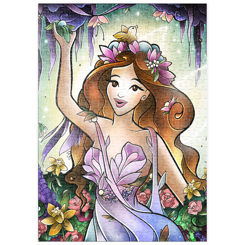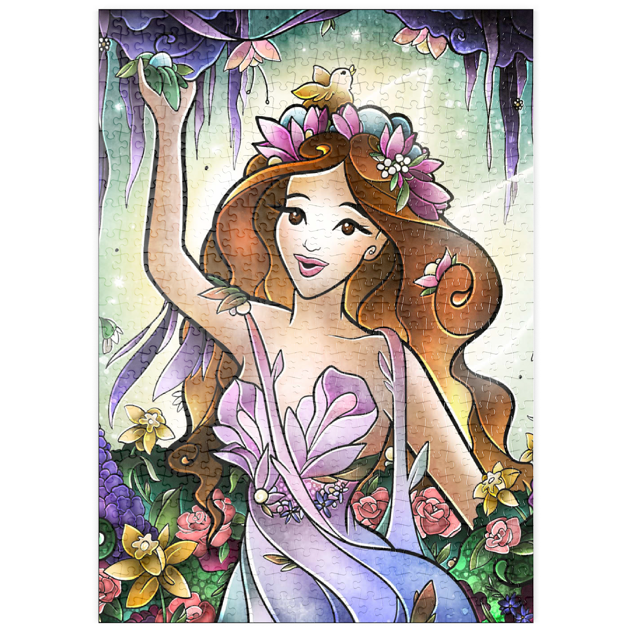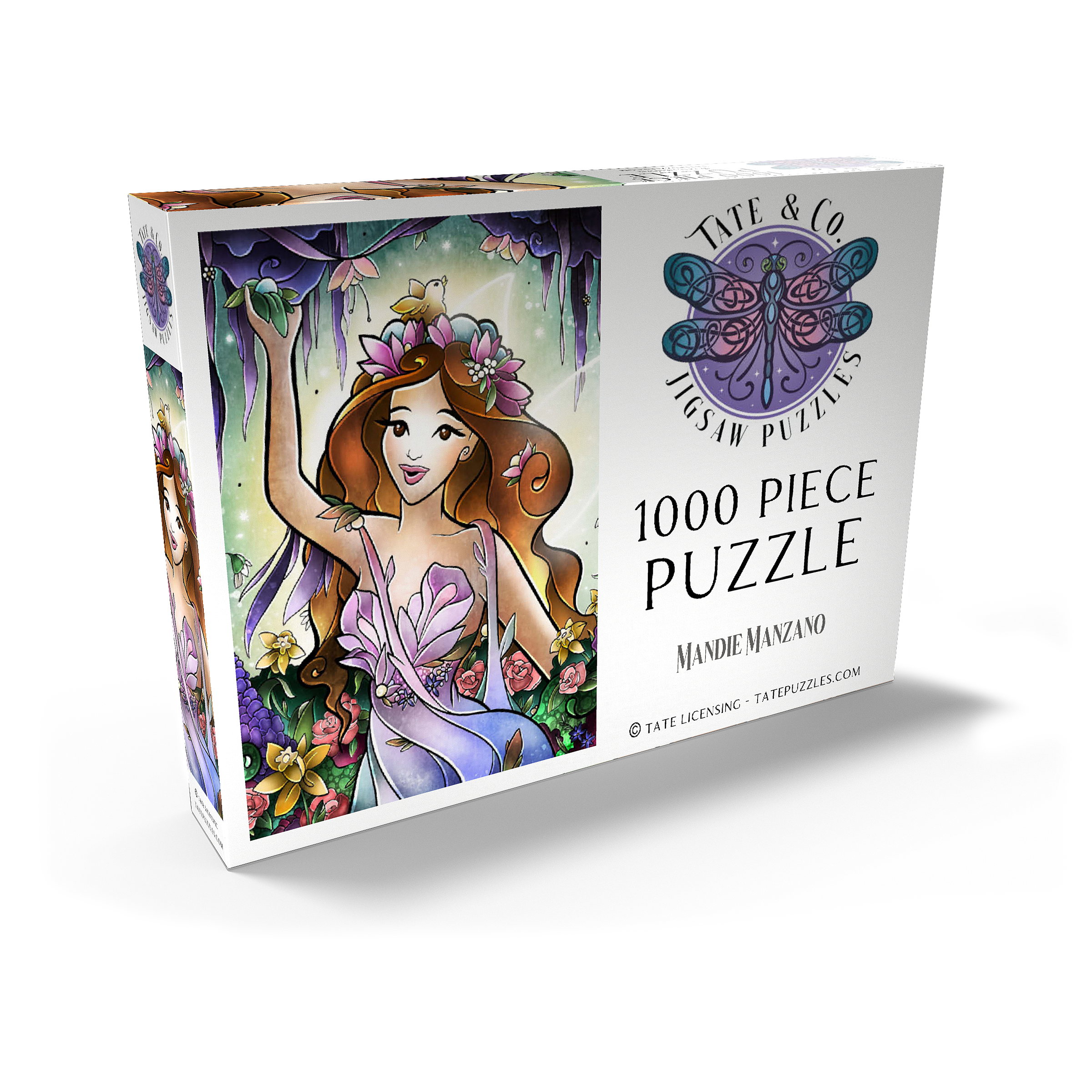 Erwecken Sie die Schönheit des Frühlings zum Leben mit „Flora, die Frühlingsfee“ von Mandie Manzano! Setzen Sie dieses bezaubernde Bild einer strahlenden Fee zusammen, die von einer Fülle bunter Blüten umgeben ist. Mit ihrem wallenden rotbraunen Haar, das mit Blumen geschmückt ist, und einem kleinen Vogel, der auf ihrem Kopf sitzt, verkörpert Flora die Lebendigkeit dieser Jahreszeit. Üppiges Laub und zarte Blütenblätter schaffen eine verspielte und fröhliche Atmosphäre. Entdecken Sie die Magie des Frühlings in jedem einzigartig geformten Puzzleteil.