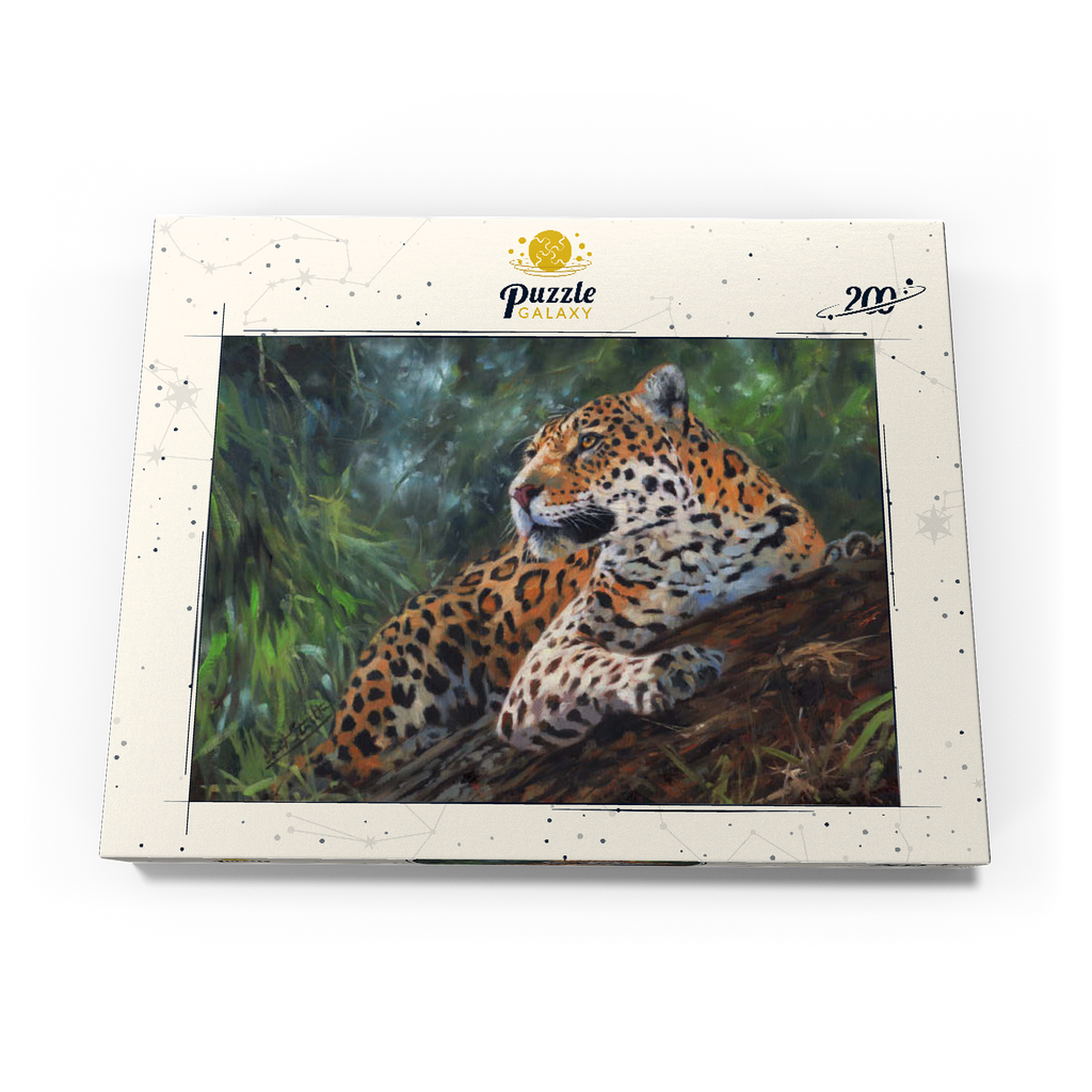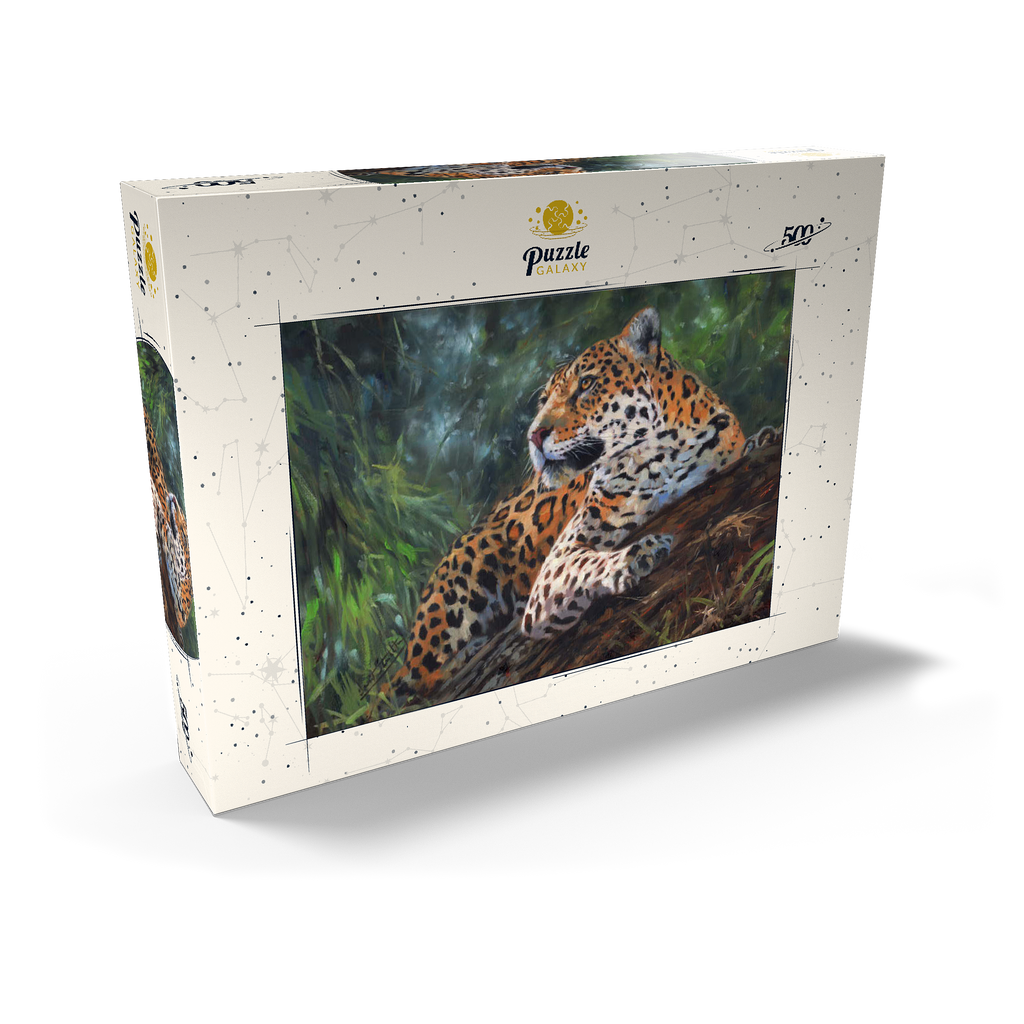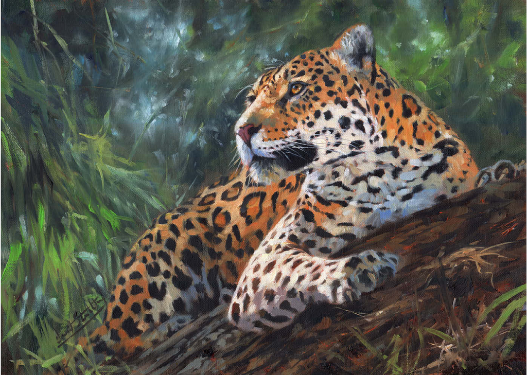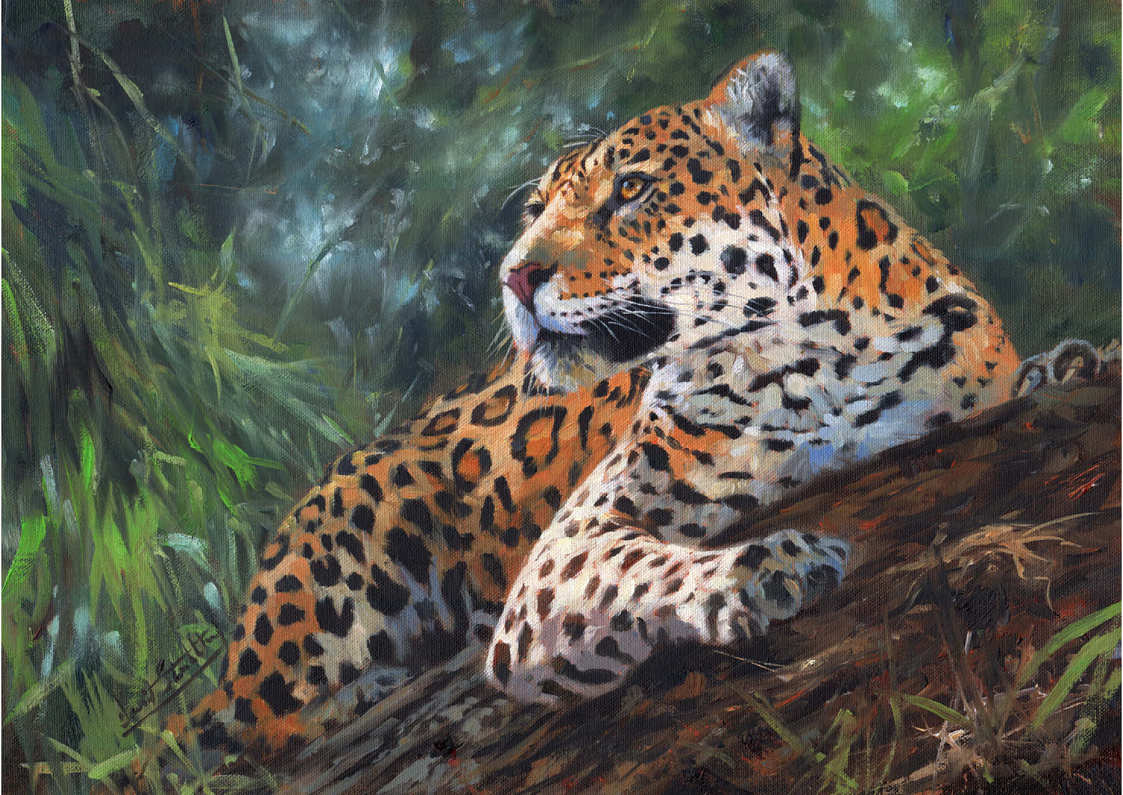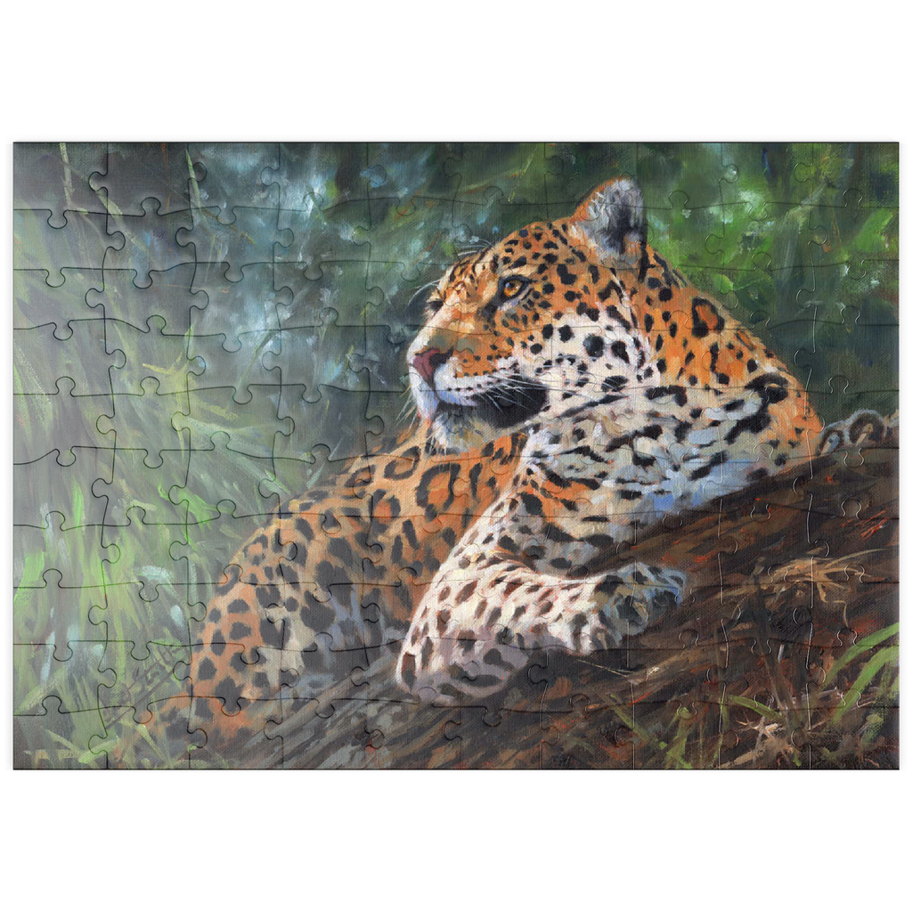 Ein fesselndes Porträt eines Leoparden, der sich anmutig auf einem umgestürzten Baumstamm inmitten eines üppigen, grünen Waldes ausruht. Das goldene Fell des Leoparden mit den filigranen schwarzen Rosetten bildet einen schönen Kontrast zum umliegenden Laub und unterstreicht seine Eleganz und Kraft. Das weiche, gefilterte Licht, das durch die Bäume fällt, sorgt für eine ruhige Atmosphäre und fängt die wachsame und doch entspannte Haltung des Raubtiers ein, während es seine Umgebung beobachtet. Dieses Kunstwerk ist eine atemberaubende Hommage an die Schönheit der Wildtiere in ihrem natürlichen Lebensraum.